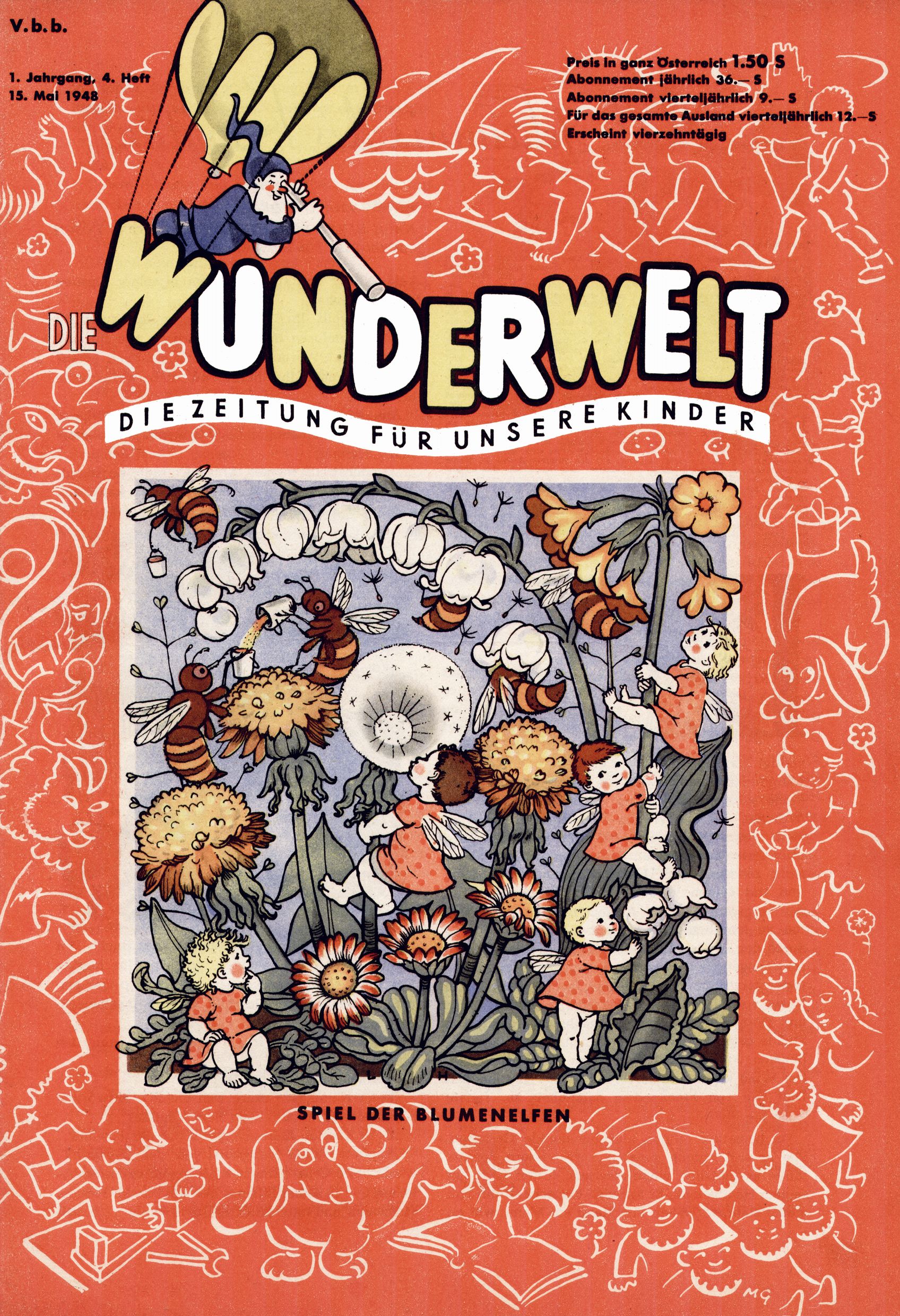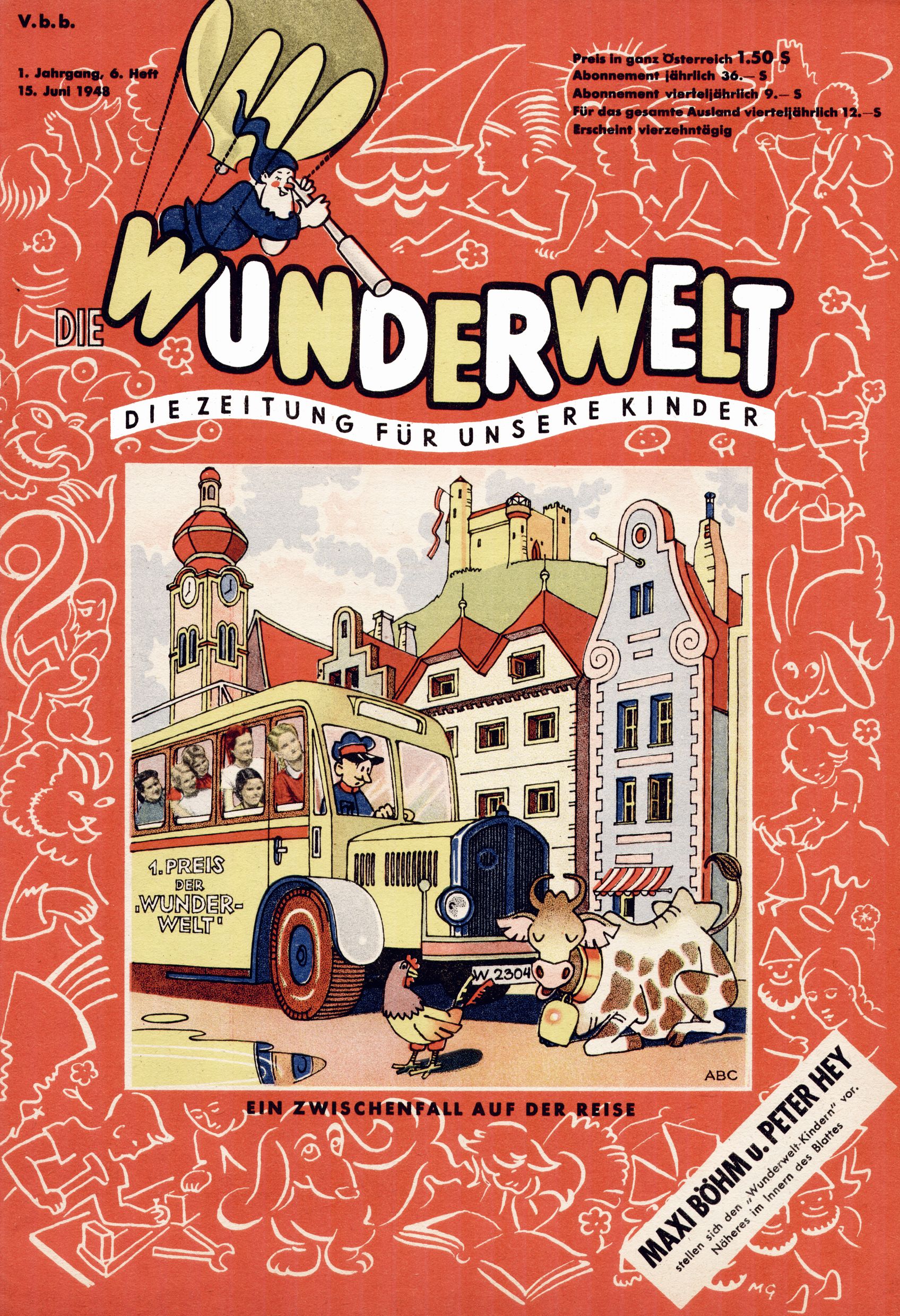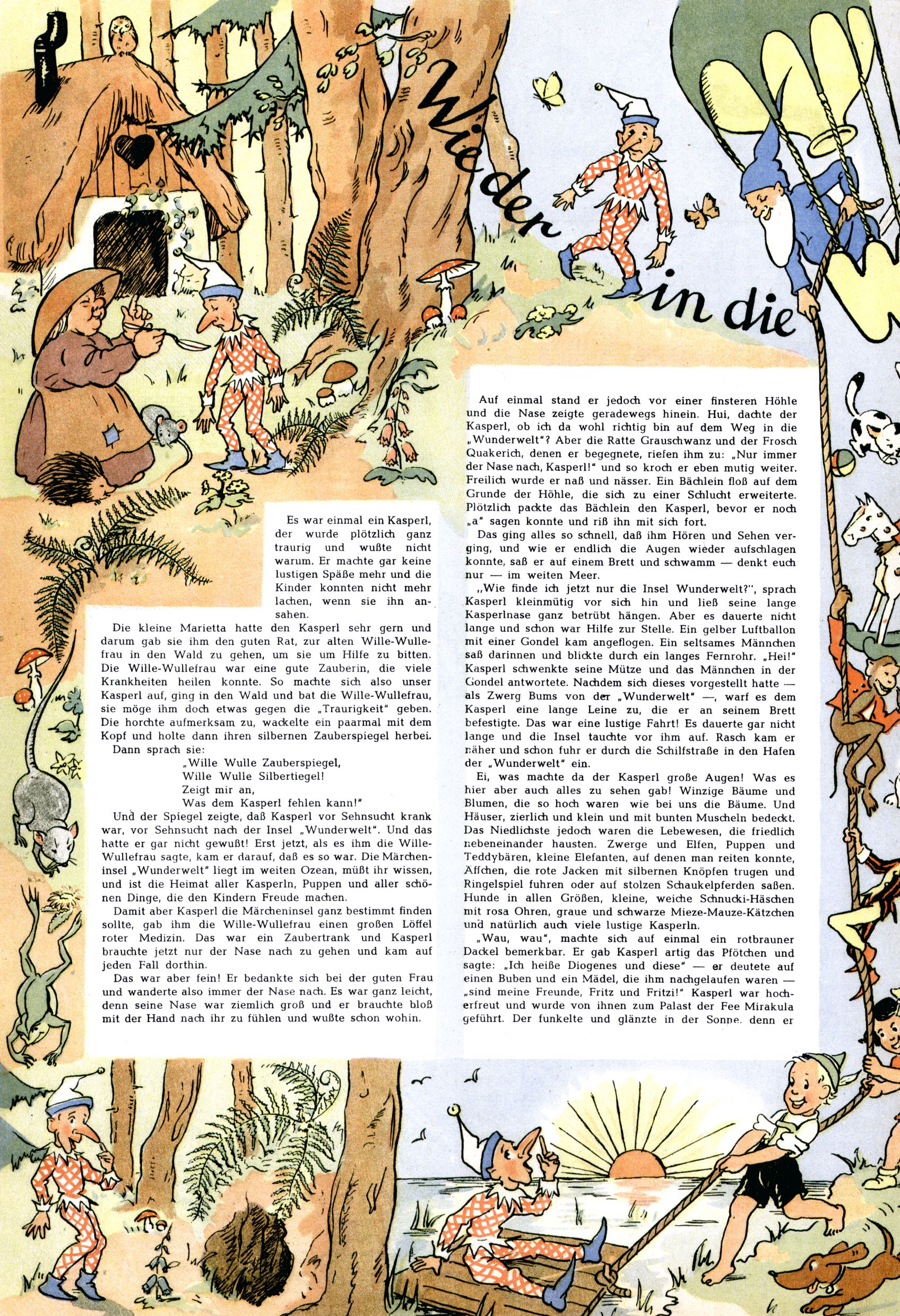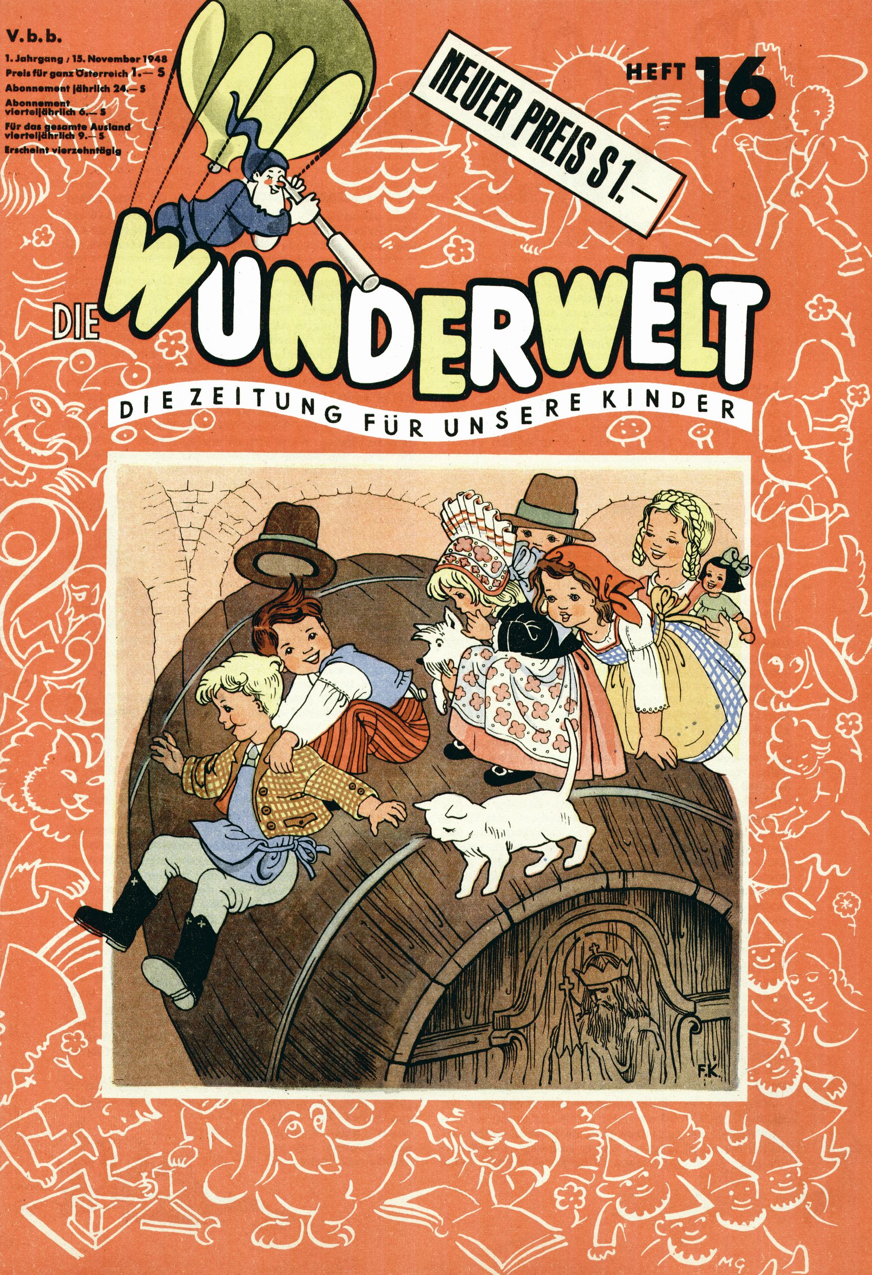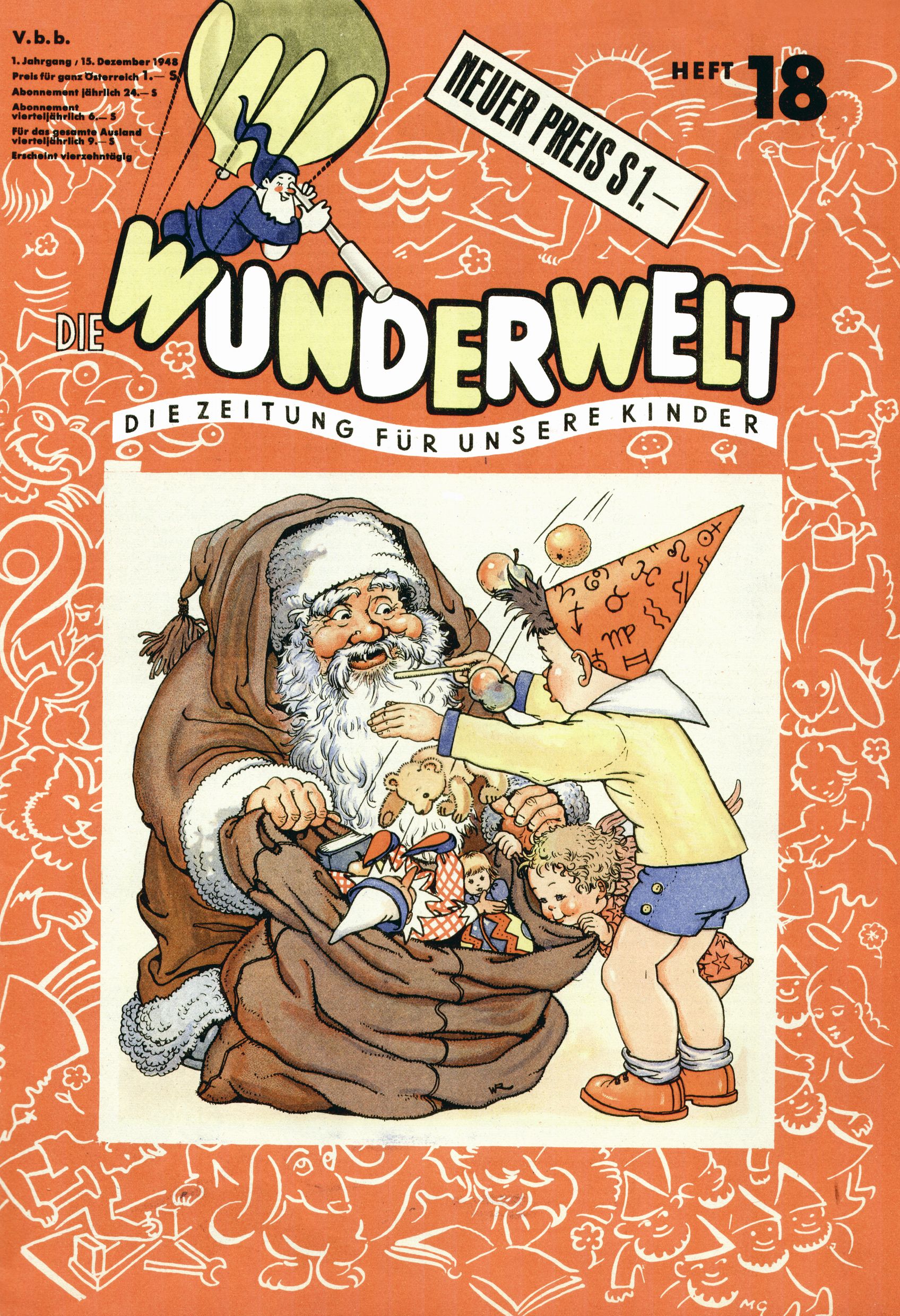 Das Gründungsjahr 1948 – Zeit der Experimente Als der Hauptschullehrer JD Josef Domany zu Ostern 1948 die Idee für eine neue Kinderzeitung umsetzte, war dies nicht nur ein großes finanzielles Risiko in einer ungewissen Zeit, sondern auch ein Schuss ins Blaue. Von den zu diesem Zeitpunkt existierenden österreichischen Kinderzeitungen Kinderpost und Unsere Zeitung suchte JD sich einen geeigneten Mix aus Geschichten, Comics und Aktivseiten heraus, definierte das Grundprinzip der Gewaltfreiheit, des Schönen und des Guten und zusammen mit Hans Weinhappel entwarf er ein Layout, das kostengünstig umgesetzt werden konnte. Ob dieses konservative Konzept Erfolg haben würde in einer Zeit, in der in einem wesentlichen Teil von Österreich die Kommunisten das Sagen hatten, war zunächst mehr als ungewiss. Dennoch wurde es eine erfolgreiche Geburt der Wunderwelt-Zeitung. Trotz häufiger kleinerer Umstellungen im ersten Jahr blieb das festgelegte Grundprinzip ab dem 2. Heft der Wunderwelt mehr als 20 Jahre lang praktisch unverändert: Die Comic-Geschichte als Aufhänger hinten, ein reizendes Titelbild als Blickfang vorne, in der Heftmitte das bunt gestaltete Mittelmächen und rundherum wurden weitere Geschichten, Informatives, Rätsel und Bastelbeiträge gruppiert. Die Abenteuer von Diogenes waren gleich im 1. Heft schon die erste Comicserie der Wunderwelt. Abgelöst wurde Diogenes durch Hokus und Willibald im 10. Heft 1948. Das war der erste wirkliche Geniestreich. Die einfallsreichen und kreativ umgesetzten Abenteuer des Zauberlehrlings Willibald waren mehr als ein Jahrzehnt lang am Höhenflug der Zeitung beteiligt. Zwerg Bumsti hatte 1948 noch nicht das Licht der Welt erblickt. Aber Wichtelmännlein auf Froschjagd im 16. Heft war die erste Vorgängergeschichte zu Bumstis Abenteuer. Weiters trugen die lieblichen Mittelmärchen und die Bastelideen von Hans Weinhappel bereits maßgeblich zum wachsenden Erfolg der Wunderwelt bei. Das einzige Standbein der Zeitung, das 1948 noch fehlte, waren die Ausschneidebögen. Ende 1948 war dann die Liste der meisten großen Namen unter den Zeichnern der Wunderwelt des ersten Jahrzehnts komplett: Peter Paul Prinz, Teja Aicher, Rosl Warzilek, Felicitas Kuhn und Lisbeth Hölzl. Bei den Pädagogen und Textern kam es abgesehen von Hans Weinhappel noch zu umfangreicheren Umstellungen. Kurt Kluger, der die ersten Technik- und Rätselbeiträge der Zeitung