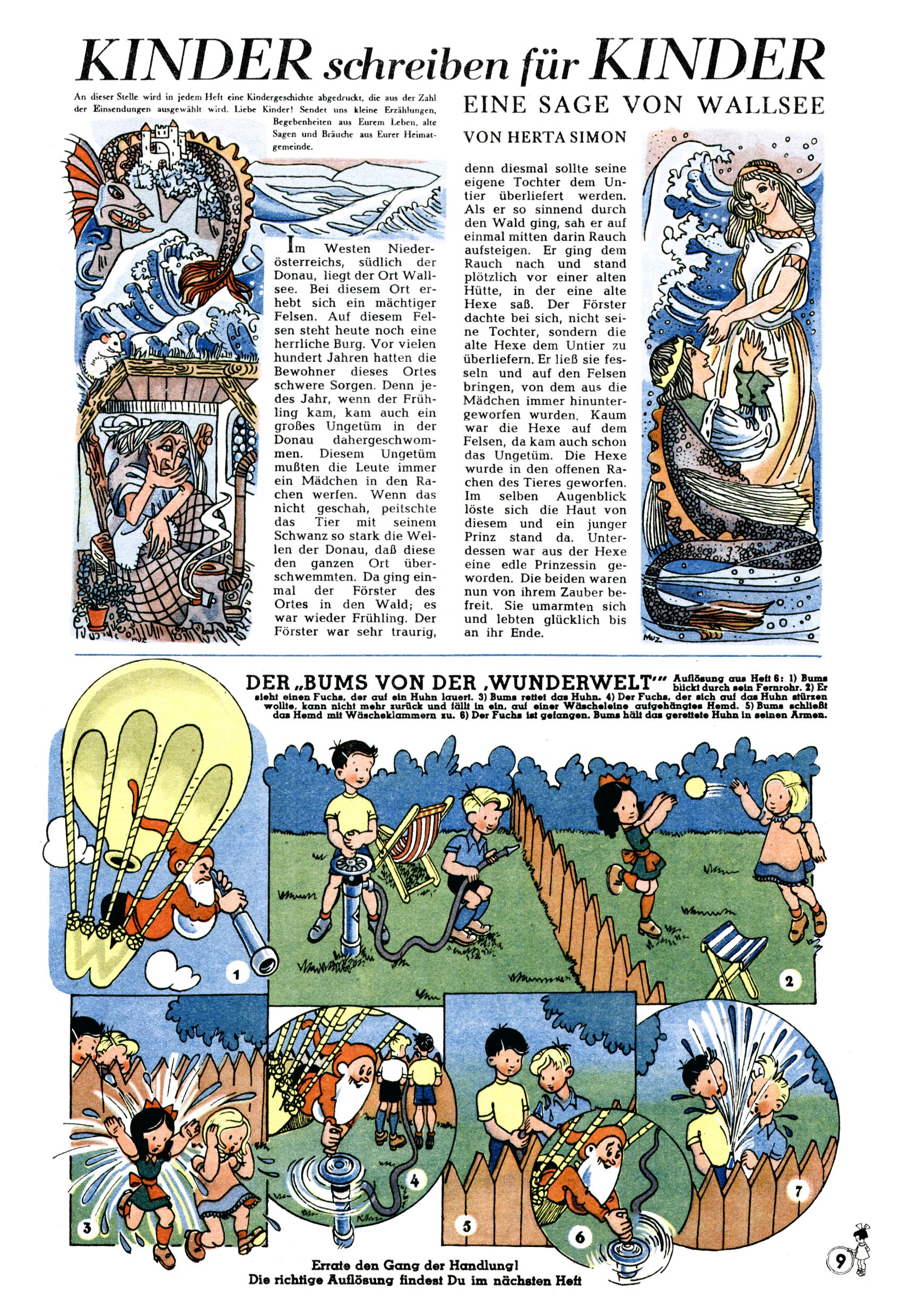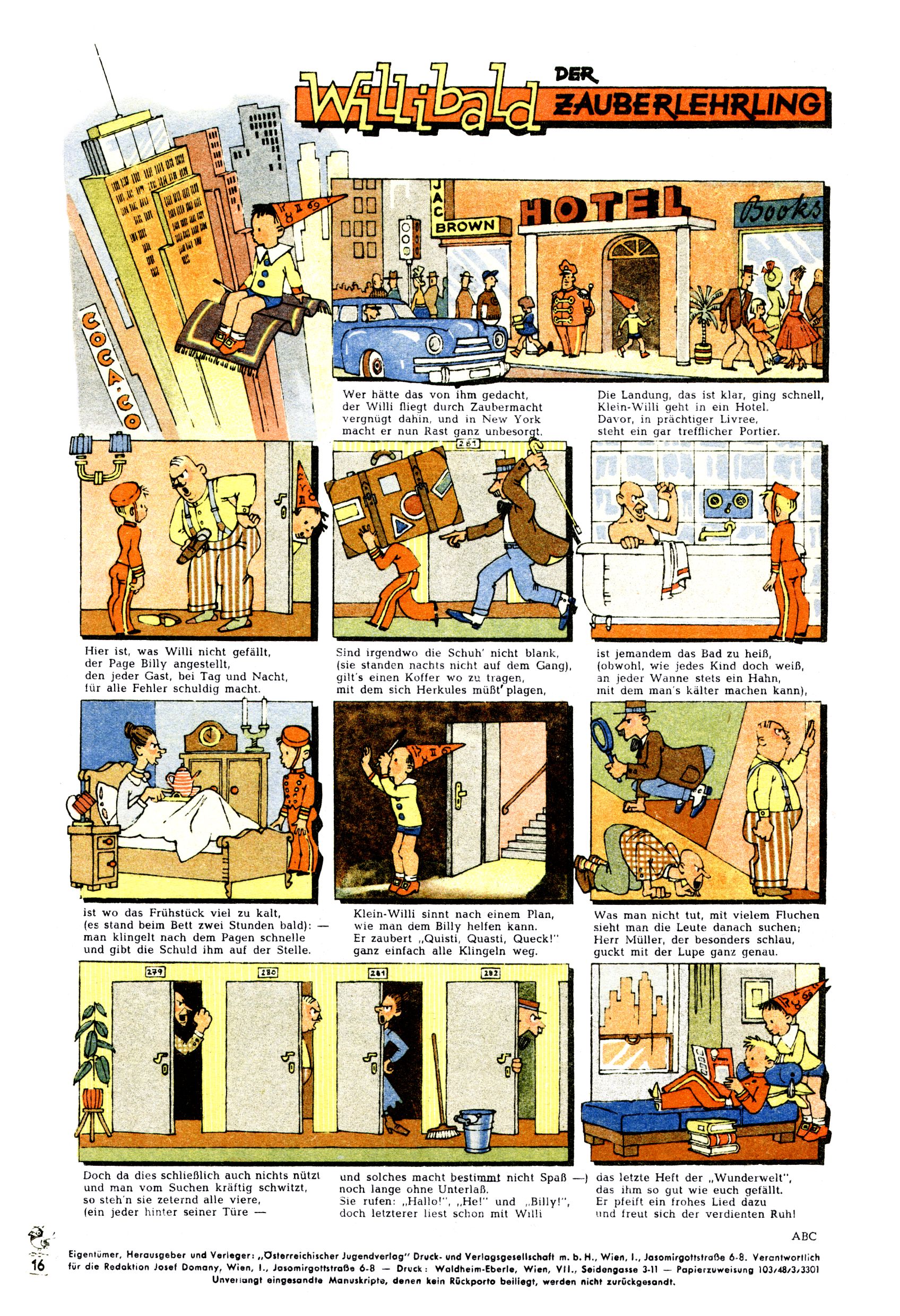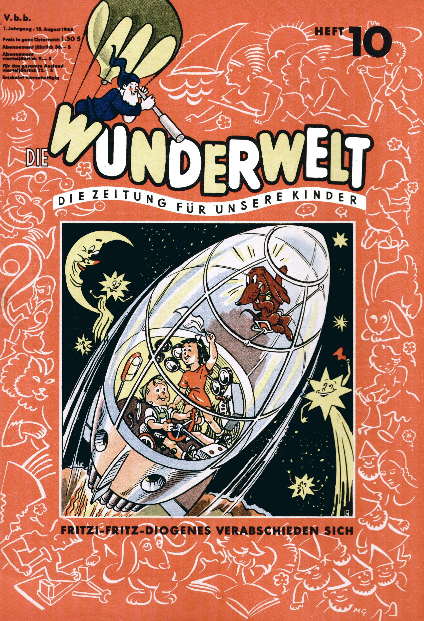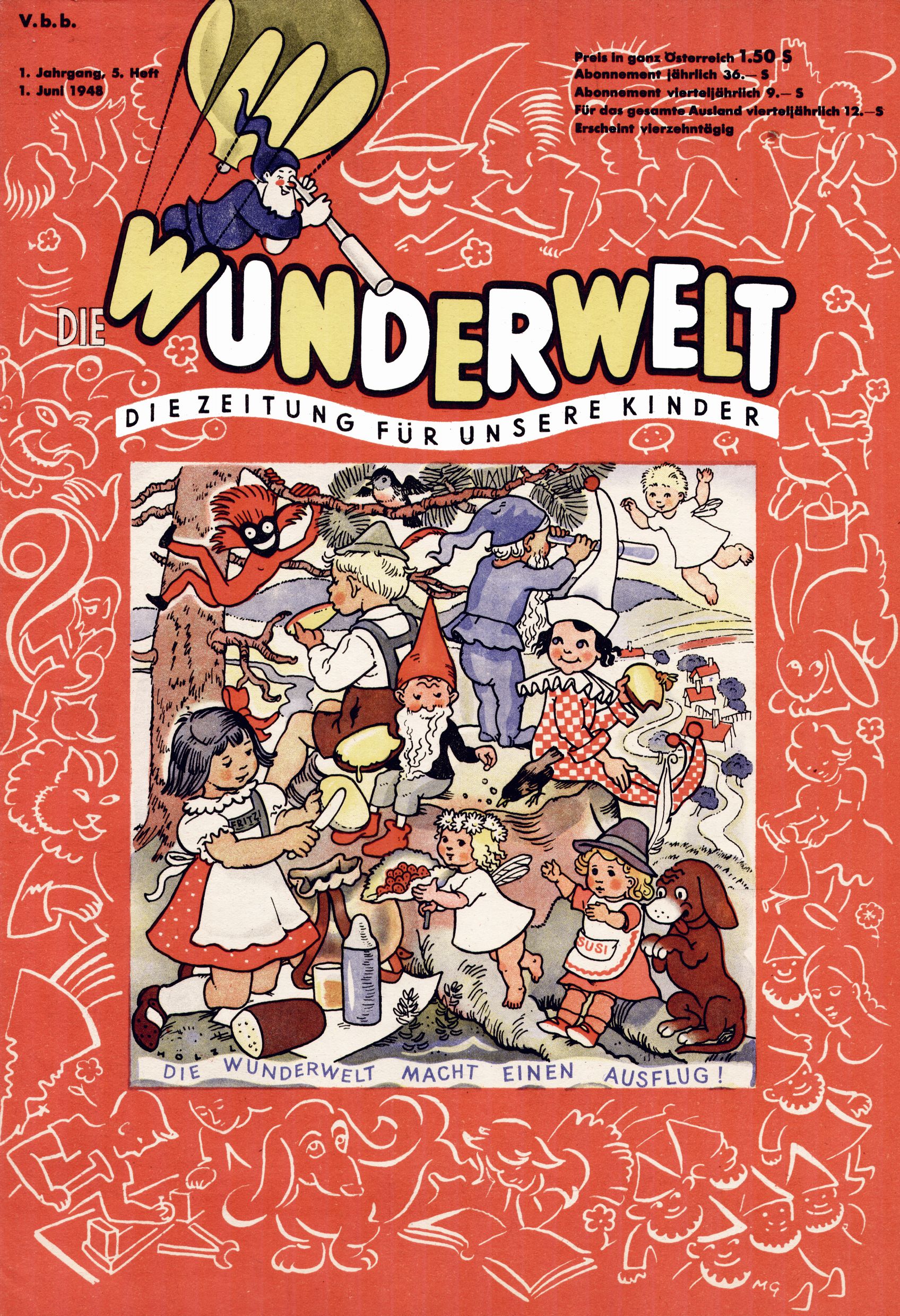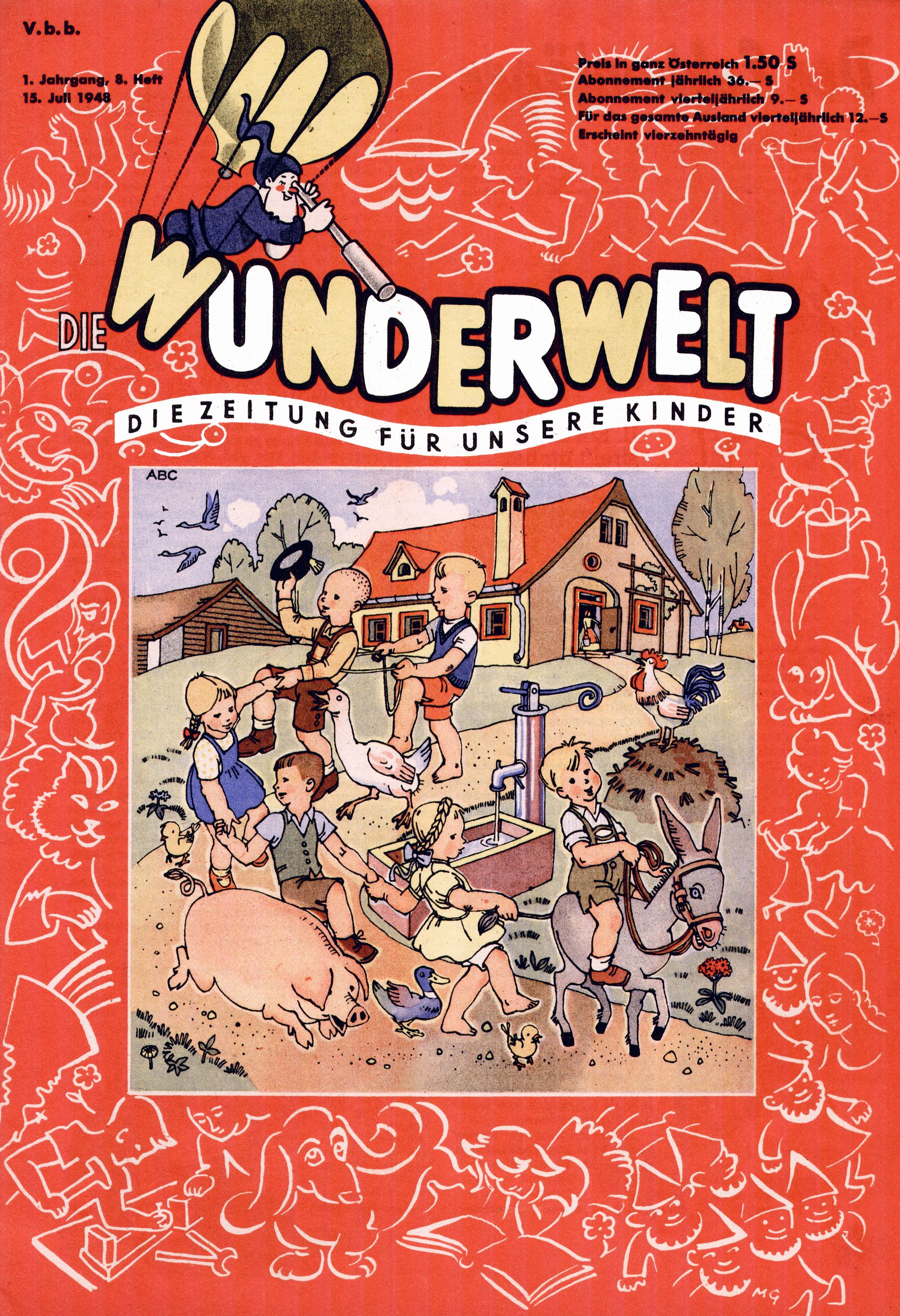 Das Gründungsjahr 1948 – Zeit der Experimente Als der Hauptschullehrer JD Josef Domany zu Ostern 1948 die Idee für eine neue Kinderzeitung umsetzte, war dies nicht nur ein großes finanzielles Risiko in einer ungewissen Zeit, sondern auch ein Schuss ins Blaue. Von den zu diesem Zeitpunkt existierenden österreichischen Kinderzeitungen Kinderpost und Unsere Zeitung suchte JD sich einen geeigneten Mix aus Geschichten, Comics und Aktivseiten heraus, definierte das Grundprinzip der Gewaltfreiheit, des Schönen und des Guten und zusammen mit Hans Weinhappel entwarf er ein Layout, das kostengünstig umgesetzt werden konnte. Ob dieses konservative Konzept Erfolg haben würde in einer Zeit, in der in einem wesentlichen Teil von Österreich die Kommunisten das Sagen hatten, war zunächst mehr als ungewiss. Dennoch wurde es eine erfolgreiche Geburt der Wunderwelt-Zeitung. Trotz häufiger kleinerer Umstellungen im ersten Jahr blieb das festgelegte Grundprinzip ab dem 2. Heft der Wunderwelt mehr als 20 Jahre lang praktisch unverändert: Die Comic-Geschichte als Aufhänger hinten, ein reizendes Titelbild als Blickfang vorne, in der Heftmitte das bunt gestaltete Mittelmächen und rundherum wurden weitere Geschichten, Informatives, Rätsel und Bastelbeiträge gruppiert. Die Abenteuer von Diogenes waren gleich im 1. Heft schon die erste Comicserie der Wunderwelt. Abgelöst wurde Diogenes durch Hokus und Willibald im 10. Heft 1948. Das war der erste wirkliche Geniestreich. Die einfallsreichen und kreativ umgesetzten Abenteuer des Zauberlehrlings Willibald waren mehr als ein Jahrzehnt lang am Höhenflug der Zeitung beteiligt. Zwerg Bumsti hatte 1948 noch nicht das Licht der Welt erblickt. Aber Wichtelmännlein auf Froschjagd im 16. Heft war die erste Vorgängergeschichte zu Bumstis Abenteuer. Weiters trugen die lieblichen Mittelmärchen und die Bastelideen von Hans Weinhappel bereits maßgeblich zum wachsenden Erfolg der Wunderwelt bei. Das einzige Standbein der Zeitung, das 1948 noch fehlte, waren die Ausschneidebögen. Ende 1948 war dann die Liste der meisten großen Namen unter den Zeichnern der Wunderwelt des ersten Jahrzehnts komplett: Peter Paul Prinz, Teja Aicher, Rosl Warzilek, Felicitas Kuhn und Lisbeth Hölzl. Bei den Pädagogen und Textern kam es abgesehen von Hans Weinhappel noch zu umfangreicheren Umstellungen. Kurt Kluger, der die ersten Technik- und Rätselbeiträge der Zeitung