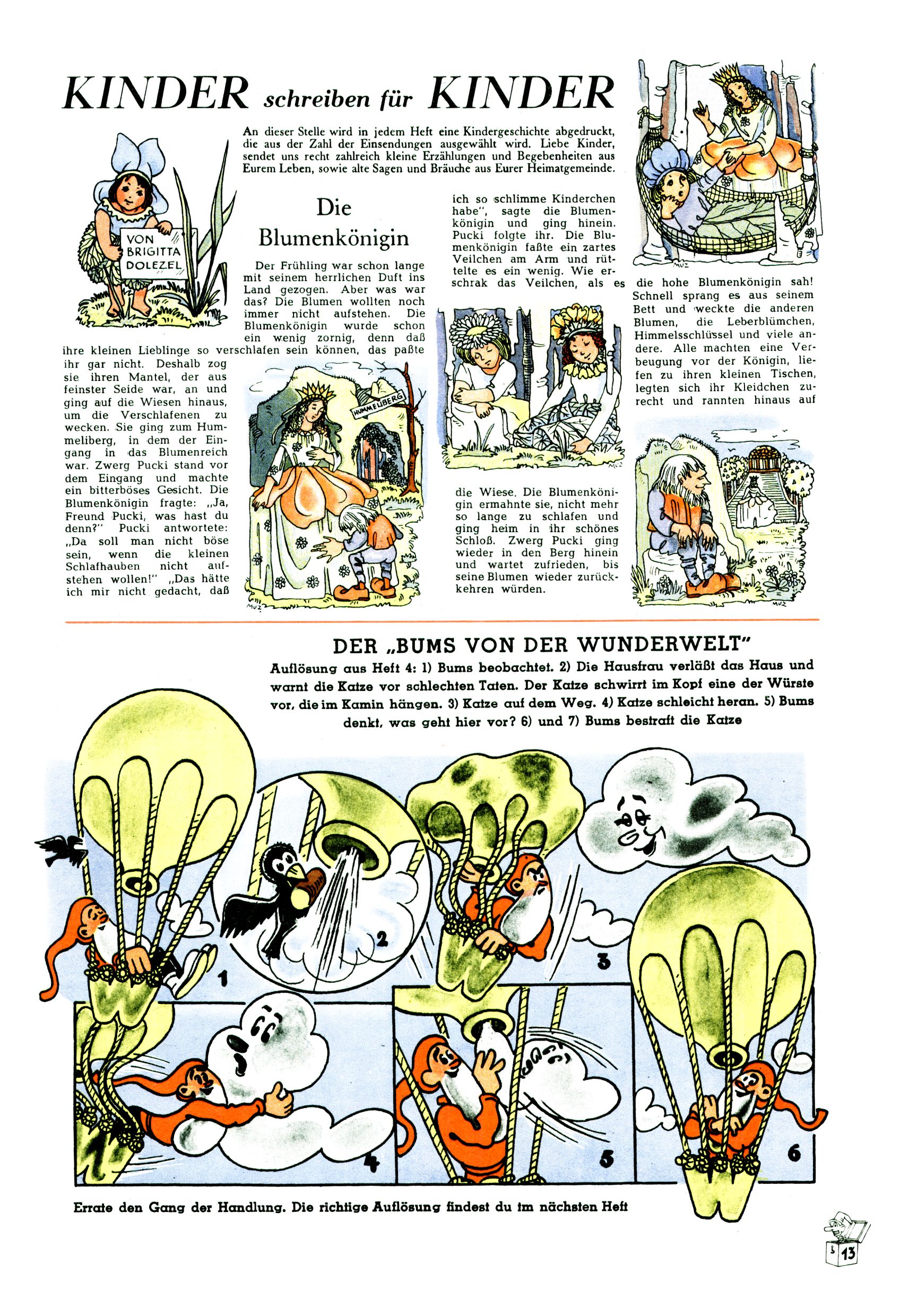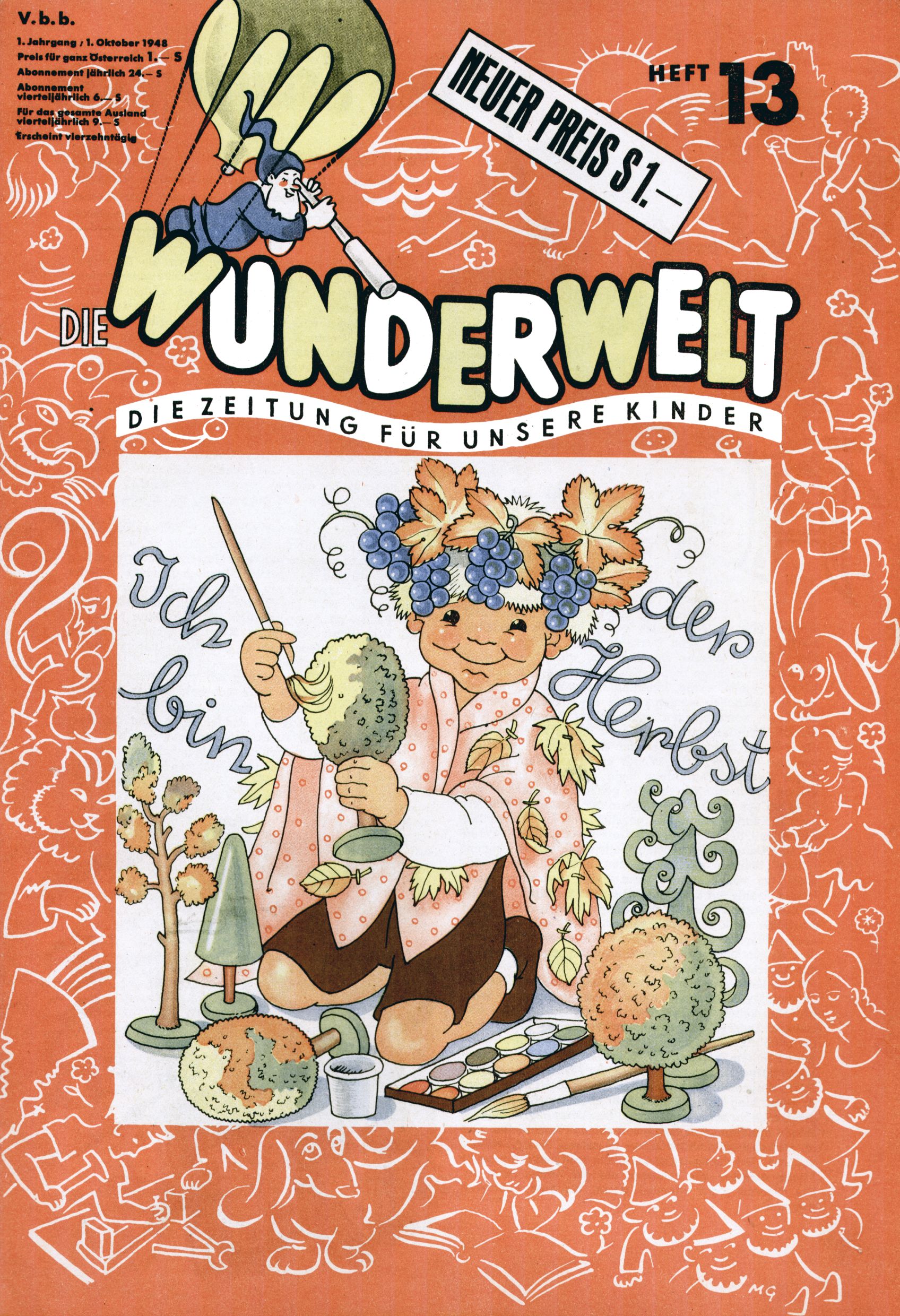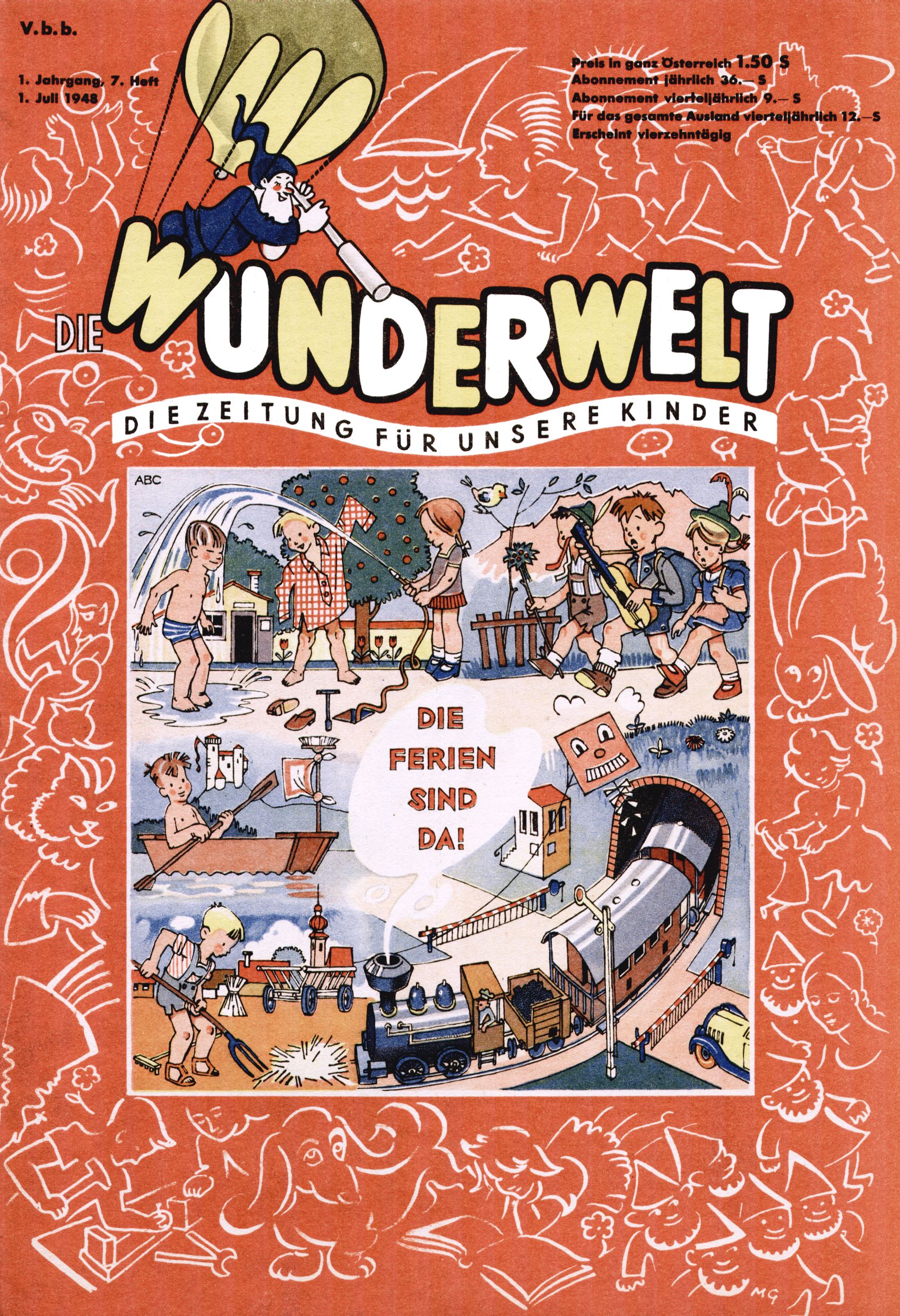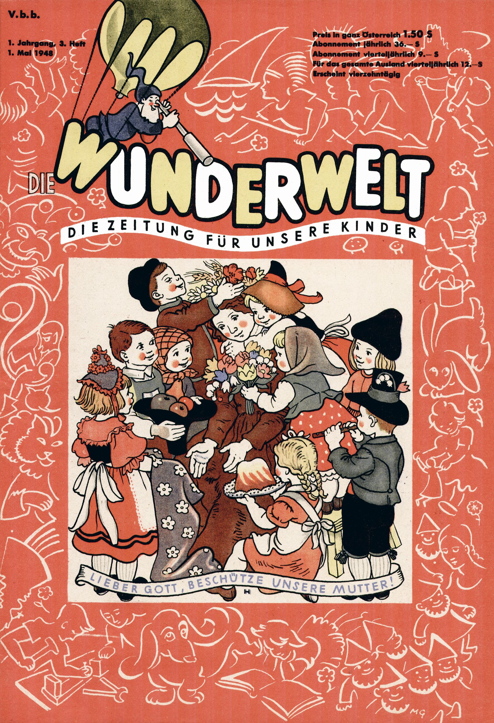 Das Gründungsjahr 1948 – Zeit der Experimente Als der Hauptschullehrer JD Josef Domany zu Ostern 1948 die Idee für eine neue Kinderzeitung umsetzte, war dies nicht nur ein großes finanzielles Risiko in einer ungewissen Zeit, sondern auch ein Schuss ins Blaue. Von den zu diesem Zeitpunkt existierenden österreichischen Kinderzeitungen Kinderpost und Unsere Zeitung suchte JD sich einen geeigneten Mix aus Geschichten, Comics und Aktivseiten heraus, definierte das Grundprinzip der Gewaltfreiheit, des Schönen und des Guten und zusammen mit Hans Weinhappel entwarf er ein Layout, das kostengünstig umgesetzt werden konnte. Ob dieses konservative Konzept Erfolg haben würde in einer Zeit, in der in einem wesentlichen Teil von Österreich die Kommunisten das Sagen hatten, war zunächst mehr als ungewiss. Dennoch wurde es eine erfolgreiche Geburt der Wunderwelt-Zeitung. Trotz häufiger kleinerer Umstellungen im ersten Jahr blieb das festgelegte Grundprinzip ab dem 2. Heft der Wunderwelt mehr als 20 Jahre lang praktisch unverändert: Die Comic-Geschichte als Aufhänger hinten, ein reizendes Titelbild als Blickfang vorne, in der Heftmitte das bunt gestaltete Mittelmächen und rundherum wurden weitere Geschichten, Informatives, Rätsel und Bastelbeiträge gruppiert. Die Abenteuer von Diogenes waren gleich im 1. Heft schon die erste Comicserie der Wunderwelt. Abgelöst wurde Diogenes durch Hokus und Willibald im 10. Heft 1948. Das war der erste wirkliche Geniestreich. Die einfallsreichen und kreativ umgesetzten Abenteuer des Zauberlehrlings Willibald waren mehr als ein Jahrzehnt lang am Höhenflug der Zeitung beteiligt. Zwerg Bumsti hatte 1948 noch nicht das Licht der Welt erblickt. Aber Wichtelmännlein auf Froschjagd im 16. Heft war die erste Vorgängergeschichte zu Bumstis Abenteuer. Weiters trugen die lieblichen Mittelmärchen und die Bastelideen von Hans Weinhappel bereits maßgeblich zum wachsenden Erfolg der Wunderwelt bei. Das einzige Standbein der Zeitung, das 1948 noch fehlte, waren die Ausschneidebögen. Ende 1948 war dann die Liste der meisten großen Namen unter den Zeichnern der Wunderwelt des ersten Jahrzehnts komplett: Peter Paul Prinz, Teja Aicher, Rosl Warzilek, Felicitas Kuhn und Lisbeth Hölzl. Bei den Pädagogen und Textern kam es abgesehen von Hans Weinhappel noch zu umfangreicheren Umstellungen. Kurt Kluger, der die ersten Technik- und Rätselbeiträge der Zeitung