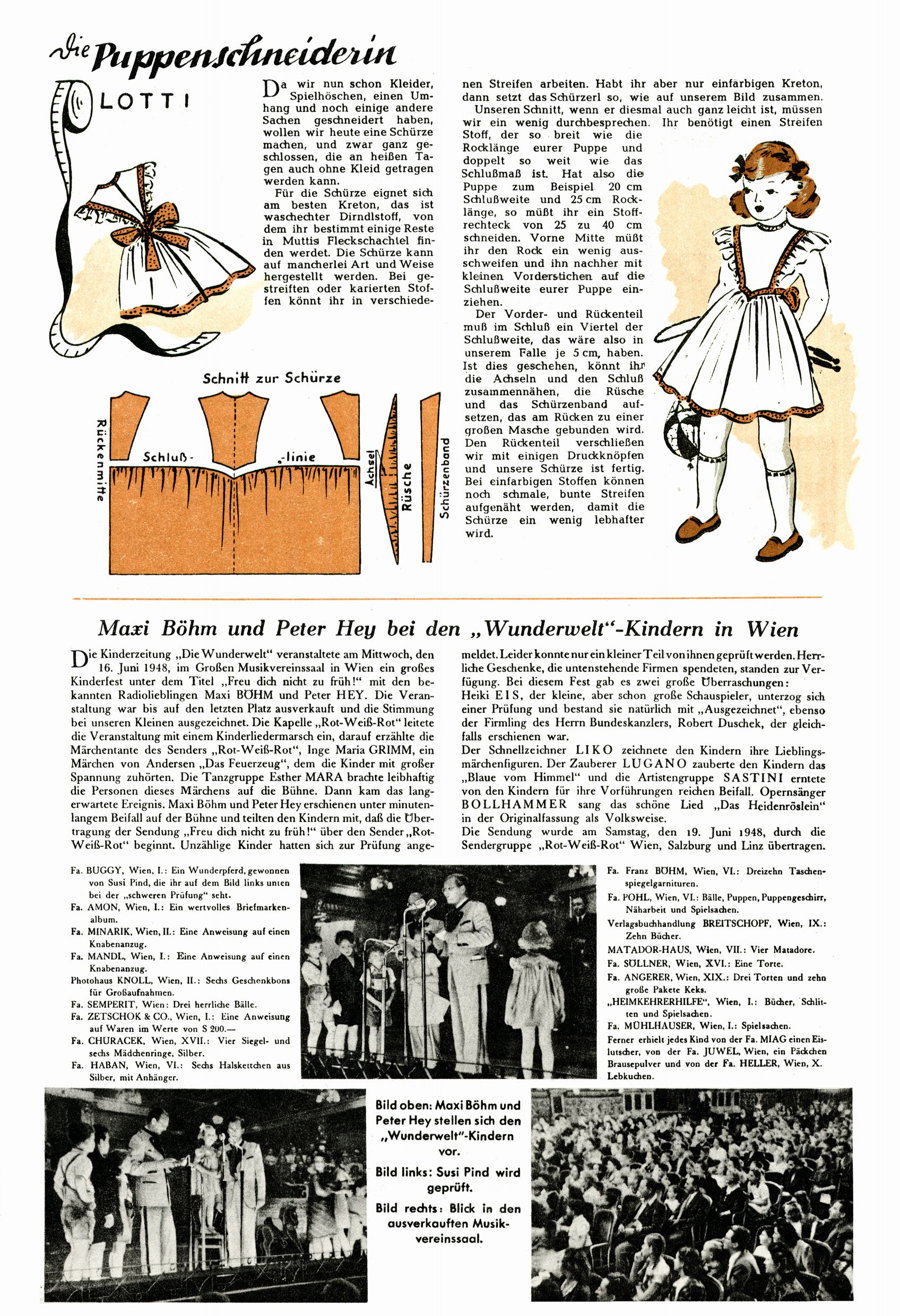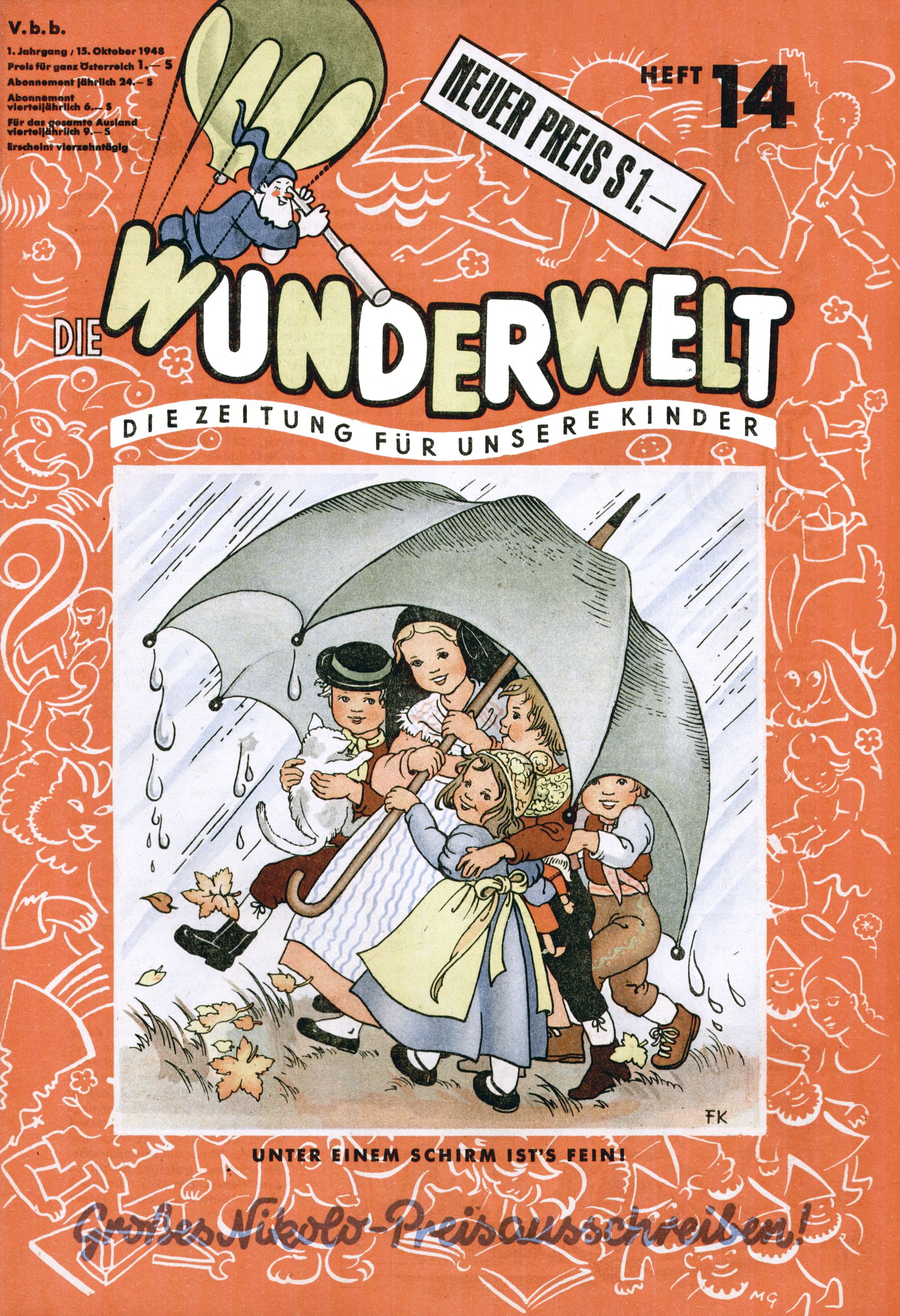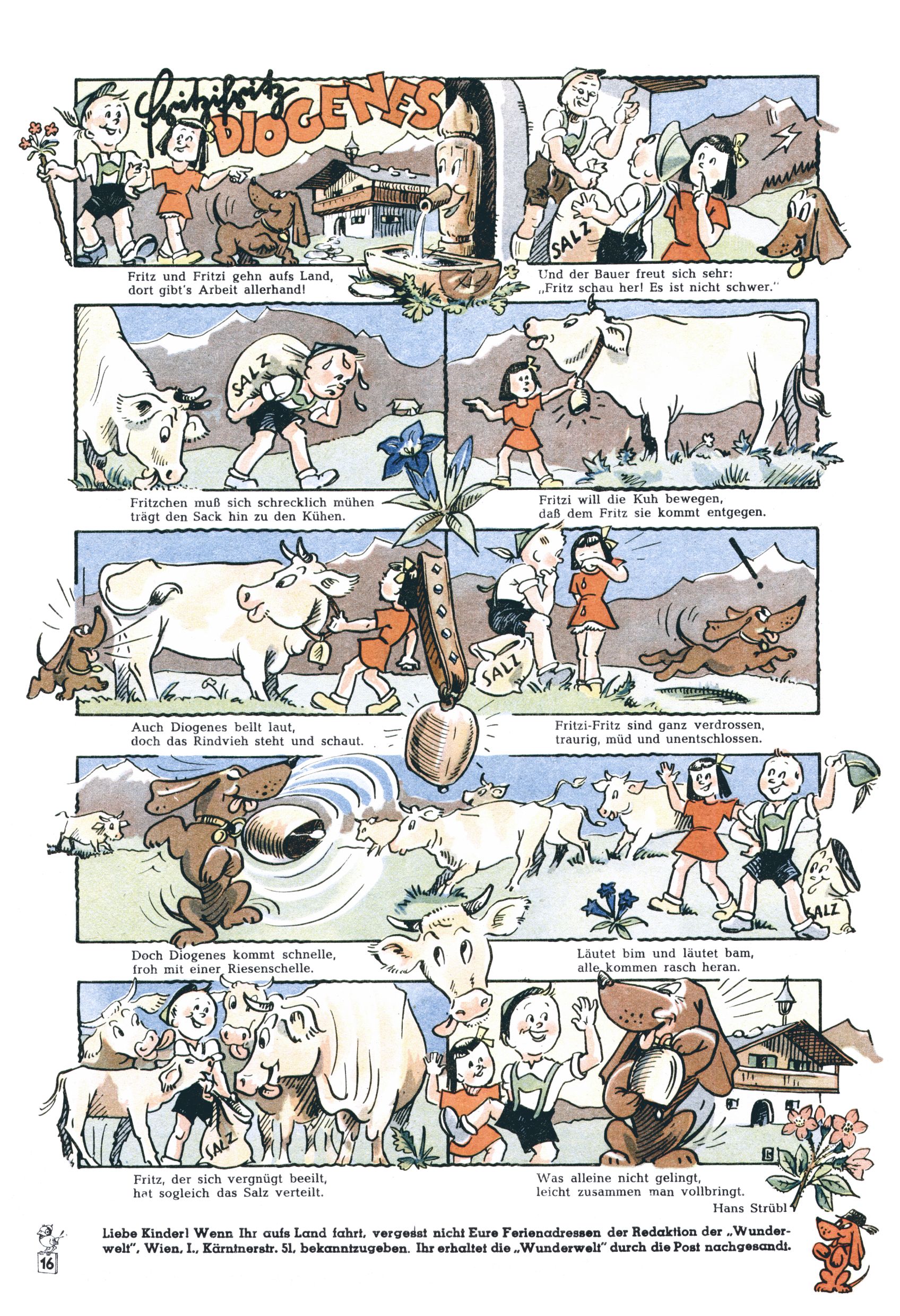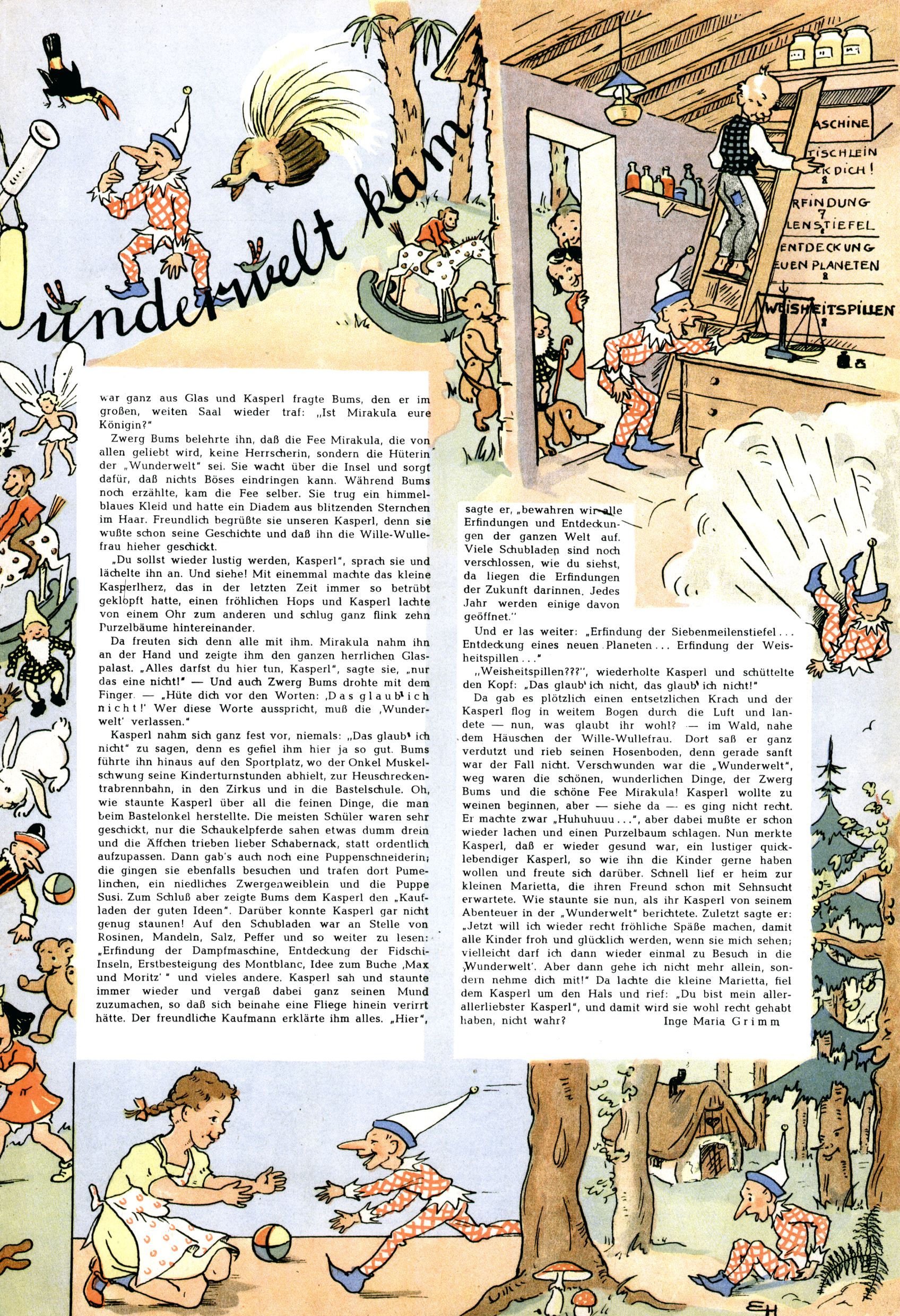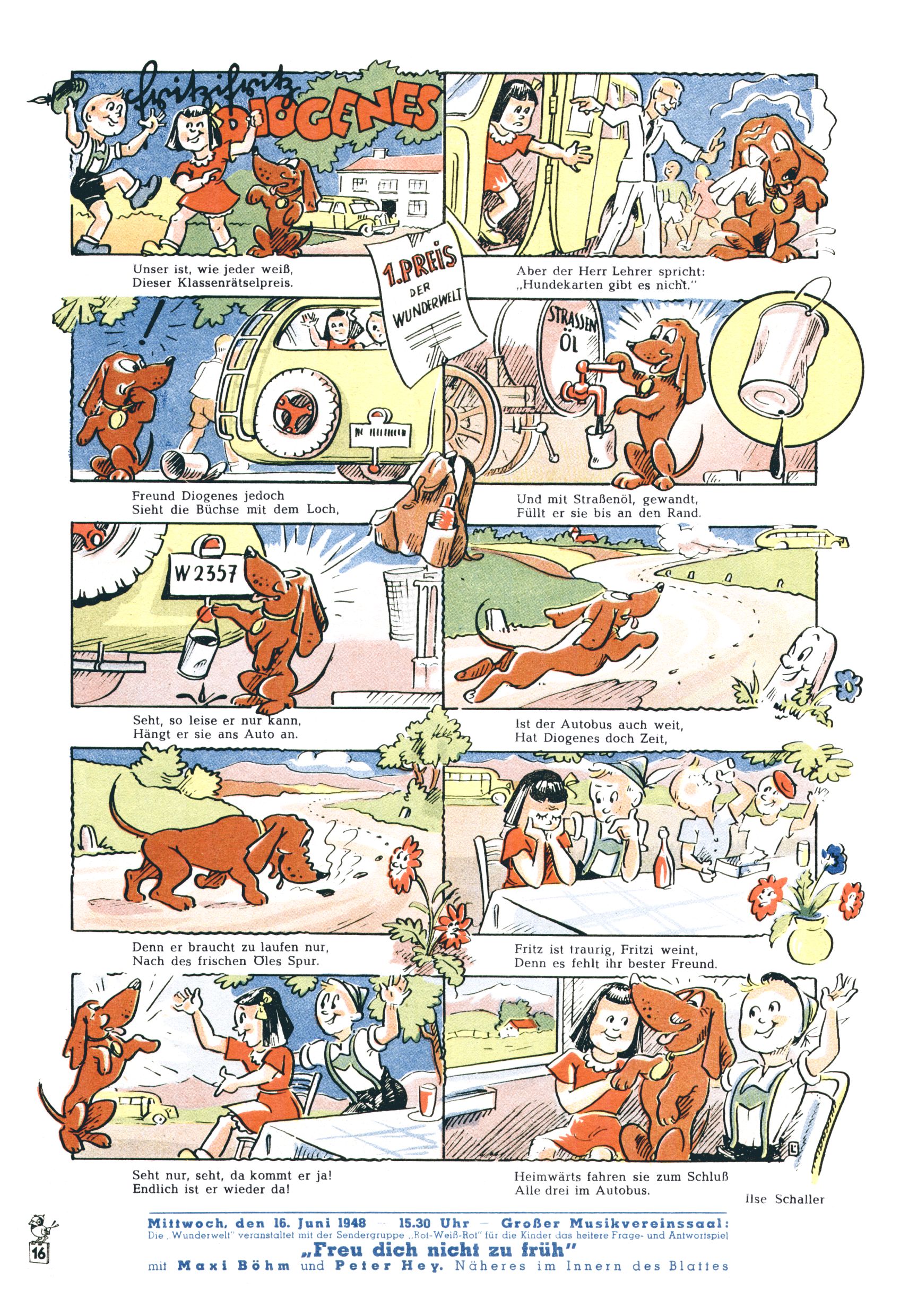 Das Gründungsjahr 1948 – Zeit der Experimente Als der Hauptschullehrer JD Josef Domany zu Ostern 1948 die Idee für eine neue Kinderzeitung umsetzte, war dies nicht nur ein großes finanzielles Risiko in einer ungewissen Zeit, sondern auch ein Schuss ins Blaue. Von den zu diesem Zeitpunkt existierenden österreichischen Kinderzeitungen Kinderpost und Unsere Zeitung suchte JD sich einen geeigneten Mix aus Geschichten, Comics und Aktivseiten heraus, definierte das Grundprinzip der Gewaltfreiheit, des Schönen und des Guten und zusammen mit Hans Weinhappel entwarf er ein Layout, das kostengünstig umgesetzt werden konnte. Ob dieses konservative Konzept Erfolg haben würde in einer Zeit, in der in einem wesentlichen Teil von Österreich die Kommunisten das Sagen hatten, war zunächst mehr als ungewiss. Dennoch wurde es eine erfolgreiche Geburt der Wunderwelt-Zeitung. Trotz häufiger kleinerer Umstellungen im ersten Jahr blieb das festgelegte Grundprinzip ab dem 2. Heft der Wunderwelt mehr als 20 Jahre lang praktisch unverändert: Die Comic-Geschichte als Aufhänger hinten, ein reizendes Titelbild als Blickfang vorne, in der Heftmitte das bunt gestaltete Mittelmächen und rundherum wurden weitere Geschichten, Informatives, Rätsel und Bastelbeiträge gruppiert. Die Abenteuer von Diogenes waren gleich im 1. Heft schon die erste Comicserie der Wunderwelt. Abgelöst wurde Diogenes durch Hokus und Willibald im 10. Heft 1948. Das war der erste wirkliche Geniestreich. Die einfallsreichen und kreativ umgesetzten Abenteuer des Zauberlehrlings Willibald waren mehr als ein Jahrzehnt lang am Höhenflug der Zeitung beteiligt. Zwerg Bumsti hatte 1948 noch nicht das Licht der Welt erblickt. Aber Wichtelmännlein auf Froschjagd im 16. Heft war die erste Vorgängergeschichte zu Bumstis Abenteuer. Weiters trugen die lieblichen Mittelmärchen und die Bastelideen von Hans Weinhappel bereits maßgeblich zum wachsenden Erfolg der Wunderwelt bei. Das einzige Standbein der Zeitung, das 1948 noch fehlte, waren die Ausschneidebögen. Ende 1948 war dann die Liste der meisten großen Namen unter den Zeichnern der Wunderwelt des ersten Jahrzehnts komplett: Peter Paul Prinz, Teja Aicher, Rosl Warzilek, Felicitas Kuhn und Lisbeth Hölzl. Bei den Pädagogen und Textern kam es abgesehen von Hans Weinhappel noch zu umfangreicheren Umstellungen. Kurt Kluger, der die ersten Technik- und Rätselbeiträge der Zeitung