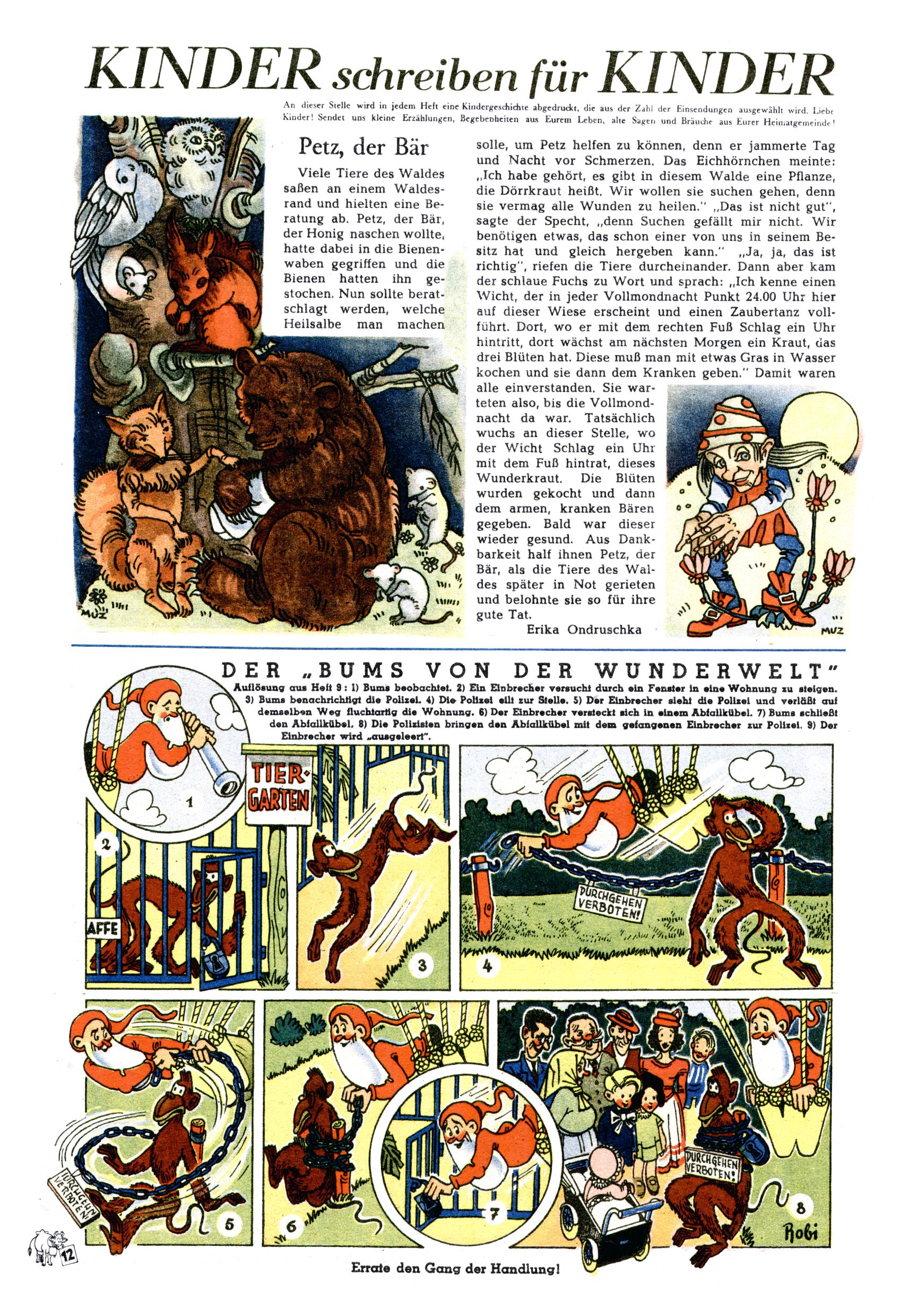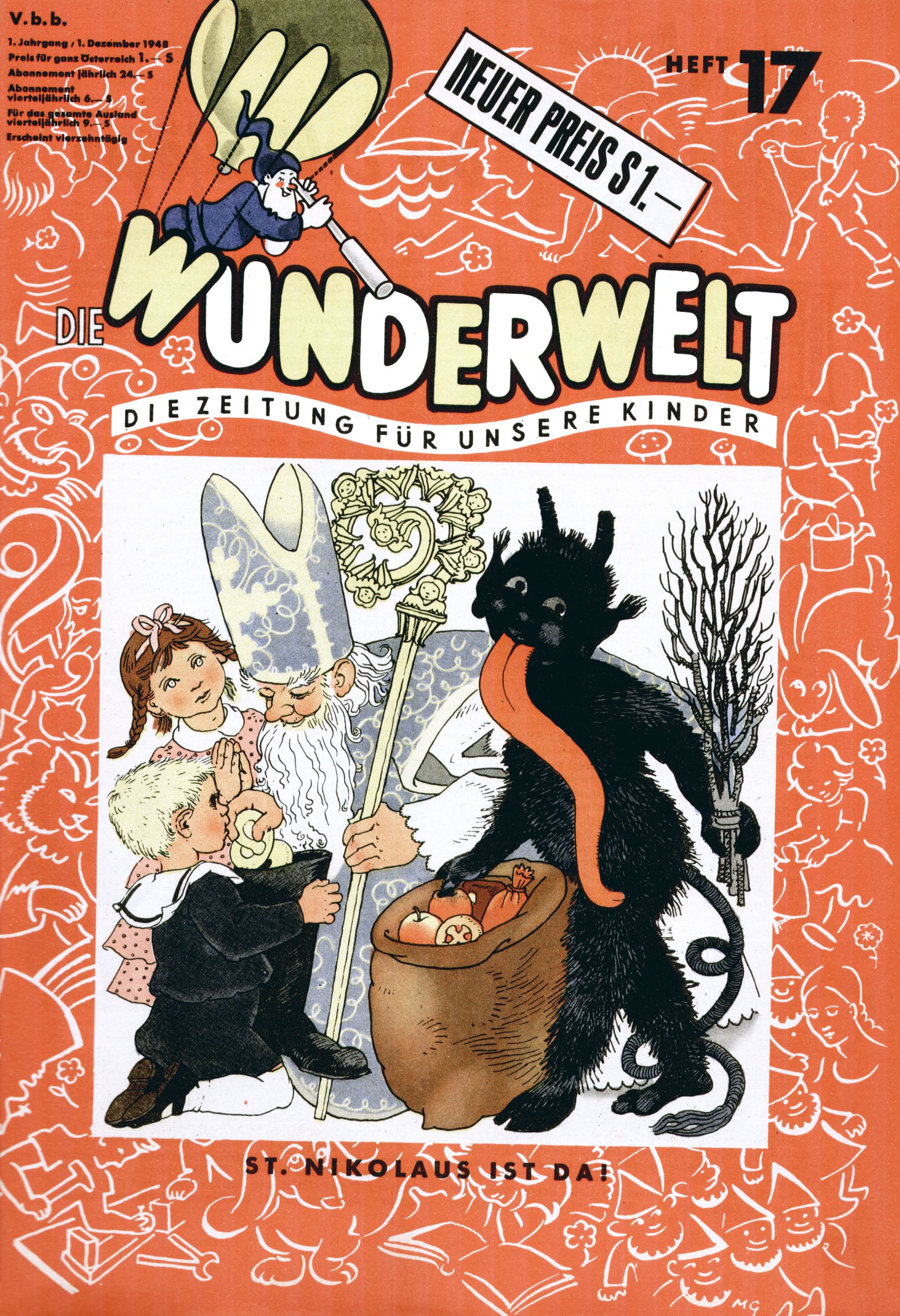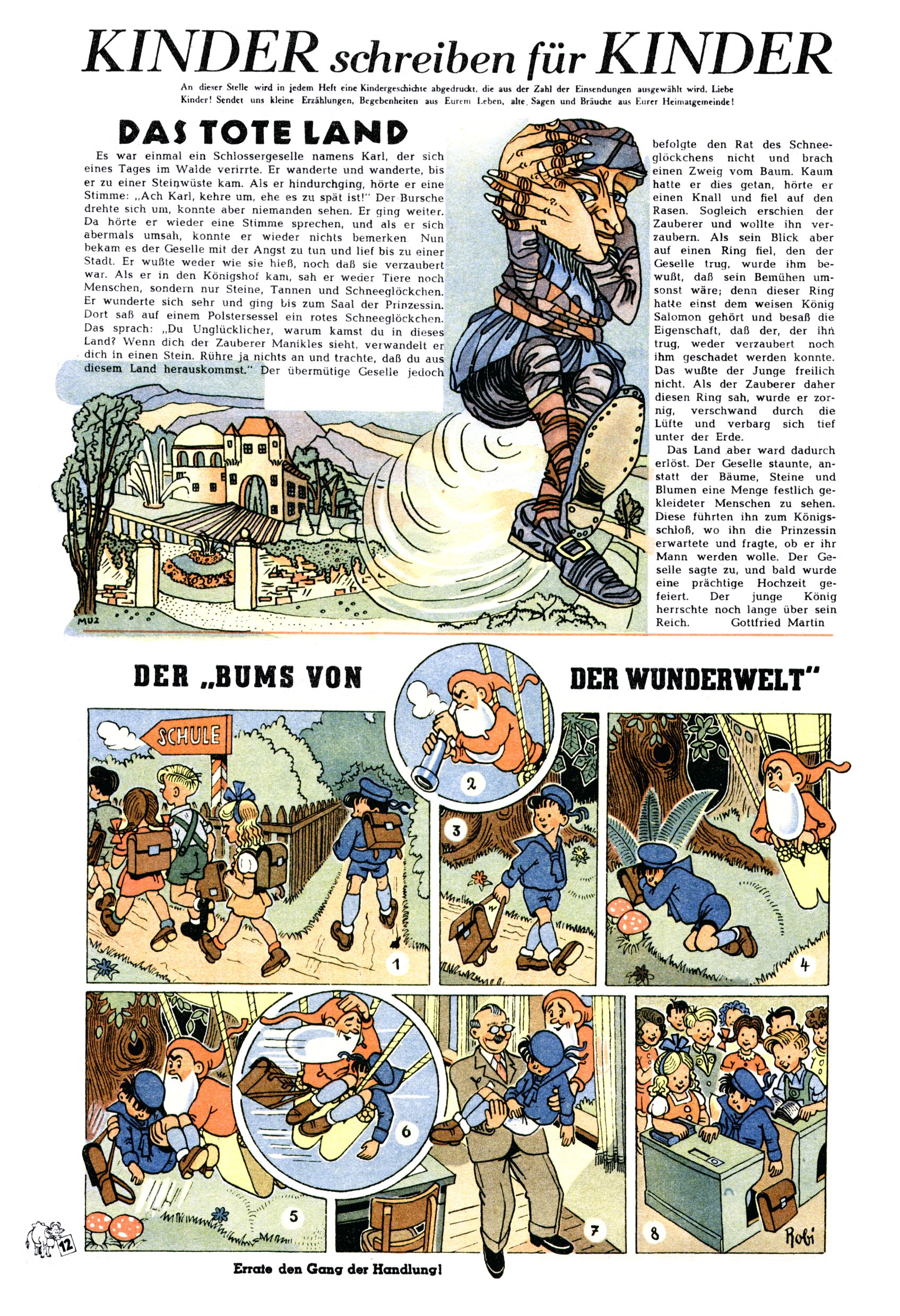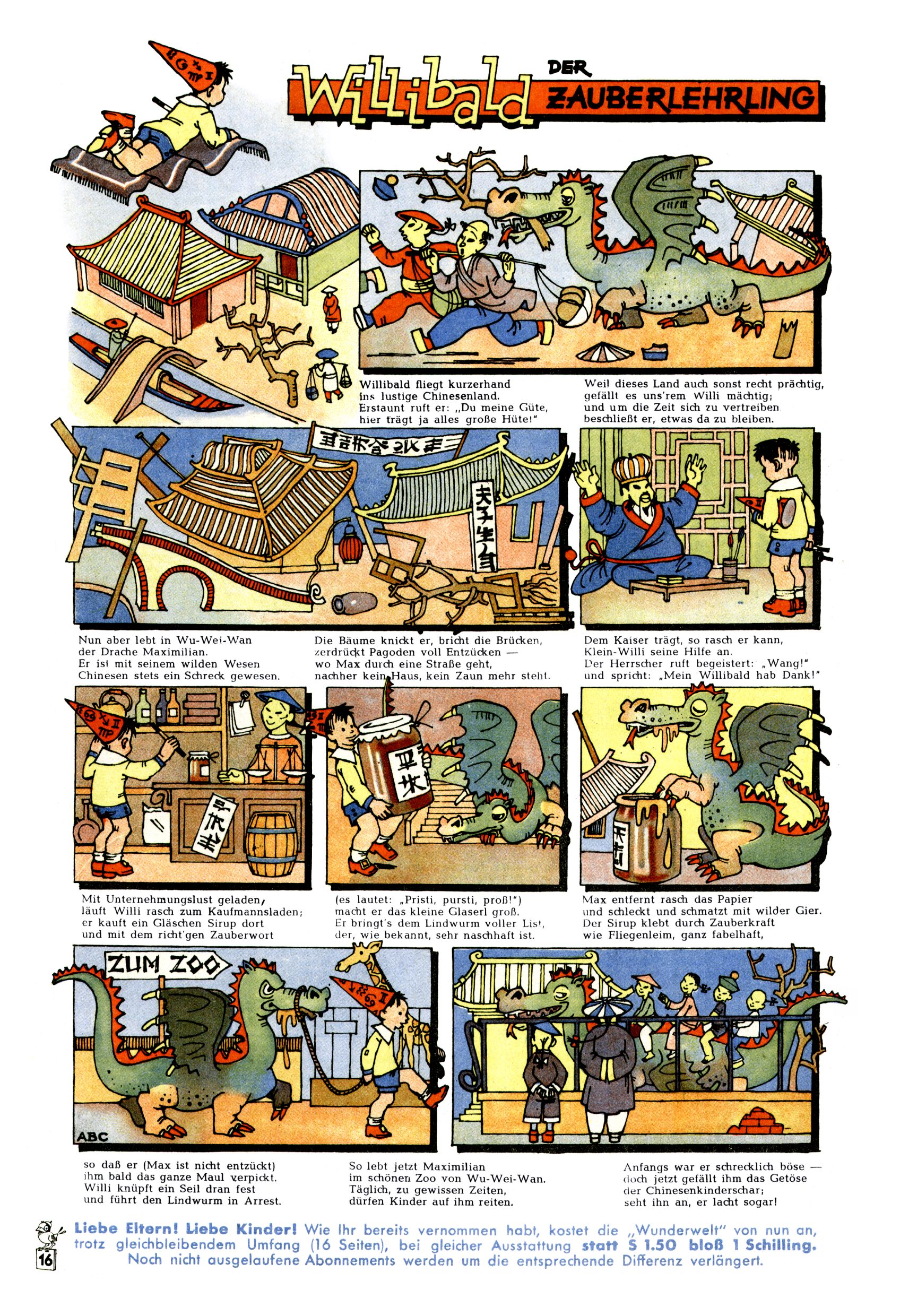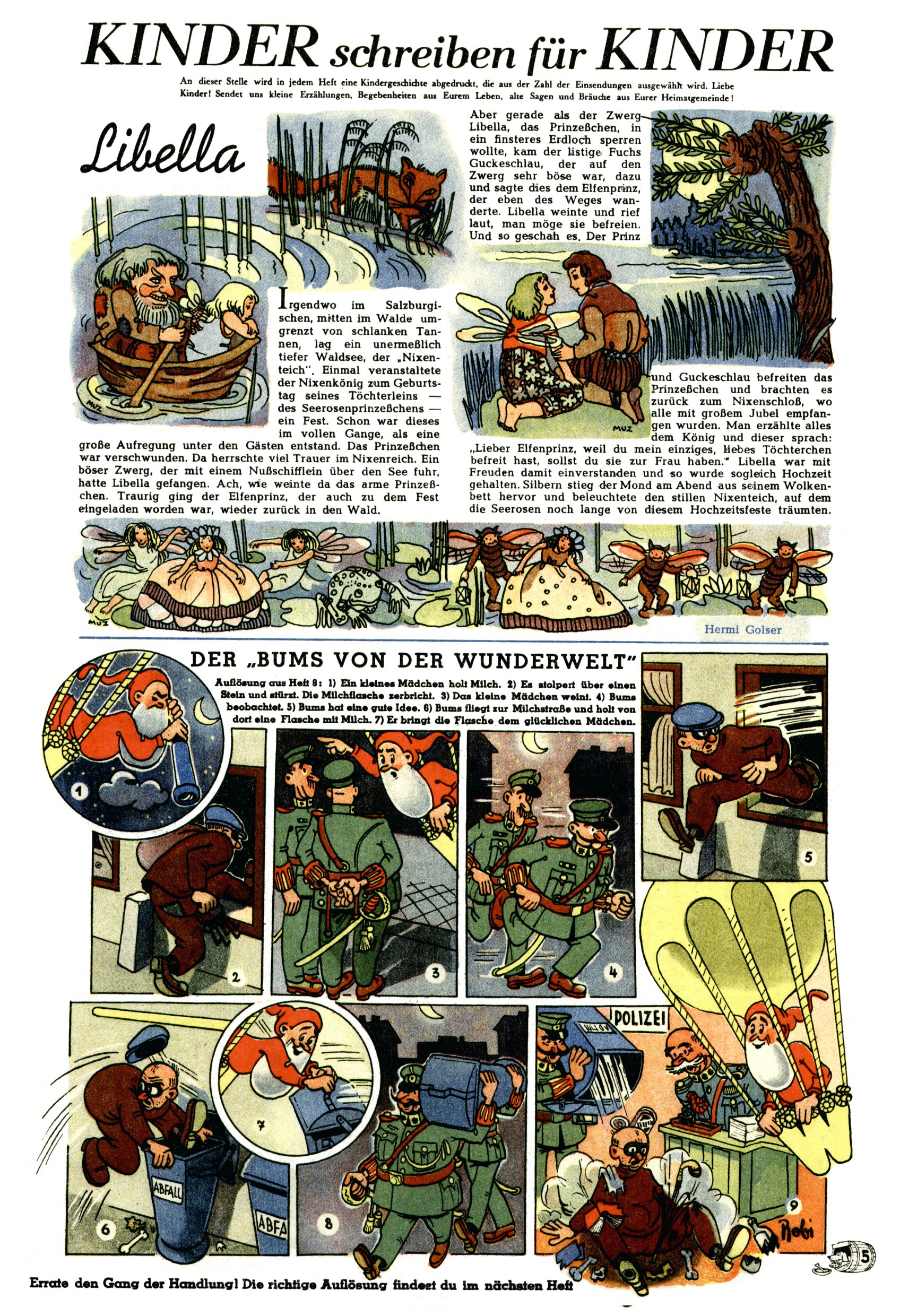 Das Gründungsjahr 1948 – Zeit der Experimente Als der Hauptschullehrer JD Josef Domany zu Ostern 1948 die Idee für eine neue Kinderzeitung umsetzte, war dies nicht nur ein großes finanzielles Risiko in einer ungewissen Zeit, sondern auch ein Schuss ins Blaue. Von den zu diesem Zeitpunkt existierenden österreichischen Kinderzeitungen Kinderpost und Unsere Zeitung suchte JD sich einen geeigneten Mix aus Geschichten, Comics und Aktivseiten heraus, definierte das Grundprinzip der Gewaltfreiheit, des Schönen und des Guten und zusammen mit Hans Weinhappel entwarf er ein Layout, das kostengünstig umgesetzt werden konnte. Ob dieses konservative Konzept Erfolg haben würde in einer Zeit, in der in einem wesentlichen Teil von Österreich die Kommunisten das Sagen hatten, war zunächst mehr als ungewiss. Dennoch wurde es eine erfolgreiche Geburt der Wunderwelt-Zeitung. Trotz häufiger kleinerer Umstellungen im ersten Jahr blieb das festgelegte Grundprinzip ab dem 2. Heft der Wunderwelt mehr als 20 Jahre lang praktisch unverändert: Die Comic-Geschichte als Aufhänger hinten, ein reizendes Titelbild als Blickfang vorne, in der Heftmitte das bunt gestaltete Mittelmächen und rundherum wurden weitere Geschichten, Informatives, Rätsel und Bastelbeiträge gruppiert. Die Abenteuer von Diogenes waren gleich im 1. Heft schon die erste Comicserie der Wunderwelt. Abgelöst wurde Diogenes durch Hokus und Willibald im 10. Heft 1948. Das war der erste wirkliche Geniestreich. Die einfallsreichen und kreativ umgesetzten Abenteuer des Zauberlehrlings Willibald waren mehr als ein Jahrzehnt lang am Höhenflug der Zeitung beteiligt. Zwerg Bumsti hatte 1948 noch nicht das Licht der Welt erblickt. Aber Wichtelmännlein auf Froschjagd im 16. Heft war die erste Vorgängergeschichte zu Bumstis Abenteuer. Weiters trugen die lieblichen Mittelmärchen und die Bastelideen von Hans Weinhappel bereits maßgeblich zum wachsenden Erfolg der Wunderwelt bei. Das einzige Standbein der Zeitung, das 1948 noch fehlte, waren die Ausschneidebögen. Ende 1948 war dann die Liste der meisten großen Namen unter den Zeichnern der Wunderwelt des ersten Jahrzehnts komplett: Peter Paul Prinz, Teja Aicher, Rosl Warzilek, Felicitas Kuhn und Lisbeth Hölzl. Bei den Pädagogen und Textern kam es abgesehen von Hans Weinhappel noch zu umfangreicheren Umstellungen. Kurt Kluger, der die ersten Technik- und Rätselbeiträge der Zeitung