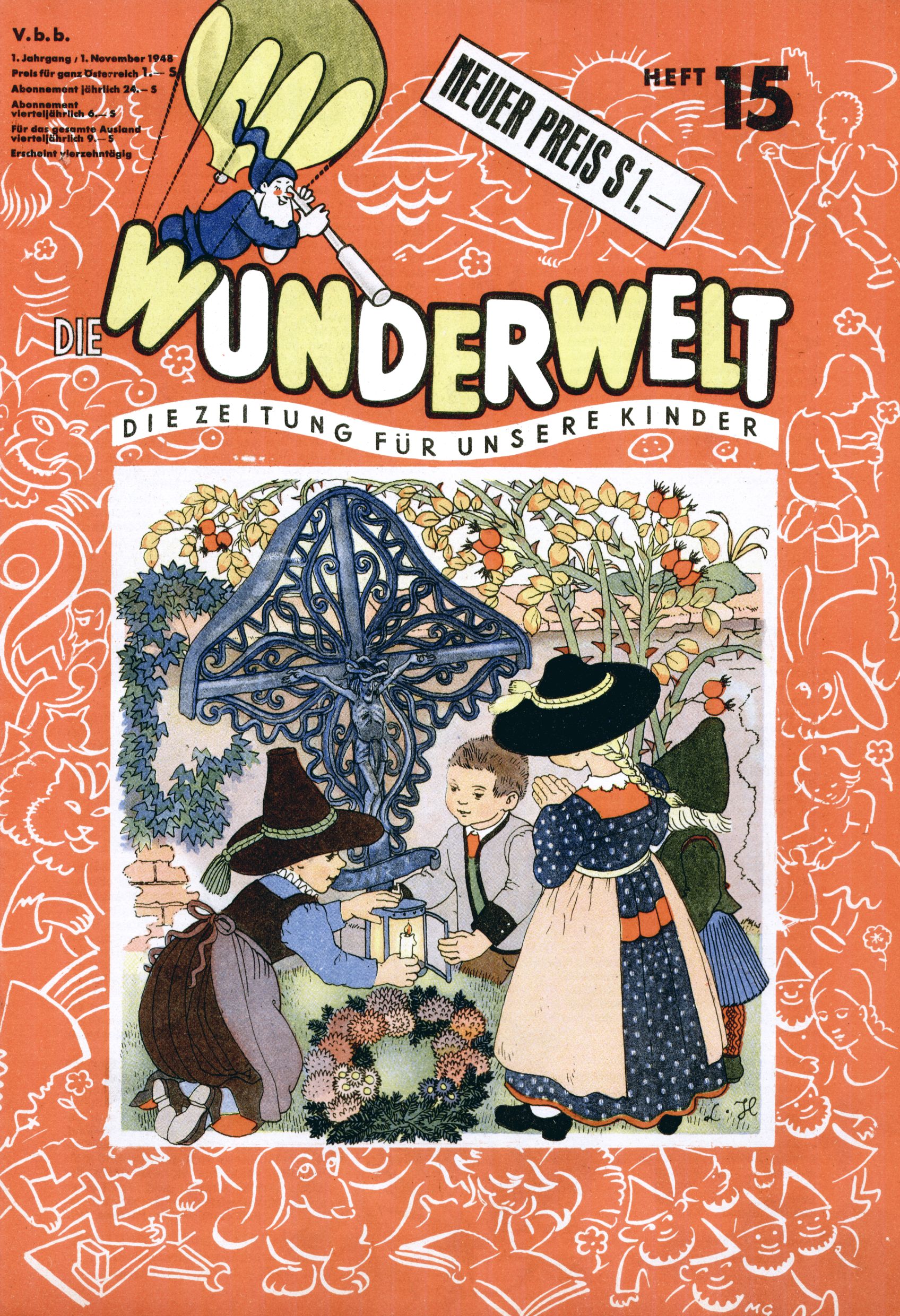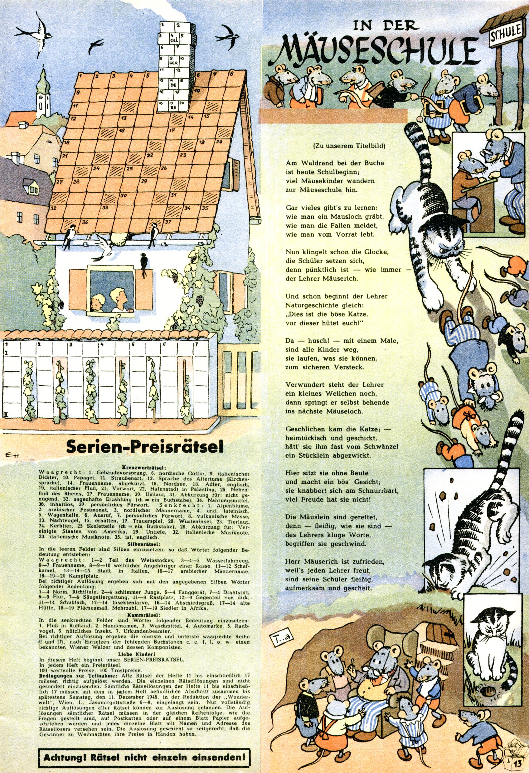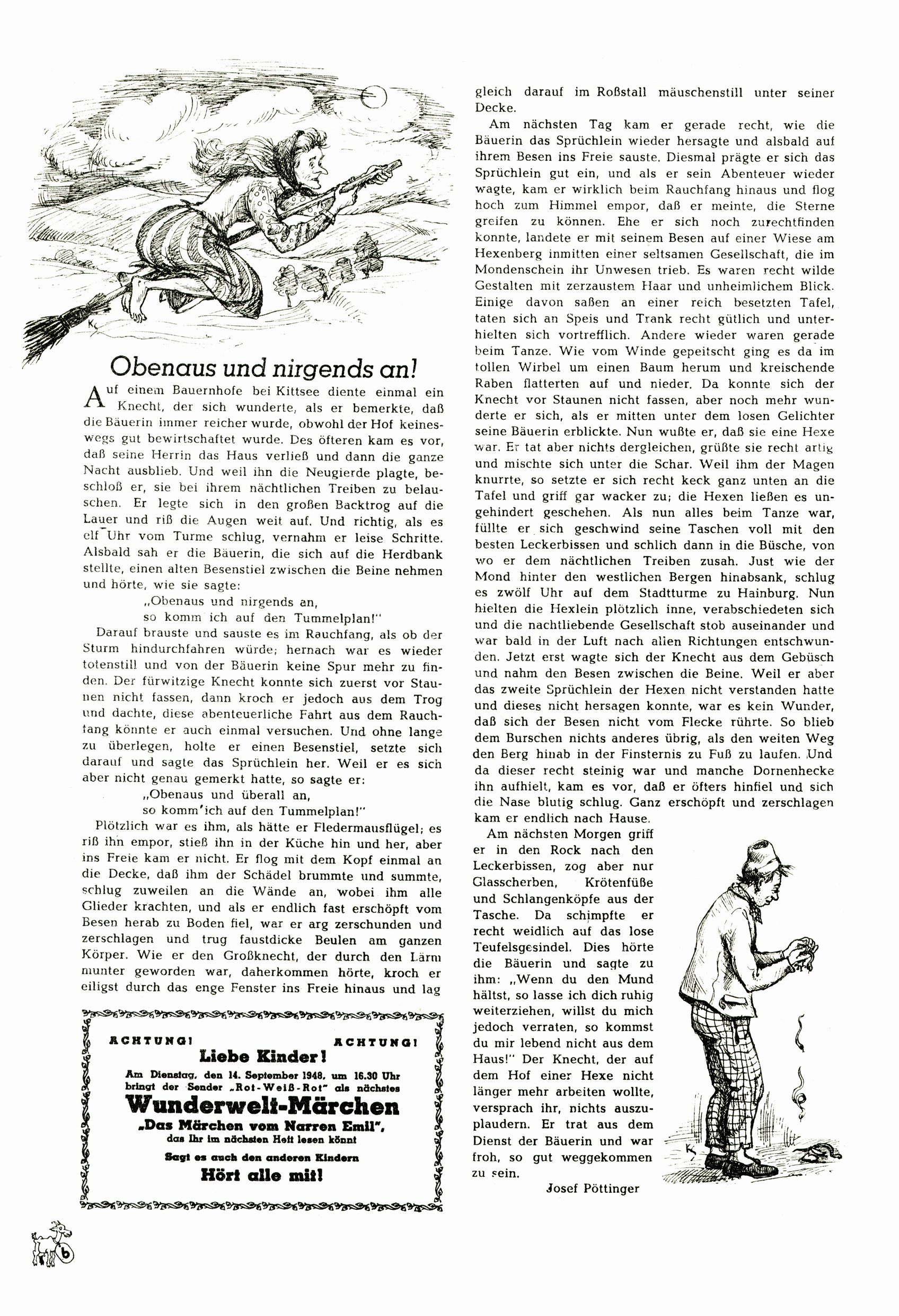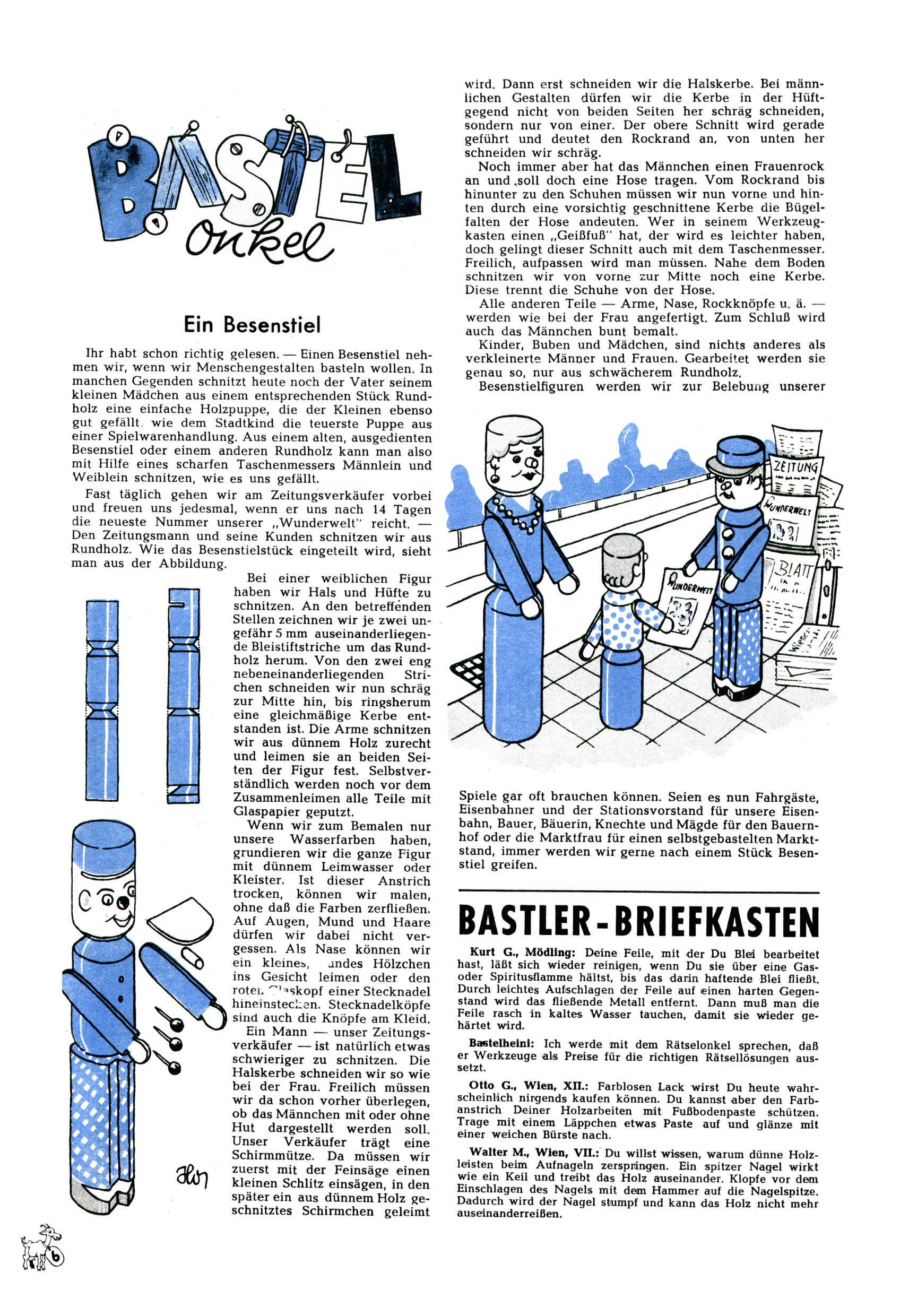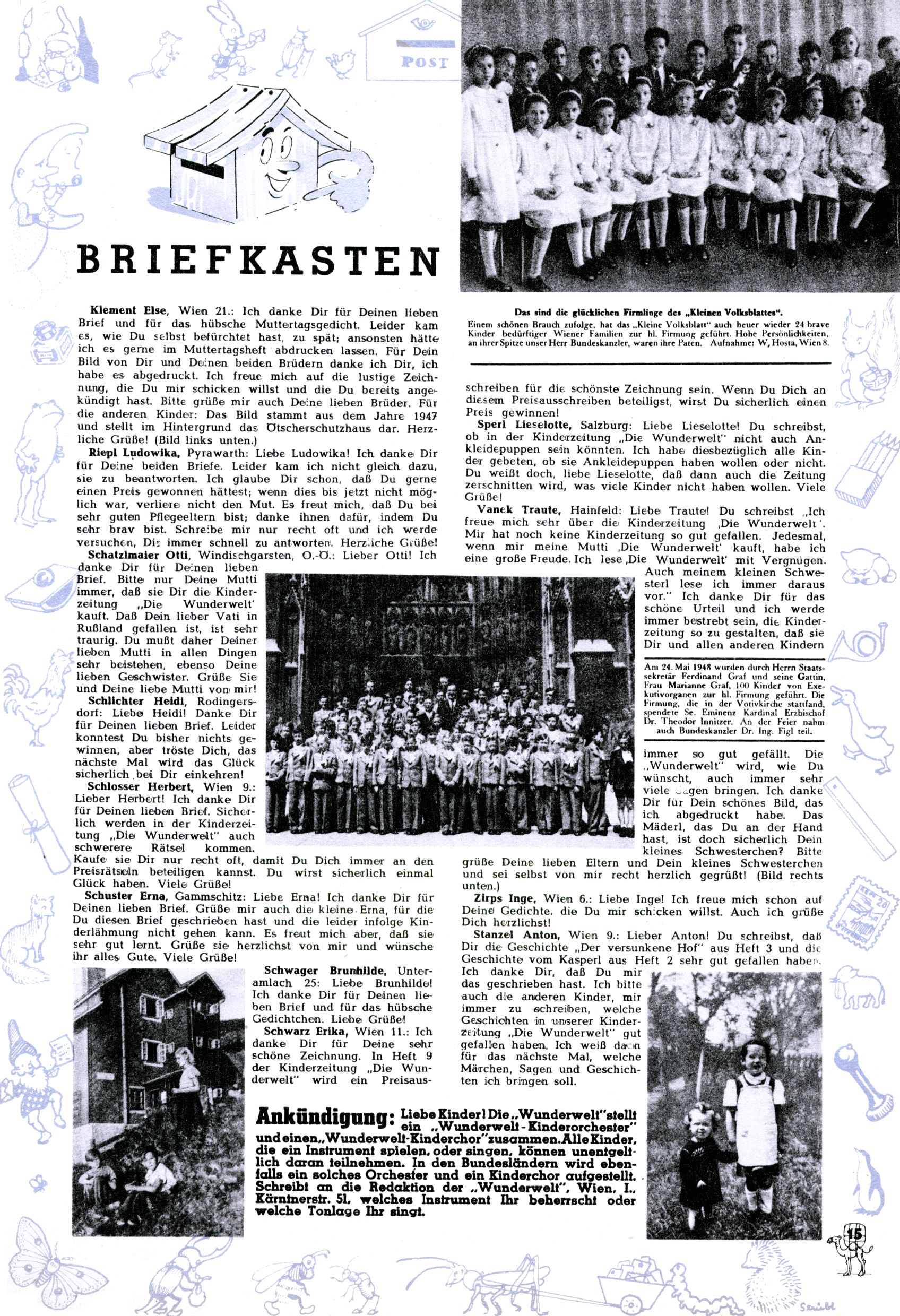 Das Gründungsjahr 1948 – Zeit der Experimente Als der Hauptschullehrer JD Josef Domany zu Ostern 1948 die Idee für eine neue Kinderzeitung umsetzte, war dies nicht nur ein großes finanzielles Risiko in einer ungewissen Zeit, sondern auch ein Schuss ins Blaue. Von den zu diesem Zeitpunkt existierenden österreichischen Kinderzeitungen Kinderpost und Unsere Zeitung suchte JD sich einen geeigneten Mix aus Geschichten, Comics und Aktivseiten heraus, definierte das Grundprinzip der Gewaltfreiheit, des Schönen und des Guten und zusammen mit Hans Weinhappel entwarf er ein Layout, das kostengünstig umgesetzt werden konnte. Ob dieses konservative Konzept Erfolg haben würde in einer Zeit, in der in einem wesentlichen Teil von Österreich die Kommunisten das Sagen hatten, war zunächst mehr als ungewiss. Dennoch wurde es eine erfolgreiche Geburt der Wunderwelt-Zeitung. Trotz häufiger kleinerer Umstellungen im ersten Jahr blieb das festgelegte Grundprinzip ab dem 2. Heft der Wunderwelt mehr als 20 Jahre lang praktisch unverändert: Die Comic-Geschichte als Aufhänger hinten, ein reizendes Titelbild als Blickfang vorne, in der Heftmitte das bunt gestaltete Mittelmächen und rundherum wurden weitere Geschichten, Informatives, Rätsel und Bastelbeiträge gruppiert. Die Abenteuer von Diogenes waren gleich im 1. Heft schon die erste Comicserie der Wunderwelt. Abgelöst wurde Diogenes durch Hokus und Willibald im 10. Heft 1948. Das war der erste wirkliche Geniestreich. Die einfallsreichen und kreativ umgesetzten Abenteuer des Zauberlehrlings Willibald waren mehr als ein Jahrzehnt lang am Höhenflug der Zeitung beteiligt. Zwerg Bumsti hatte 1948 noch nicht das Licht der Welt erblickt. Aber Wichtelmännlein auf Froschjagd im 16. Heft war die erste Vorgängergeschichte zu Bumstis Abenteuer. Weiters trugen die lieblichen Mittelmärchen und die Bastelideen von Hans Weinhappel bereits maßgeblich zum wachsenden Erfolg der Wunderwelt bei. Das einzige Standbein der Zeitung, das 1948 noch fehlte, waren die Ausschneidebögen. Ende 1948 war dann die Liste der meisten großen Namen unter den Zeichnern der Wunderwelt des ersten Jahrzehnts komplett: Peter Paul Prinz, Teja Aicher, Rosl Warzilek, Felicitas Kuhn und Lisbeth Hölzl. Bei den Pädagogen und Textern kam es abgesehen von Hans Weinhappel noch zu umfangreicheren Umstellungen. Kurt Kluger, der die ersten Technik- und Rätselbeiträge der Zeitung
