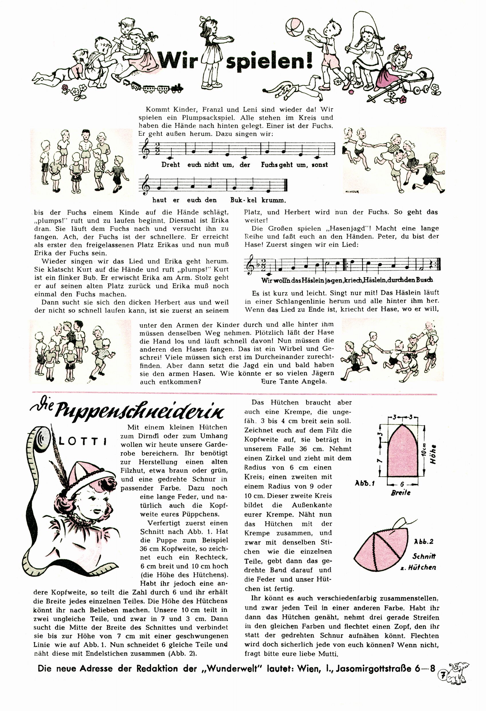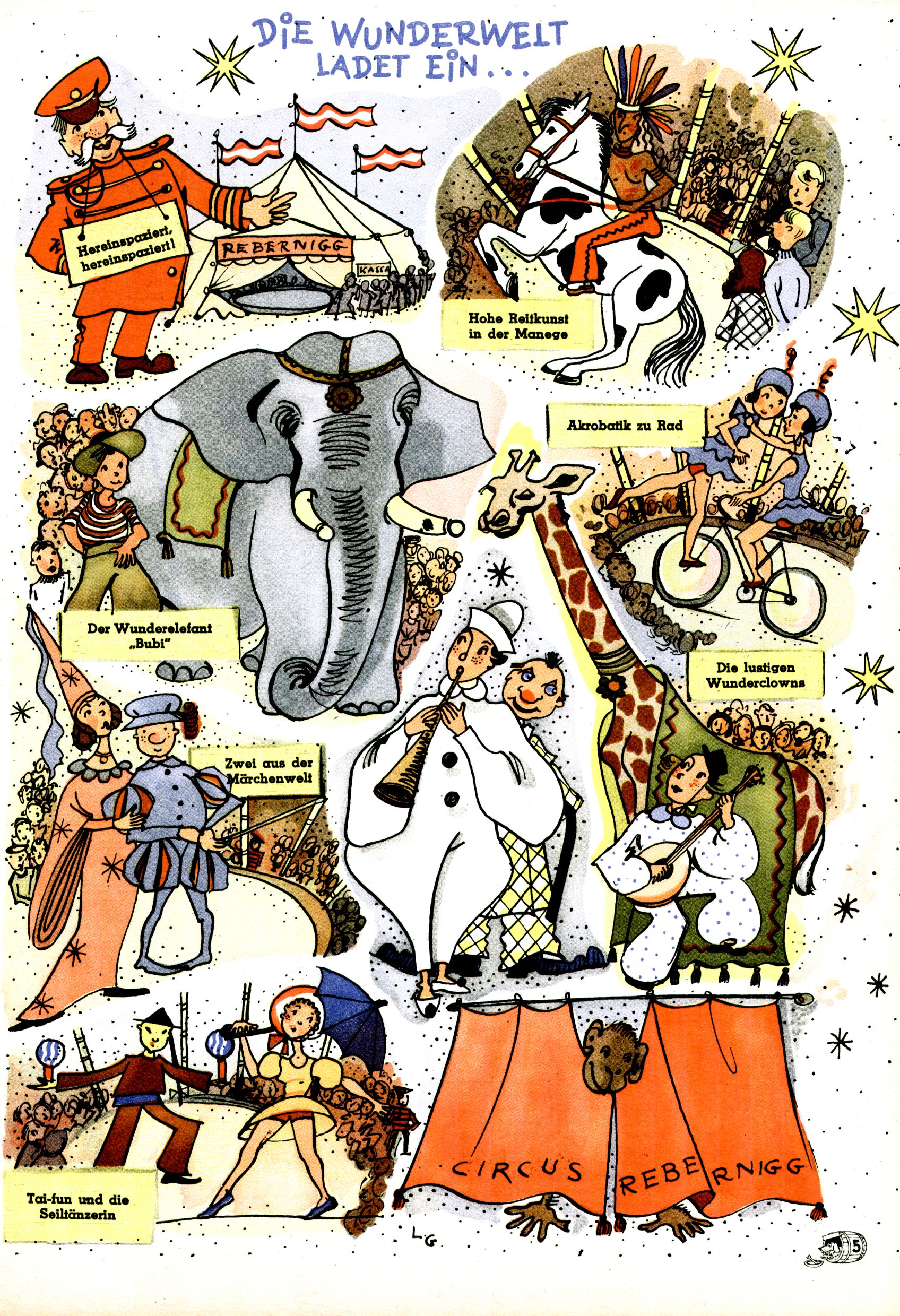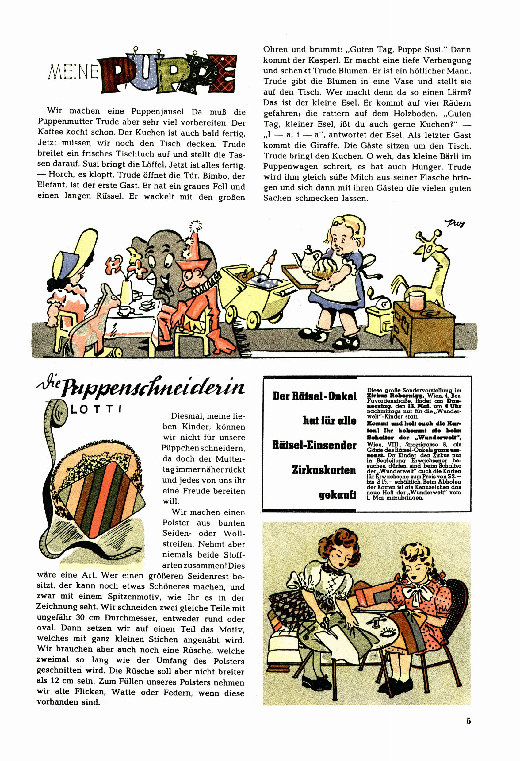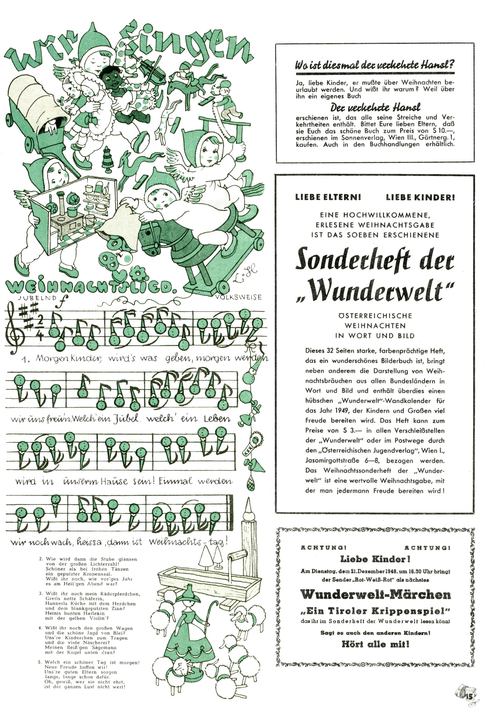 Das Gründungsjahr 1948 – Zeit der Experimente Als der Hauptschullehrer JD Josef Domany zu Ostern 1948 die Idee für eine neue Kinderzeitung umsetzte, war dies nicht nur ein großes finanzielles Risiko in einer ungewissen Zeit, sondern auch ein Schuss ins Blaue. Von den zu diesem Zeitpunkt existierenden österreichischen Kinderzeitungen Kinderpost und Unsere Zeitung suchte JD sich einen geeigneten Mix aus Geschichten, Comics und Aktivseiten heraus, definierte das Grundprinzip der Gewaltfreiheit, des Schönen und des Guten und zusammen mit Hans Weinhappel entwarf er ein Layout, das kostengünstig umgesetzt werden konnte. Ob dieses konservative Konzept Erfolg haben würde in einer Zeit, in der in einem wesentlichen Teil von Österreich die Kommunisten das Sagen hatten, war zunächst mehr als ungewiss. Dennoch wurde es eine erfolgreiche Geburt der Wunderwelt-Zeitung. Trotz häufiger kleinerer Umstellungen im ersten Jahr blieb das festgelegte Grundprinzip ab dem 2. Heft der Wunderwelt mehr als 20 Jahre lang praktisch unverändert: Die Comic-Geschichte als Aufhänger hinten, ein reizendes Titelbild als Blickfang vorne, in der Heftmitte das bunt gestaltete Mittelmächen und rundherum wurden weitere Geschichten, Informatives, Rätsel und Bastelbeiträge gruppiert. Die Abenteuer von Diogenes waren gleich im 1. Heft schon die erste Comicserie der Wunderwelt. Abgelöst wurde Diogenes durch Hokus und Willibald im 10. Heft 1948. Das war der erste wirkliche Geniestreich. Die einfallsreichen und kreativ umgesetzten Abenteuer des Zauberlehrlings Willibald waren mehr als ein Jahrzehnt lang am Höhenflug der Zeitung beteiligt. Zwerg Bumsti hatte 1948 noch nicht das Licht der Welt erblickt. Aber Wichtelmännlein auf Froschjagd im 16. Heft war die erste Vorgängergeschichte zu Bumstis Abenteuer. Weiters trugen die lieblichen Mittelmärchen und die Bastelideen von Hans Weinhappel bereits maßgeblich zum wachsenden Erfolg der Wunderwelt bei. Das einzige Standbein der Zeitung, das 1948 noch fehlte, waren die Ausschneidebögen. Ende 1948 war dann die Liste der meisten großen Namen unter den Zeichnern der Wunderwelt des ersten Jahrzehnts komplett: Peter Paul Prinz, Teja Aicher, Rosl Warzilek, Felicitas Kuhn und Lisbeth Hölzl. Bei den Pädagogen und Textern kam es abgesehen von Hans Weinhappel noch zu umfangreicheren Umstellungen. Kurt Kluger, der die ersten Technik- und Rätselbeiträge der Zeitung