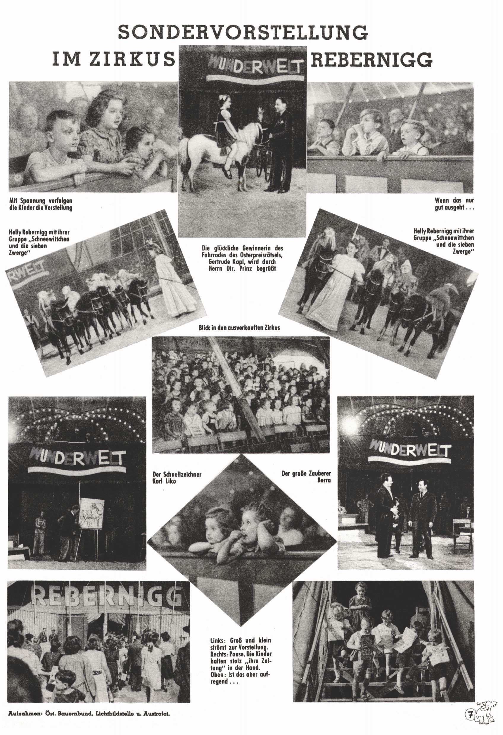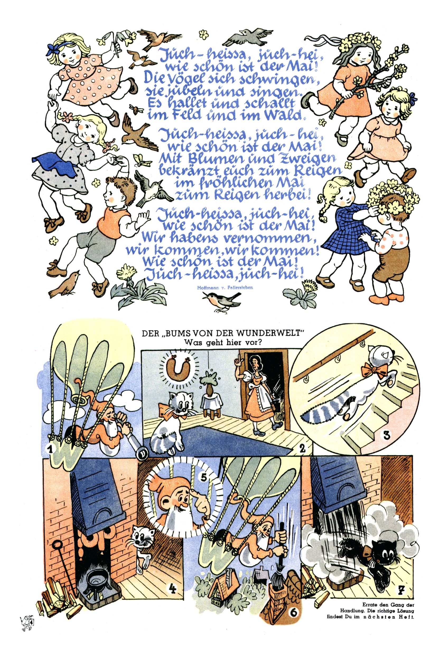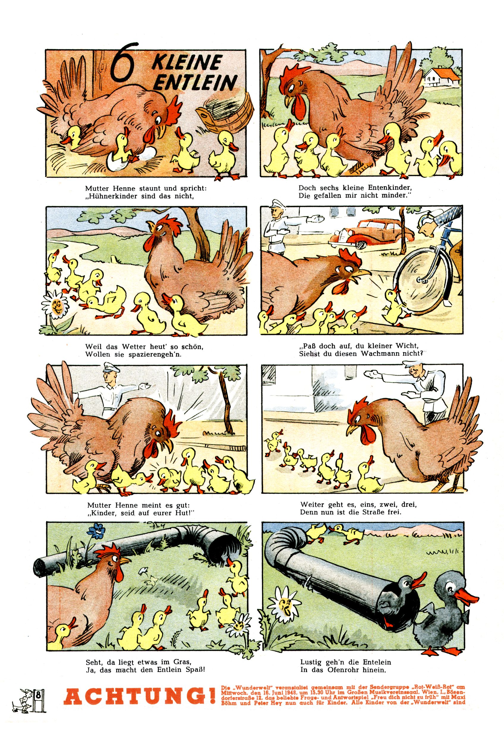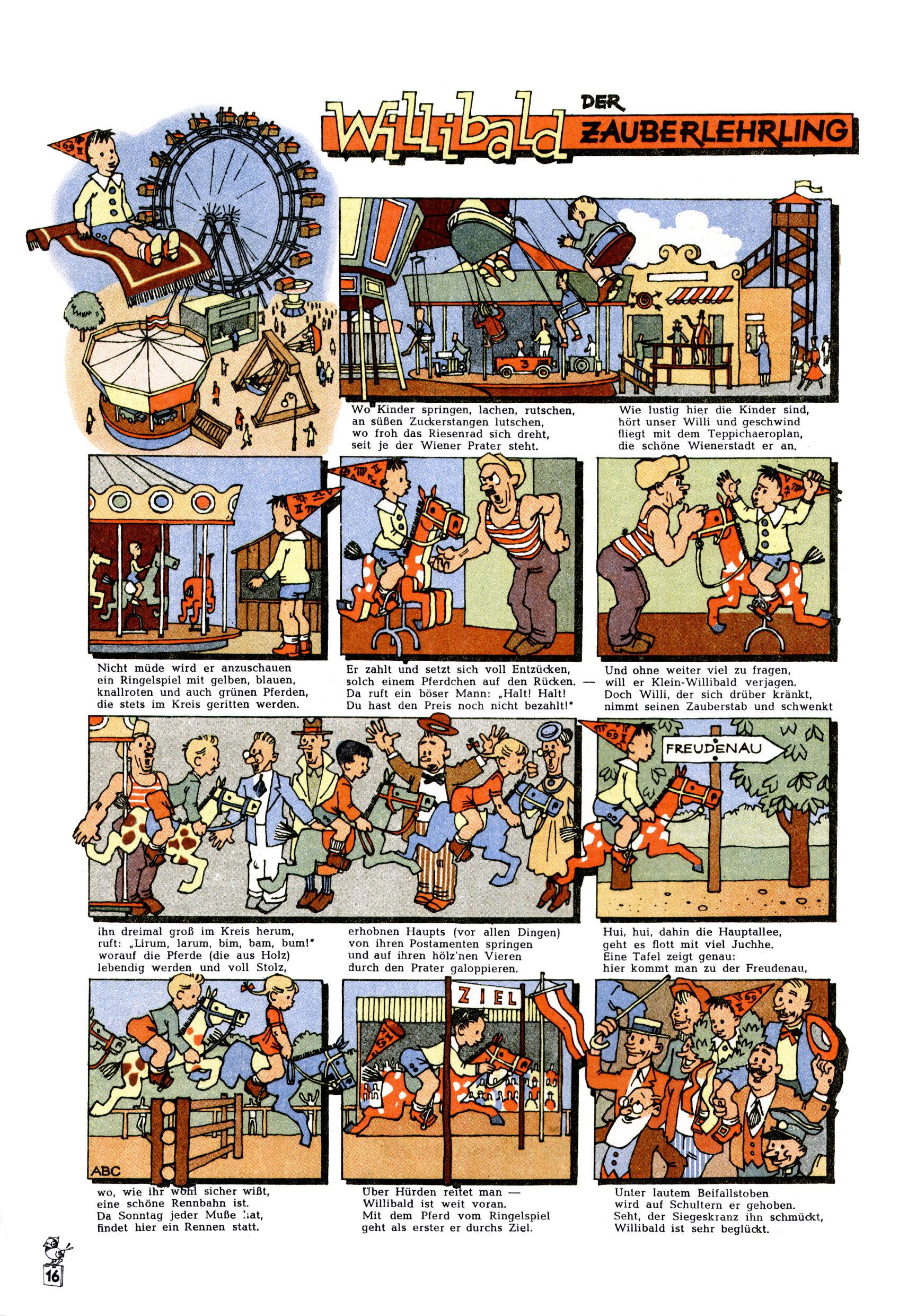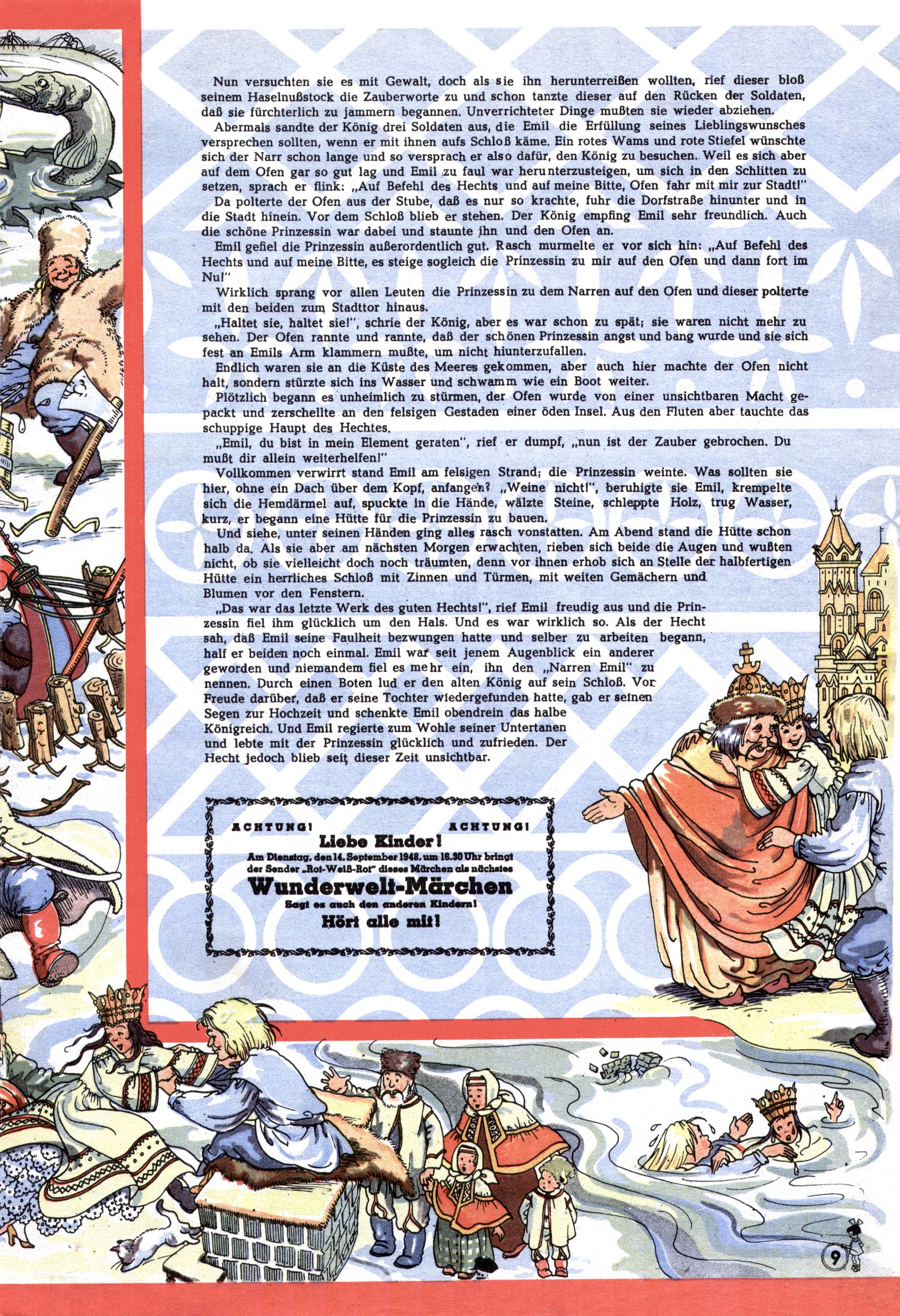 Das Gründungsjahr 1948 – Zeit der Experimente Als der Hauptschullehrer JD Josef Domany zu Ostern 1948 die Idee für eine neue Kinderzeitung umsetzte, war dies nicht nur ein großes finanzielles Risiko in einer ungewissen Zeit, sondern auch ein Schuss ins Blaue. Von den zu diesem Zeitpunkt existierenden österreichischen Kinderzeitungen Kinderpost und Unsere Zeitung suchte JD sich einen geeigneten Mix aus Geschichten, Comics und Aktivseiten heraus, definierte das Grundprinzip der Gewaltfreiheit, des Schönen und des Guten und zusammen mit Hans Weinhappel entwarf er ein Layout, das kostengünstig umgesetzt werden konnte. Ob dieses konservative Konzept Erfolg haben würde in einer Zeit, in der in einem wesentlichen Teil von Österreich die Kommunisten das Sagen hatten, war zunächst mehr als ungewiss. Dennoch wurde es eine erfolgreiche Geburt der Wunderwelt-Zeitung. Trotz häufiger kleinerer Umstellungen im ersten Jahr blieb das festgelegte Grundprinzip ab dem 2. Heft der Wunderwelt mehr als 20 Jahre lang praktisch unverändert: Die Comic-Geschichte als Aufhänger hinten, ein reizendes Titelbild als Blickfang vorne, in der Heftmitte das bunt gestaltete Mittelmächen und rundherum wurden weitere Geschichten, Informatives, Rätsel und Bastelbeiträge gruppiert. Die Abenteuer von Diogenes waren gleich im 1. Heft schon die erste Comicserie der Wunderwelt. Abgelöst wurde Diogenes durch Hokus und Willibald im 10. Heft 1948. Das war der erste wirkliche Geniestreich. Die einfallsreichen und kreativ umgesetzten Abenteuer des Zauberlehrlings Willibald waren mehr als ein Jahrzehnt lang am Höhenflug der Zeitung beteiligt. Zwerg Bumsti hatte 1948 noch nicht das Licht der Welt erblickt. Aber Wichtelmännlein auf Froschjagd im 16. Heft war die erste Vorgängergeschichte zu Bumstis Abenteuer. Weiters trugen die lieblichen Mittelmärchen und die Bastelideen von Hans Weinhappel bereits maßgeblich zum wachsenden Erfolg der Wunderwelt bei. Das einzige Standbein der Zeitung, das 1948 noch fehlte, waren die Ausschneidebögen. Ende 1948 war dann die Liste der meisten großen Namen unter den Zeichnern der Wunderwelt des ersten Jahrzehnts komplett: Peter Paul Prinz, Teja Aicher, Rosl Warzilek, Felicitas Kuhn und Lisbeth Hölzl. Bei den Pädagogen und Textern kam es abgesehen von Hans Weinhappel noch zu umfangreicheren Umstellungen. Kurt Kluger, der die ersten Technik- und Rätselbeiträge der Zeitung