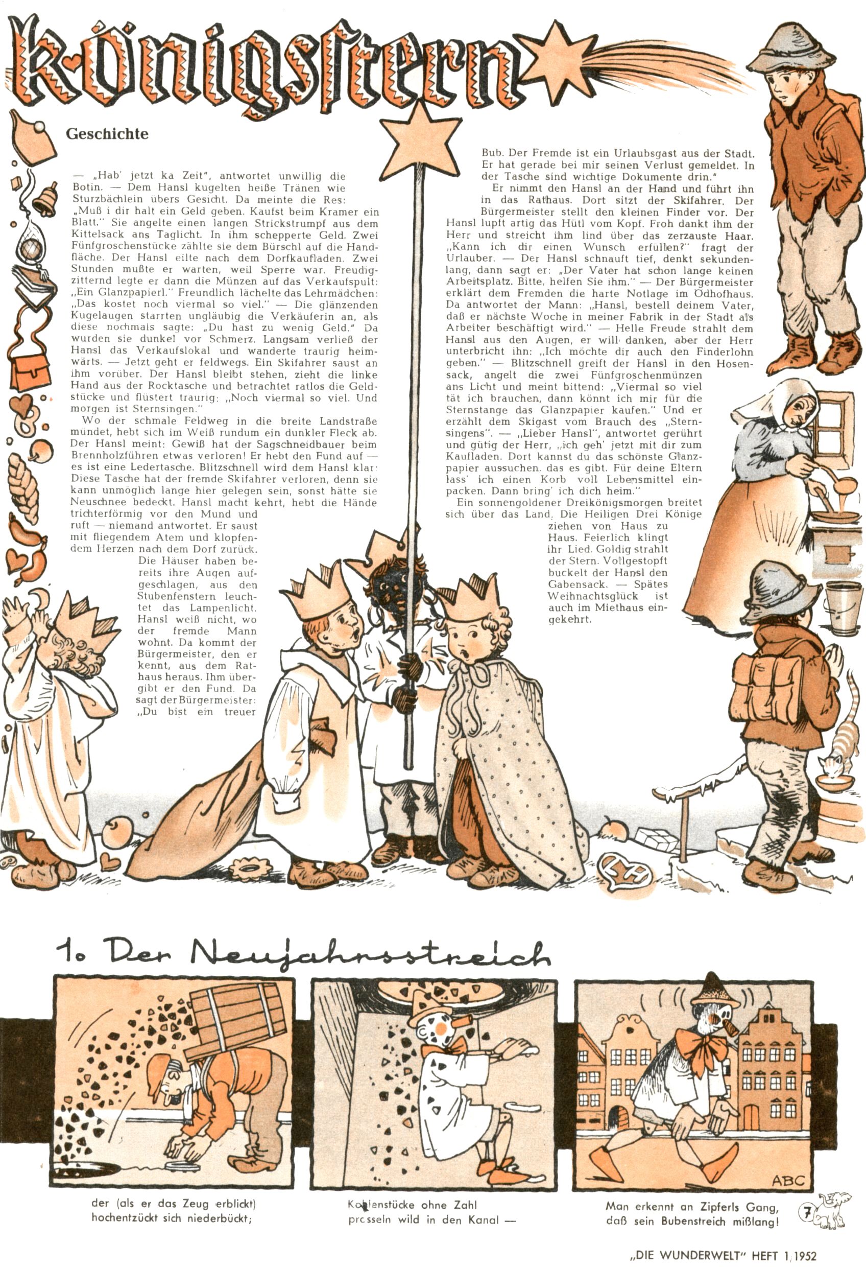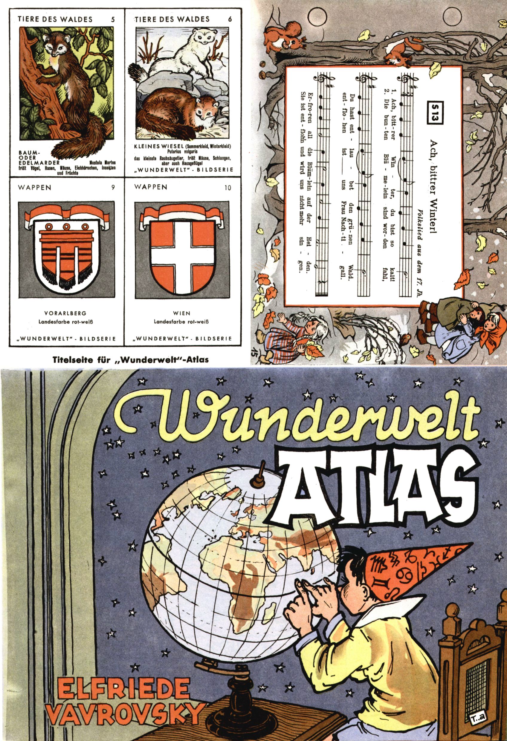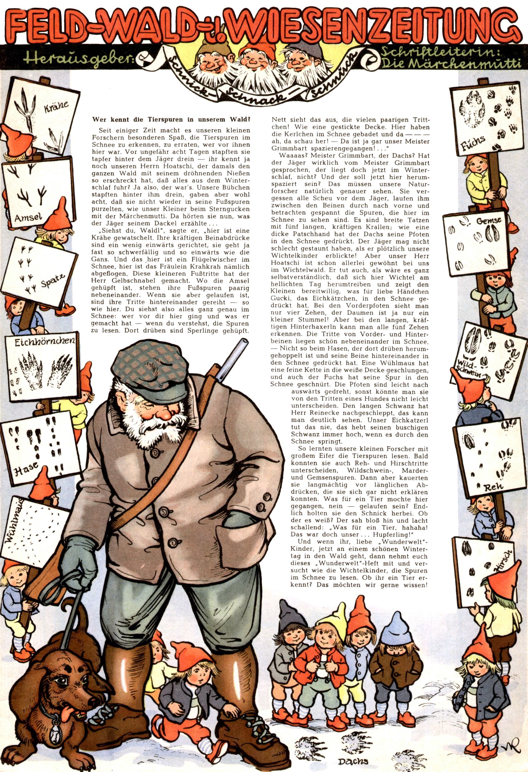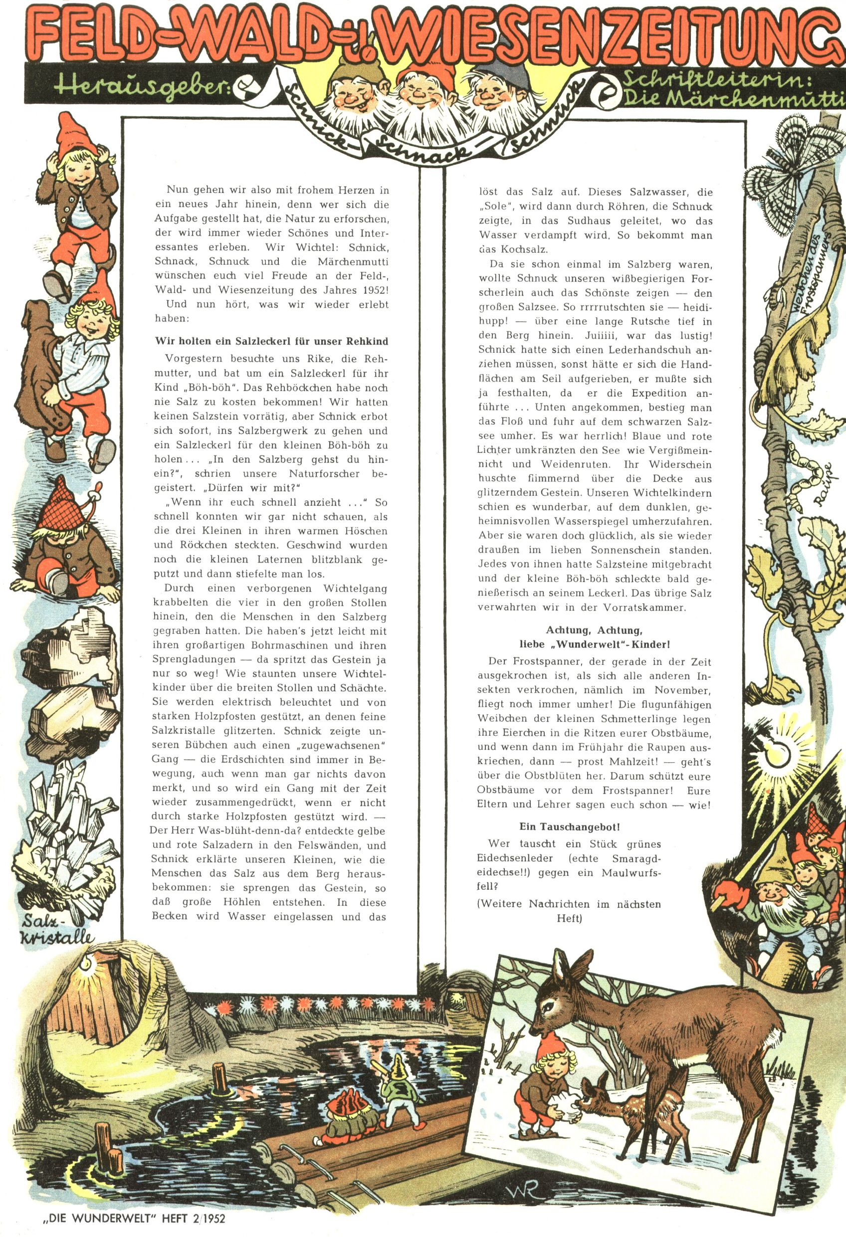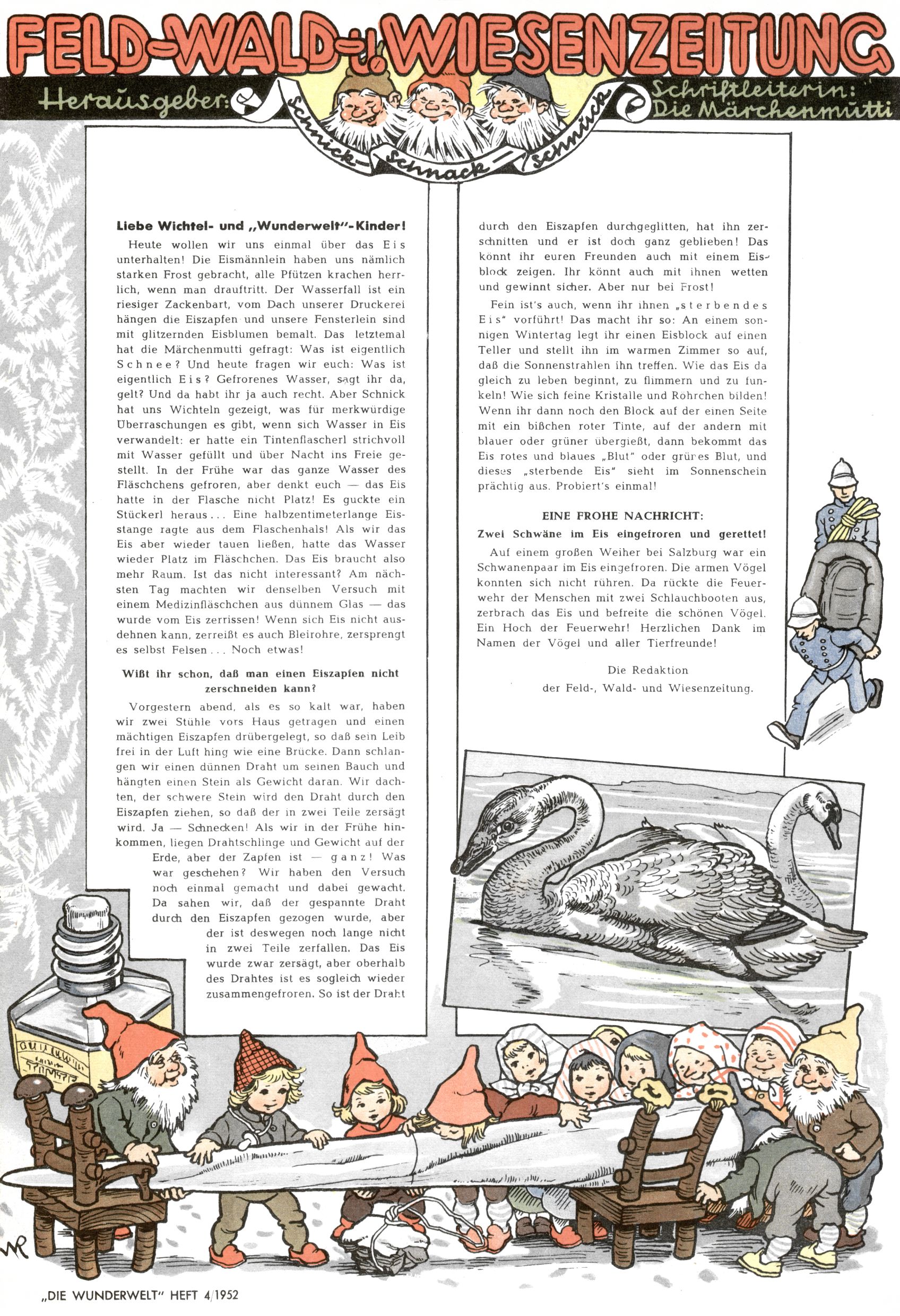1952 – Der Erfolg hält an Wem Erfolg zuteil wird, der hat wenig Anlass, sein Konzept zu ändern. Und das war in gewisser Weise auch gut so bei allen inhaltlichen Schwächen der Beiträge in der Wunderwelt 1952. Der Erfolg der Zeitung wurde in erster Linie von der grafischen Umsetzung getragen; die lieblichen Bilder einer heilen Märchenwelt ließen über die oft flauen, pädagogisch teilweise sogar fragwürdigen Texte hinwegsehen. Elfriede Vavrovsky schrieb fast alle Texte und Rosl Warzilek zeichnete immer mehr Titelbilder und Mittelmärchen. ABC Peter Paul Prinz hatte Ende 1951 Meister Hokus als komischen Widerpart vom Zauberlehrling Willibald entdeckt und perfektionierte diesen Dualismus nun immer mehr. Meister Hokus avancierte zur regelmäßigen Lachnummer. Dafür überließ ABC vorübergehend Teja Aicher die Gestaltung der technischen Seite, dessen Zwerg Bumsti ebenfalls bereits untrennbar mit der Wunderwelt verbunden schien und längst zum Markenzeichen aufgestiegen war. Seine ko(s)mischen Superhelden Piff und Paff hatten jedoch allmählich genug von den Menschen und kehrten der Erde den Rücken zu. Für den Einsatz im Schulunterricht wurden weiterhin von Elfriede Vavrovsky erstellte politische und geografische Daten und Karten gedruckt, was gerne angenommen wurde, denn teure Atlanten gab es 1952 noch wenige, als viele politische Grenzen gar nicht endgültig geklärt schienen. |