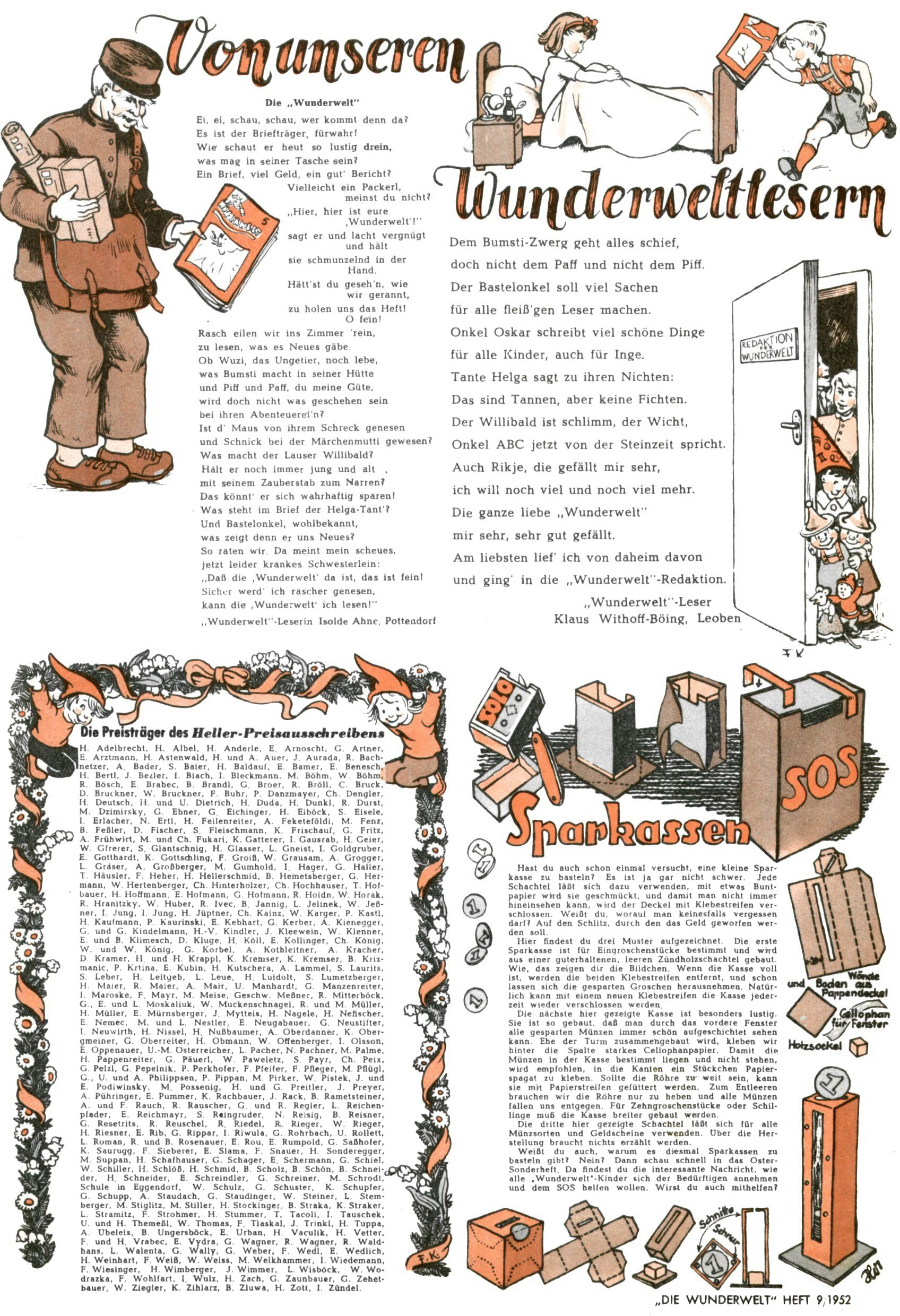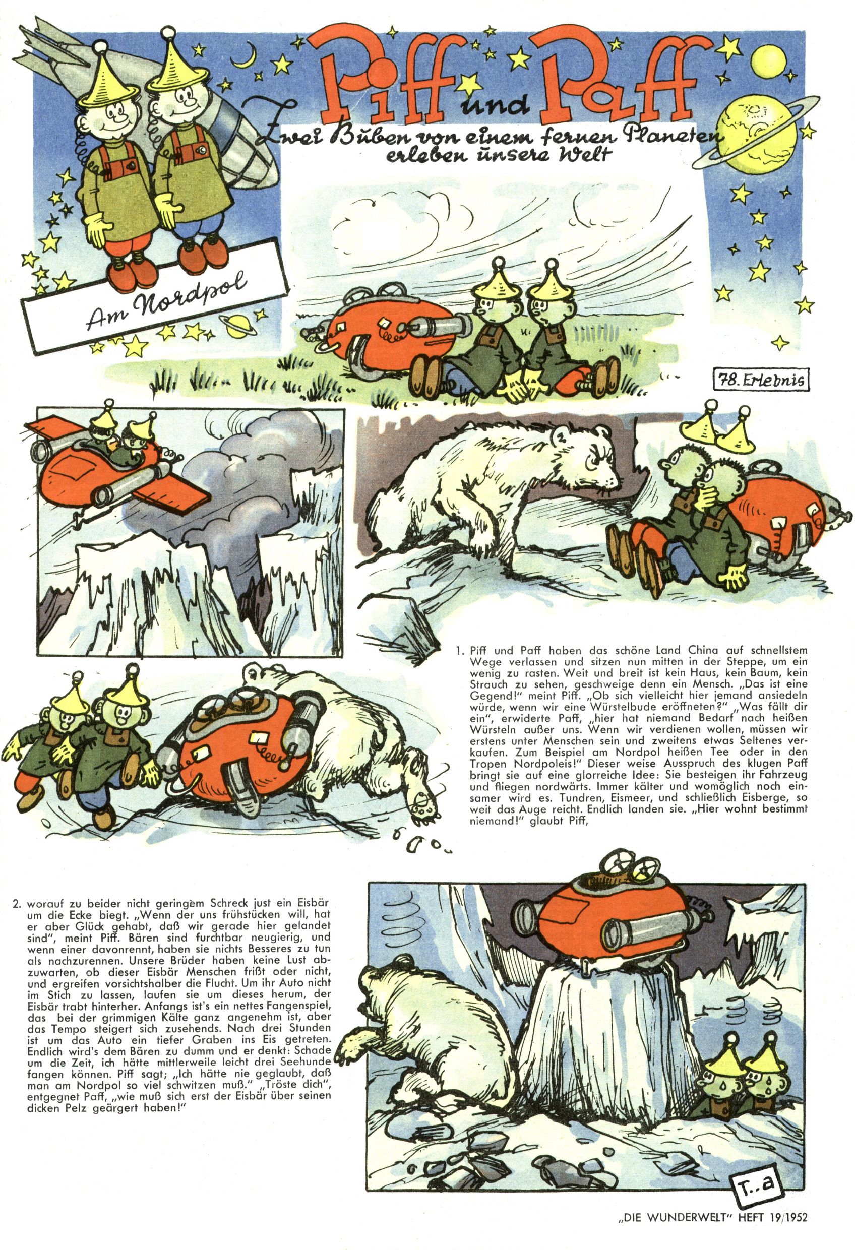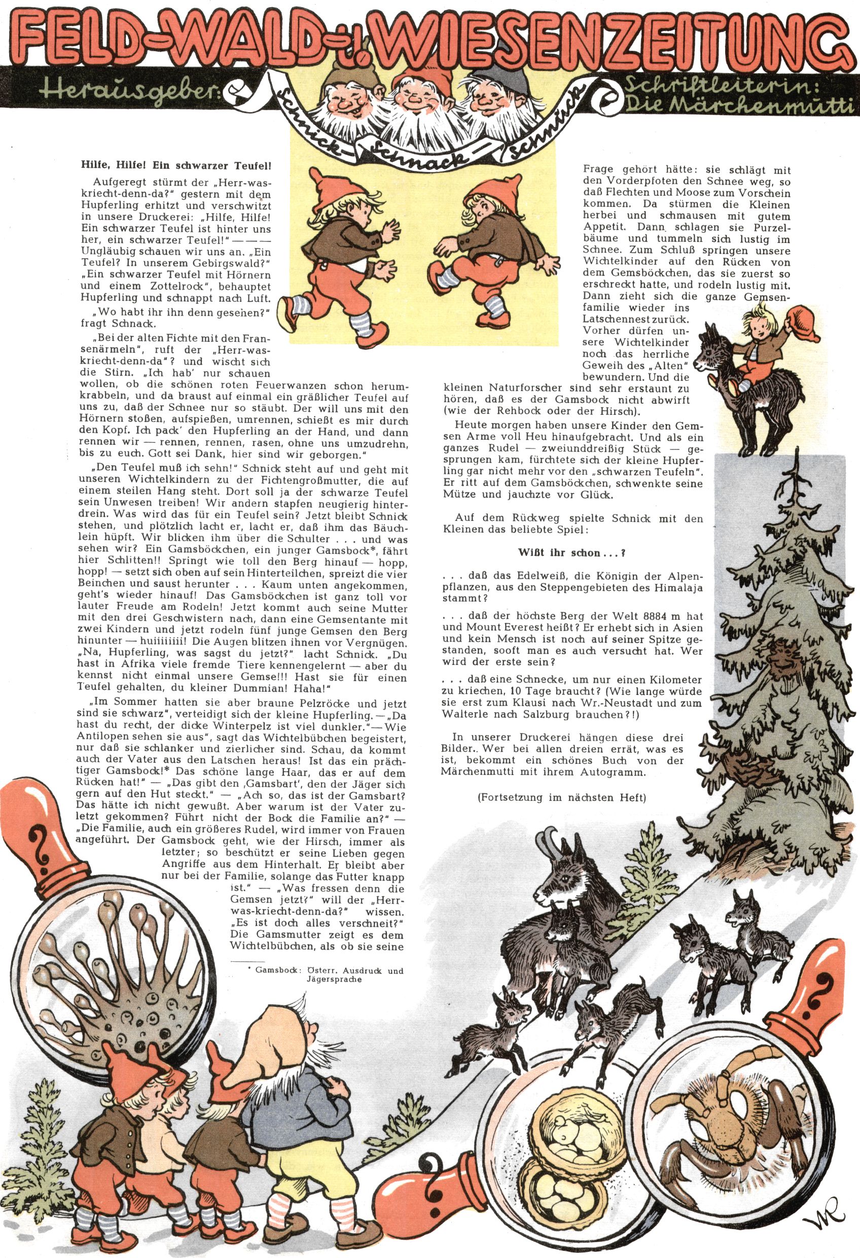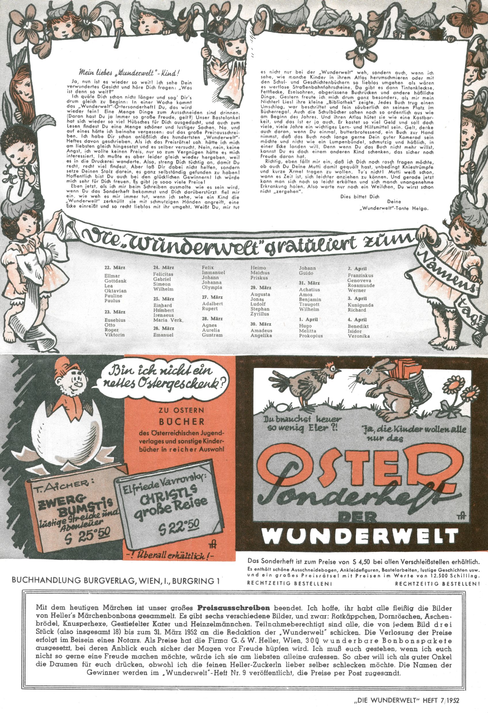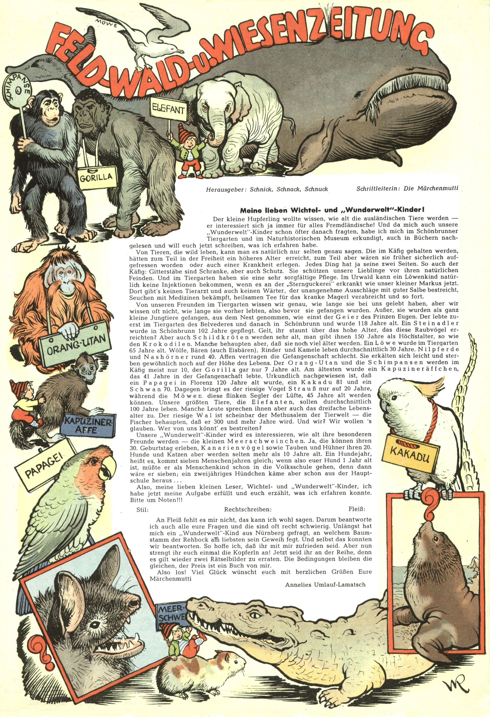 1952 – Der Erfolg hält an Wem Erfolg zuteil wird, der hat wenig Anlass, sein Konzept zu ändern. Und das war in gewisser Weise auch gut so bei allen inhaltlichen Schwächen der Beiträge in der Wunderwelt 1952. Der Erfolg der Zeitung wurde in erster Linie von der grafischen Umsetzung getragen; die lieblichen Bilder einer heilen Märchenwelt ließen über die oft flauen, pädagogisch teilweise sogar fragwürdigen Texte hinwegsehen. Elfriede Vavrovsky schrieb fast alle Texte und Rosl Warzilek zeichnete immer mehr Titelbilder und Mittelmärchen. ABC Peter Paul Prinz hatte Ende 1951 Meister Hokus als komischen Widerpart vom Zauberlehrling Willibald entdeckt und perfektionierte diesen Dualismus nun immer mehr. Meister Hokus avancierte zur regelmäßigen Lachnummer. Dafür überließ ABC vorübergehend Teja Aicher die Gestaltung der technischen Seite, dessen Zwerg Bumsti ebenfalls bereits untrennbar mit der Wunderwelt verbunden schien und längst zum Markenzeichen aufgestiegen war. Seine ko(s)mischen Superhelden Piff und Paff hatten jedoch allmählich genug von den Menschen und kehrten der Erde den Rücken zu. Für den Einsatz im Schulunterricht wurden weiterhin von Elfriede Vavrovsky erstellte politische und geografische Daten und Karten gedruckt, was gerne angenommen wurde, denn teure Atlanten gab es 1952 noch wenige, als viele politische Grenzen gar nicht endgültig geklärt schienen. |