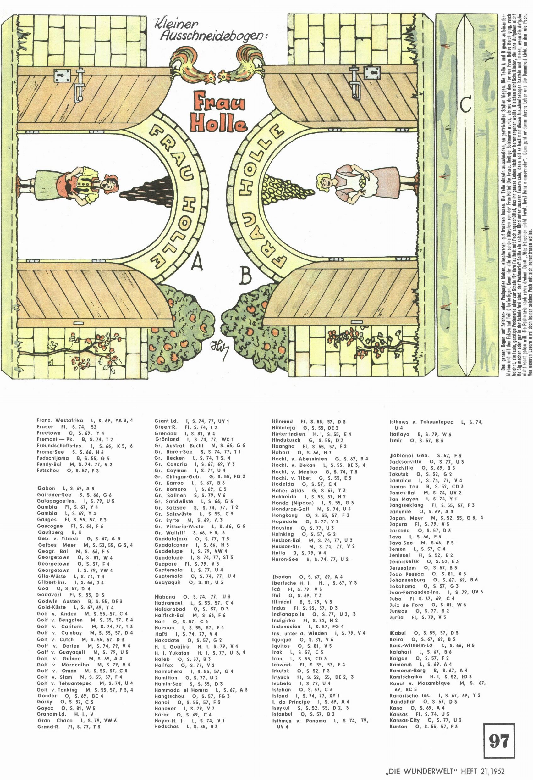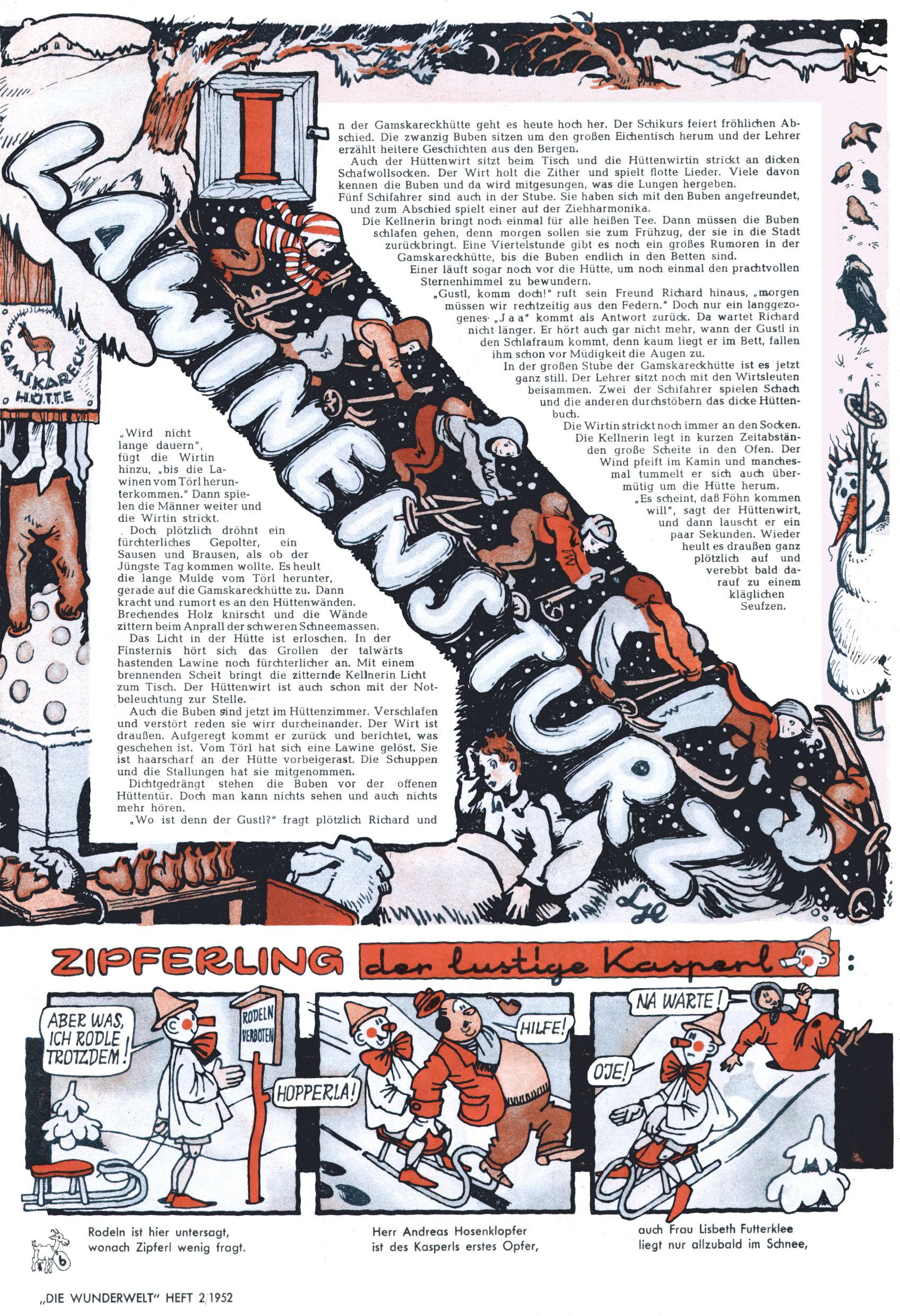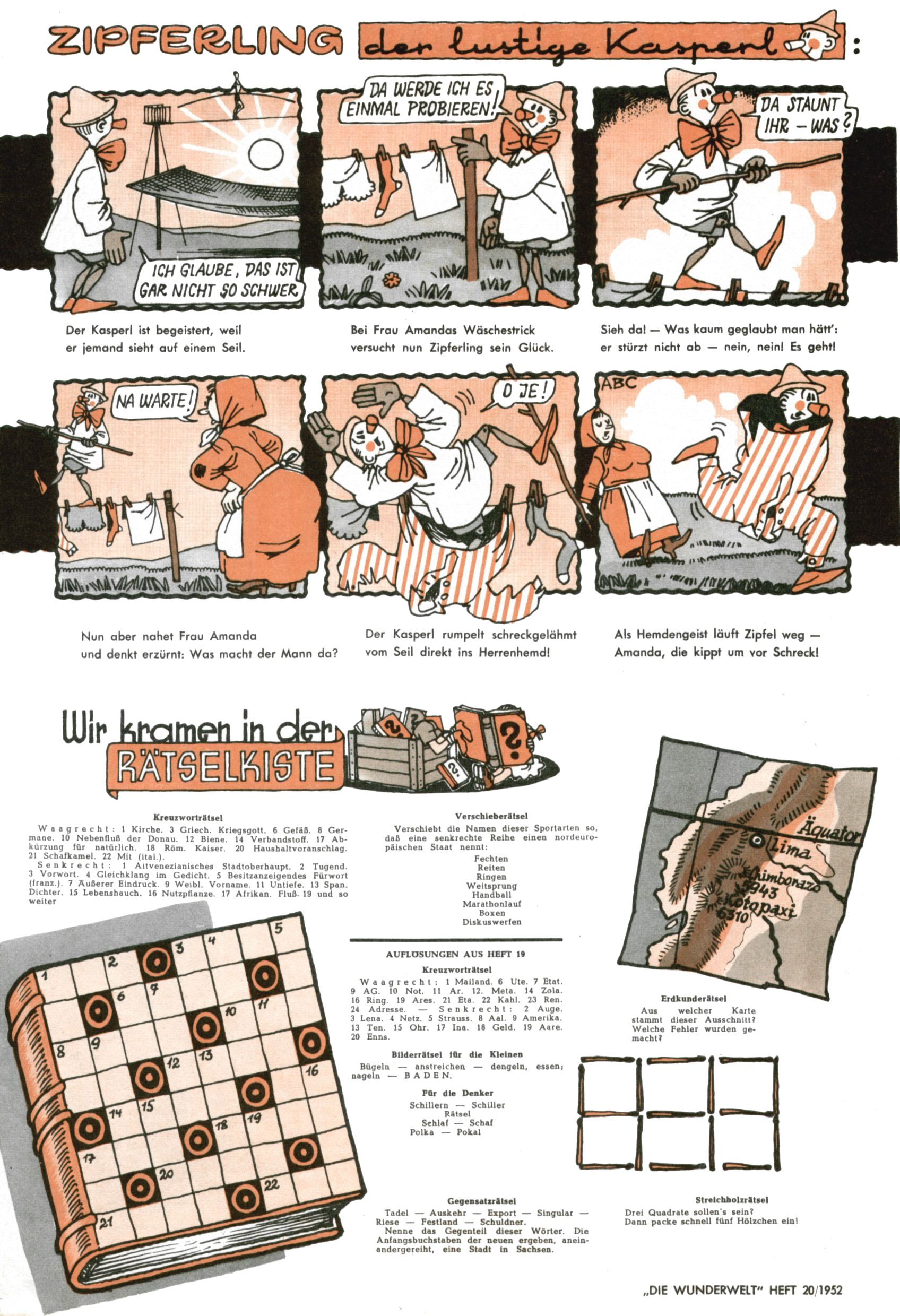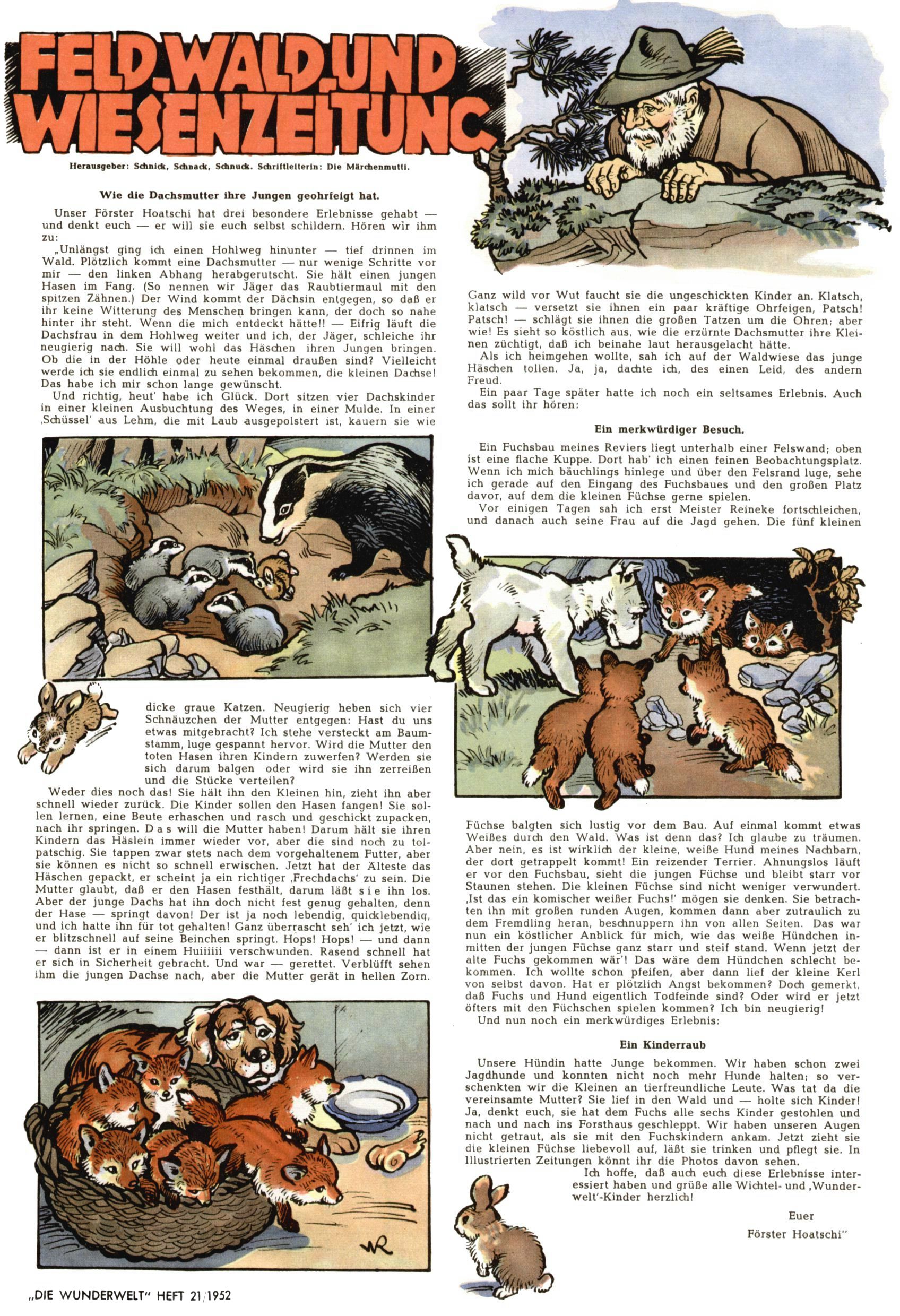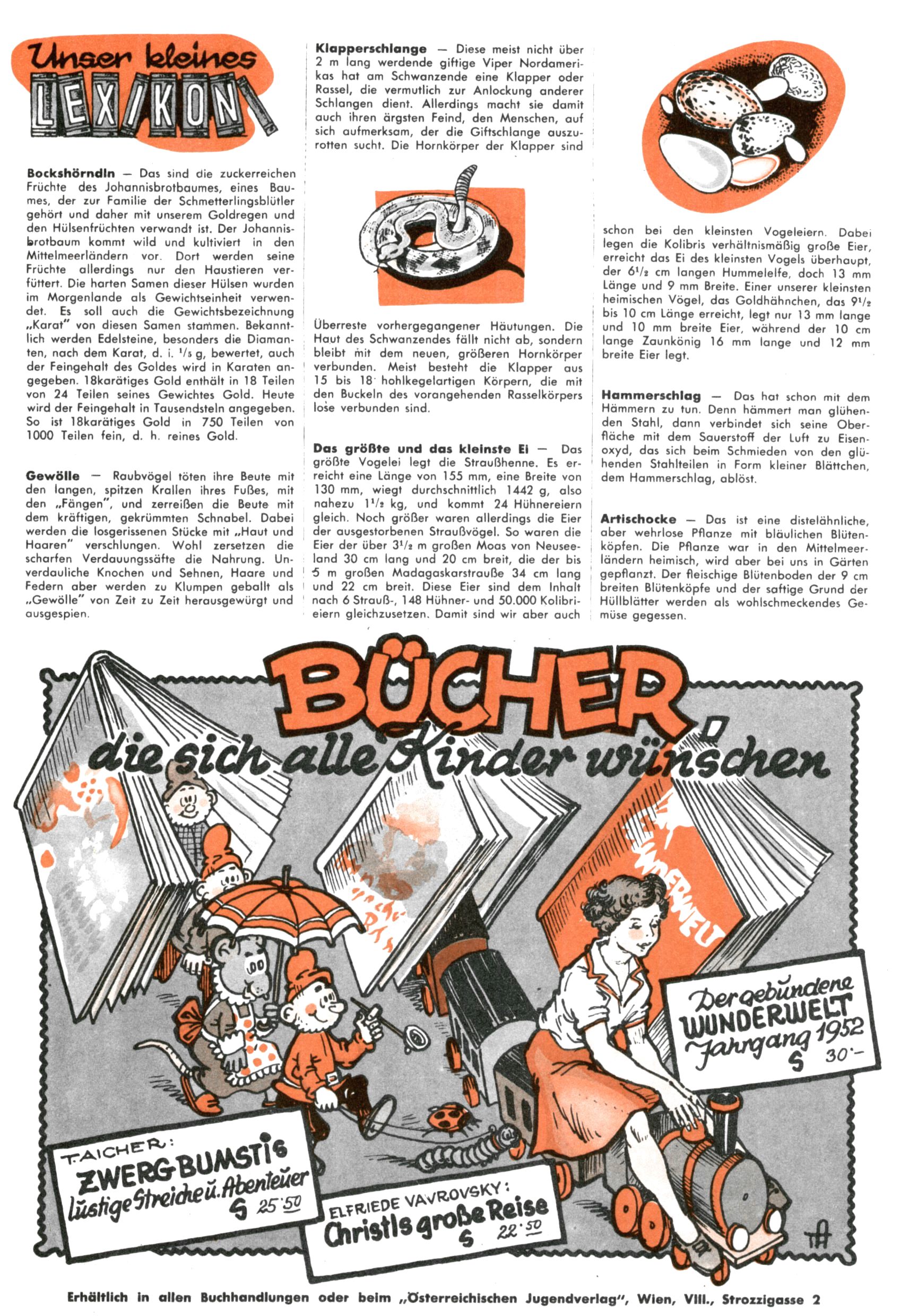 1952 – Der Erfolg hält an Wem Erfolg zuteil wird, der hat wenig Anlass, sein Konzept zu ändern. Und das war in gewisser Weise auch gut so bei allen inhaltlichen Schwächen der Beiträge in der Wunderwelt 1952. Der Erfolg der Zeitung wurde in erster Linie von der grafischen Umsetzung getragen; die lieblichen Bilder einer heilen Märchenwelt ließen über die oft flauen, pädagogisch teilweise sogar fragwürdigen Texte hinwegsehen. Elfriede Vavrovsky schrieb fast alle Texte und Rosl Warzilek zeichnete immer mehr Titelbilder und Mittelmärchen. ABC Peter Paul Prinz hatte Ende 1951 Meister Hokus als komischen Widerpart vom Zauberlehrling Willibald entdeckt und perfektionierte diesen Dualismus nun immer mehr. Meister Hokus avancierte zur regelmäßigen Lachnummer. Dafür überließ ABC vorübergehend Teja Aicher die Gestaltung der technischen Seite, dessen Zwerg Bumsti ebenfalls bereits untrennbar mit der Wunderwelt verbunden schien und längst zum Markenzeichen aufgestiegen war. Seine ko(s)mischen Superhelden Piff und Paff hatten jedoch allmählich genug von den Menschen und kehrten der Erde den Rücken zu. Für den Einsatz im Schulunterricht wurden weiterhin von Elfriede Vavrovsky erstellte politische und geografische Daten und Karten gedruckt, was gerne angenommen wurde, denn teure Atlanten gab es 1952 noch wenige, als viele politische Grenzen gar nicht endgültig geklärt schienen. |