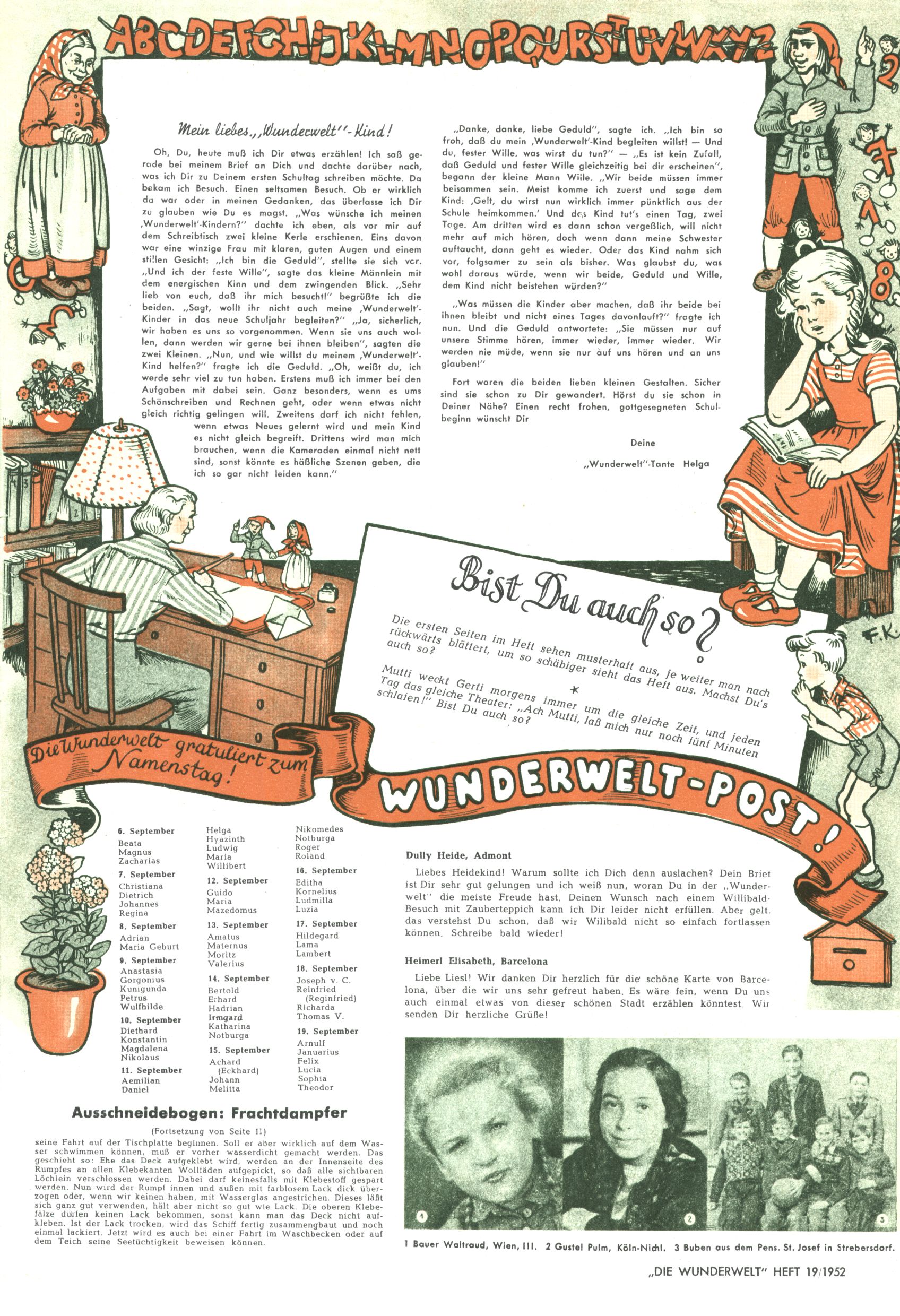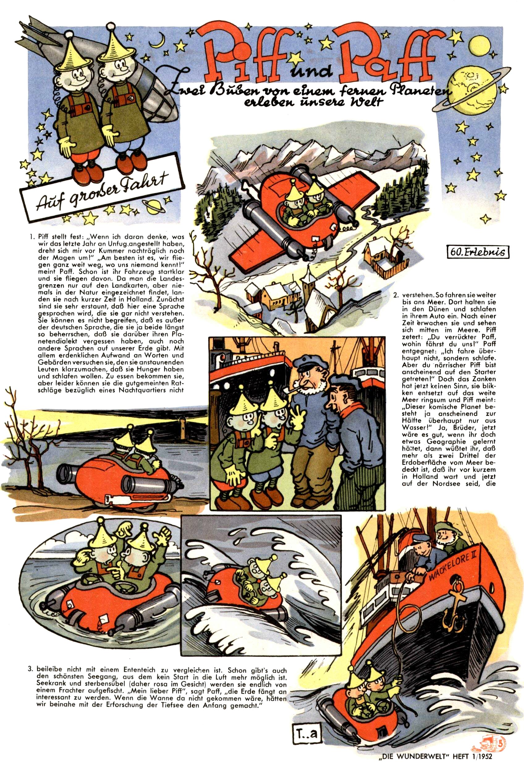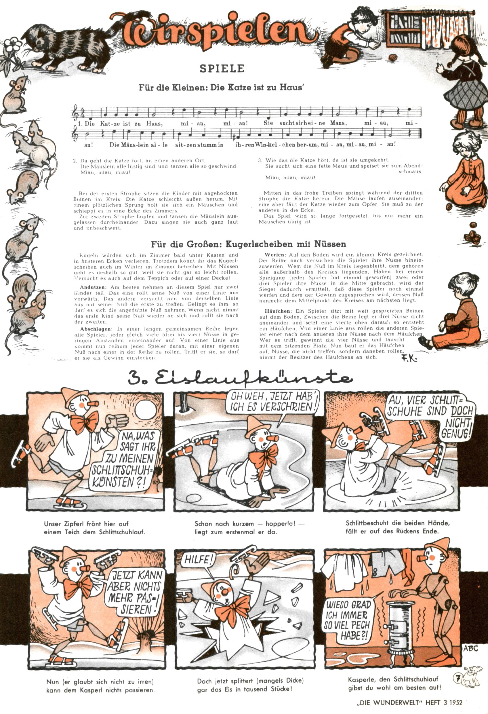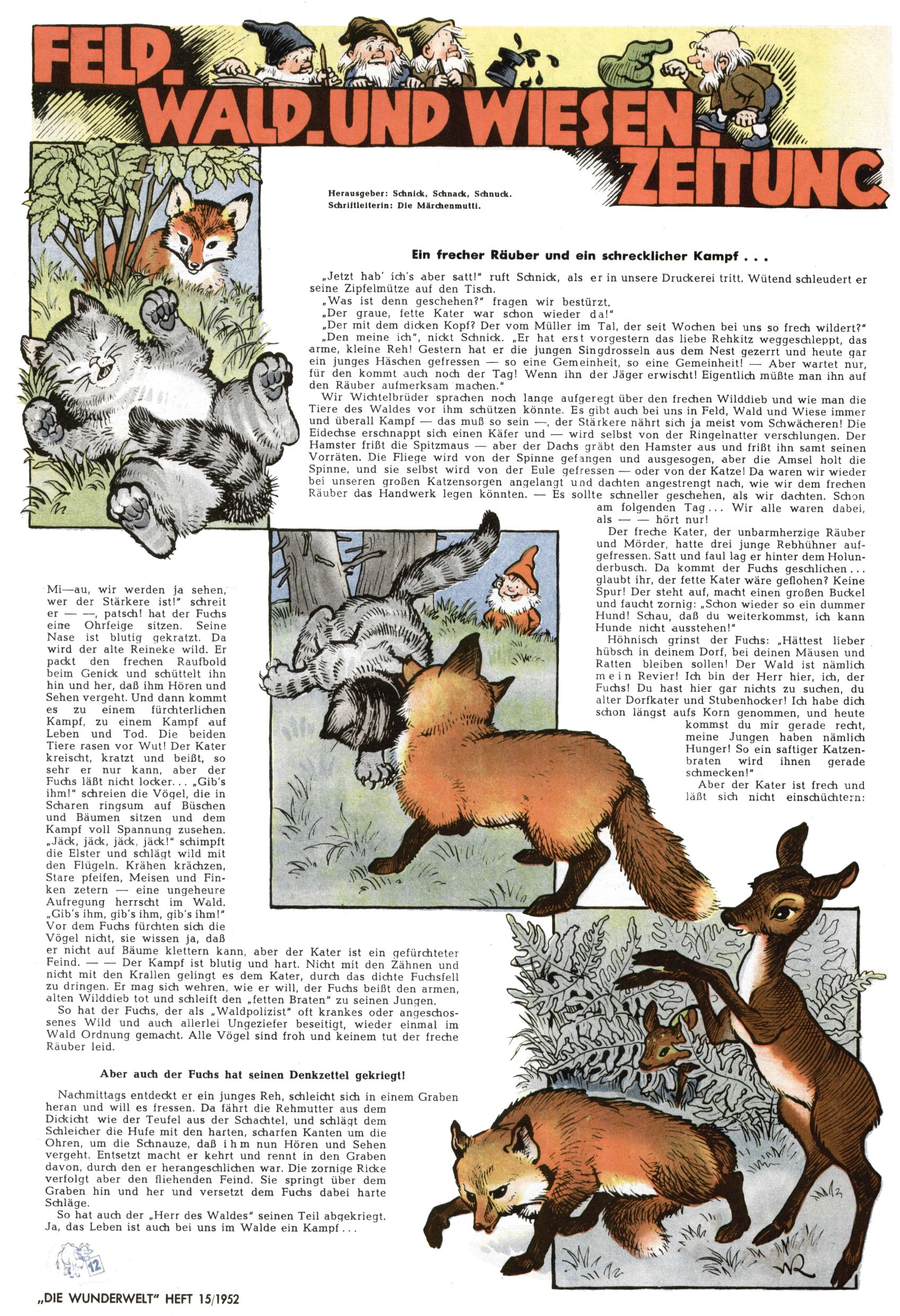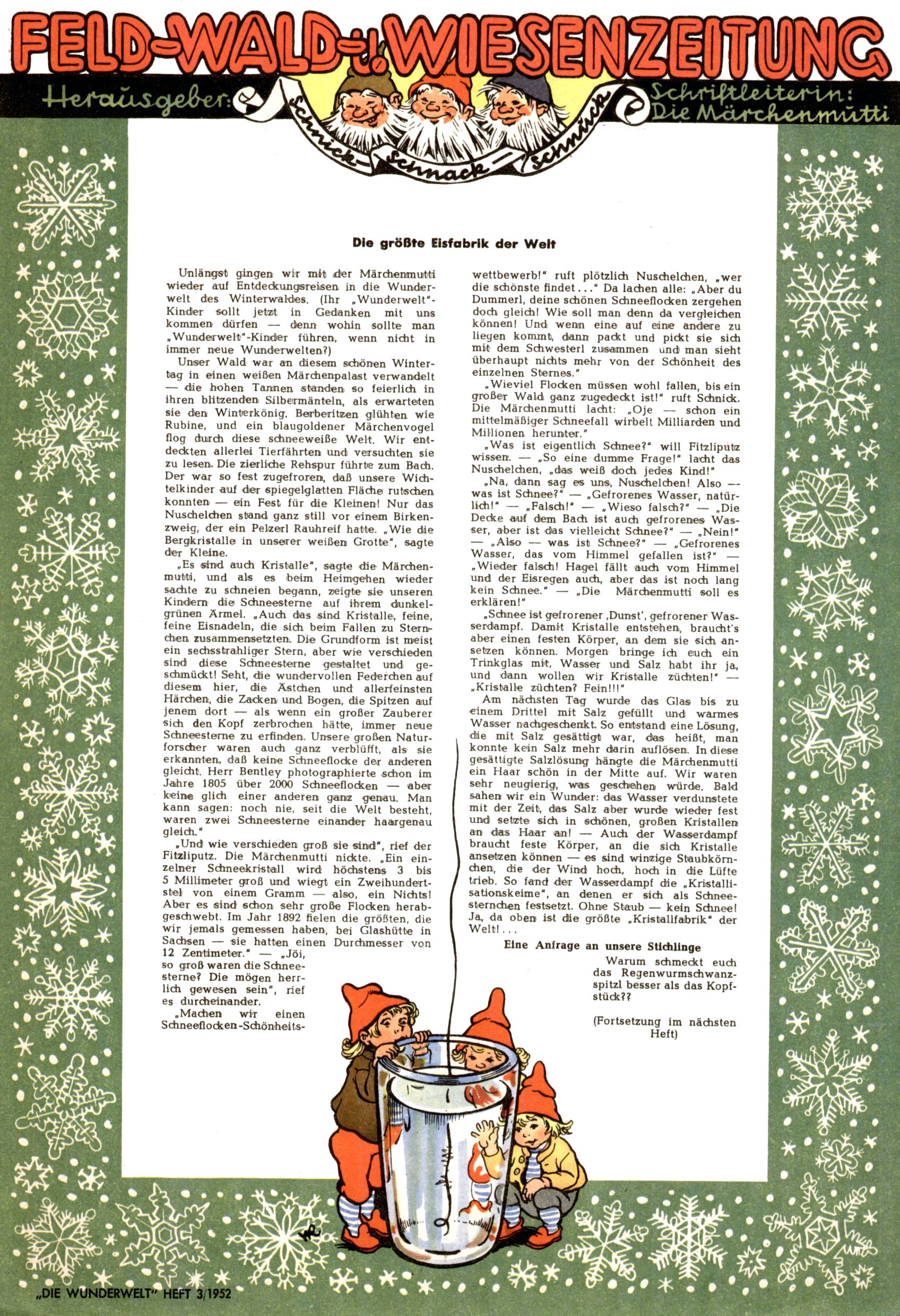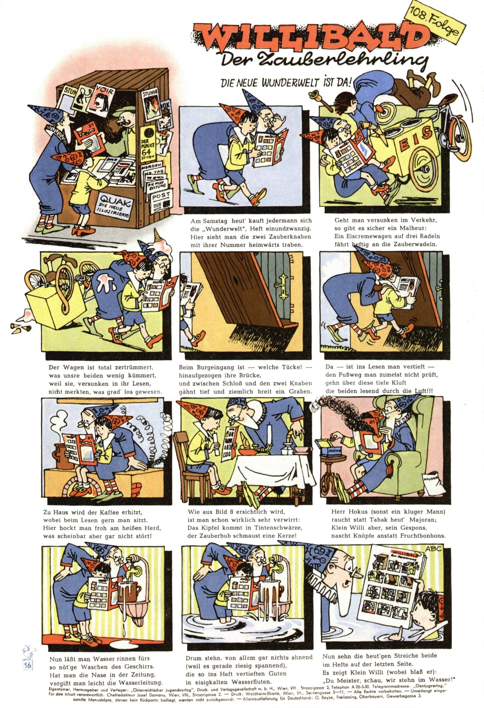 1952 – Der Erfolg hält an Wem Erfolg zuteil wird, der hat wenig Anlass, sein Konzept zu ändern. Und das war in gewisser Weise auch gut so bei allen inhaltlichen Schwächen der Beiträge in der Wunderwelt 1952. Der Erfolg der Zeitung wurde in erster Linie von der grafischen Umsetzung getragen; die lieblichen Bilder einer heilen Märchenwelt ließen über die oft flauen, pädagogisch teilweise sogar fragwürdigen Texte hinwegsehen. Elfriede Vavrovsky schrieb fast alle Texte und Rosl Warzilek zeichnete immer mehr Titelbilder und Mittelmärchen. ABC Peter Paul Prinz hatte Ende 1951 Meister Hokus als komischen Widerpart vom Zauberlehrling Willibald entdeckt und perfektionierte diesen Dualismus nun immer mehr. Meister Hokus avancierte zur regelmäßigen Lachnummer. Dafür überließ ABC vorübergehend Teja Aicher die Gestaltung der technischen Seite, dessen Zwerg Bumsti ebenfalls bereits untrennbar mit der Wunderwelt verbunden schien und längst zum Markenzeichen aufgestiegen war. Seine ko(s)mischen Superhelden Piff und Paff hatten jedoch allmählich genug von den Menschen und kehrten der Erde den Rücken zu. Für den Einsatz im Schulunterricht wurden weiterhin von Elfriede Vavrovsky erstellte politische und geografische Daten und Karten gedruckt, was gerne angenommen wurde, denn teure Atlanten gab es 1952 noch wenige, als viele politische Grenzen gar nicht endgültig geklärt schienen. |