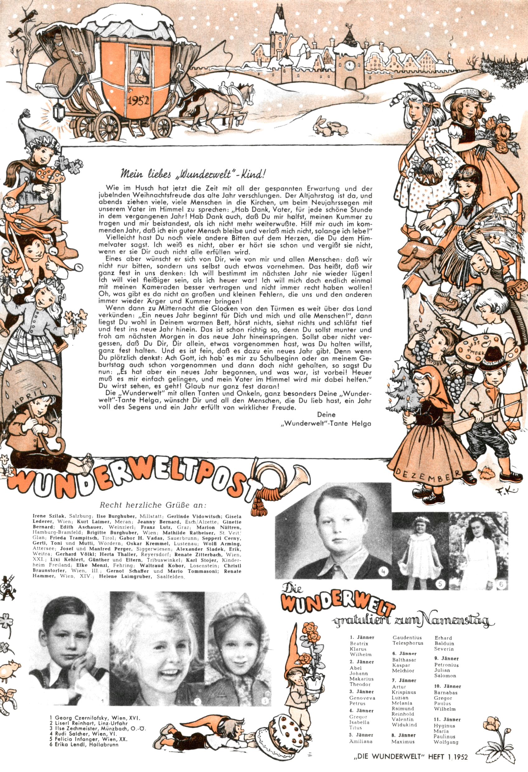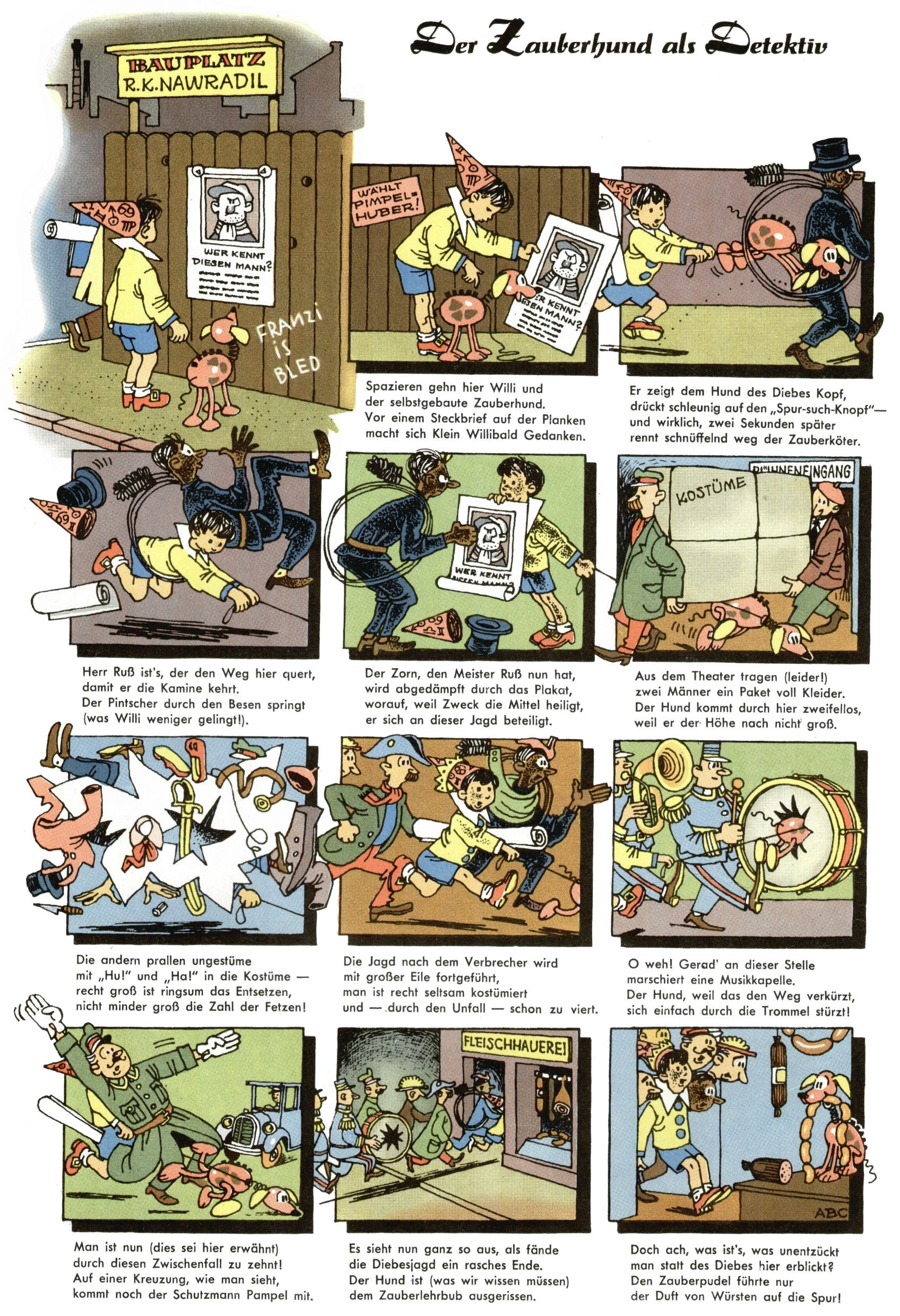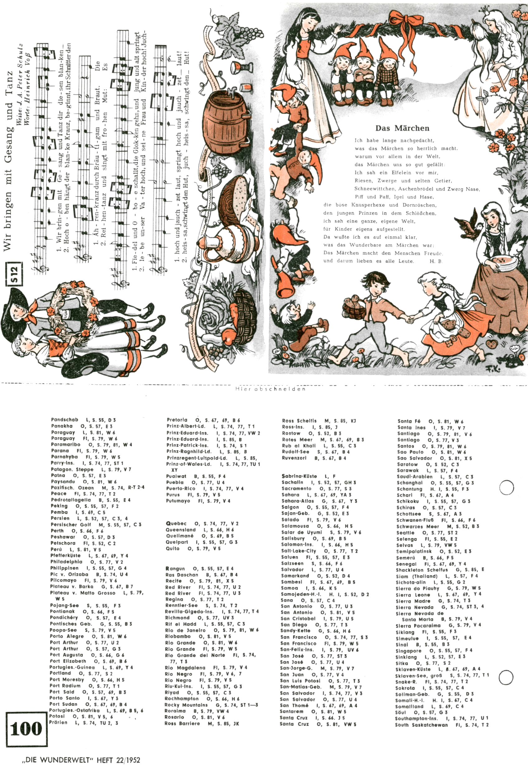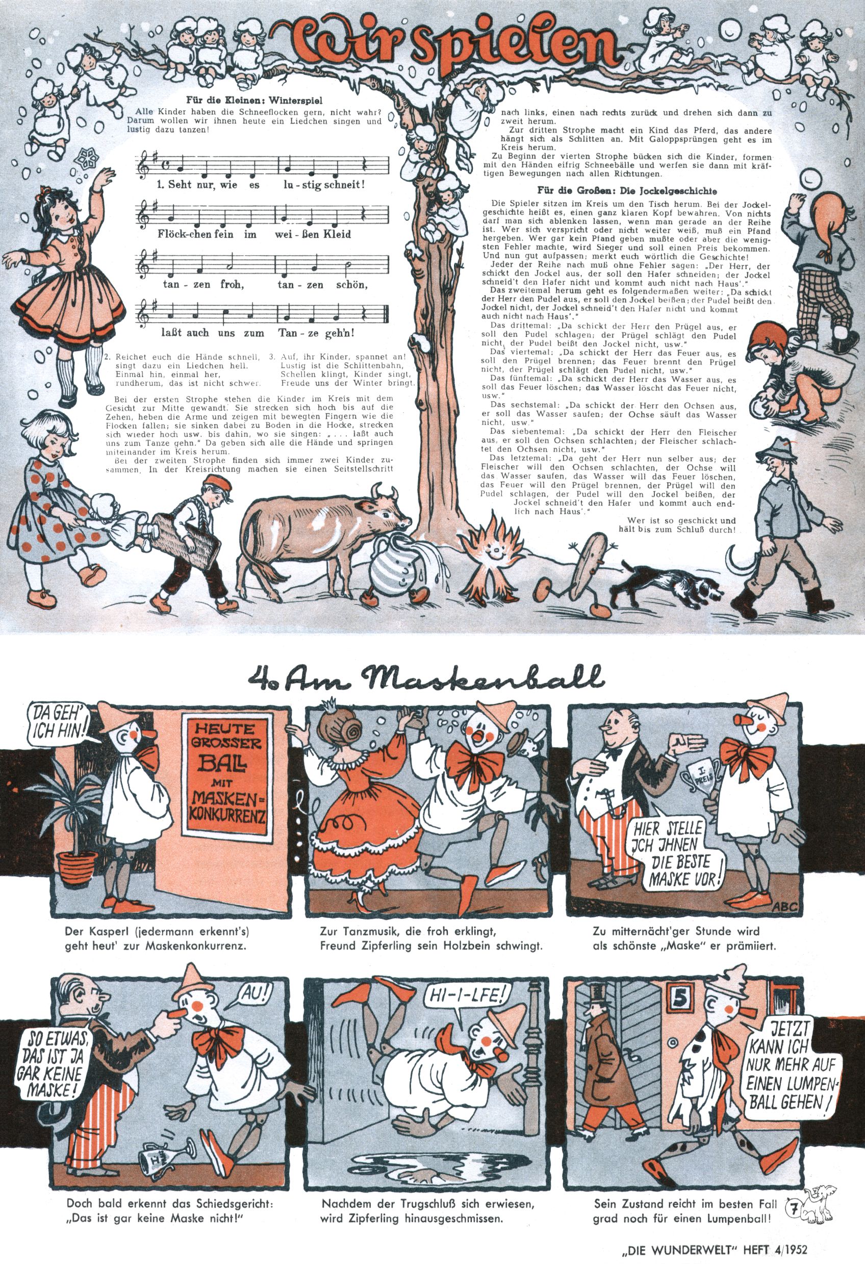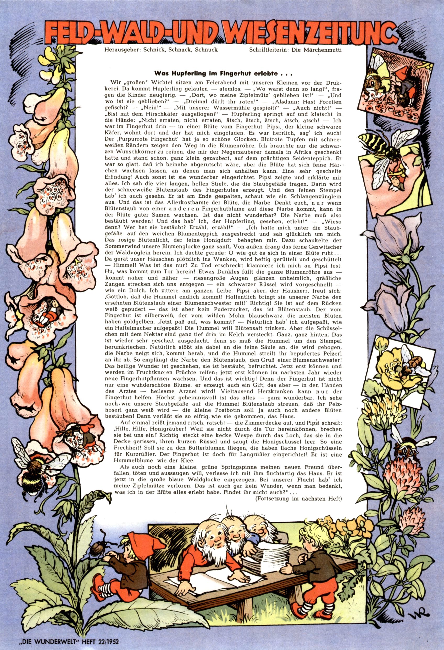 1952 – Der Erfolg hält an Wem Erfolg zuteil wird, der hat wenig Anlass, sein Konzept zu ändern. Und das war in gewisser Weise auch gut so bei allen inhaltlichen Schwächen der Beiträge in der Wunderwelt 1952. Der Erfolg der Zeitung wurde in erster Linie von der grafischen Umsetzung getragen; die lieblichen Bilder einer heilen Märchenwelt ließen über die oft flauen, pädagogisch teilweise sogar fragwürdigen Texte hinwegsehen. Elfriede Vavrovsky schrieb fast alle Texte und Rosl Warzilek zeichnete immer mehr Titelbilder und Mittelmärchen. ABC Peter Paul Prinz hatte Ende 1951 Meister Hokus als komischen Widerpart vom Zauberlehrling Willibald entdeckt und perfektionierte diesen Dualismus nun immer mehr. Meister Hokus avancierte zur regelmäßigen Lachnummer. Dafür überließ ABC vorübergehend Teja Aicher die Gestaltung der technischen Seite, dessen Zwerg Bumsti ebenfalls bereits untrennbar mit der Wunderwelt verbunden schien und längst zum Markenzeichen aufgestiegen war. Seine ko(s)mischen Superhelden Piff und Paff hatten jedoch allmählich genug von den Menschen und kehrten der Erde den Rücken zu. Für den Einsatz im Schulunterricht wurden weiterhin von Elfriede Vavrovsky erstellte politische und geografische Daten und Karten gedruckt, was gerne angenommen wurde, denn teure Atlanten gab es 1952 noch wenige, als viele politische Grenzen gar nicht endgültig geklärt schienen. |