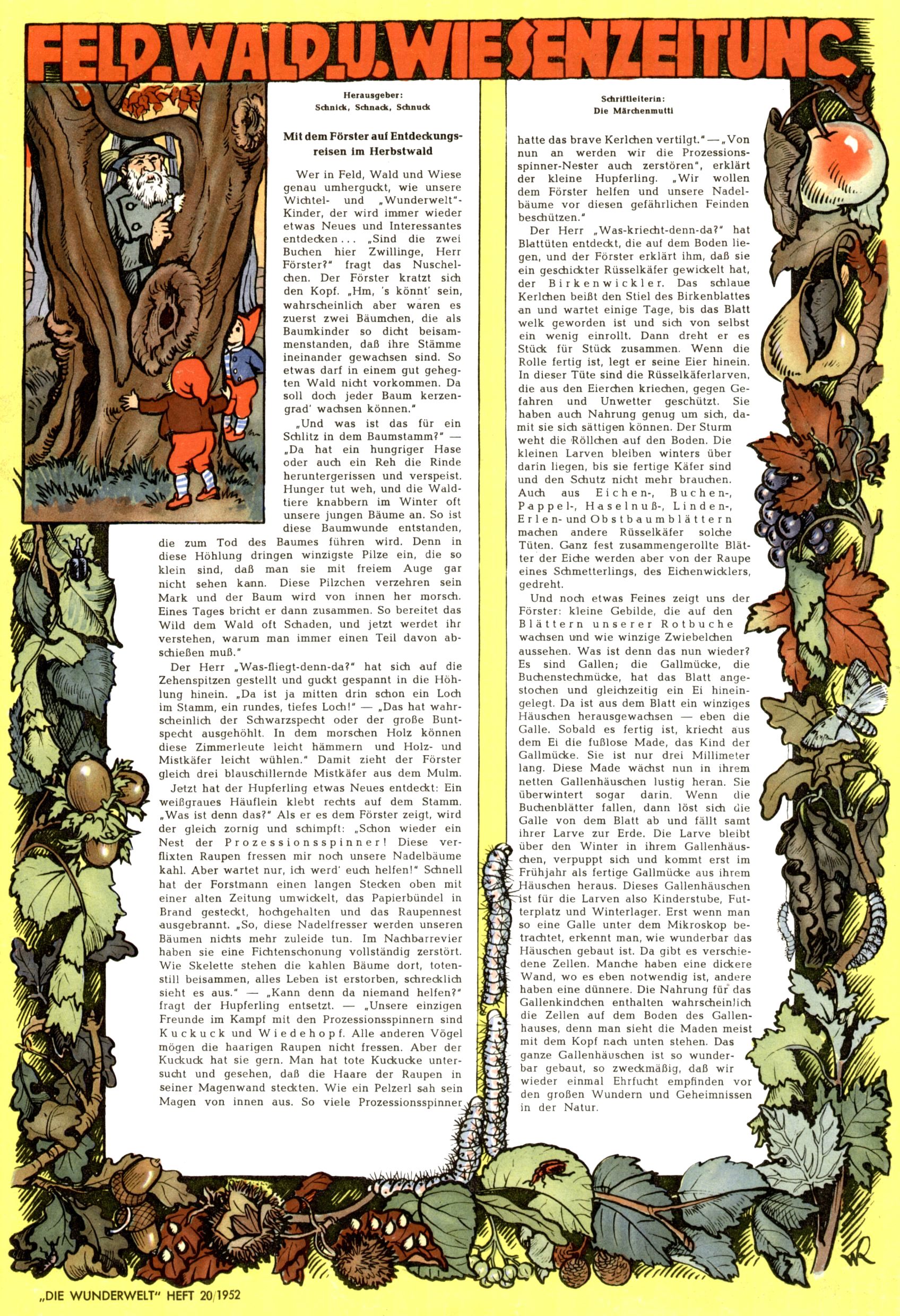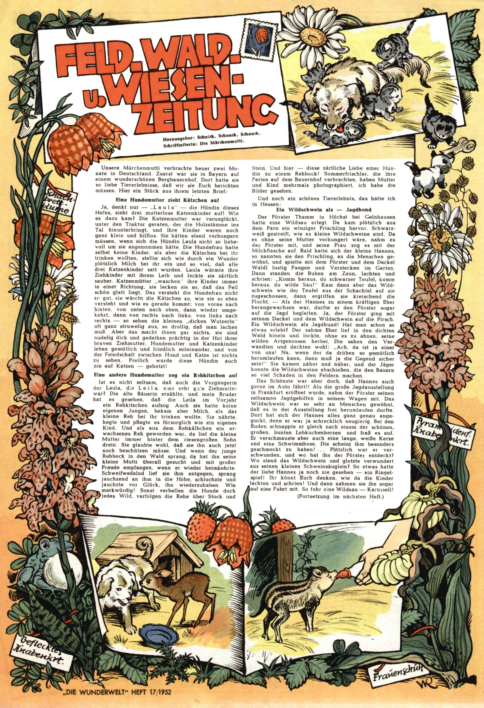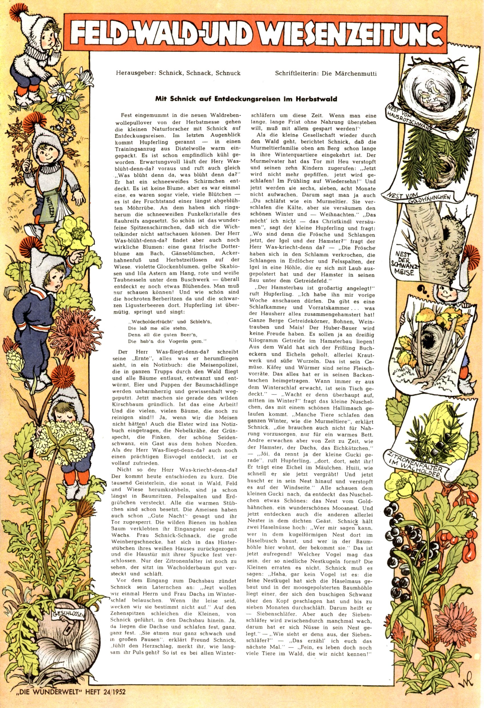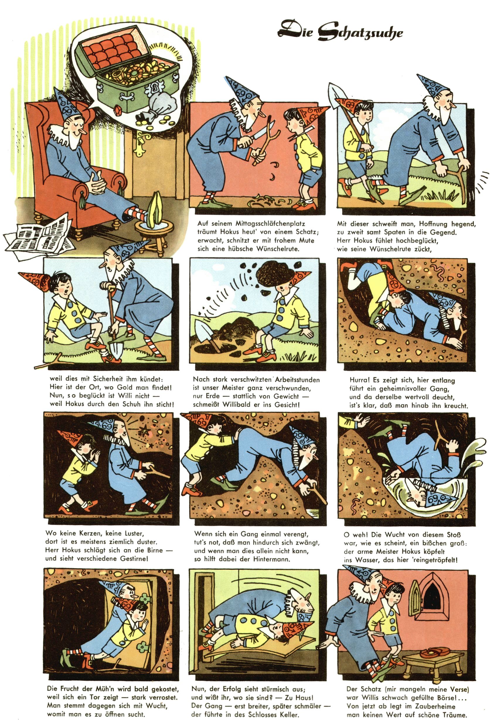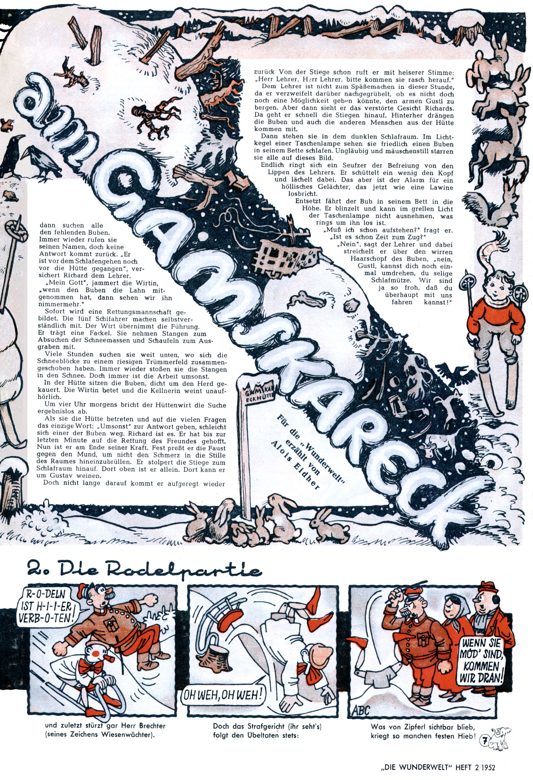 1952 – Der Erfolg hält an Wem Erfolg zuteil wird, der hat wenig Anlass, sein Konzept zu ändern. Und das war in gewisser Weise auch gut so bei allen inhaltlichen Schwächen der Beiträge in der Wunderwelt 1952. Der Erfolg der Zeitung wurde in erster Linie von der grafischen Umsetzung getragen; die lieblichen Bilder einer heilen Märchenwelt ließen über die oft flauen, pädagogisch teilweise sogar fragwürdigen Texte hinwegsehen. Elfriede Vavrovsky schrieb fast alle Texte und Rosl Warzilek zeichnete immer mehr Titelbilder und Mittelmärchen. ABC Peter Paul Prinz hatte Ende 1951 Meister Hokus als komischen Widerpart vom Zauberlehrling Willibald entdeckt und perfektionierte diesen Dualismus nun immer mehr. Meister Hokus avancierte zur regelmäßigen Lachnummer. Dafür überließ ABC vorübergehend Teja Aicher die Gestaltung der technischen Seite, dessen Zwerg Bumsti ebenfalls bereits untrennbar mit der Wunderwelt verbunden schien und längst zum Markenzeichen aufgestiegen war. Seine ko(s)mischen Superhelden Piff und Paff hatten jedoch allmählich genug von den Menschen und kehrten der Erde den Rücken zu. Für den Einsatz im Schulunterricht wurden weiterhin von Elfriede Vavrovsky erstellte politische und geografische Daten und Karten gedruckt, was gerne angenommen wurde, denn teure Atlanten gab es 1952 noch wenige, als viele politische Grenzen gar nicht endgültig geklärt schienen. |