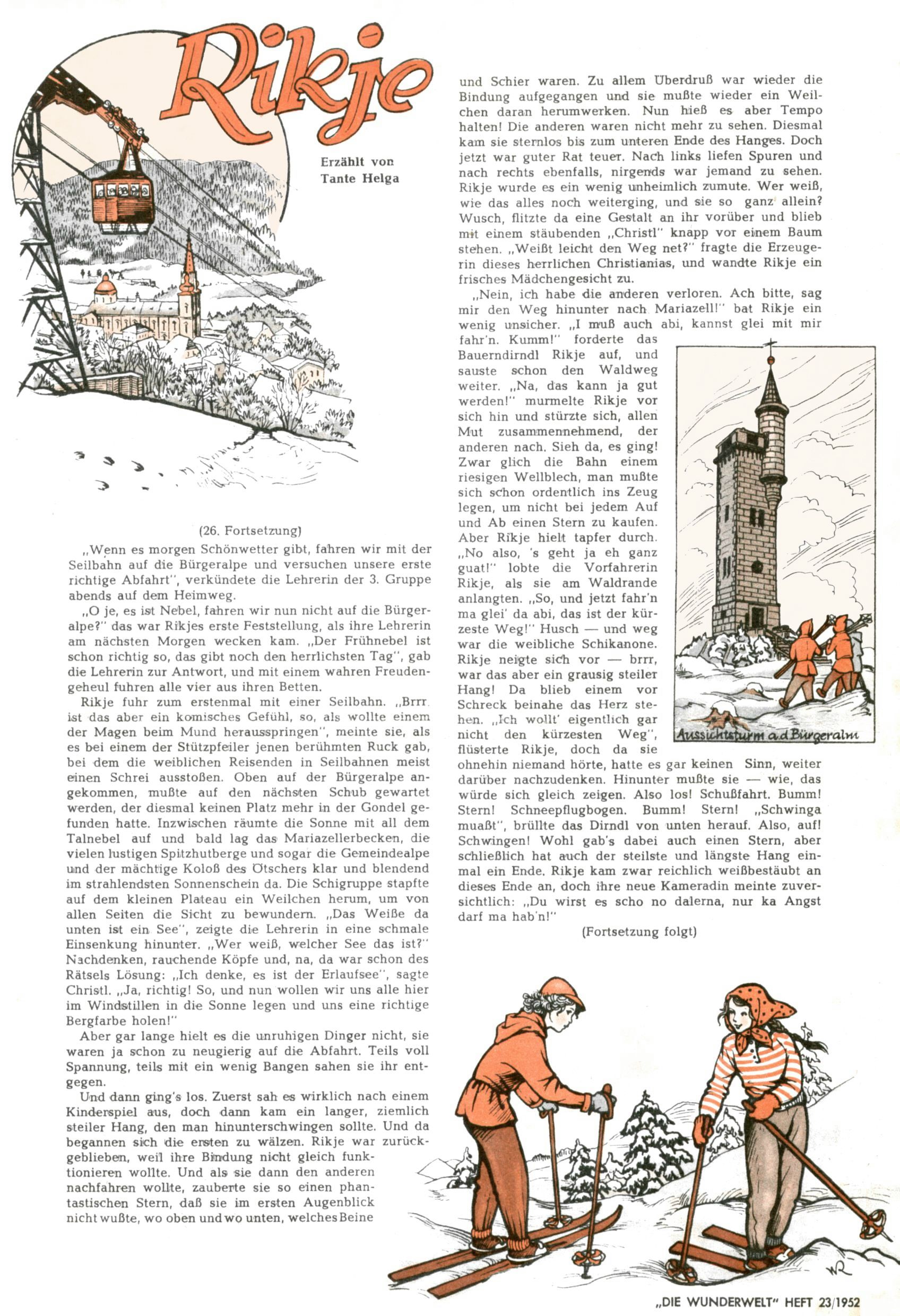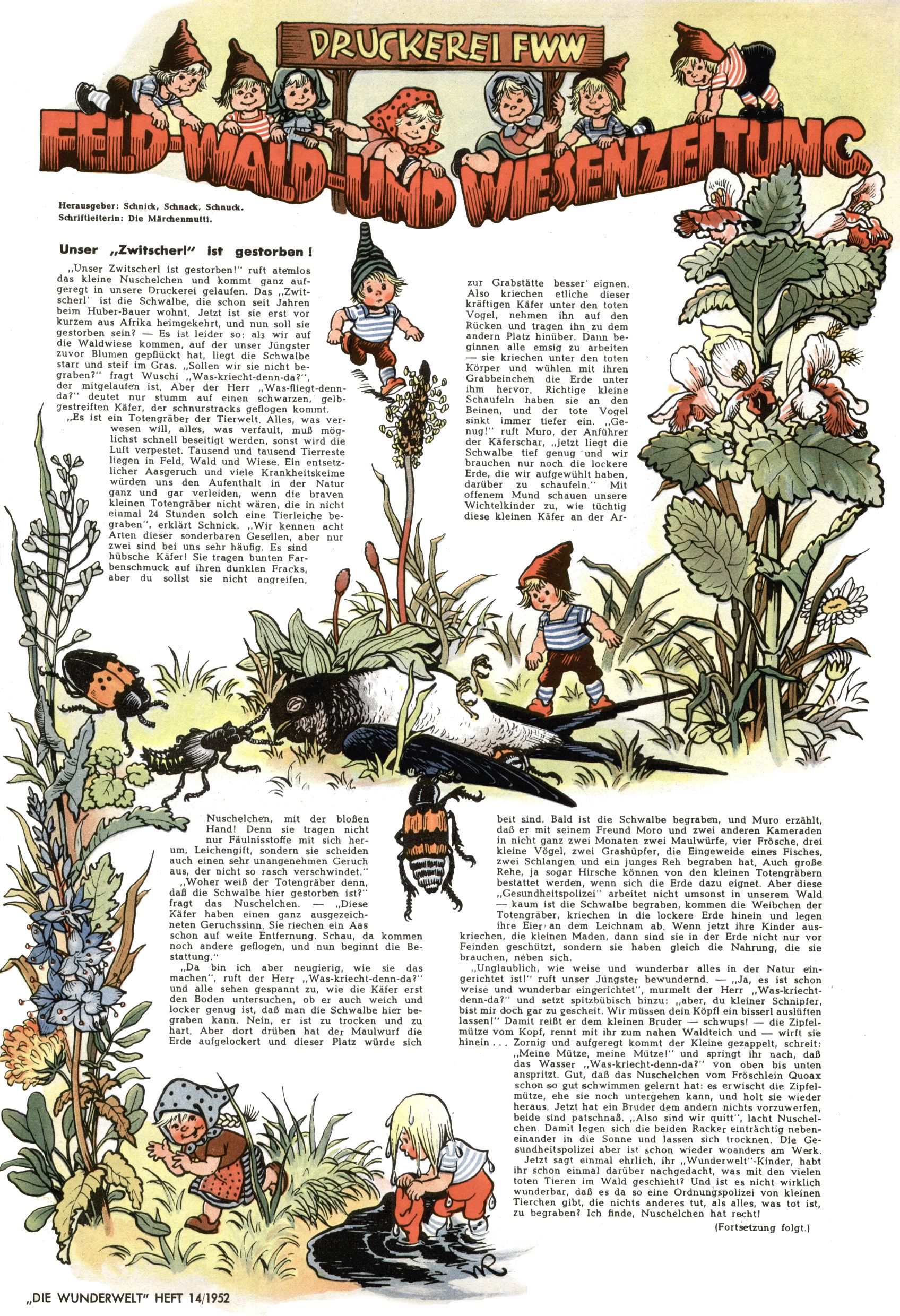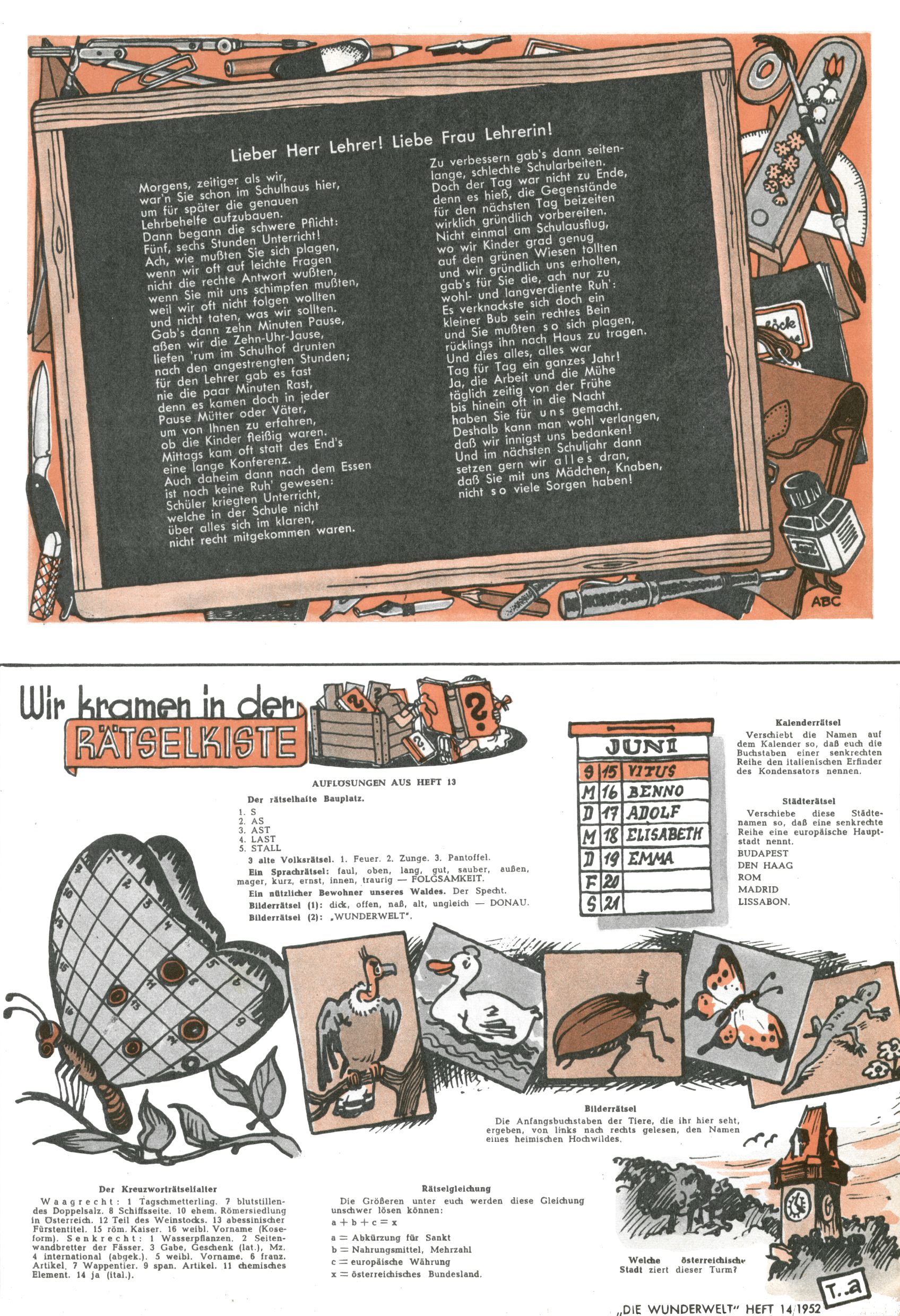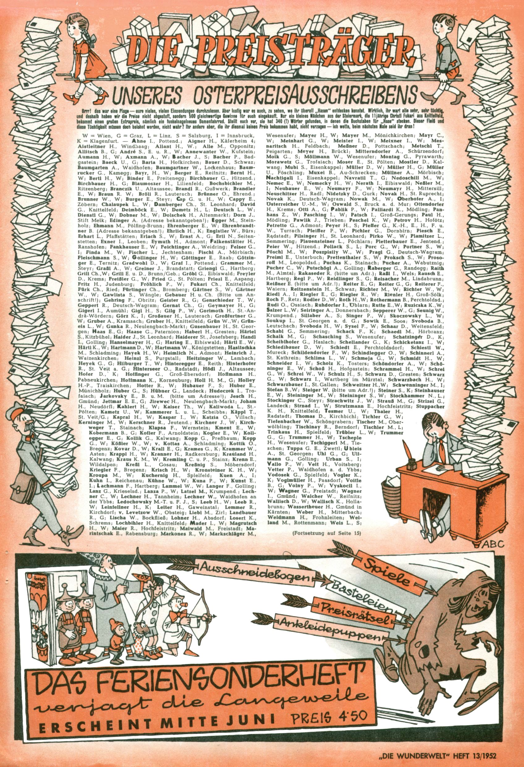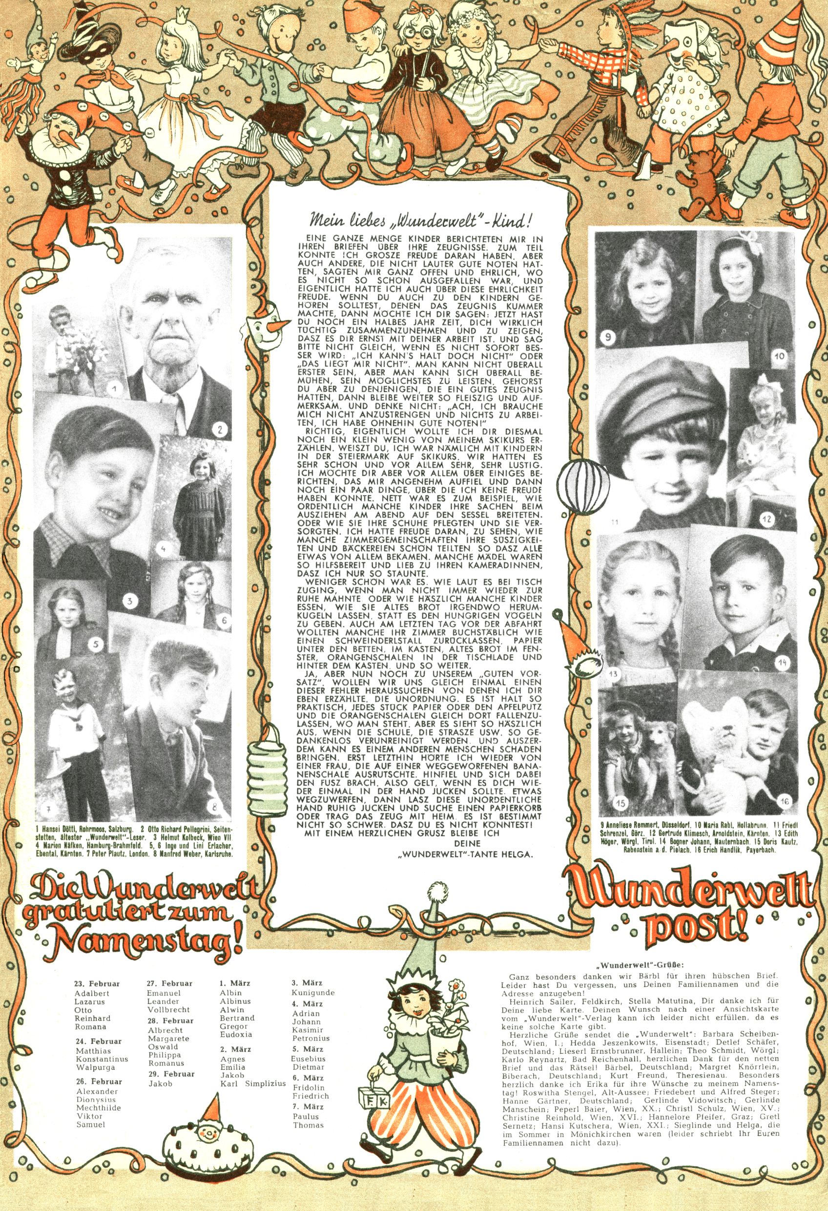 1952 – Der Erfolg hält an Wem Erfolg zuteil wird, der hat wenig Anlass, sein Konzept zu ändern. Und das war in gewisser Weise auch gut so bei allen inhaltlichen Schwächen der Beiträge in der Wunderwelt 1952. Der Erfolg der Zeitung wurde in erster Linie von der grafischen Umsetzung getragen; die lieblichen Bilder einer heilen Märchenwelt ließen über die oft flauen, pädagogisch teilweise sogar fragwürdigen Texte hinwegsehen. Elfriede Vavrovsky schrieb fast alle Texte und Rosl Warzilek zeichnete immer mehr Titelbilder und Mittelmärchen. ABC Peter Paul Prinz hatte Ende 1951 Meister Hokus als komischen Widerpart vom Zauberlehrling Willibald entdeckt und perfektionierte diesen Dualismus nun immer mehr. Meister Hokus avancierte zur regelmäßigen Lachnummer. Dafür überließ ABC vorübergehend Teja Aicher die Gestaltung der technischen Seite, dessen Zwerg Bumsti ebenfalls bereits untrennbar mit der Wunderwelt verbunden schien und längst zum Markenzeichen aufgestiegen war. Seine ko(s)mischen Superhelden Piff und Paff hatten jedoch allmählich genug von den Menschen und kehrten der Erde den Rücken zu. Für den Einsatz im Schulunterricht wurden weiterhin von Elfriede Vavrovsky erstellte politische und geografische Daten und Karten gedruckt, was gerne angenommen wurde, denn teure Atlanten gab es 1952 noch wenige, als viele politische Grenzen gar nicht endgültig geklärt schienen. |