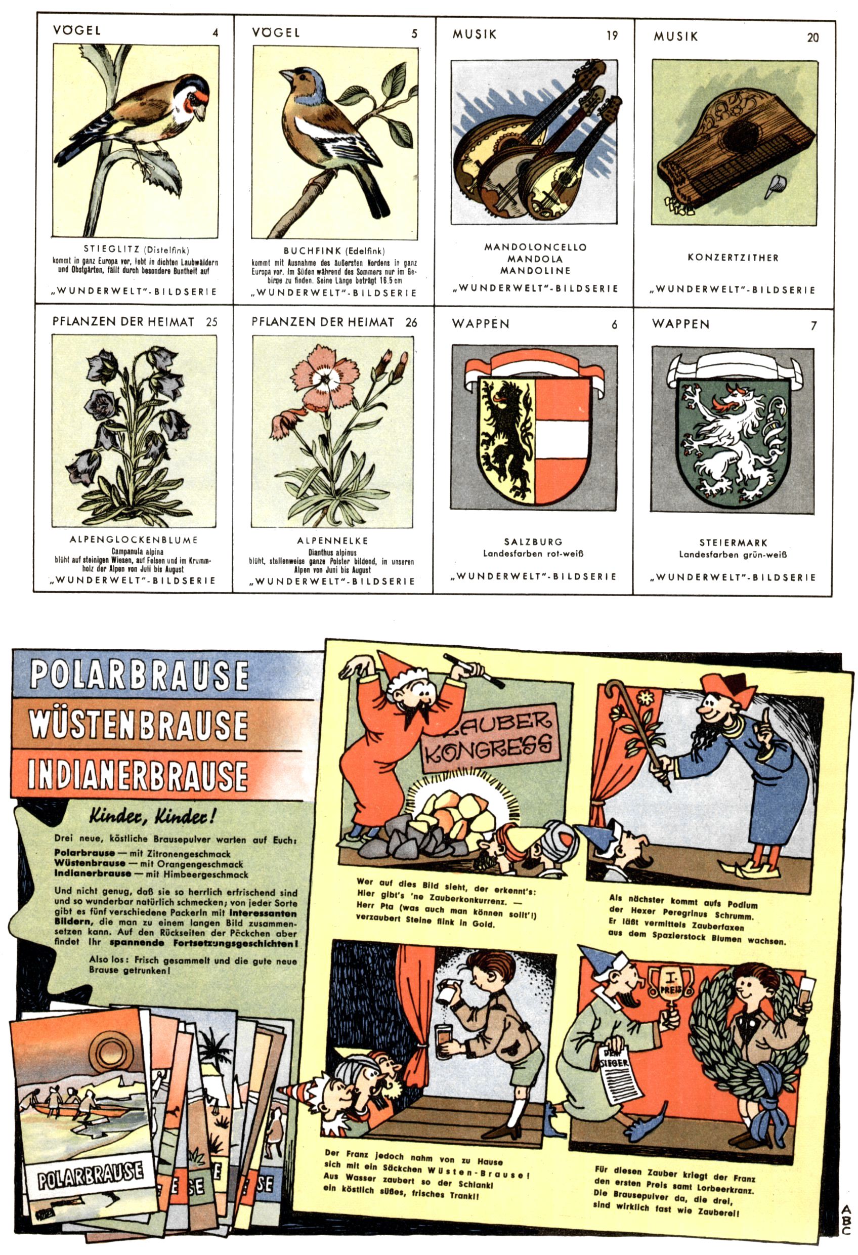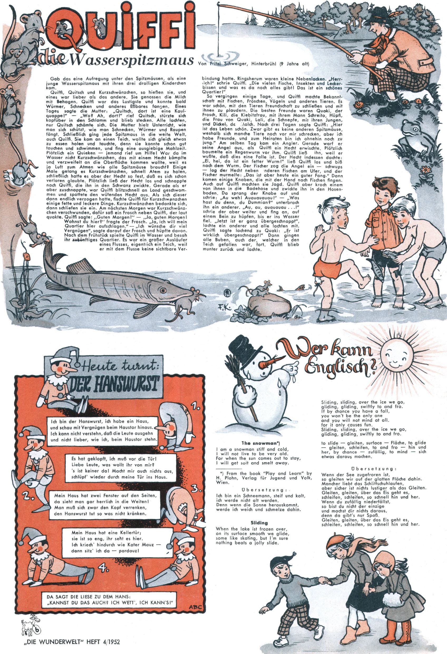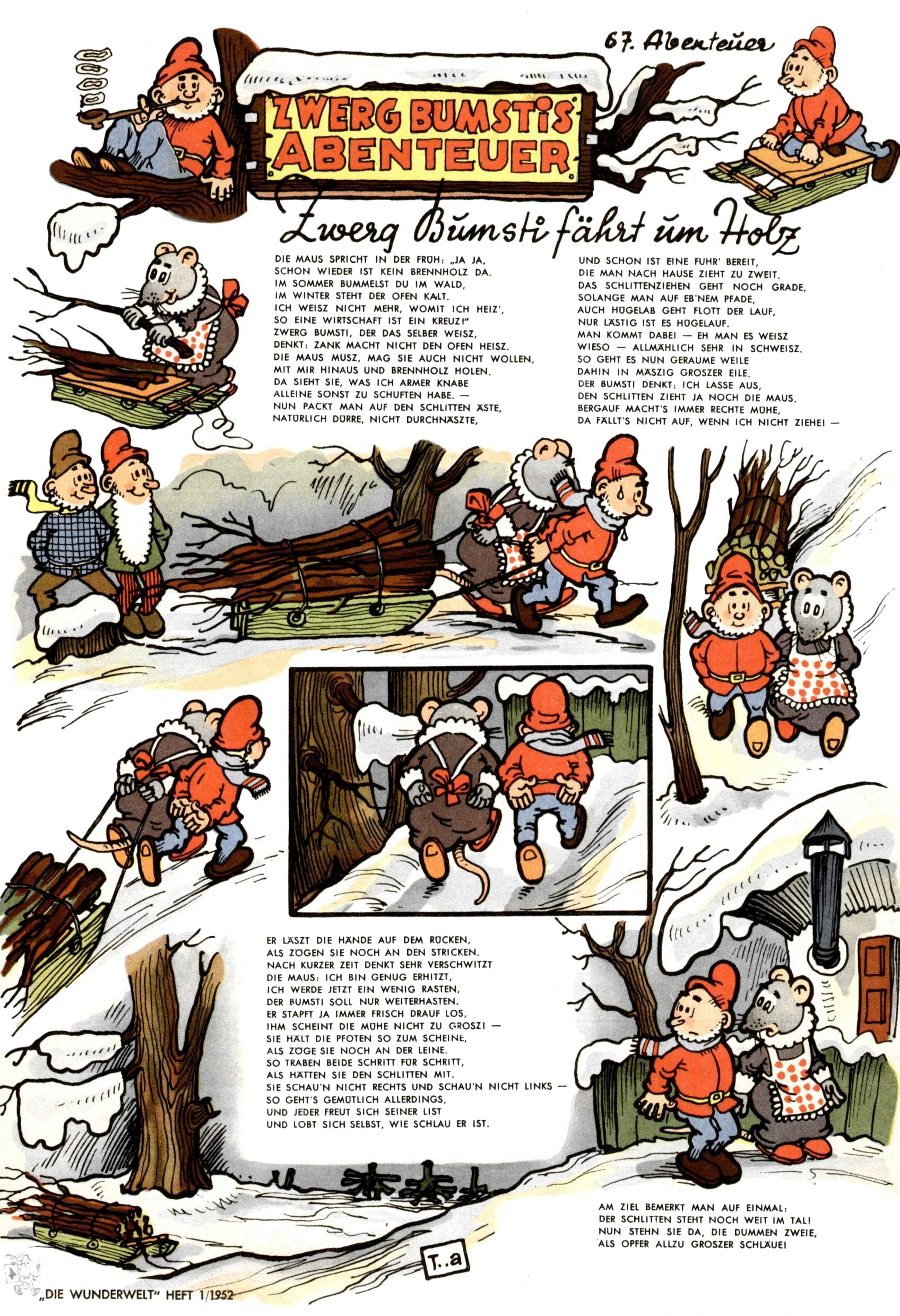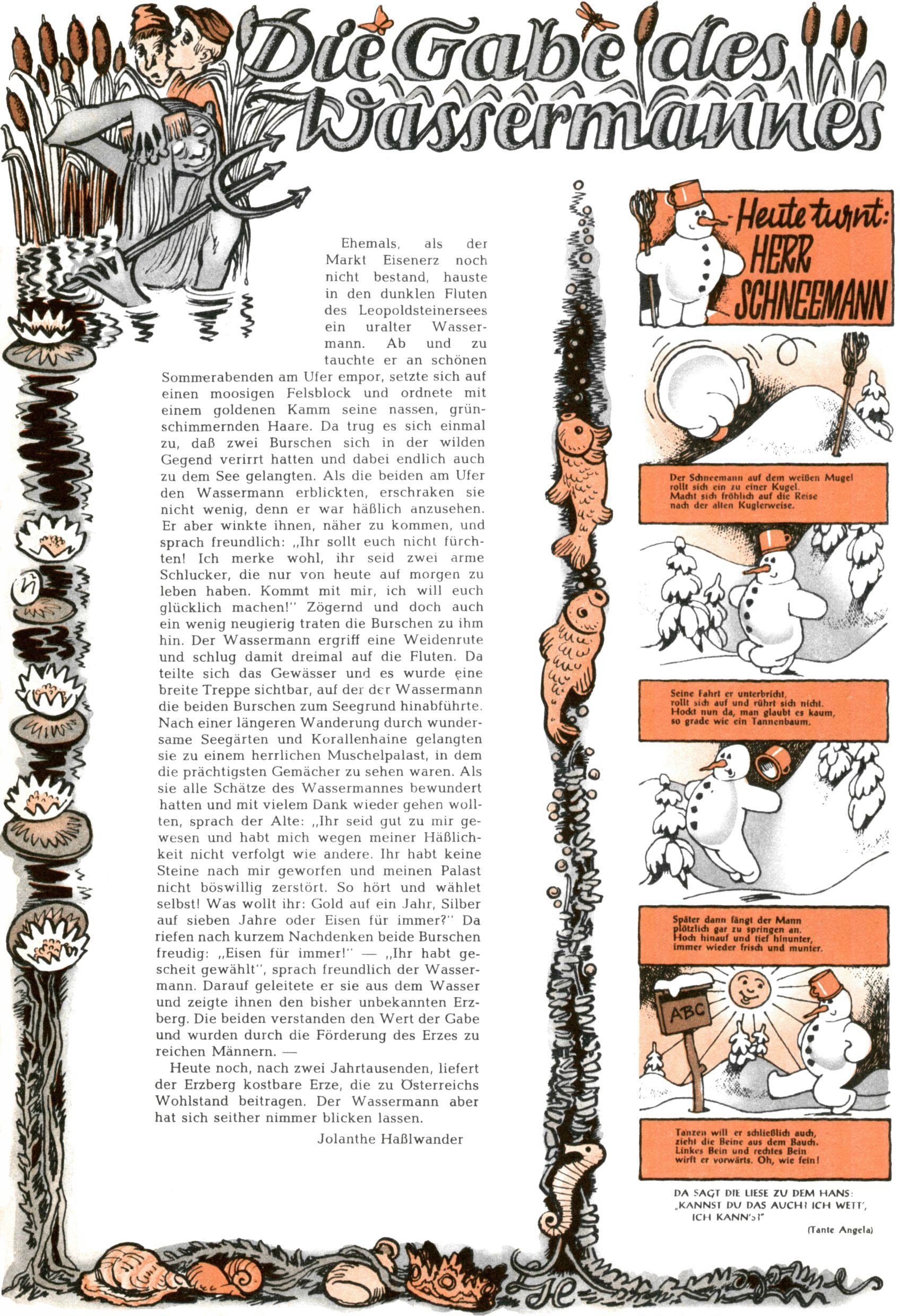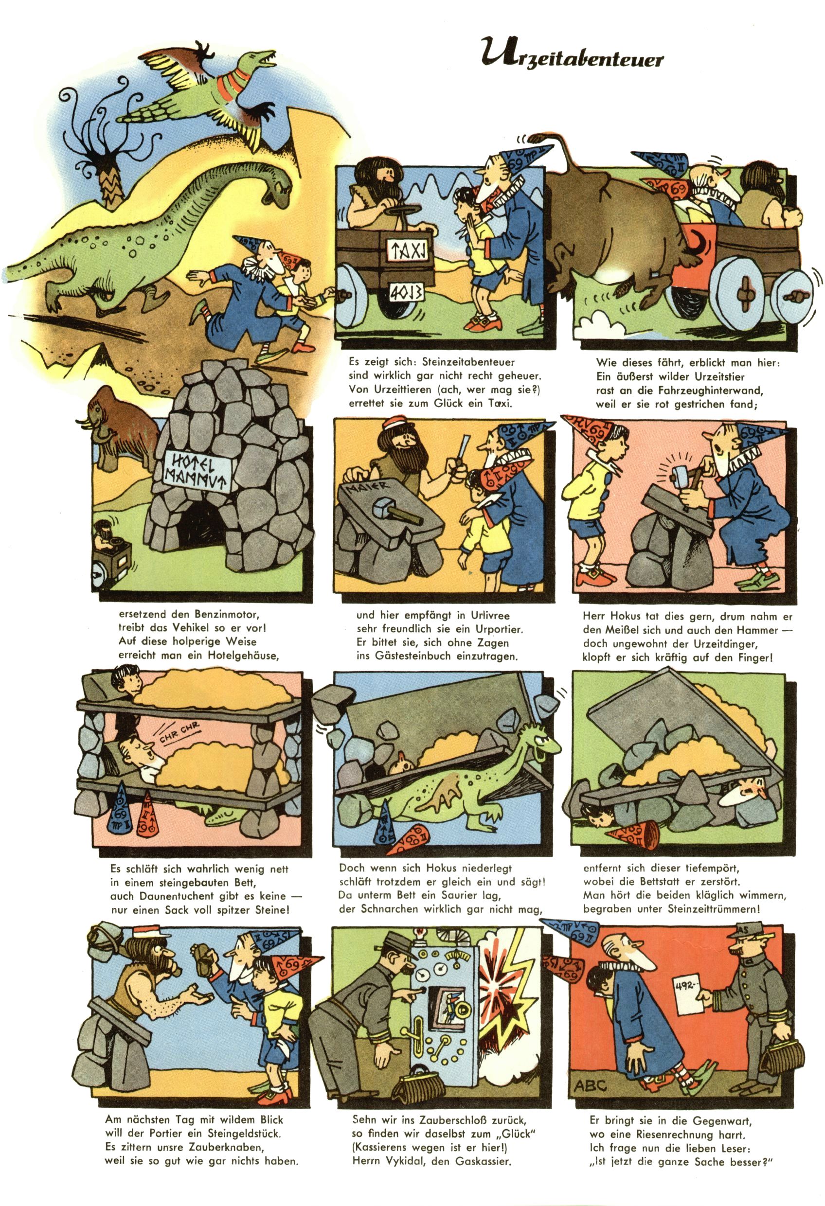 1952 – Der Erfolg hält an Wem Erfolg zuteil wird, der hat wenig Anlass, sein Konzept zu ändern. Und das war in gewisser Weise auch gut so bei allen inhaltlichen Schwächen der Beiträge in der Wunderwelt 1952. Der Erfolg der Zeitung wurde in erster Linie von der grafischen Umsetzung getragen; die lieblichen Bilder einer heilen Märchenwelt ließen über die oft flauen, pädagogisch teilweise sogar fragwürdigen Texte hinwegsehen. Elfriede Vavrovsky schrieb fast alle Texte und Rosl Warzilek zeichnete immer mehr Titelbilder und Mittelmärchen. ABC Peter Paul Prinz hatte Ende 1951 Meister Hokus als komischen Widerpart vom Zauberlehrling Willibald entdeckt und perfektionierte diesen Dualismus nun immer mehr. Meister Hokus avancierte zur regelmäßigen Lachnummer. Dafür überließ ABC vorübergehend Teja Aicher die Gestaltung der technischen Seite, dessen Zwerg Bumsti ebenfalls bereits untrennbar mit der Wunderwelt verbunden schien und längst zum Markenzeichen aufgestiegen war. Seine ko(s)mischen Superhelden Piff und Paff hatten jedoch allmählich genug von den Menschen und kehrten der Erde den Rücken zu. Für den Einsatz im Schulunterricht wurden weiterhin von Elfriede Vavrovsky erstellte politische und geografische Daten und Karten gedruckt, was gerne angenommen wurde, denn teure Atlanten gab es 1952 noch wenige, als viele politische Grenzen gar nicht endgültig geklärt schienen. |