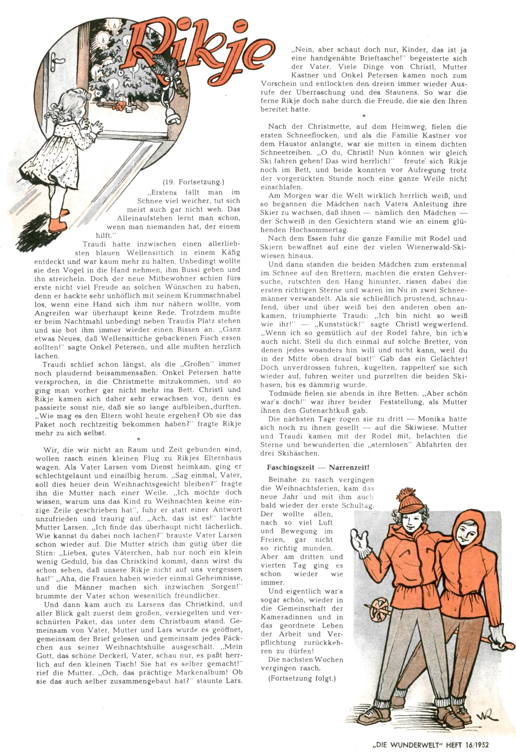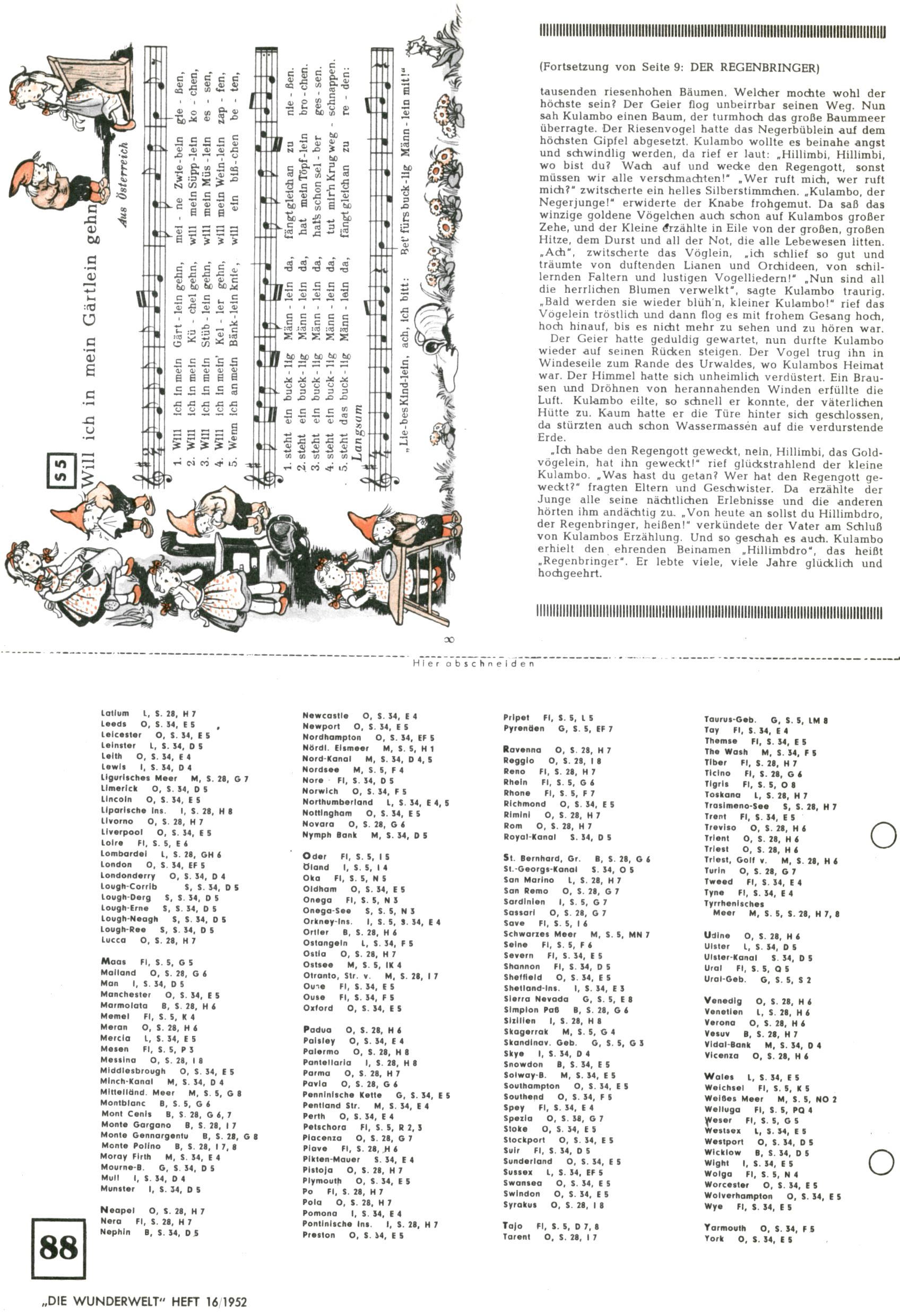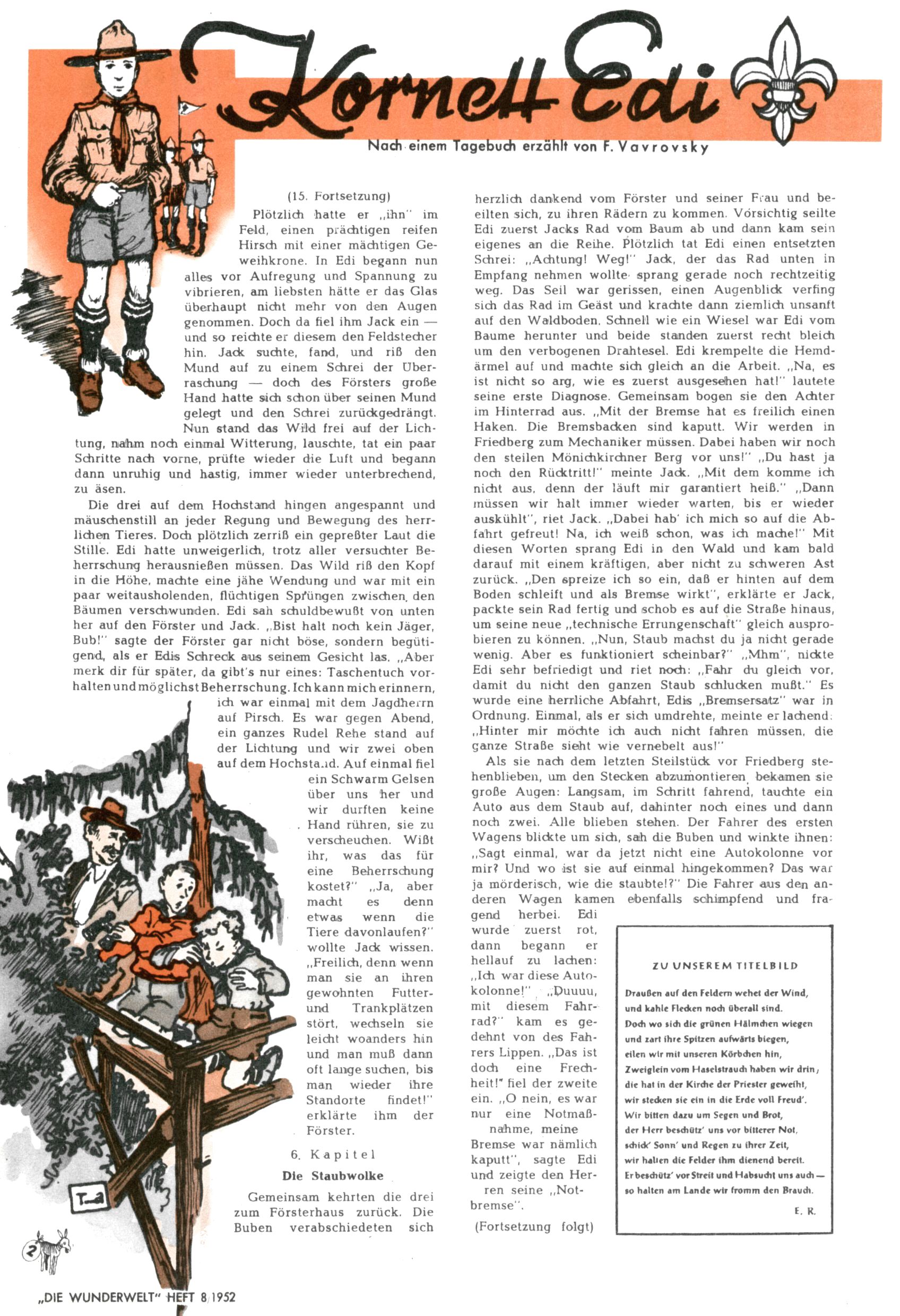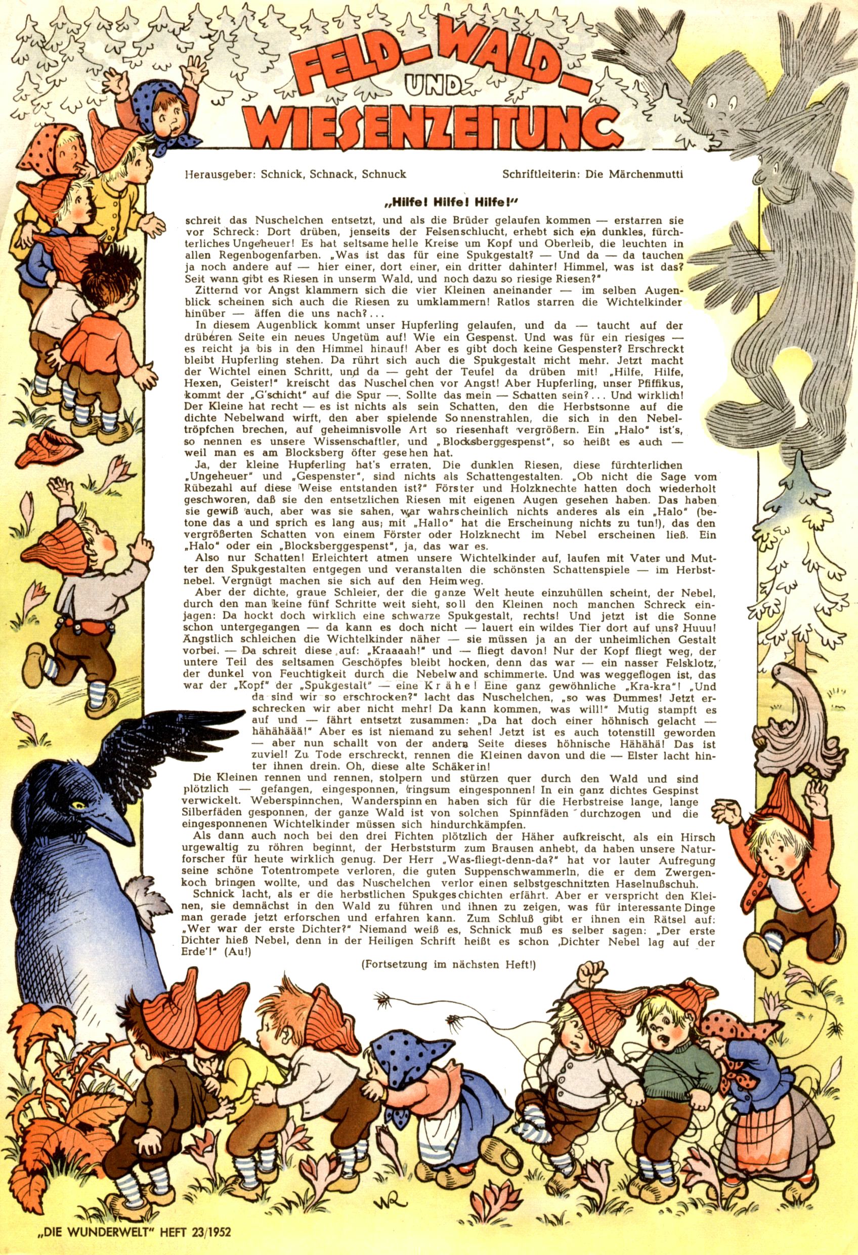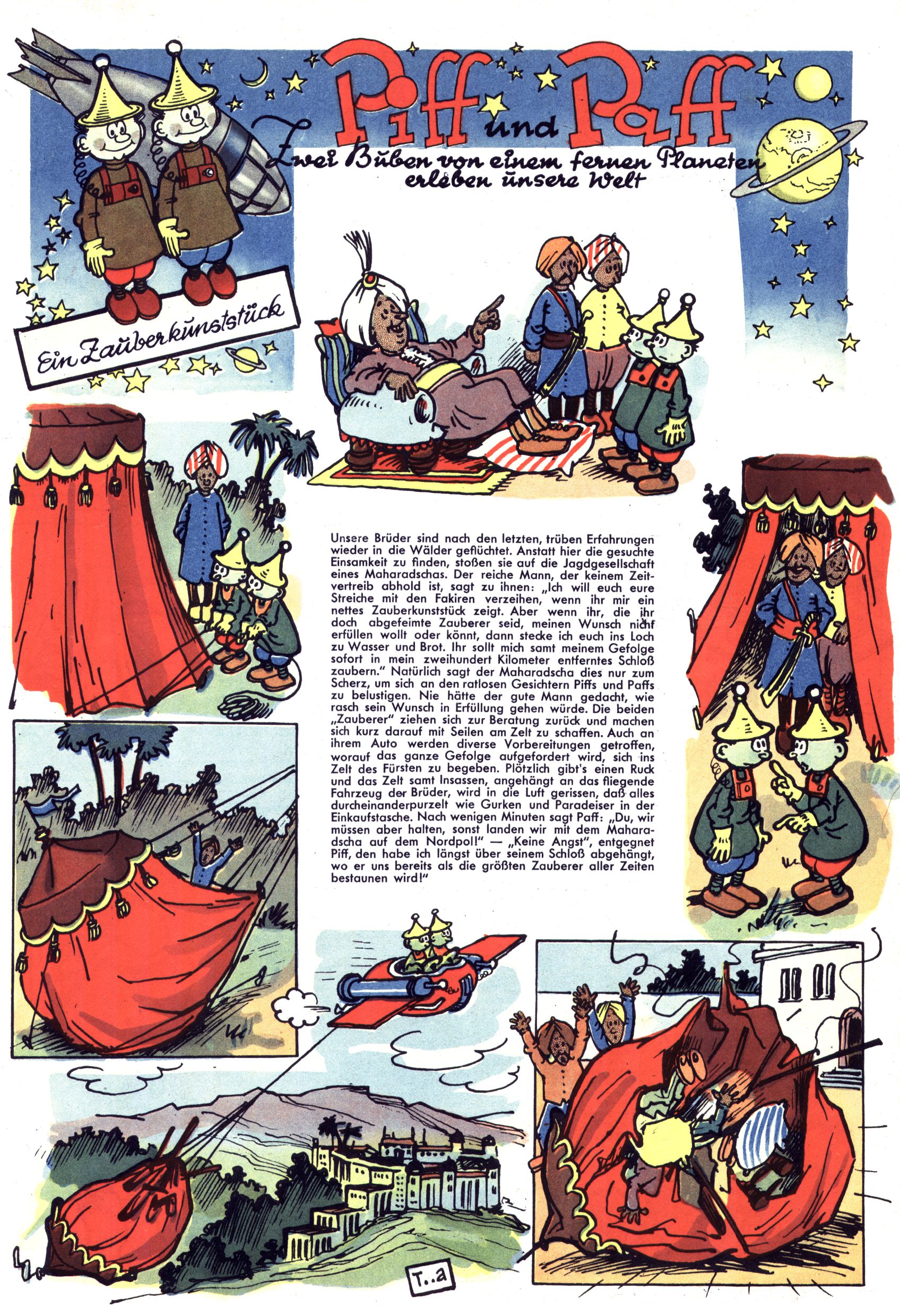 1952 – Der Erfolg hält an Wem Erfolg zuteil wird, der hat wenig Anlass, sein Konzept zu ändern. Und das war in gewisser Weise auch gut so bei allen inhaltlichen Schwächen der Beiträge in der Wunderwelt 1952. Der Erfolg der Zeitung wurde in erster Linie von der grafischen Umsetzung getragen; die lieblichen Bilder einer heilen Märchenwelt ließen über die oft flauen, pädagogisch teilweise sogar fragwürdigen Texte hinwegsehen. Elfriede Vavrovsky schrieb fast alle Texte und Rosl Warzilek zeichnete immer mehr Titelbilder und Mittelmärchen. ABC Peter Paul Prinz hatte Ende 1951 Meister Hokus als komischen Widerpart vom Zauberlehrling Willibald entdeckt und perfektionierte diesen Dualismus nun immer mehr. Meister Hokus avancierte zur regelmäßigen Lachnummer. Dafür überließ ABC vorübergehend Teja Aicher die Gestaltung der technischen Seite, dessen Zwerg Bumsti ebenfalls bereits untrennbar mit der Wunderwelt verbunden schien und längst zum Markenzeichen aufgestiegen war. Seine ko(s)mischen Superhelden Piff und Paff hatten jedoch allmählich genug von den Menschen und kehrten der Erde den Rücken zu. Für den Einsatz im Schulunterricht wurden weiterhin von Elfriede Vavrovsky erstellte politische und geografische Daten und Karten gedruckt, was gerne angenommen wurde, denn teure Atlanten gab es 1952 noch wenige, als viele politische Grenzen gar nicht endgültig geklärt schienen. |