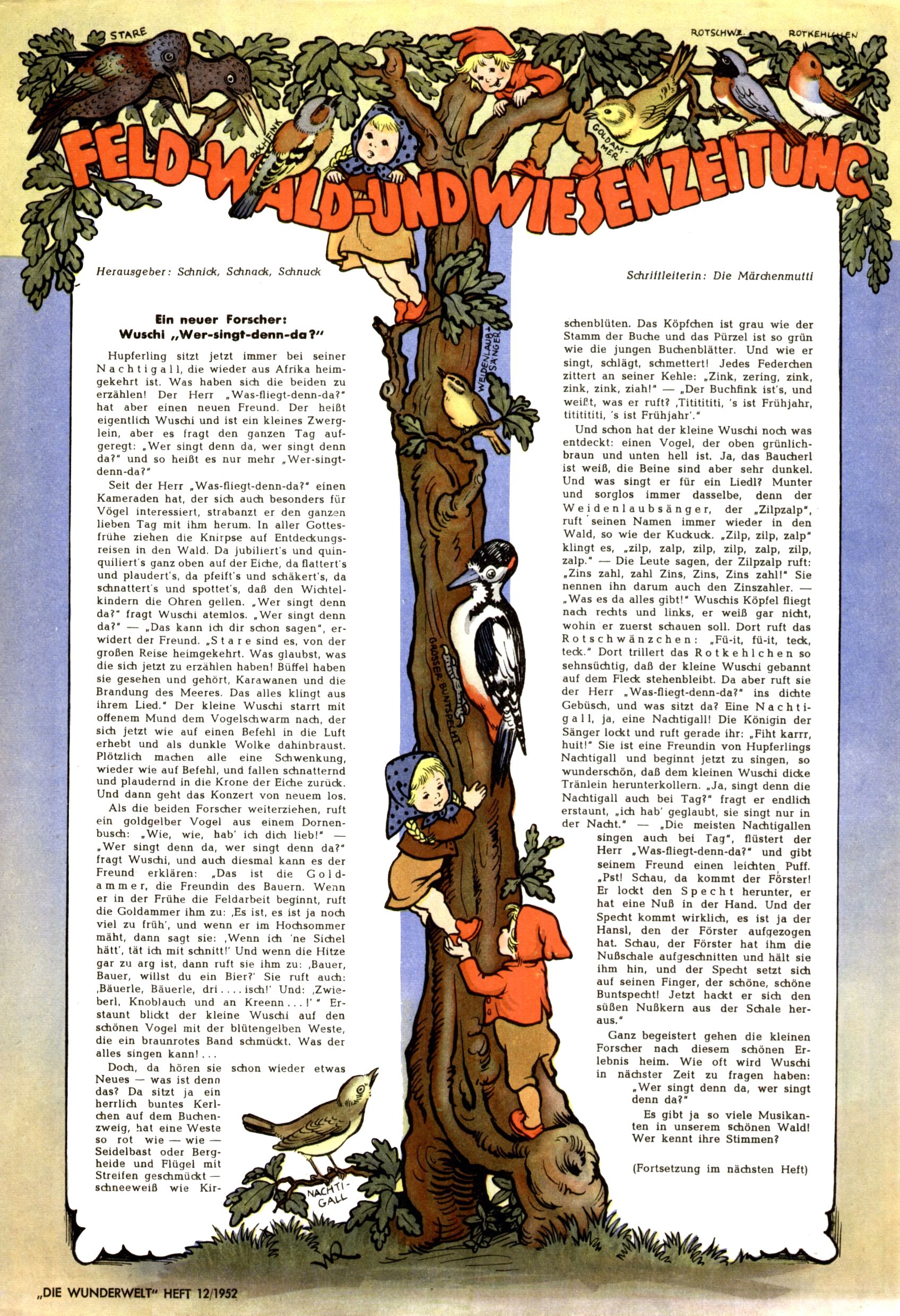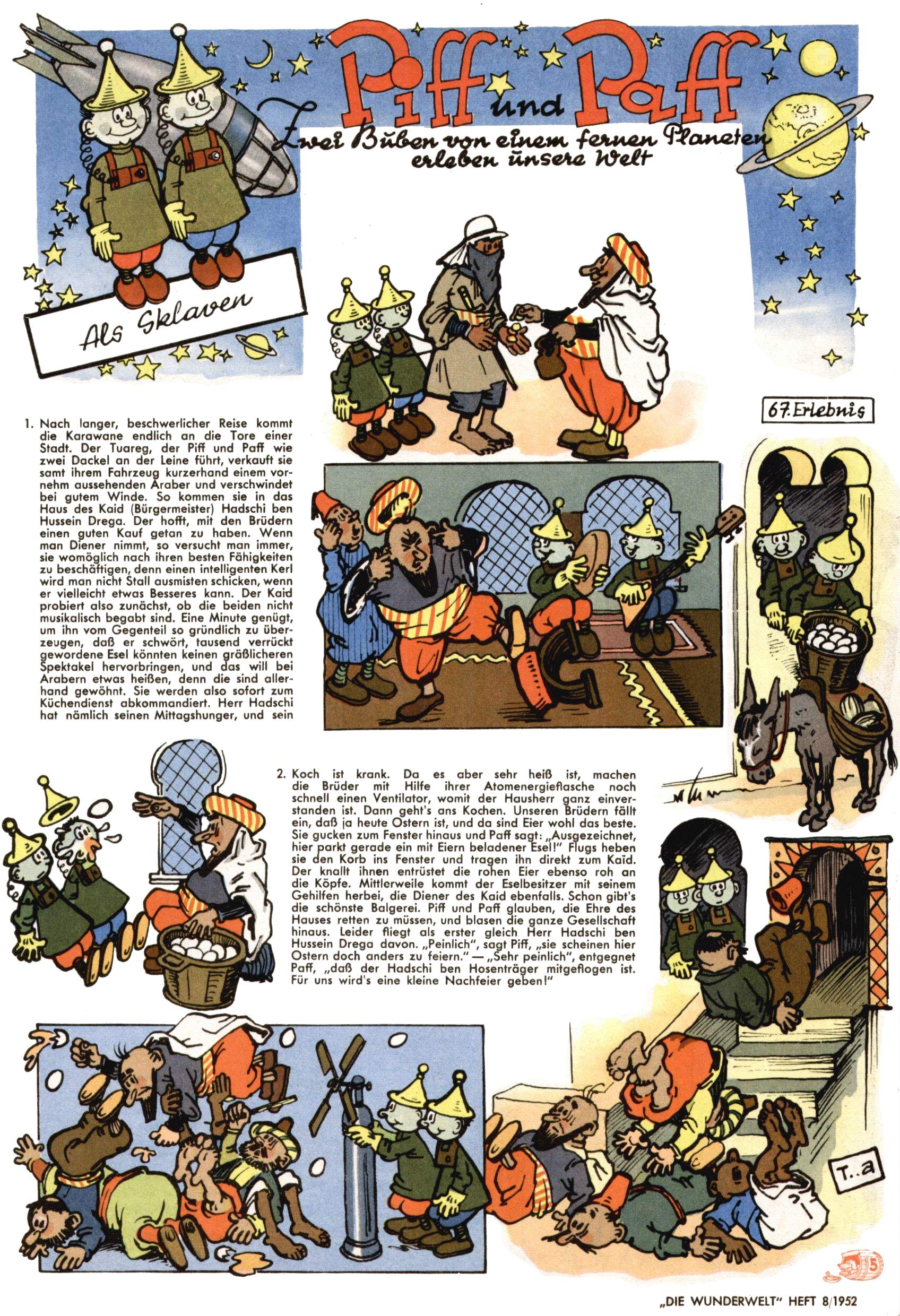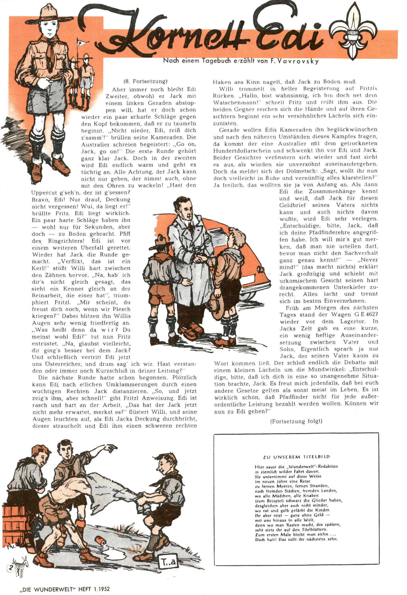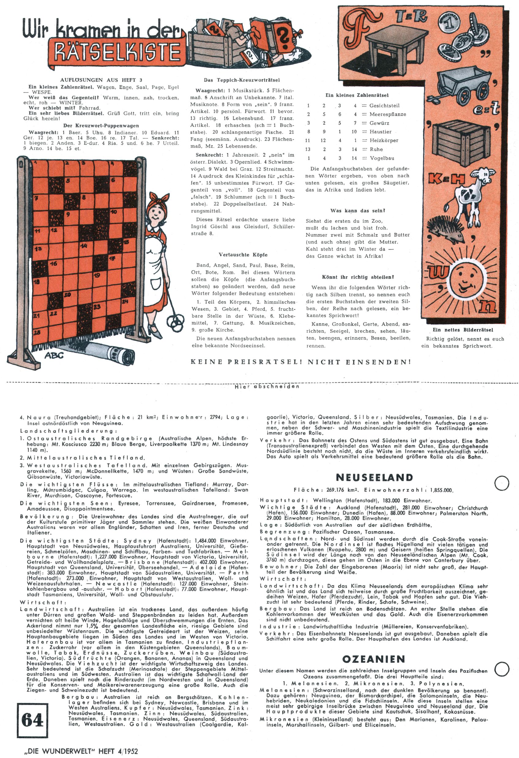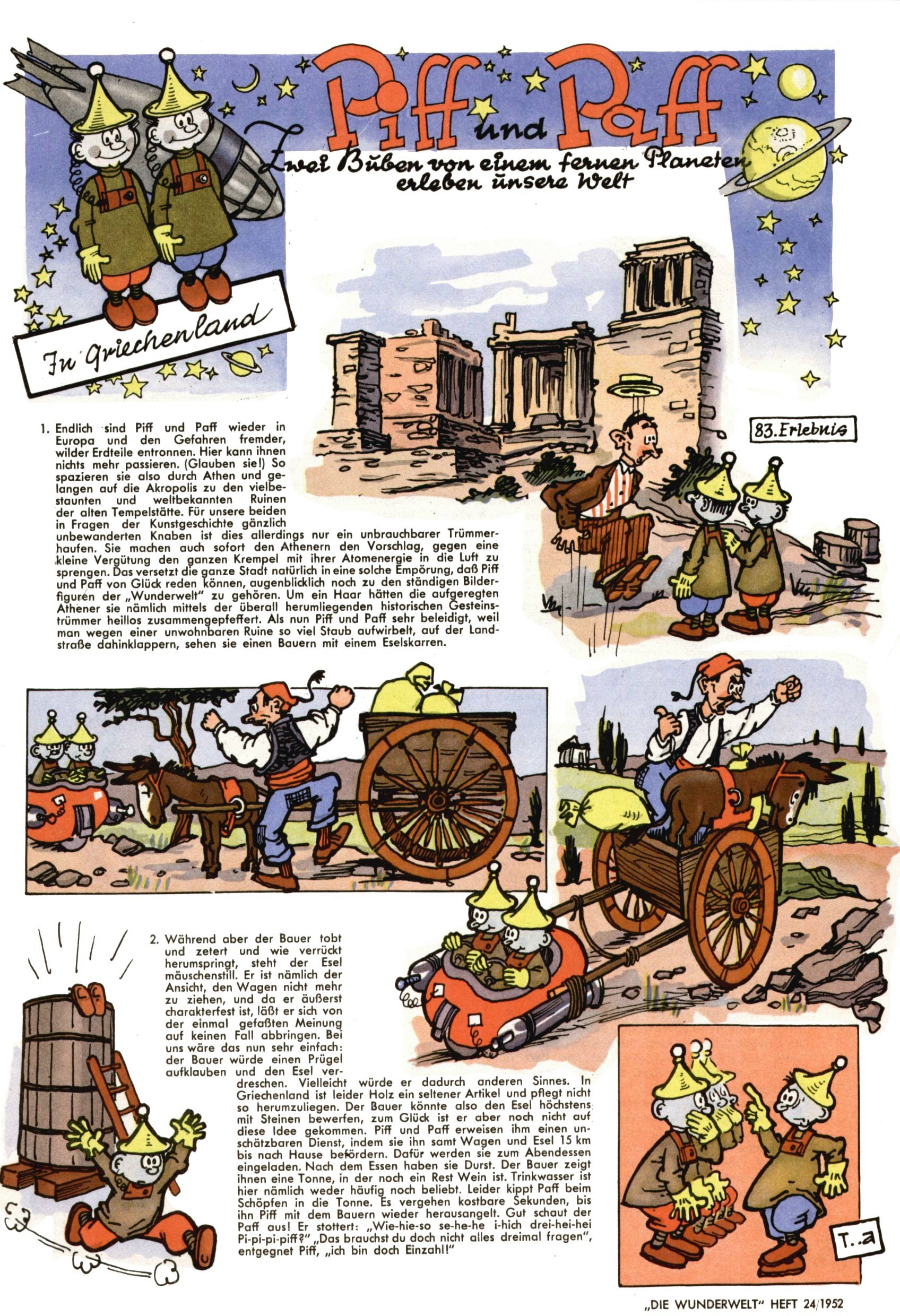 1952 – Der Erfolg hält an Wem Erfolg zuteil wird, der hat wenig Anlass, sein Konzept zu ändern. Und das war in gewisser Weise auch gut so bei allen inhaltlichen Schwächen der Beiträge in der Wunderwelt 1952. Der Erfolg der Zeitung wurde in erster Linie von der grafischen Umsetzung getragen; die lieblichen Bilder einer heilen Märchenwelt ließen über die oft flauen, pädagogisch teilweise sogar fragwürdigen Texte hinwegsehen. Elfriede Vavrovsky schrieb fast alle Texte und Rosl Warzilek zeichnete immer mehr Titelbilder und Mittelmärchen. ABC Peter Paul Prinz hatte Ende 1951 Meister Hokus als komischen Widerpart vom Zauberlehrling Willibald entdeckt und perfektionierte diesen Dualismus nun immer mehr. Meister Hokus avancierte zur regelmäßigen Lachnummer. Dafür überließ ABC vorübergehend Teja Aicher die Gestaltung der technischen Seite, dessen Zwerg Bumsti ebenfalls bereits untrennbar mit der Wunderwelt verbunden schien und längst zum Markenzeichen aufgestiegen war. Seine ko(s)mischen Superhelden Piff und Paff hatten jedoch allmählich genug von den Menschen und kehrten der Erde den Rücken zu. Für den Einsatz im Schulunterricht wurden weiterhin von Elfriede Vavrovsky erstellte politische und geografische Daten und Karten gedruckt, was gerne angenommen wurde, denn teure Atlanten gab es 1952 noch wenige, als viele politische Grenzen gar nicht endgültig geklärt schienen. |