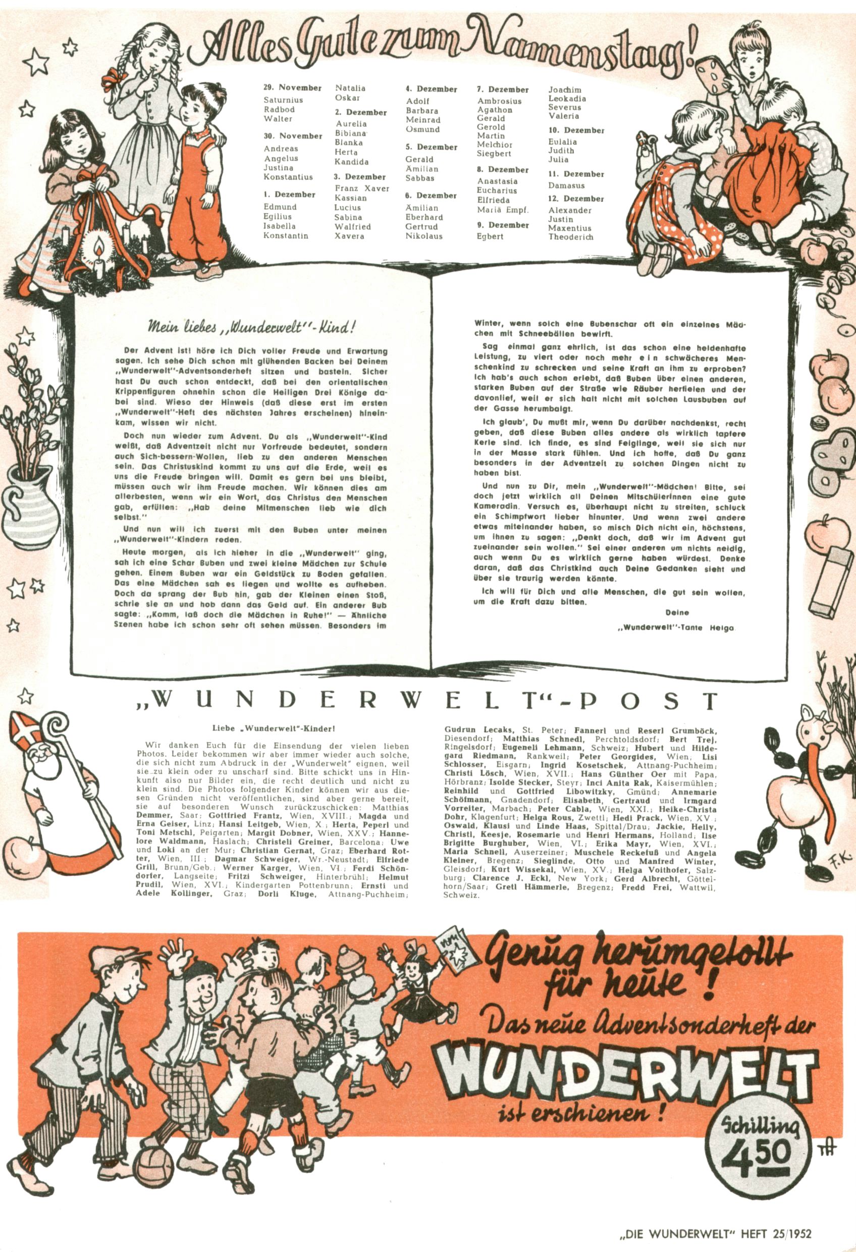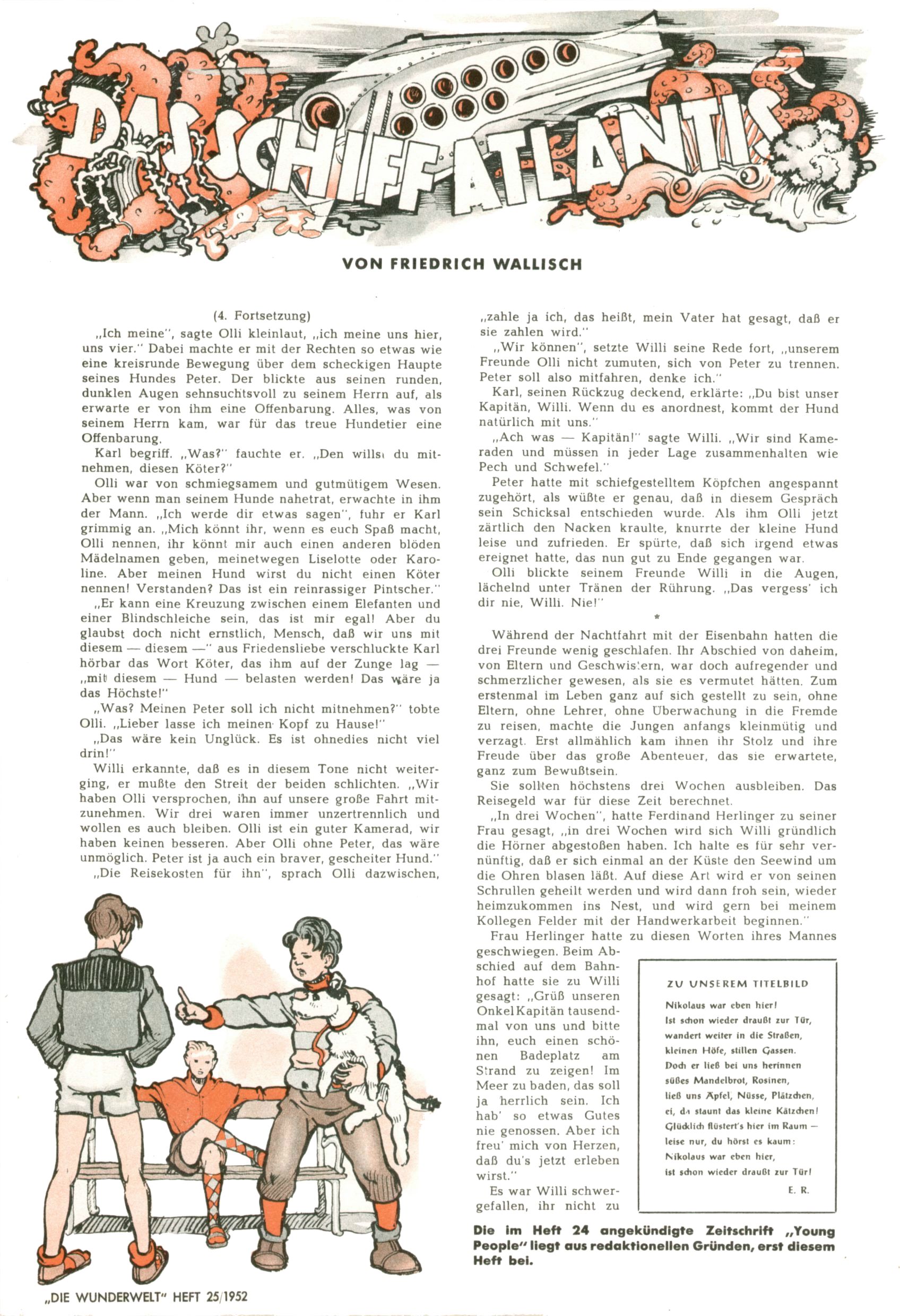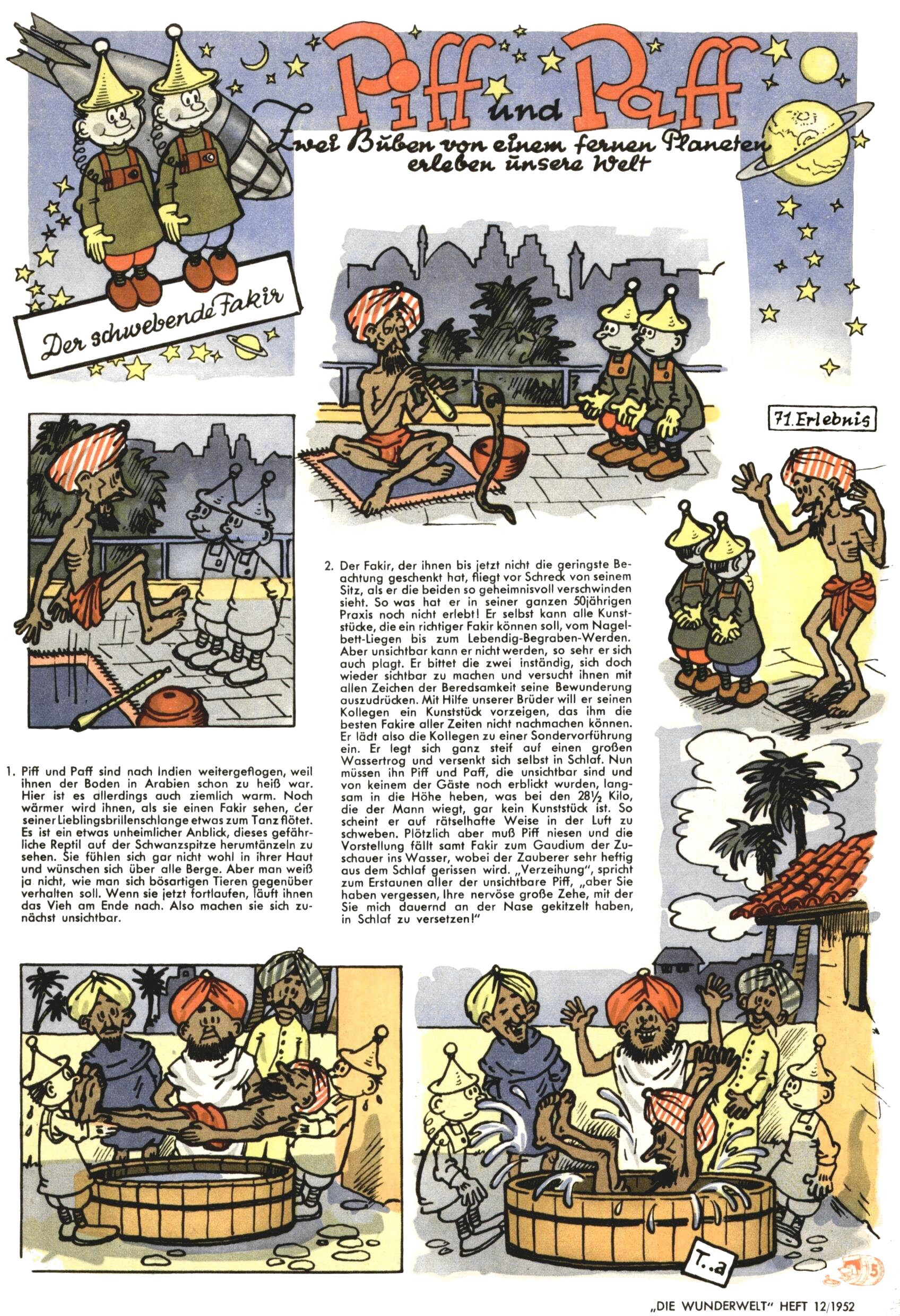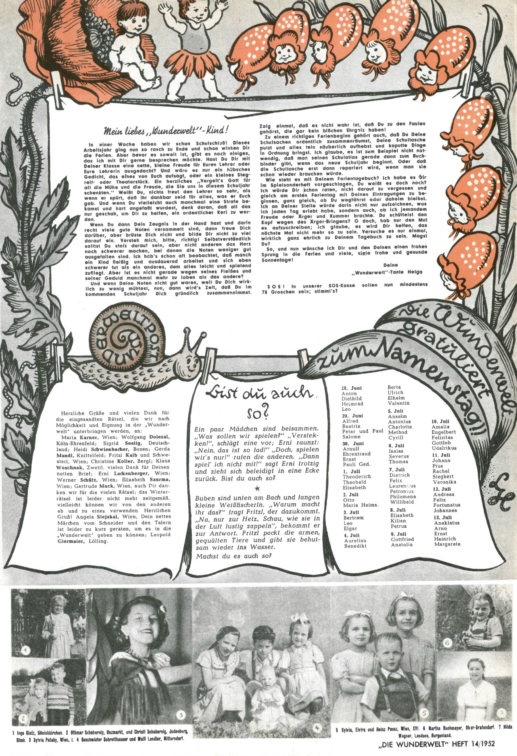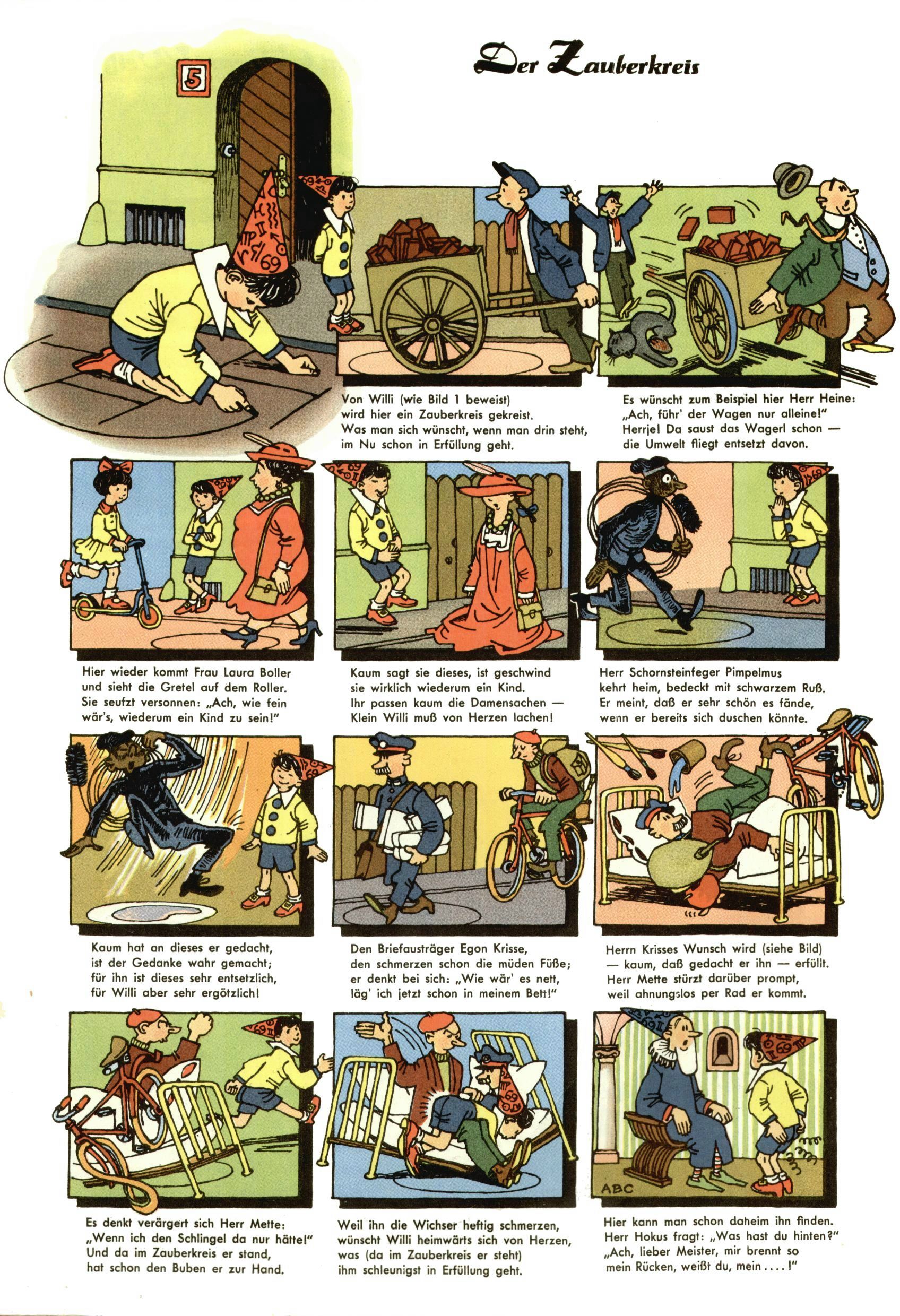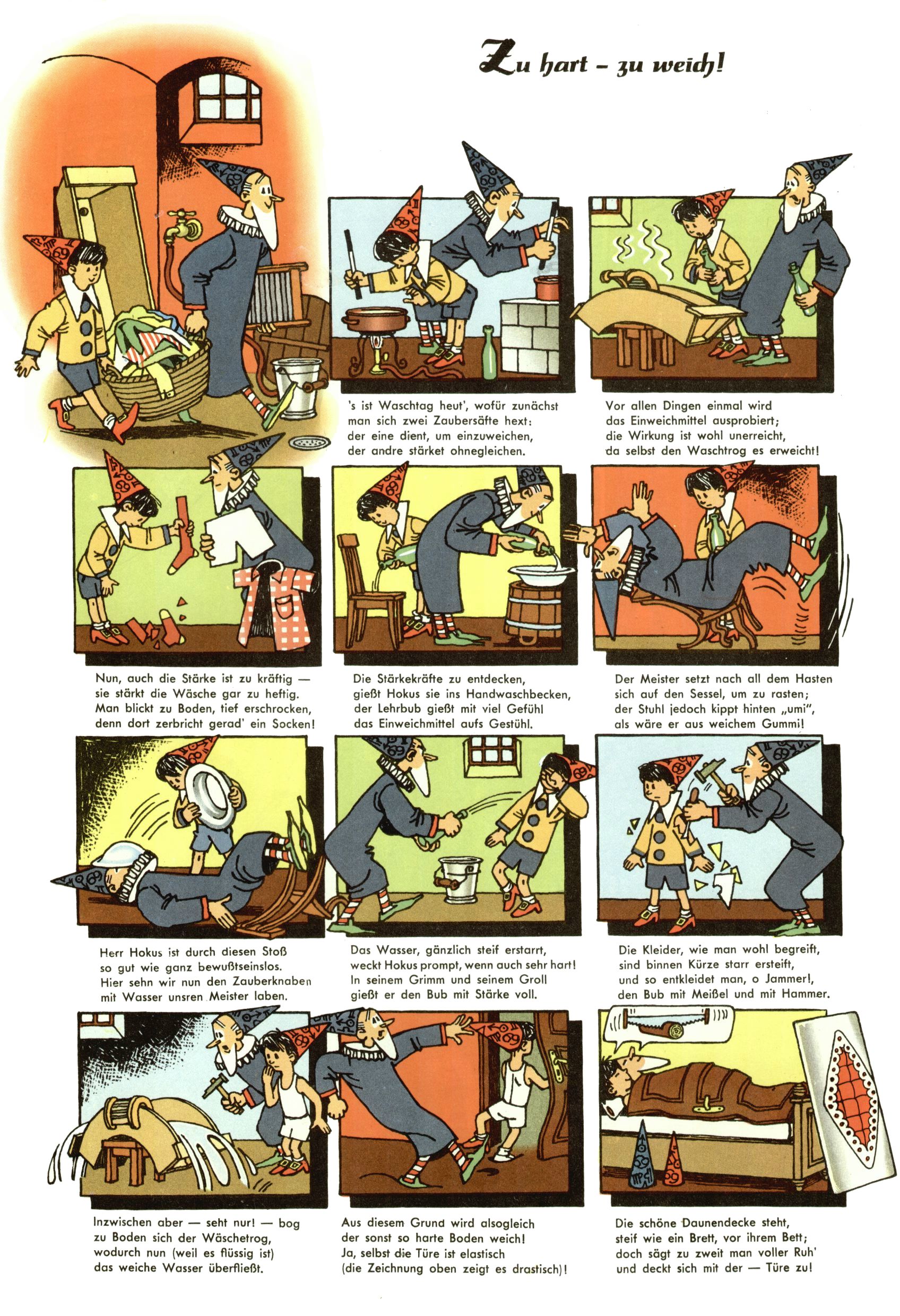 1952 – Der Erfolg hält an Wem Erfolg zuteil wird, der hat wenig Anlass, sein Konzept zu ändern. Und das war in gewisser Weise auch gut so bei allen inhaltlichen Schwächen der Beiträge in der Wunderwelt 1952. Der Erfolg der Zeitung wurde in erster Linie von der grafischen Umsetzung getragen; die lieblichen Bilder einer heilen Märchenwelt ließen über die oft flauen, pädagogisch teilweise sogar fragwürdigen Texte hinwegsehen. Elfriede Vavrovsky schrieb fast alle Texte und Rosl Warzilek zeichnete immer mehr Titelbilder und Mittelmärchen. ABC Peter Paul Prinz hatte Ende 1951 Meister Hokus als komischen Widerpart vom Zauberlehrling Willibald entdeckt und perfektionierte diesen Dualismus nun immer mehr. Meister Hokus avancierte zur regelmäßigen Lachnummer. Dafür überließ ABC vorübergehend Teja Aicher die Gestaltung der technischen Seite, dessen Zwerg Bumsti ebenfalls bereits untrennbar mit der Wunderwelt verbunden schien und längst zum Markenzeichen aufgestiegen war. Seine ko(s)mischen Superhelden Piff und Paff hatten jedoch allmählich genug von den Menschen und kehrten der Erde den Rücken zu. Für den Einsatz im Schulunterricht wurden weiterhin von Elfriede Vavrovsky erstellte politische und geografische Daten und Karten gedruckt, was gerne angenommen wurde, denn teure Atlanten gab es 1952 noch wenige, als viele politische Grenzen gar nicht endgültig geklärt schienen. |