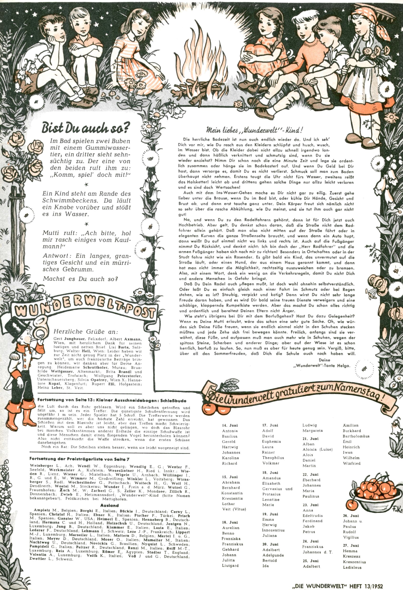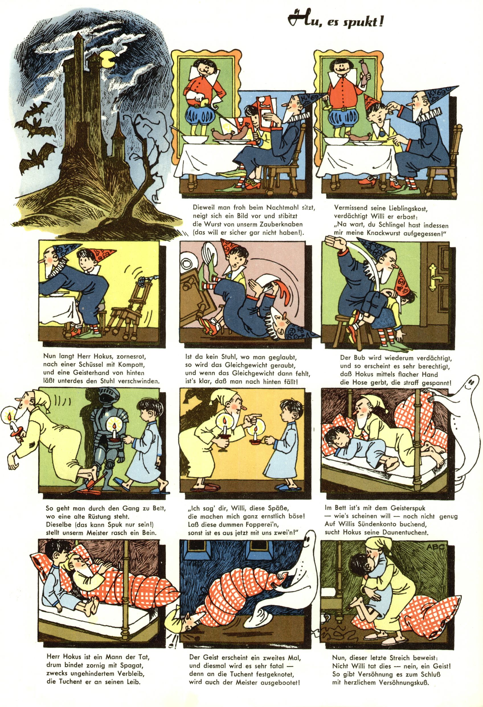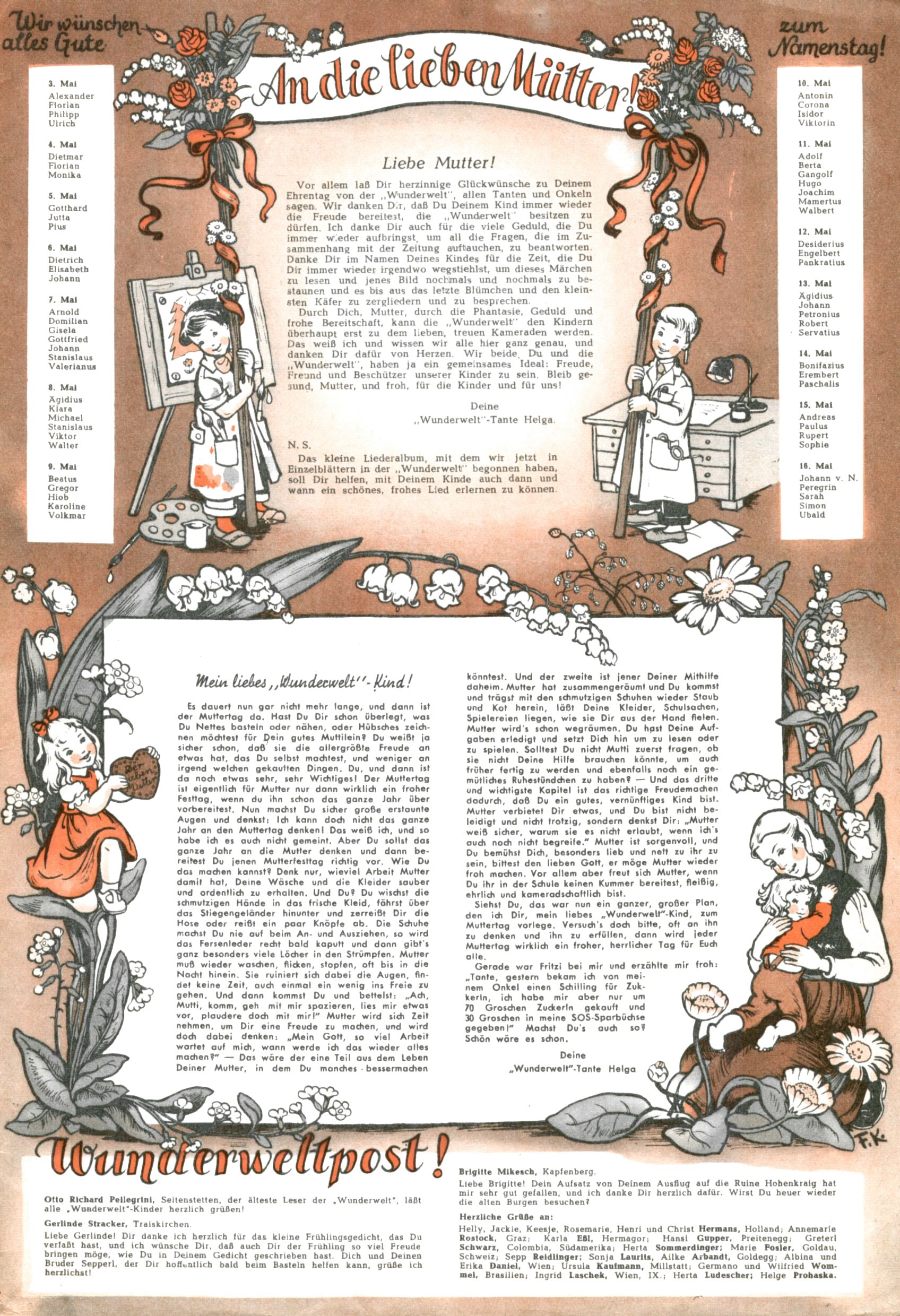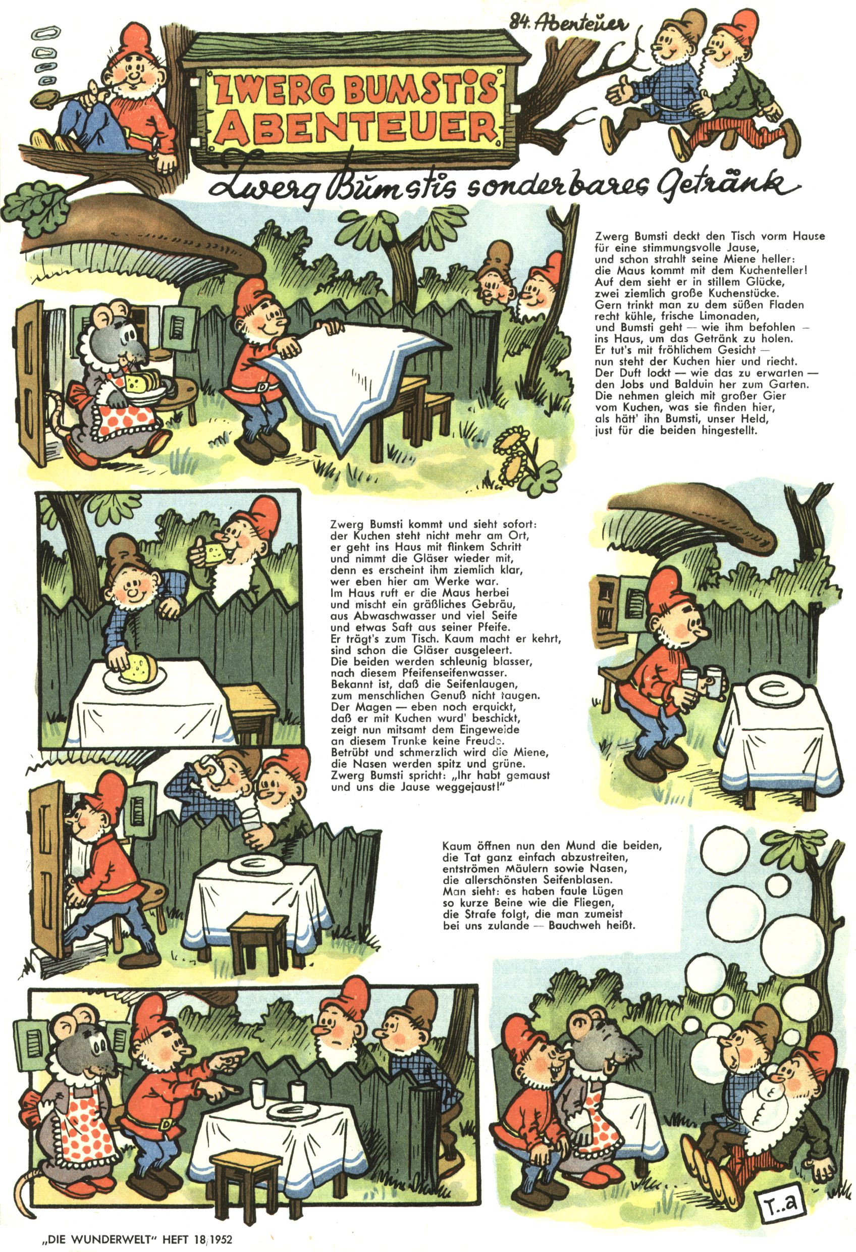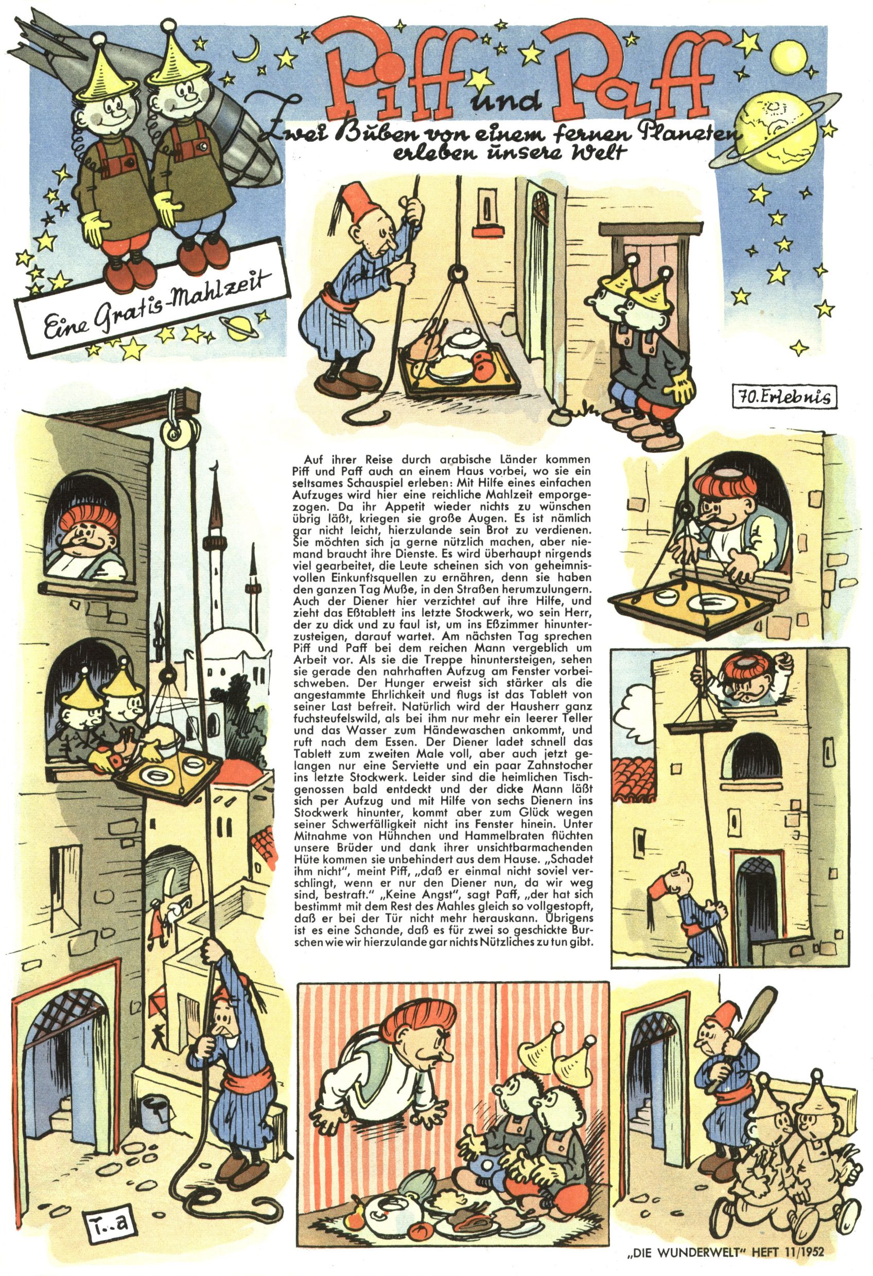 1952 – Der Erfolg hält an Wem Erfolg zuteil wird, der hat wenig Anlass, sein Konzept zu ändern. Und das war in gewisser Weise auch gut so bei allen inhaltlichen Schwächen der Beiträge in der Wunderwelt 1952. Der Erfolg der Zeitung wurde in erster Linie von der grafischen Umsetzung getragen; die lieblichen Bilder einer heilen Märchenwelt ließen über die oft flauen, pädagogisch teilweise sogar fragwürdigen Texte hinwegsehen. Elfriede Vavrovsky schrieb fast alle Texte und Rosl Warzilek zeichnete immer mehr Titelbilder und Mittelmärchen. ABC Peter Paul Prinz hatte Ende 1951 Meister Hokus als komischen Widerpart vom Zauberlehrling Willibald entdeckt und perfektionierte diesen Dualismus nun immer mehr. Meister Hokus avancierte zur regelmäßigen Lachnummer. Dafür überließ ABC vorübergehend Teja Aicher die Gestaltung der technischen Seite, dessen Zwerg Bumsti ebenfalls bereits untrennbar mit der Wunderwelt verbunden schien und längst zum Markenzeichen aufgestiegen war. Seine ko(s)mischen Superhelden Piff und Paff hatten jedoch allmählich genug von den Menschen und kehrten der Erde den Rücken zu. Für den Einsatz im Schulunterricht wurden weiterhin von Elfriede Vavrovsky erstellte politische und geografische Daten und Karten gedruckt, was gerne angenommen wurde, denn teure Atlanten gab es 1952 noch wenige, als viele politische Grenzen gar nicht endgültig geklärt schienen. |