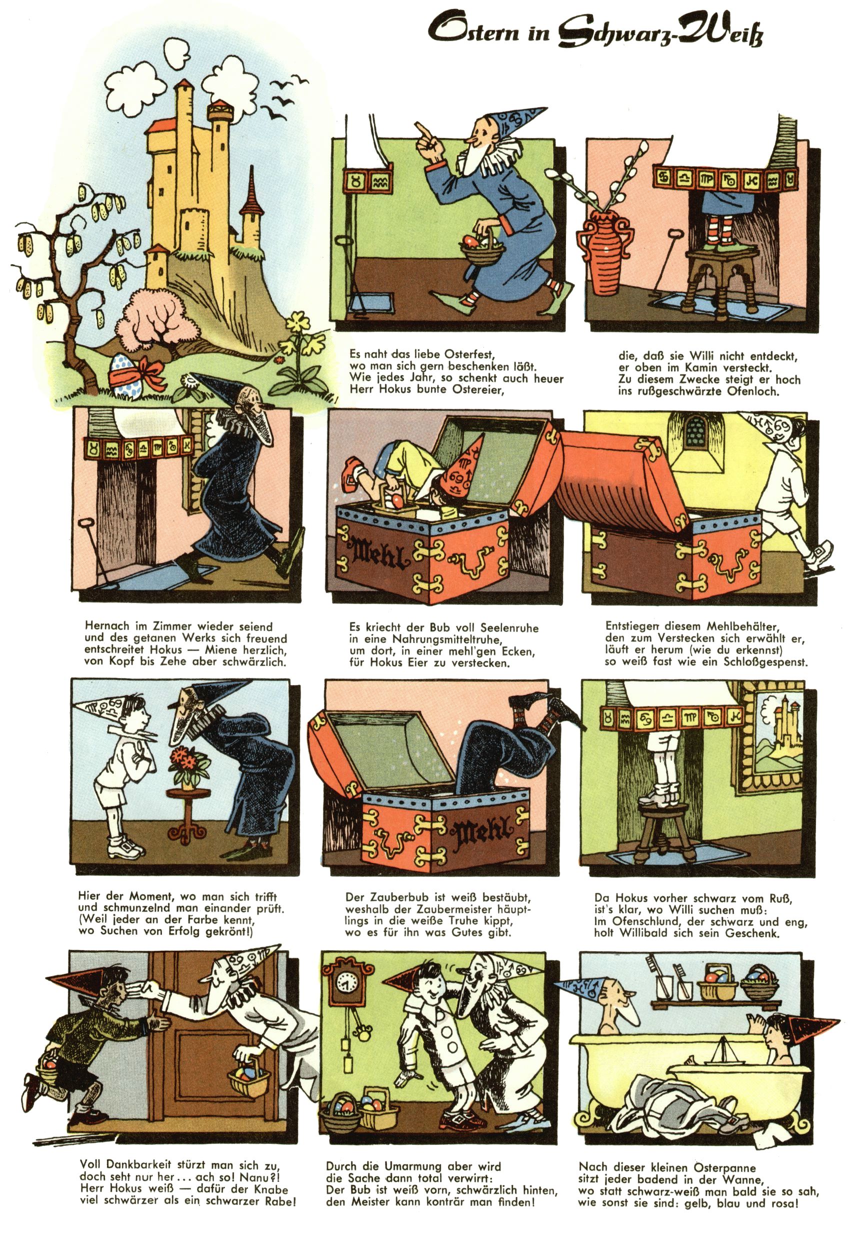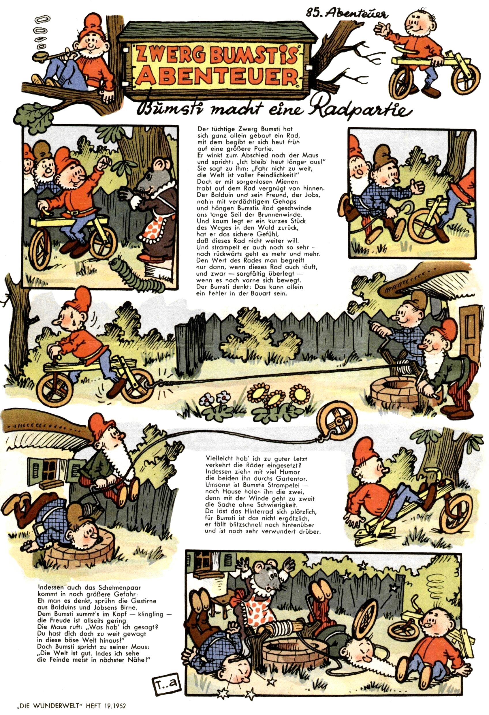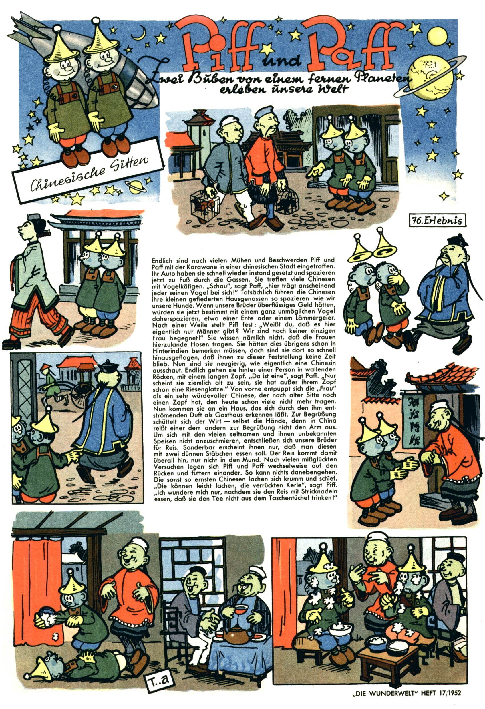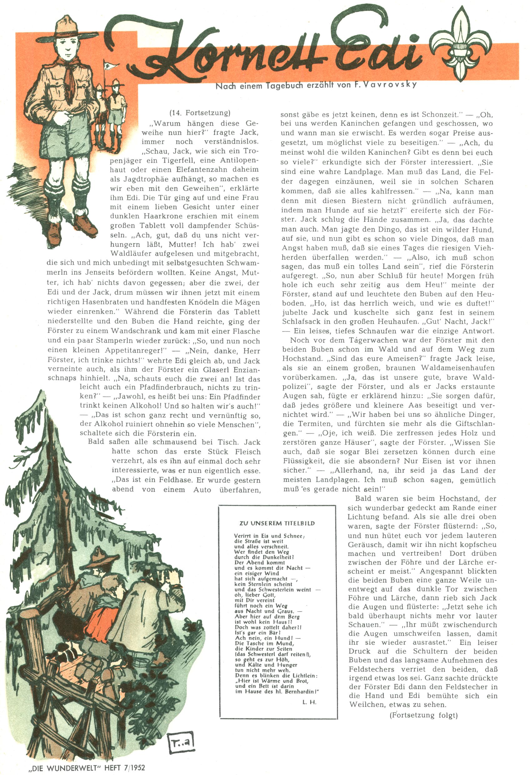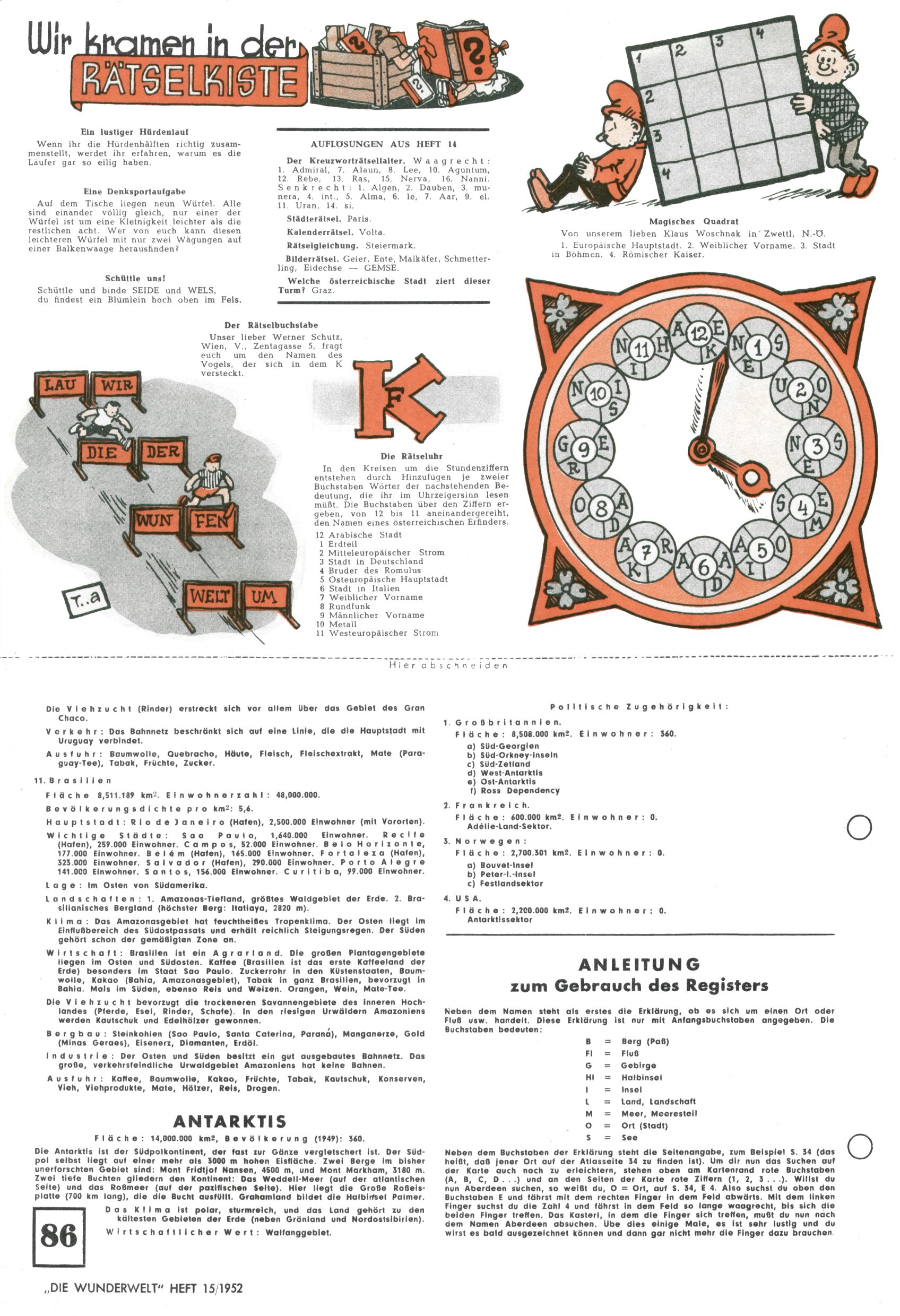 1952 – Der Erfolg hält an Wem Erfolg zuteil wird, der hat wenig Anlass, sein Konzept zu ändern. Und das war in gewisser Weise auch gut so bei allen inhaltlichen Schwächen der Beiträge in der Wunderwelt 1952. Der Erfolg der Zeitung wurde in erster Linie von der grafischen Umsetzung getragen; die lieblichen Bilder einer heilen Märchenwelt ließen über die oft flauen, pädagogisch teilweise sogar fragwürdigen Texte hinwegsehen. Elfriede Vavrovsky schrieb fast alle Texte und Rosl Warzilek zeichnete immer mehr Titelbilder und Mittelmärchen. ABC Peter Paul Prinz hatte Ende 1951 Meister Hokus als komischen Widerpart vom Zauberlehrling Willibald entdeckt und perfektionierte diesen Dualismus nun immer mehr. Meister Hokus avancierte zur regelmäßigen Lachnummer. Dafür überließ ABC vorübergehend Teja Aicher die Gestaltung der technischen Seite, dessen Zwerg Bumsti ebenfalls bereits untrennbar mit der Wunderwelt verbunden schien und längst zum Markenzeichen aufgestiegen war. Seine ko(s)mischen Superhelden Piff und Paff hatten jedoch allmählich genug von den Menschen und kehrten der Erde den Rücken zu. Für den Einsatz im Schulunterricht wurden weiterhin von Elfriede Vavrovsky erstellte politische und geografische Daten und Karten gedruckt, was gerne angenommen wurde, denn teure Atlanten gab es 1952 noch wenige, als viele politische Grenzen gar nicht endgültig geklärt schienen. |