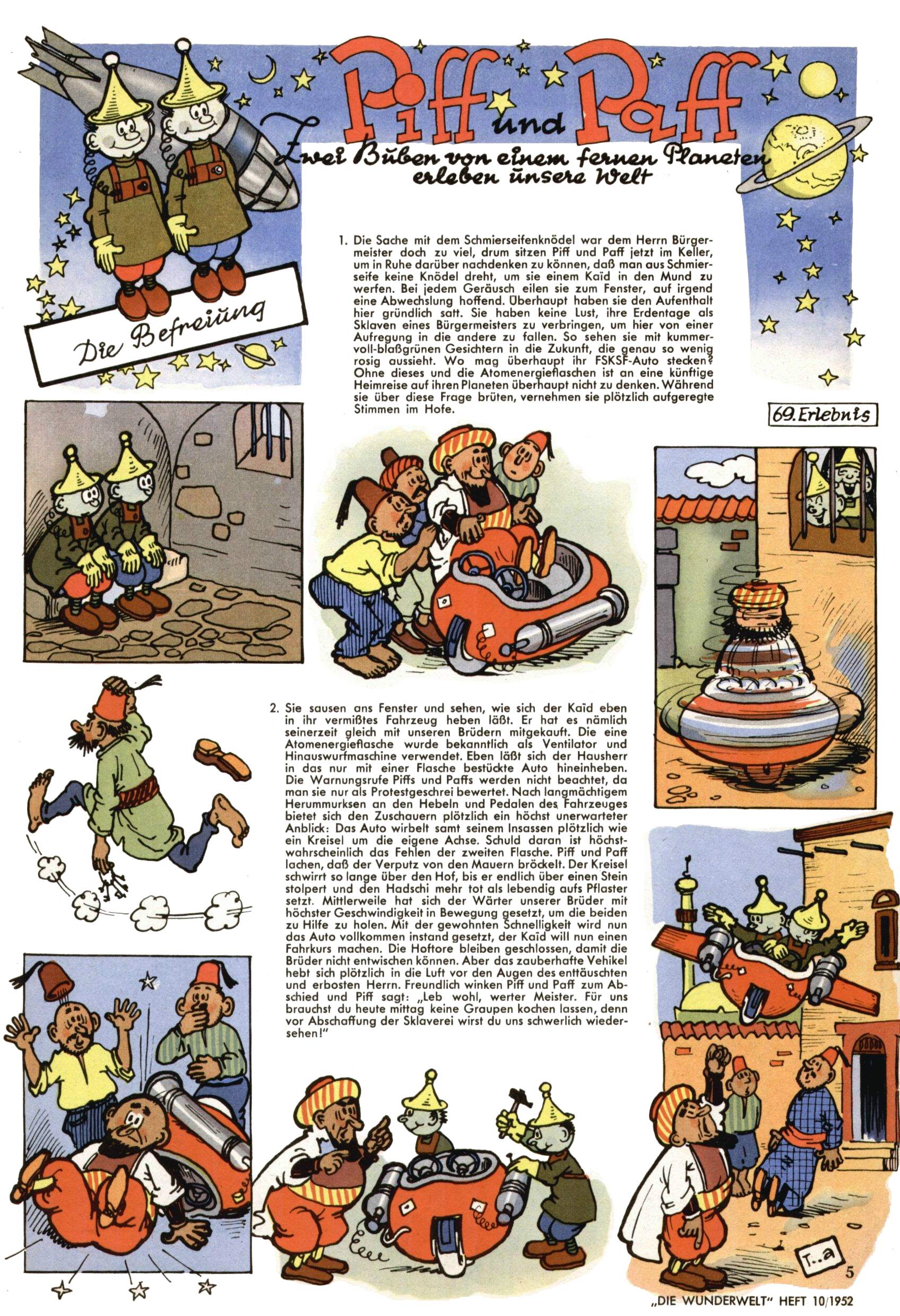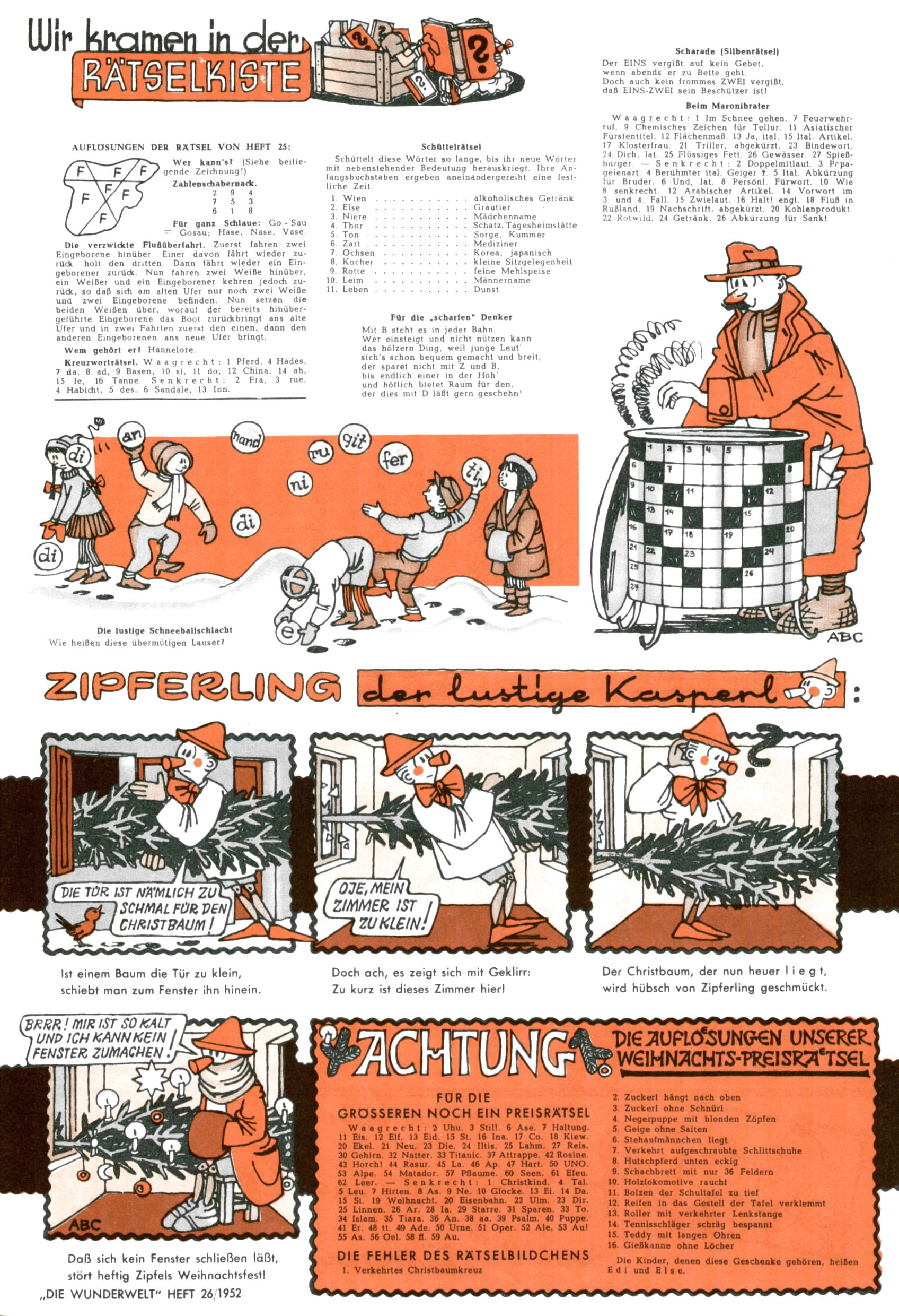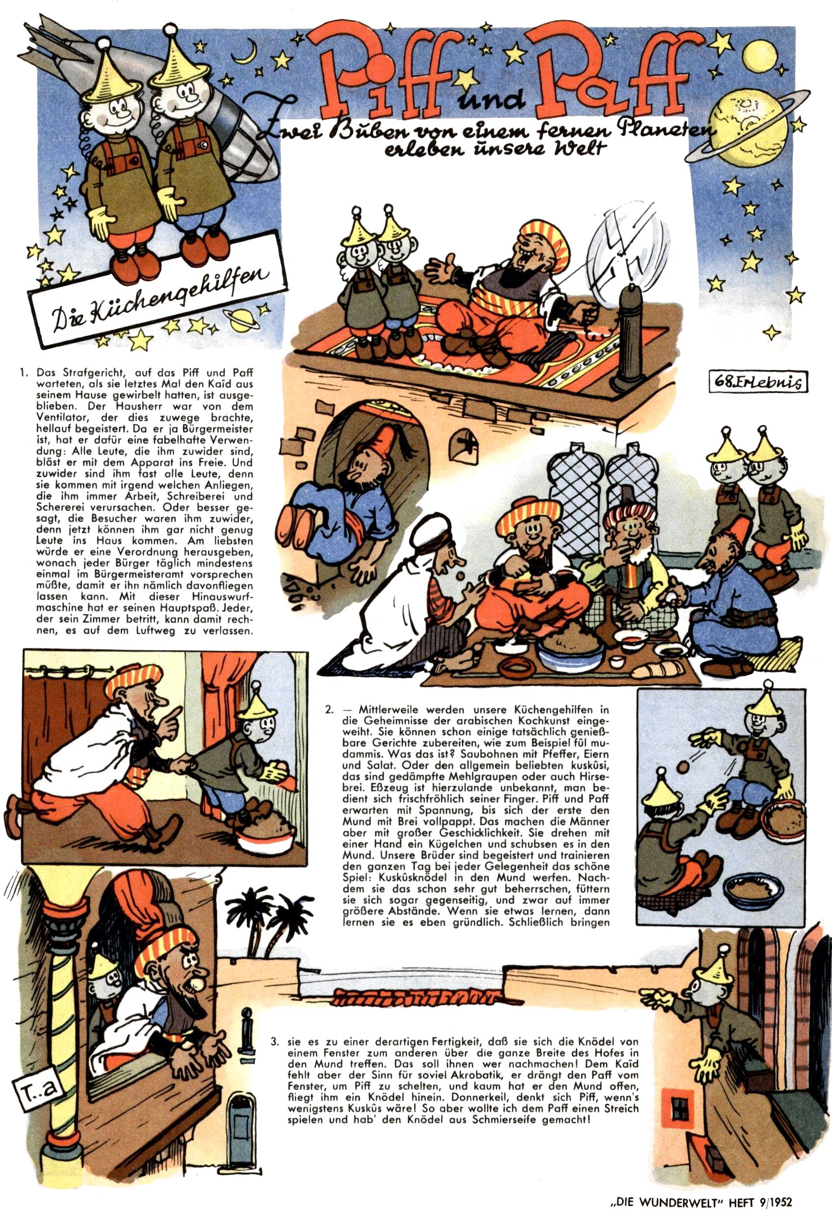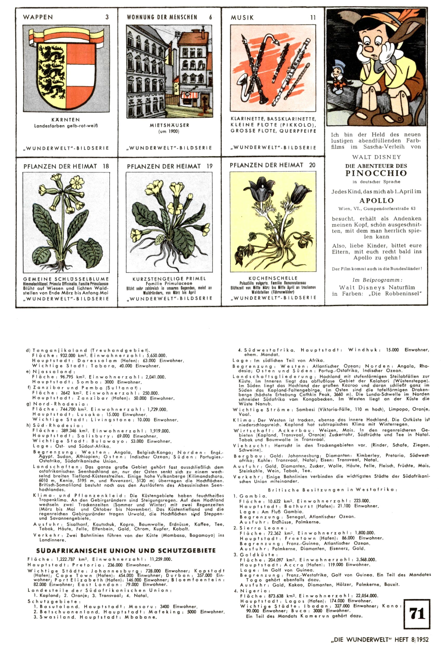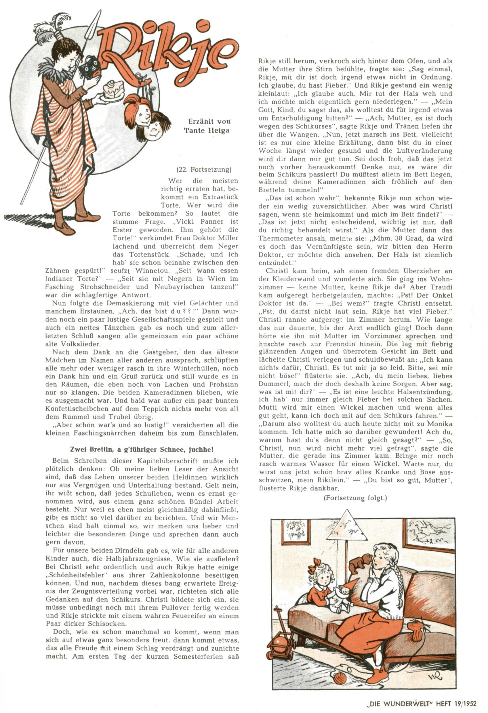 1952 – Der Erfolg hält an Wem Erfolg zuteil wird, der hat wenig Anlass, sein Konzept zu ändern. Und das war in gewisser Weise auch gut so bei allen inhaltlichen Schwächen der Beiträge in der Wunderwelt 1952. Der Erfolg der Zeitung wurde in erster Linie von der grafischen Umsetzung getragen; die lieblichen Bilder einer heilen Märchenwelt ließen über die oft flauen, pädagogisch teilweise sogar fragwürdigen Texte hinwegsehen. Elfriede Vavrovsky schrieb fast alle Texte und Rosl Warzilek zeichnete immer mehr Titelbilder und Mittelmärchen. ABC Peter Paul Prinz hatte Ende 1951 Meister Hokus als komischen Widerpart vom Zauberlehrling Willibald entdeckt und perfektionierte diesen Dualismus nun immer mehr. Meister Hokus avancierte zur regelmäßigen Lachnummer. Dafür überließ ABC vorübergehend Teja Aicher die Gestaltung der technischen Seite, dessen Zwerg Bumsti ebenfalls bereits untrennbar mit der Wunderwelt verbunden schien und längst zum Markenzeichen aufgestiegen war. Seine ko(s)mischen Superhelden Piff und Paff hatten jedoch allmählich genug von den Menschen und kehrten der Erde den Rücken zu. Für den Einsatz im Schulunterricht wurden weiterhin von Elfriede Vavrovsky erstellte politische und geografische Daten und Karten gedruckt, was gerne angenommen wurde, denn teure Atlanten gab es 1952 noch wenige, als viele politische Grenzen gar nicht endgültig geklärt schienen. |