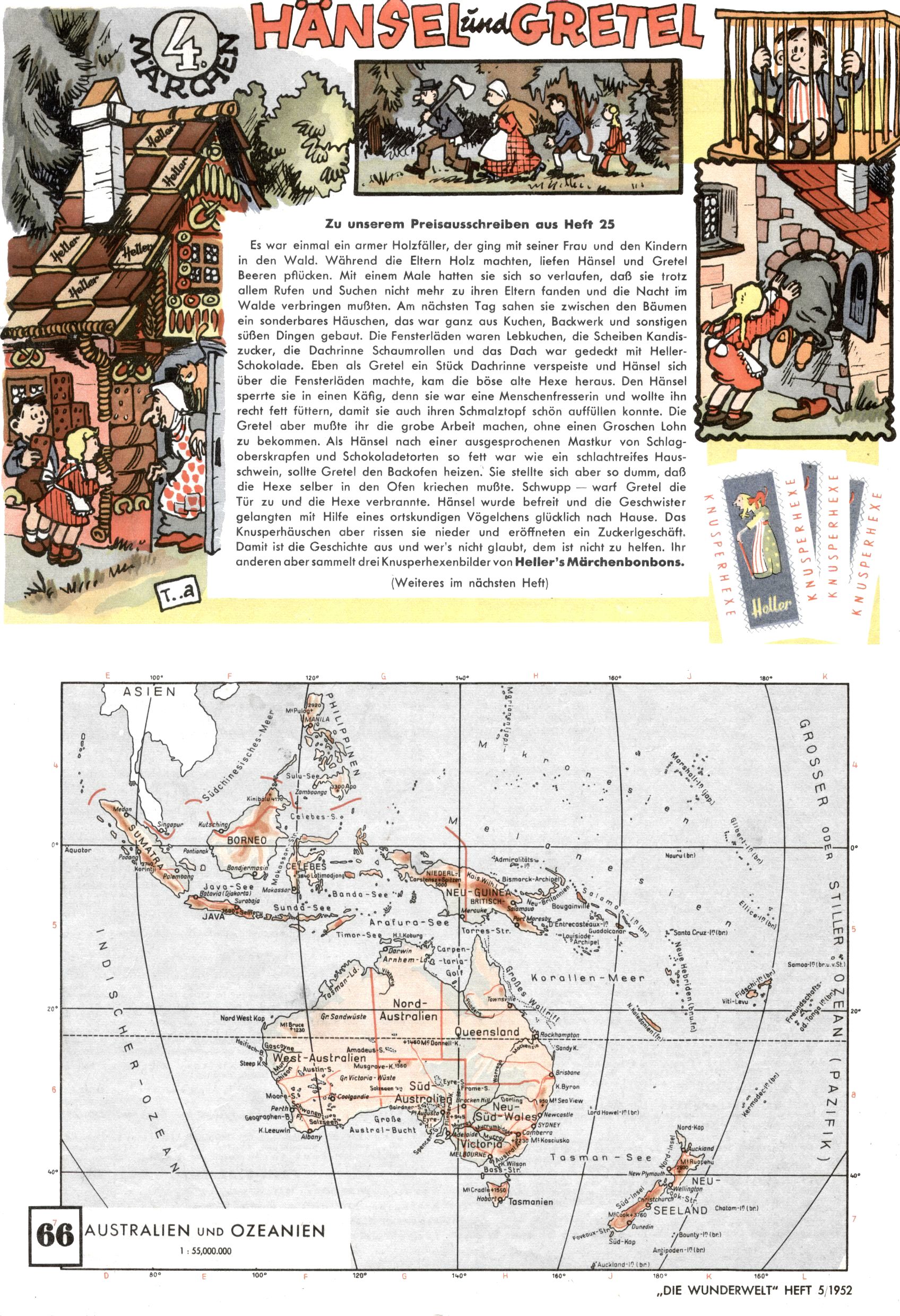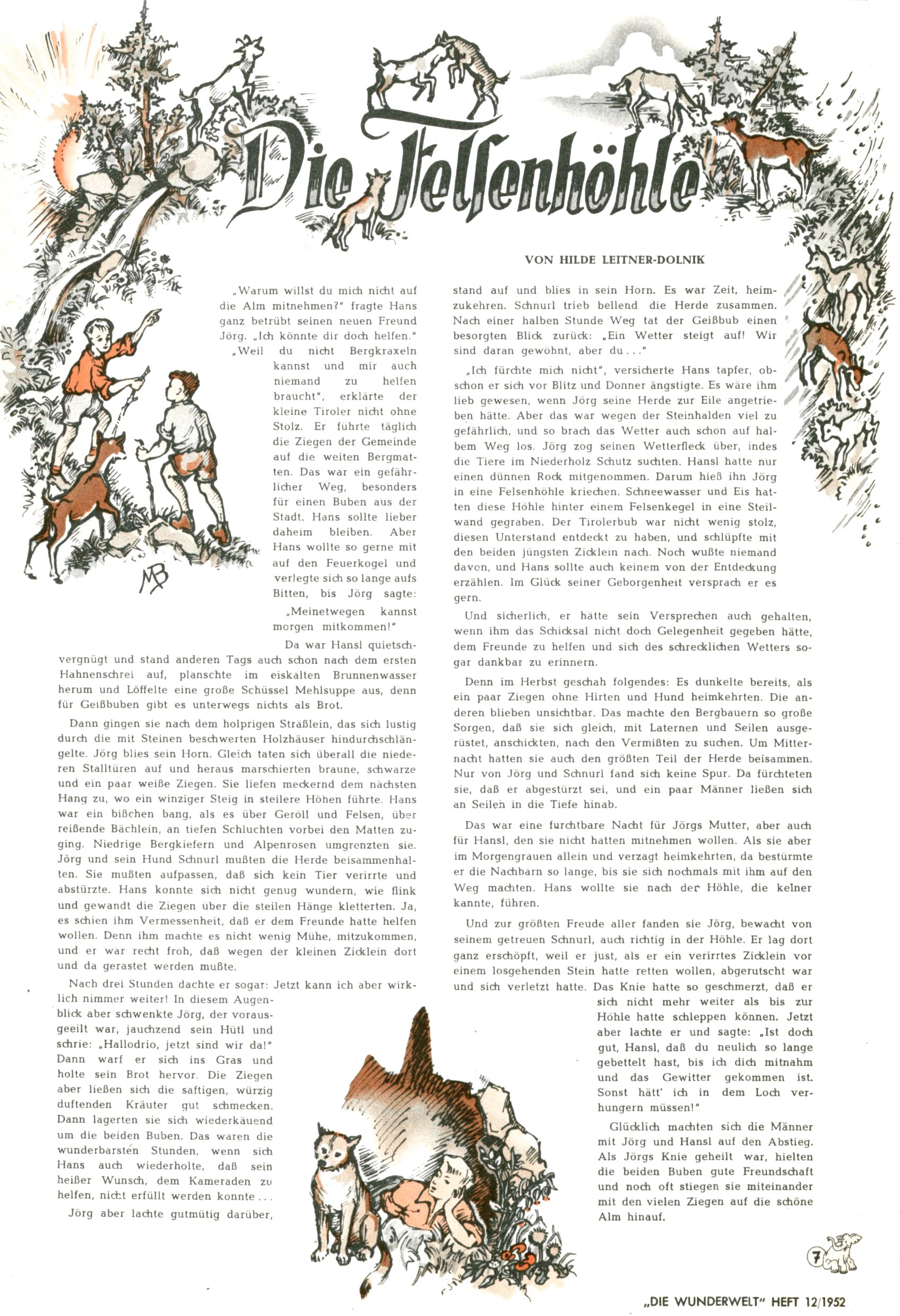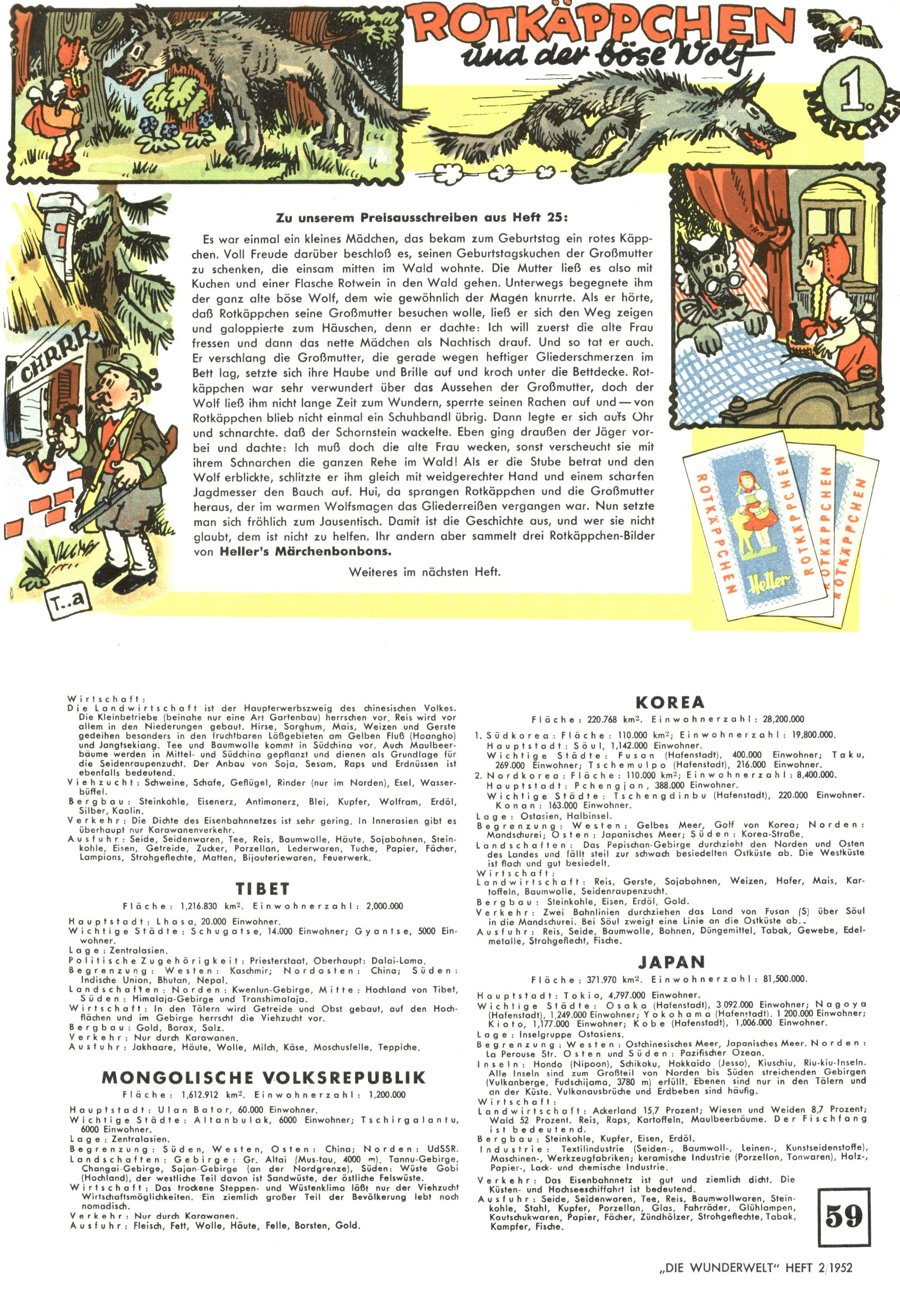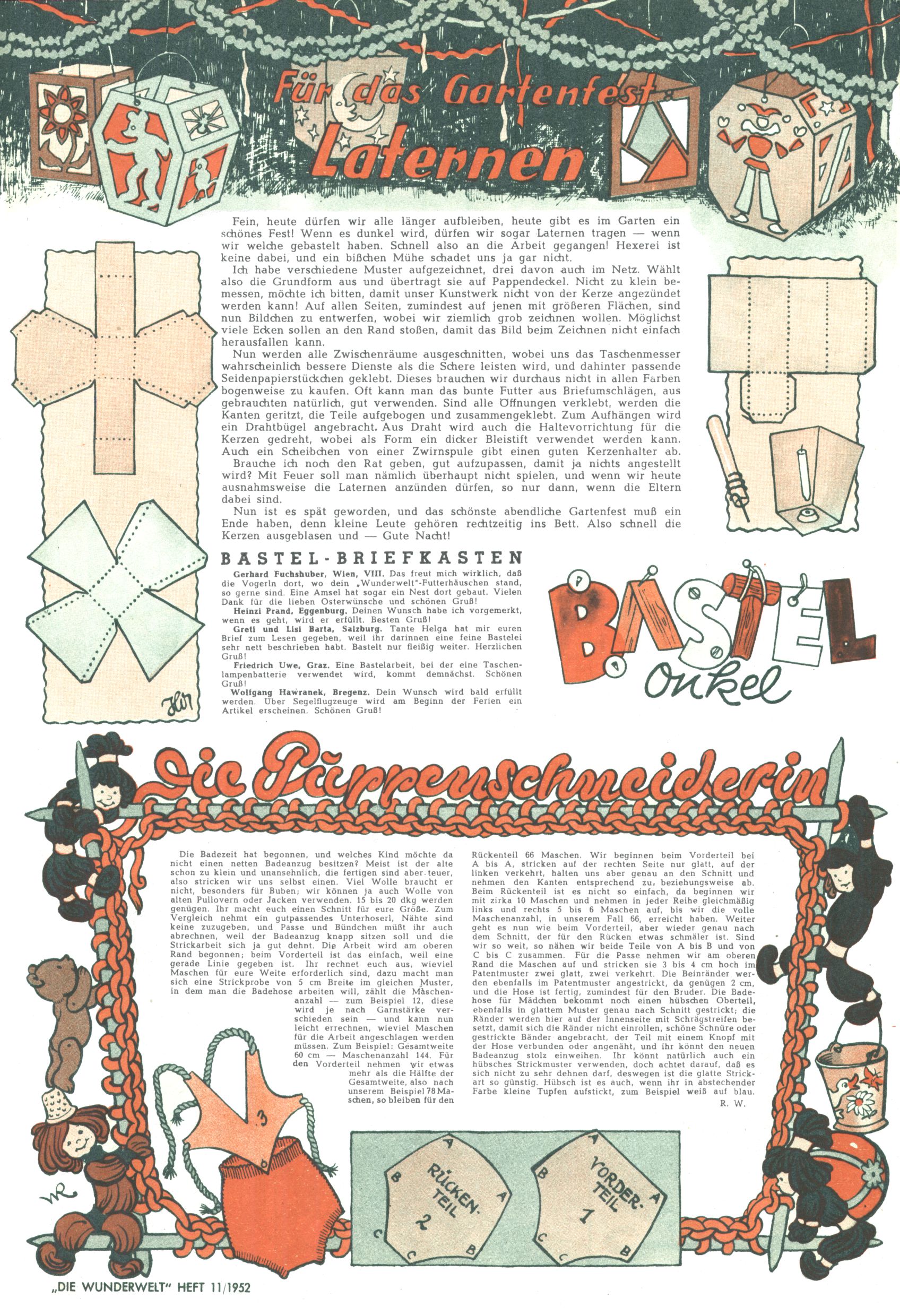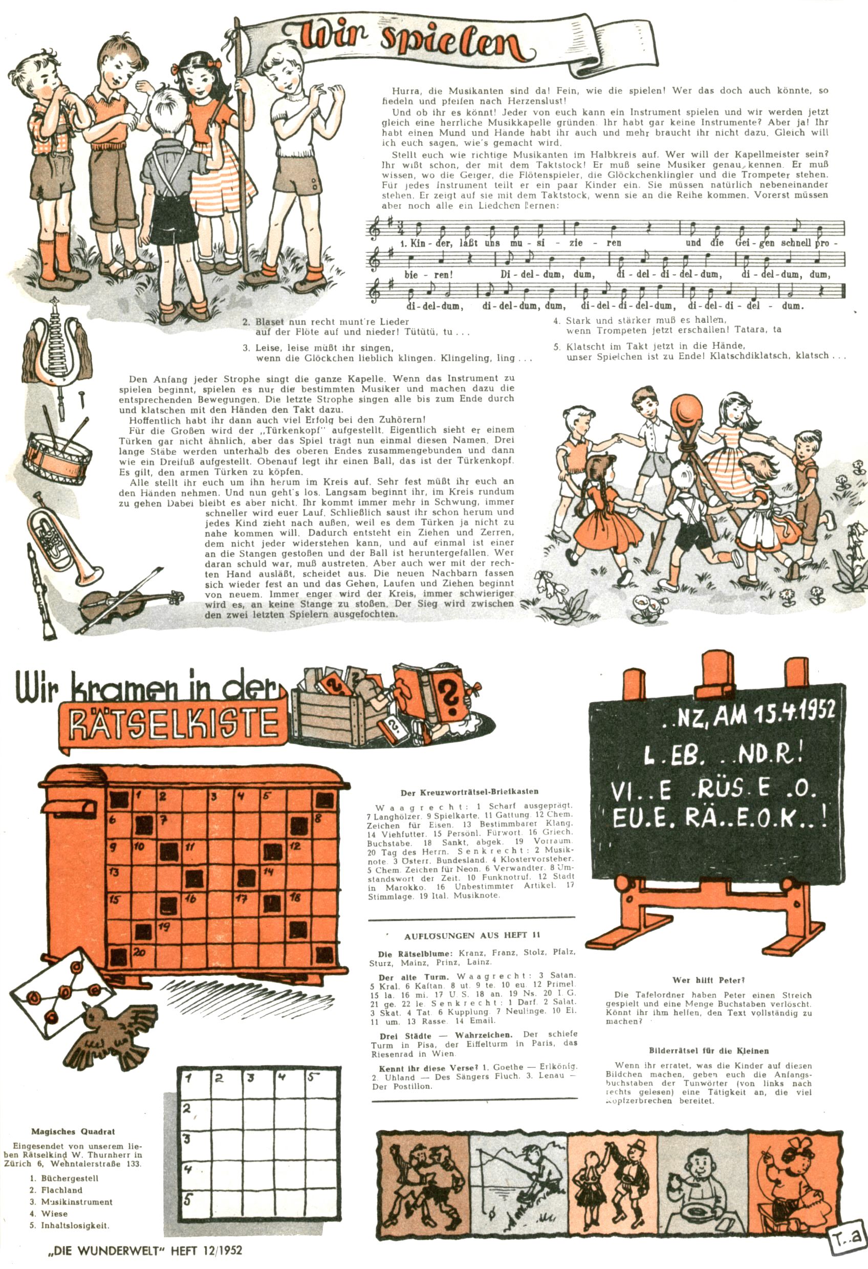 1952 – Der Erfolg hält an Wem Erfolg zuteil wird, der hat wenig Anlass, sein Konzept zu ändern. Und das war in gewisser Weise auch gut so bei allen inhaltlichen Schwächen der Beiträge in der Wunderwelt 1952. Der Erfolg der Zeitung wurde in erster Linie von der grafischen Umsetzung getragen; die lieblichen Bilder einer heilen Märchenwelt ließen über die oft flauen, pädagogisch teilweise sogar fragwürdigen Texte hinwegsehen. Elfriede Vavrovsky schrieb fast alle Texte und Rosl Warzilek zeichnete immer mehr Titelbilder und Mittelmärchen. ABC Peter Paul Prinz hatte Ende 1951 Meister Hokus als komischen Widerpart vom Zauberlehrling Willibald entdeckt und perfektionierte diesen Dualismus nun immer mehr. Meister Hokus avancierte zur regelmäßigen Lachnummer. Dafür überließ ABC vorübergehend Teja Aicher die Gestaltung der technischen Seite, dessen Zwerg Bumsti ebenfalls bereits untrennbar mit der Wunderwelt verbunden schien und längst zum Markenzeichen aufgestiegen war. Seine ko(s)mischen Superhelden Piff und Paff hatten jedoch allmählich genug von den Menschen und kehrten der Erde den Rücken zu. Für den Einsatz im Schulunterricht wurden weiterhin von Elfriede Vavrovsky erstellte politische und geografische Daten und Karten gedruckt, was gerne angenommen wurde, denn teure Atlanten gab es 1952 noch wenige, als viele politische Grenzen gar nicht endgültig geklärt schienen. |