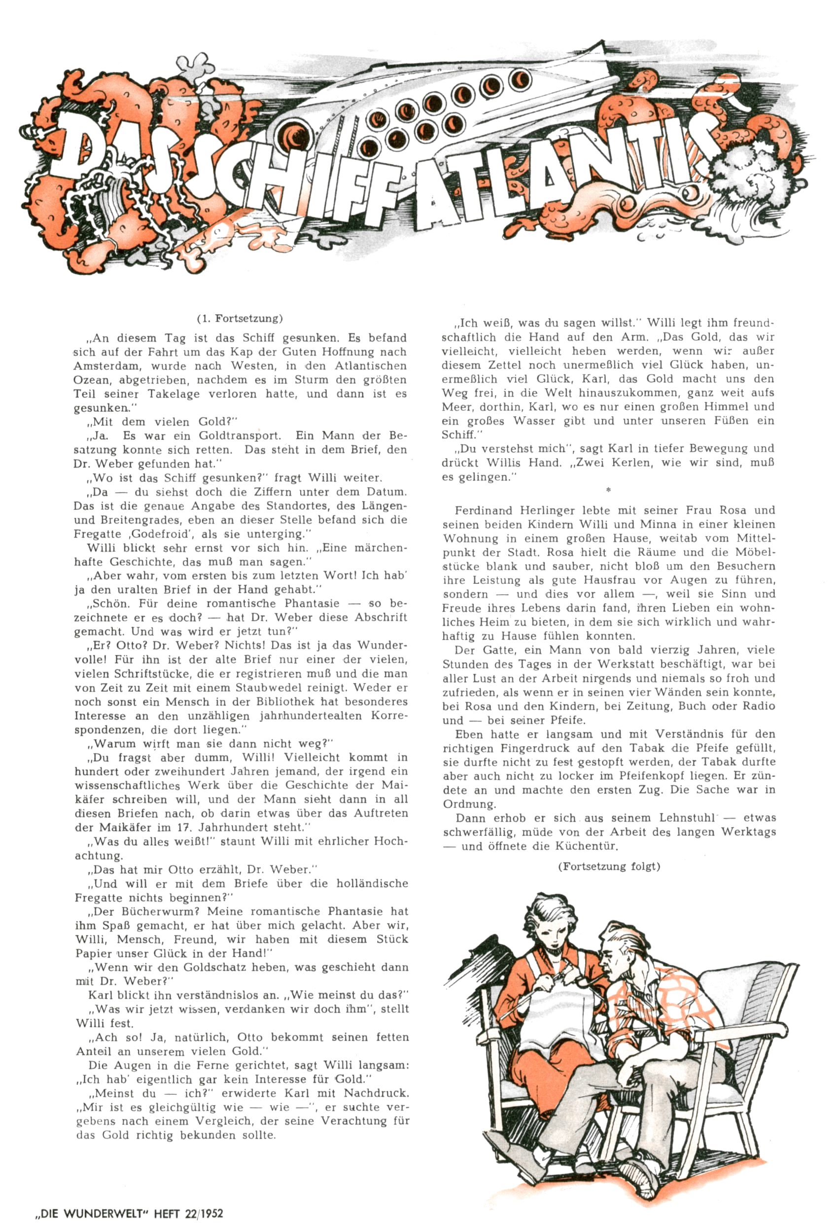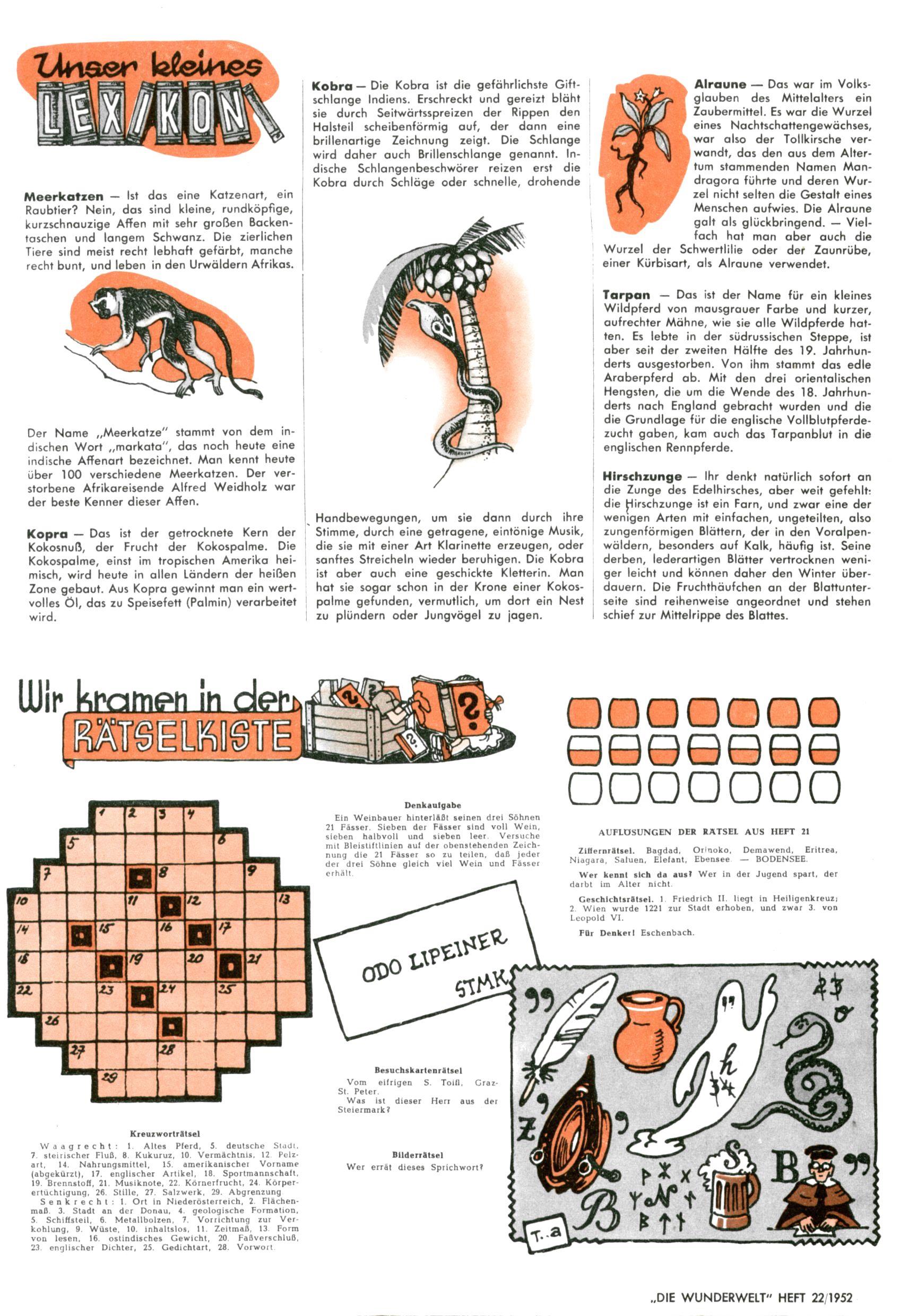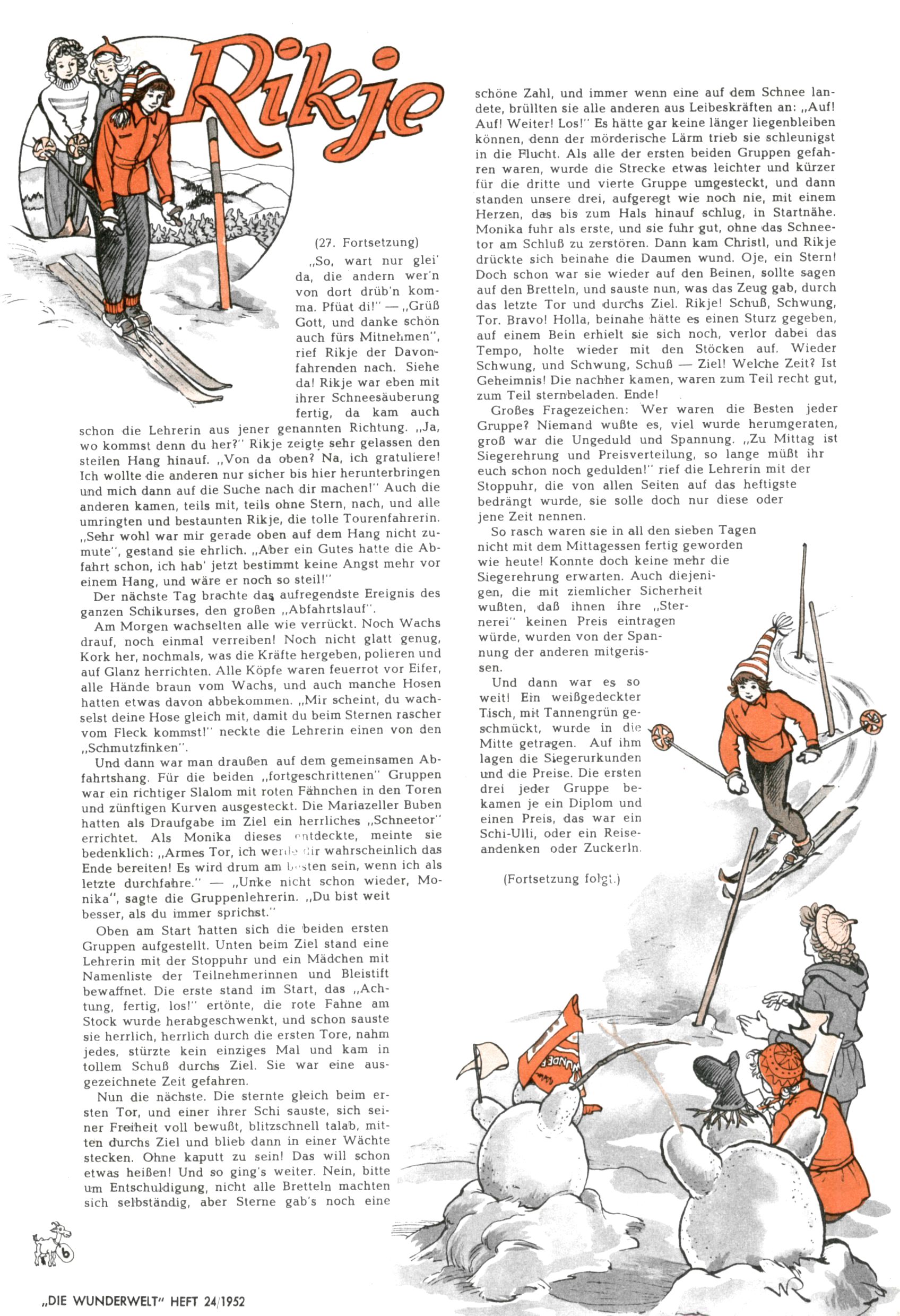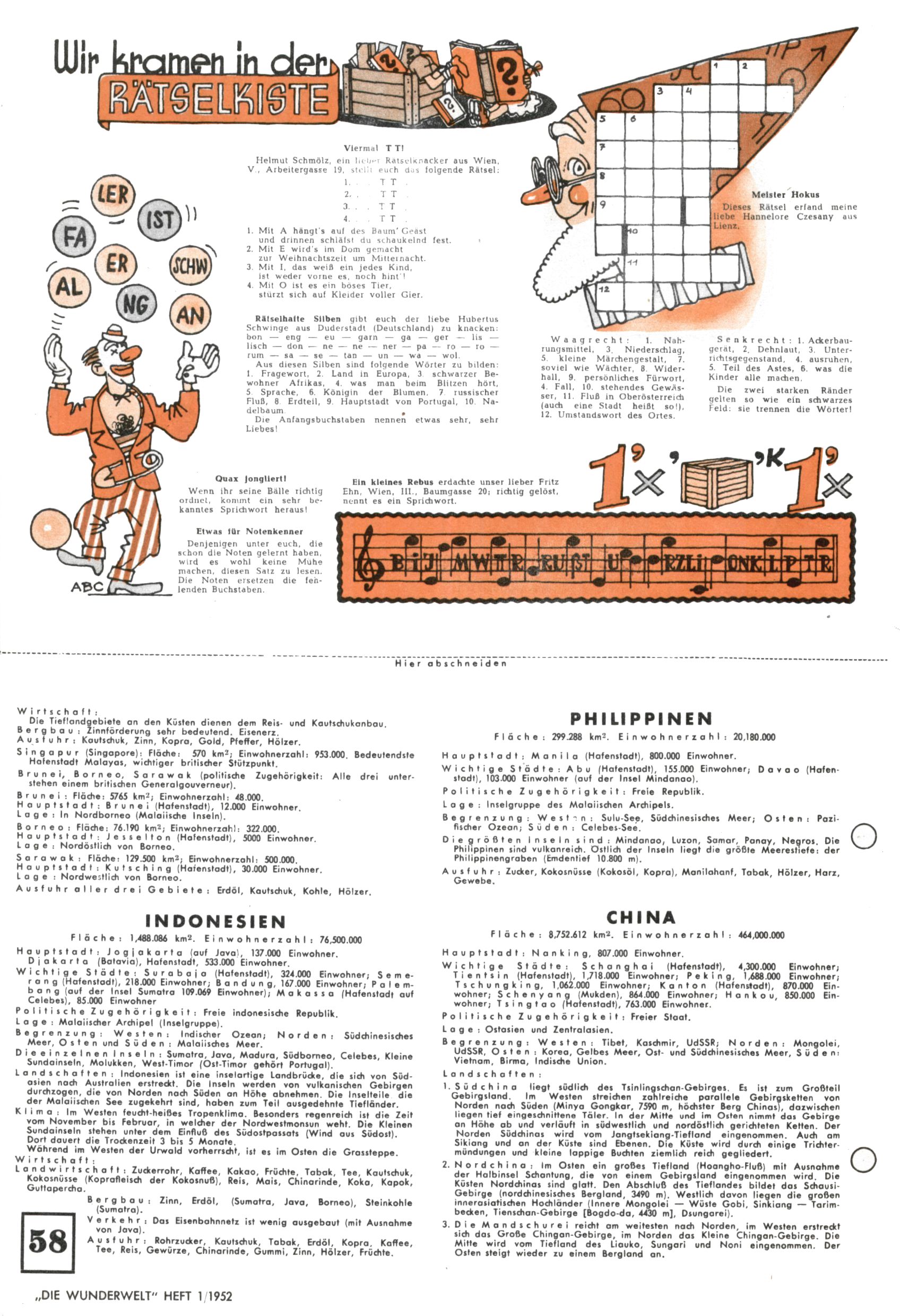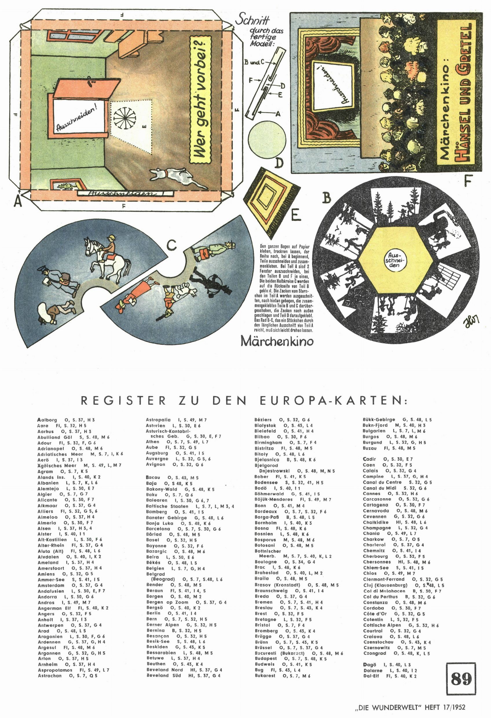 1952 – Der Erfolg hält an Wem Erfolg zuteil wird, der hat wenig Anlass, sein Konzept zu ändern. Und das war in gewisser Weise auch gut so bei allen inhaltlichen Schwächen der Beiträge in der Wunderwelt 1952. Der Erfolg der Zeitung wurde in erster Linie von der grafischen Umsetzung getragen; die lieblichen Bilder einer heilen Märchenwelt ließen über die oft flauen, pädagogisch teilweise sogar fragwürdigen Texte hinwegsehen. Elfriede Vavrovsky schrieb fast alle Texte und Rosl Warzilek zeichnete immer mehr Titelbilder und Mittelmärchen. ABC Peter Paul Prinz hatte Ende 1951 Meister Hokus als komischen Widerpart vom Zauberlehrling Willibald entdeckt und perfektionierte diesen Dualismus nun immer mehr. Meister Hokus avancierte zur regelmäßigen Lachnummer. Dafür überließ ABC vorübergehend Teja Aicher die Gestaltung der technischen Seite, dessen Zwerg Bumsti ebenfalls bereits untrennbar mit der Wunderwelt verbunden schien und längst zum Markenzeichen aufgestiegen war. Seine ko(s)mischen Superhelden Piff und Paff hatten jedoch allmählich genug von den Menschen und kehrten der Erde den Rücken zu. Für den Einsatz im Schulunterricht wurden weiterhin von Elfriede Vavrovsky erstellte politische und geografische Daten und Karten gedruckt, was gerne angenommen wurde, denn teure Atlanten gab es 1952 noch wenige, als viele politische Grenzen gar nicht endgültig geklärt schienen. |