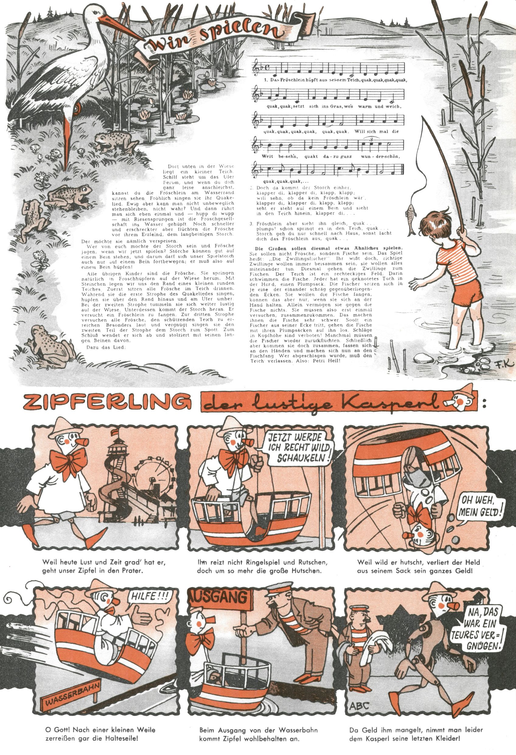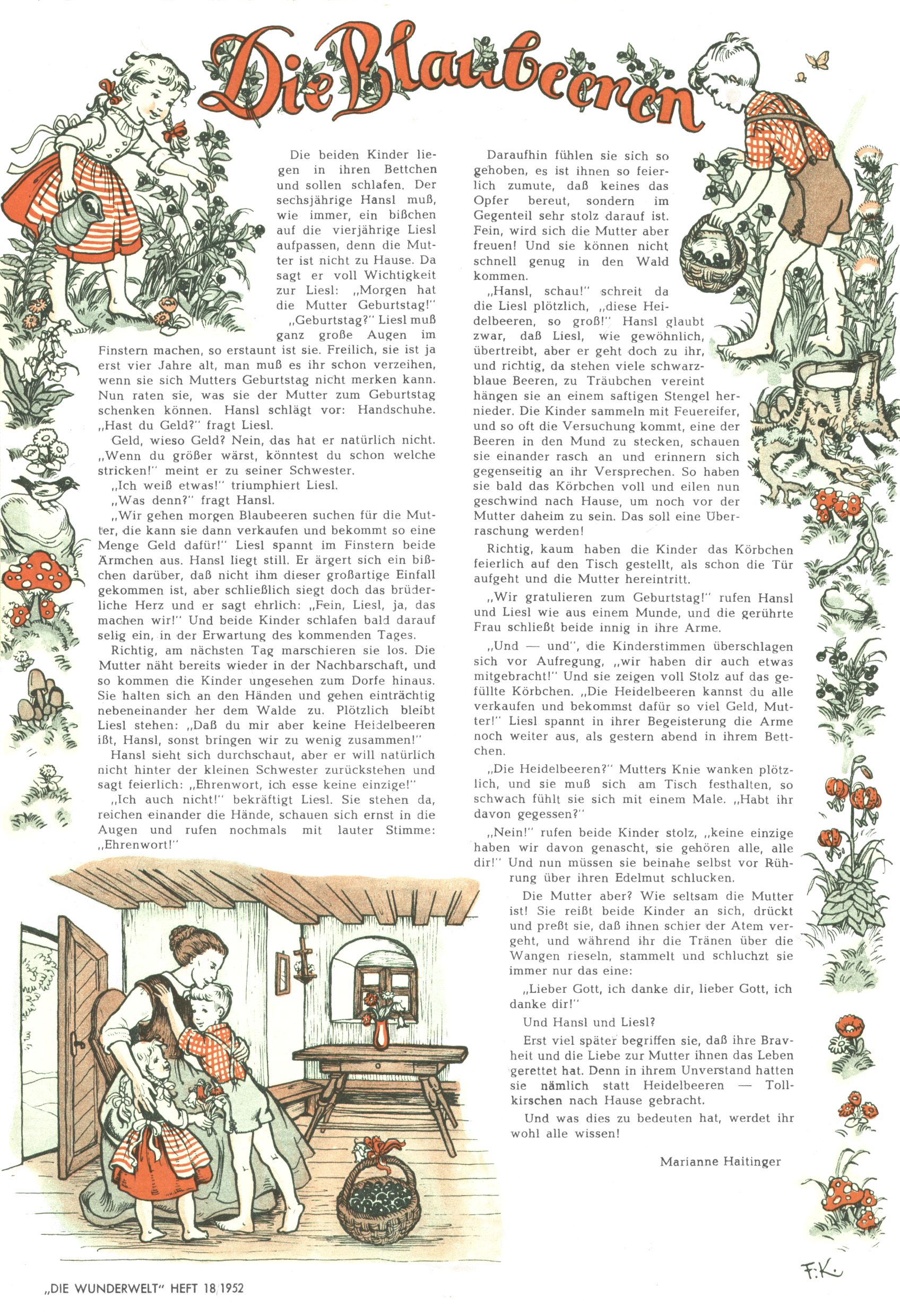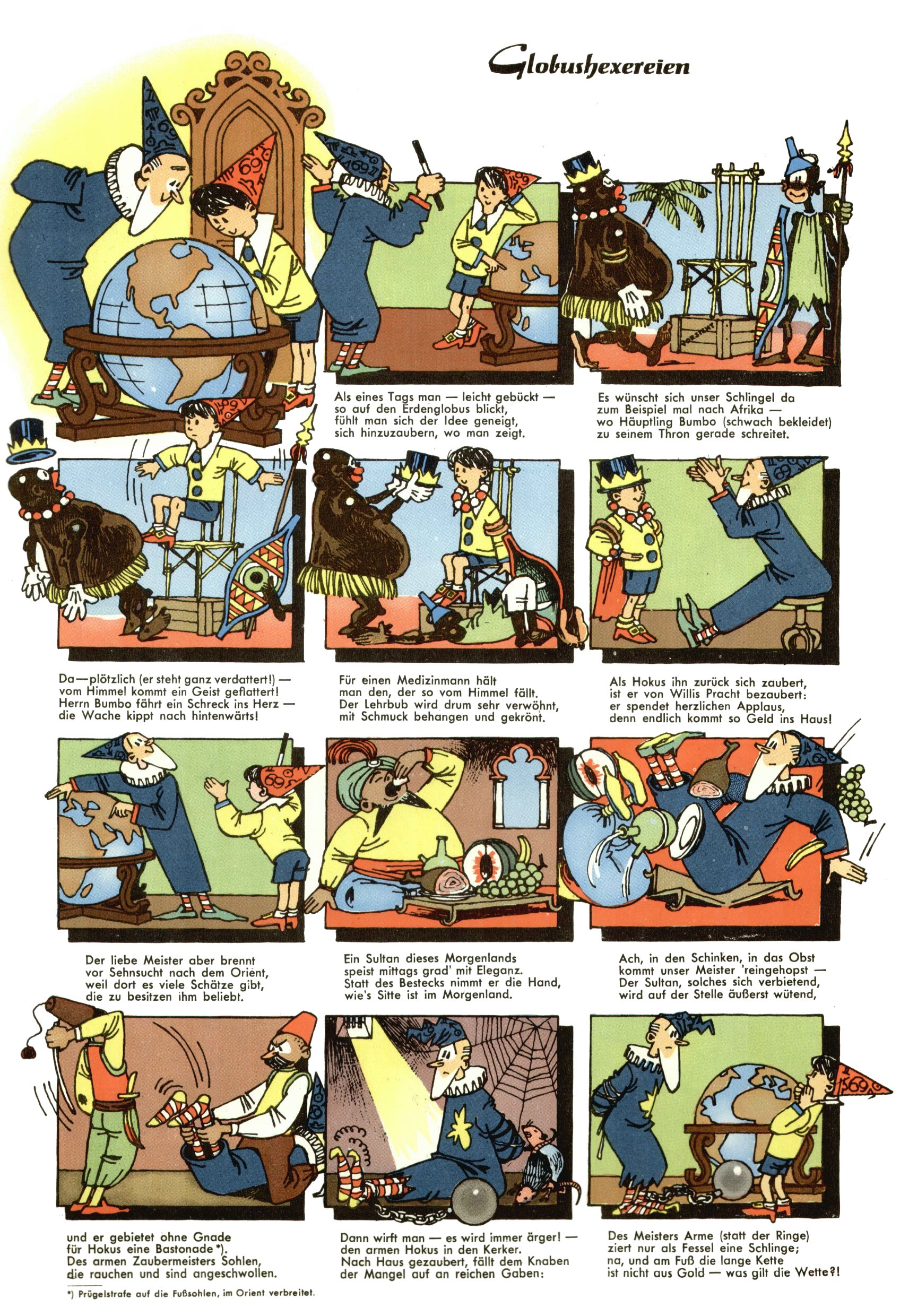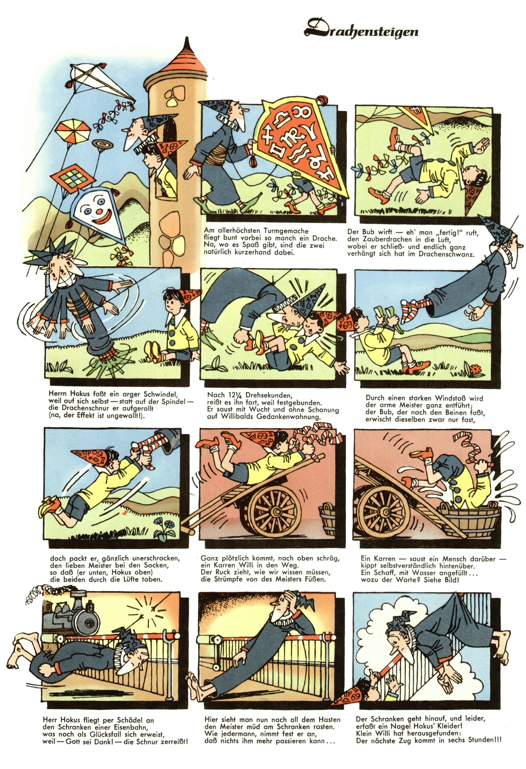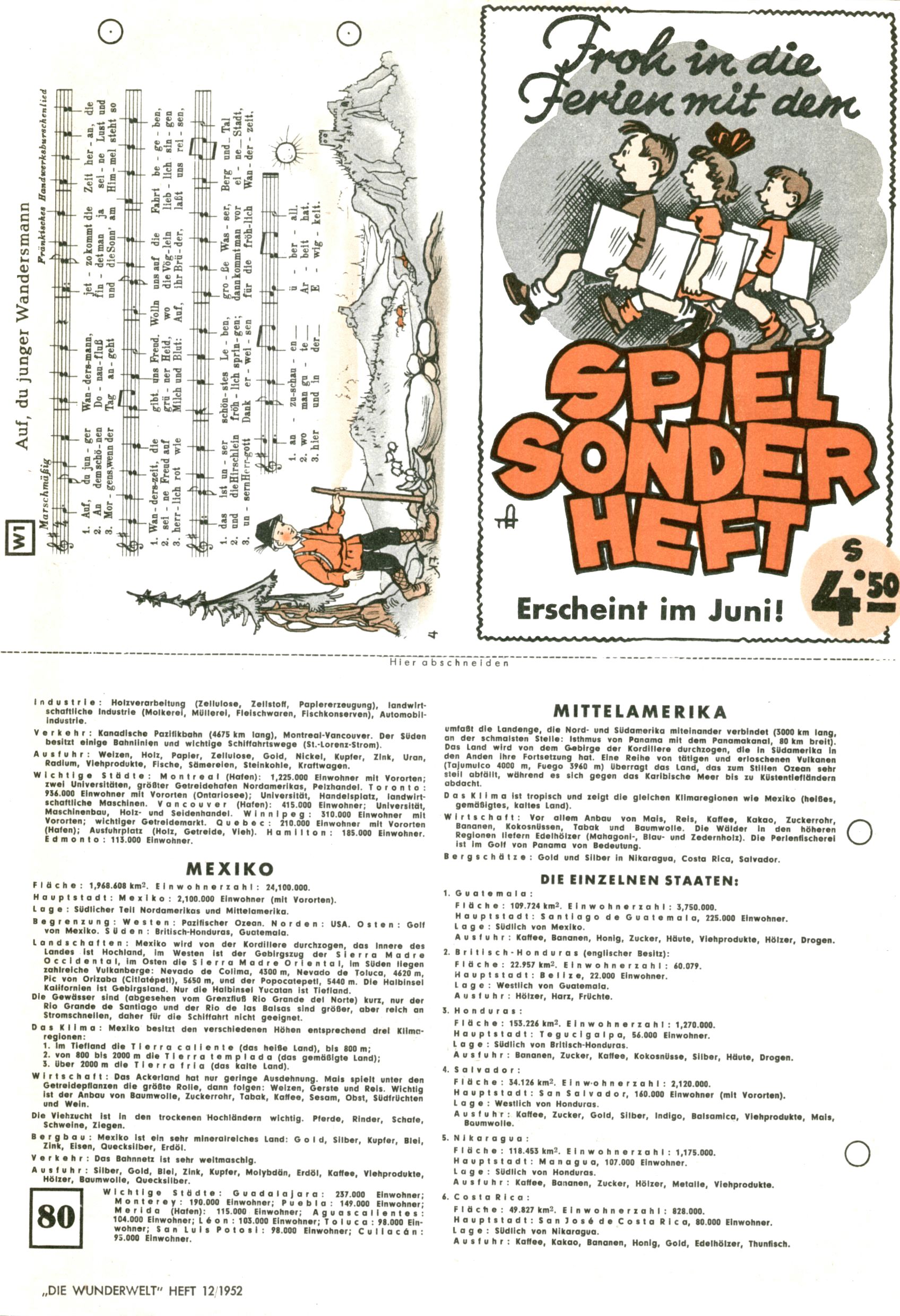 1952 – Der Erfolg hält an Wem Erfolg zuteil wird, der hat wenig Anlass, sein Konzept zu ändern. Und das war in gewisser Weise auch gut so bei allen inhaltlichen Schwächen der Beiträge in der Wunderwelt 1952. Der Erfolg der Zeitung wurde in erster Linie von der grafischen Umsetzung getragen; die lieblichen Bilder einer heilen Märchenwelt ließen über die oft flauen, pädagogisch teilweise sogar fragwürdigen Texte hinwegsehen. Elfriede Vavrovsky schrieb fast alle Texte und Rosl Warzilek zeichnete immer mehr Titelbilder und Mittelmärchen. ABC Peter Paul Prinz hatte Ende 1951 Meister Hokus als komischen Widerpart vom Zauberlehrling Willibald entdeckt und perfektionierte diesen Dualismus nun immer mehr. Meister Hokus avancierte zur regelmäßigen Lachnummer. Dafür überließ ABC vorübergehend Teja Aicher die Gestaltung der technischen Seite, dessen Zwerg Bumsti ebenfalls bereits untrennbar mit der Wunderwelt verbunden schien und längst zum Markenzeichen aufgestiegen war. Seine ko(s)mischen Superhelden Piff und Paff hatten jedoch allmählich genug von den Menschen und kehrten der Erde den Rücken zu. Für den Einsatz im Schulunterricht wurden weiterhin von Elfriede Vavrovsky erstellte politische und geografische Daten und Karten gedruckt, was gerne angenommen wurde, denn teure Atlanten gab es 1952 noch wenige, als viele politische Grenzen gar nicht endgültig geklärt schienen. |