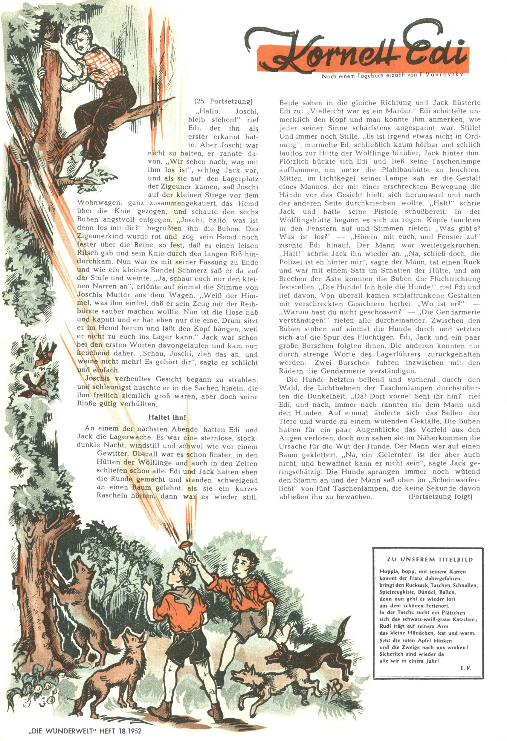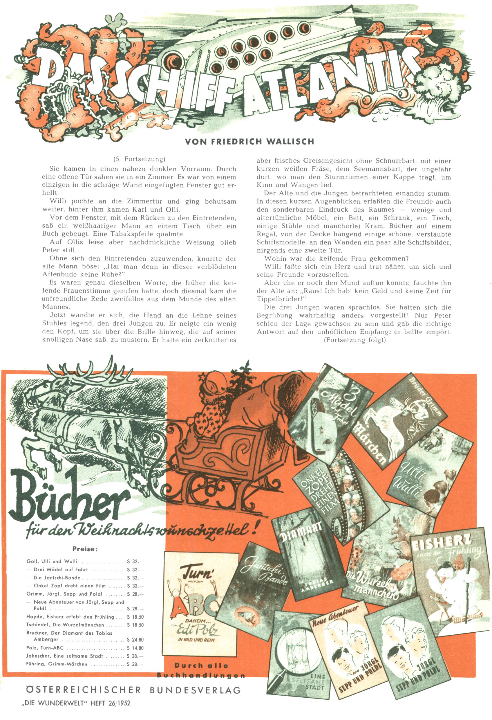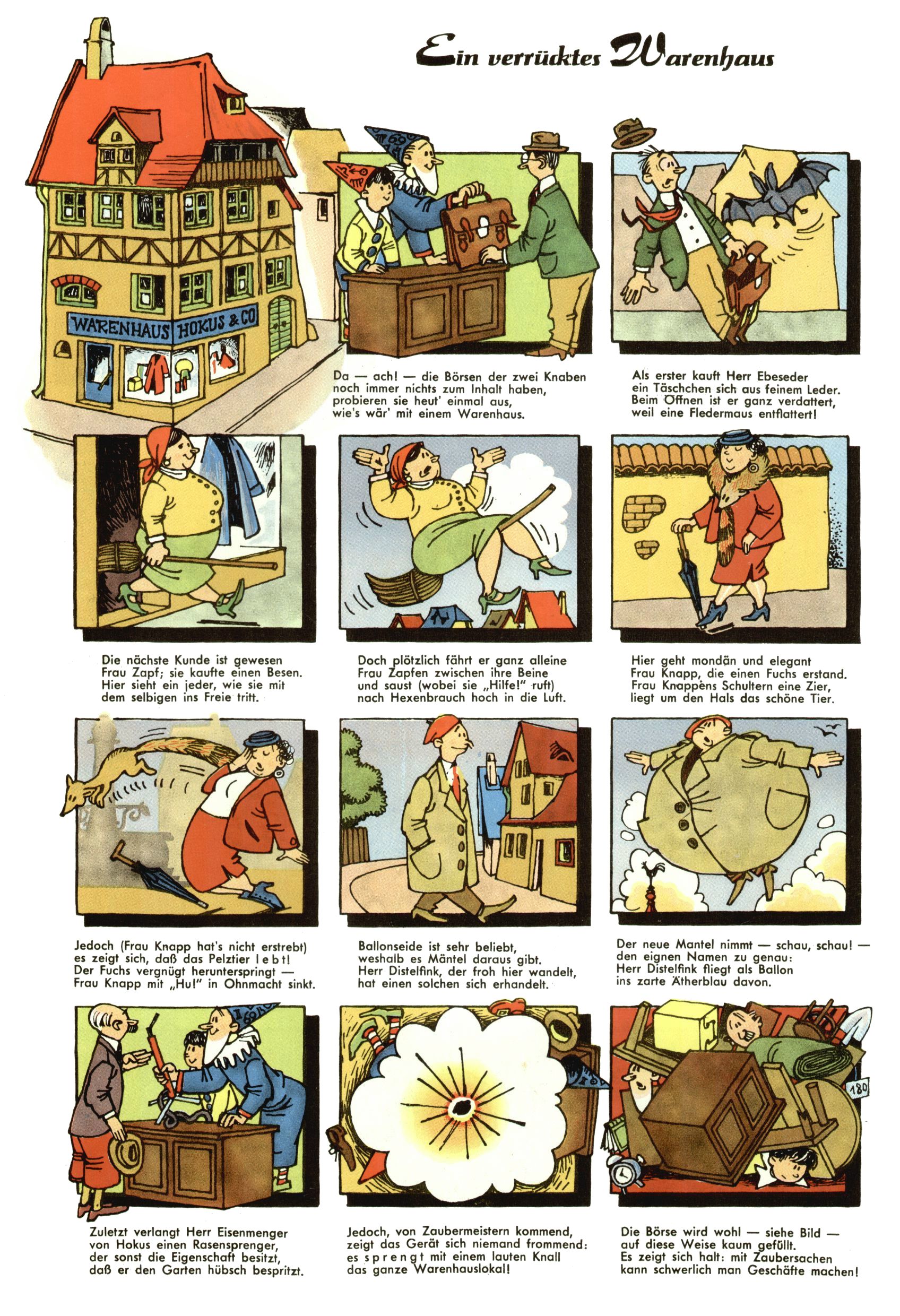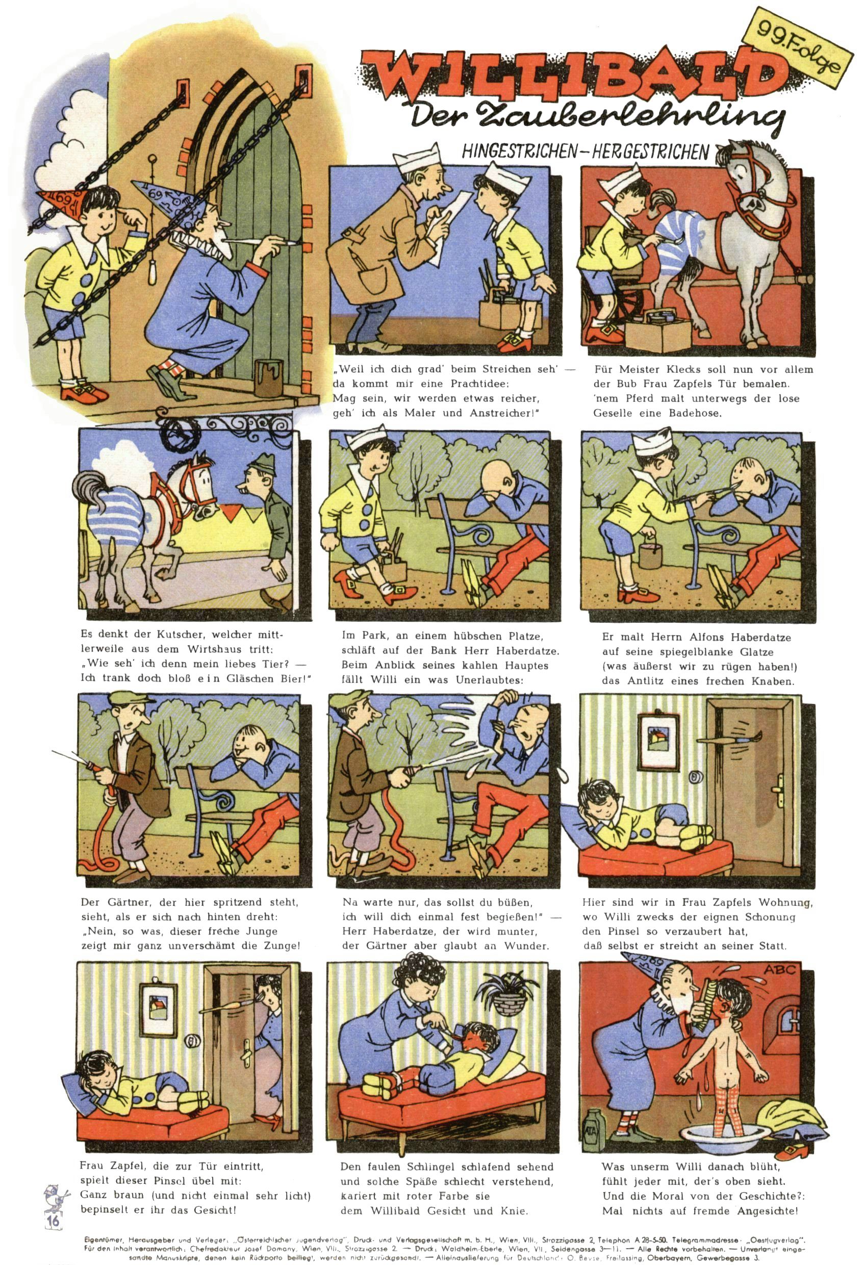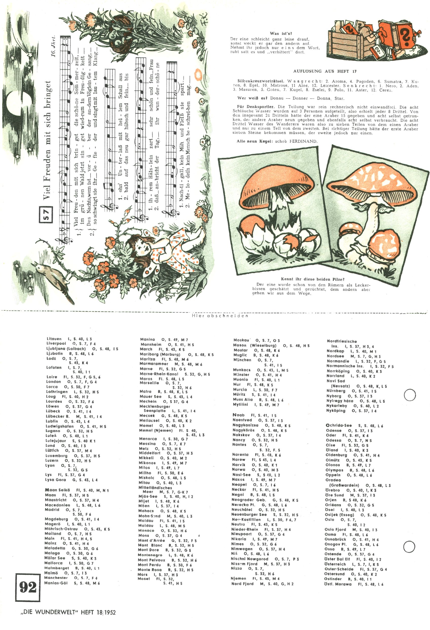 1952 – Der Erfolg hält an Wem Erfolg zuteil wird, der hat wenig Anlass, sein Konzept zu ändern. Und das war in gewisser Weise auch gut so bei allen inhaltlichen Schwächen der Beiträge in der Wunderwelt 1952. Der Erfolg der Zeitung wurde in erster Linie von der grafischen Umsetzung getragen; die lieblichen Bilder einer heilen Märchenwelt ließen über die oft flauen, pädagogisch teilweise sogar fragwürdigen Texte hinwegsehen. Elfriede Vavrovsky schrieb fast alle Texte und Rosl Warzilek zeichnete immer mehr Titelbilder und Mittelmärchen. ABC Peter Paul Prinz hatte Ende 1951 Meister Hokus als komischen Widerpart vom Zauberlehrling Willibald entdeckt und perfektionierte diesen Dualismus nun immer mehr. Meister Hokus avancierte zur regelmäßigen Lachnummer. Dafür überließ ABC vorübergehend Teja Aicher die Gestaltung der technischen Seite, dessen Zwerg Bumsti ebenfalls bereits untrennbar mit der Wunderwelt verbunden schien und längst zum Markenzeichen aufgestiegen war. Seine ko(s)mischen Superhelden Piff und Paff hatten jedoch allmählich genug von den Menschen und kehrten der Erde den Rücken zu. Für den Einsatz im Schulunterricht wurden weiterhin von Elfriede Vavrovsky erstellte politische und geografische Daten und Karten gedruckt, was gerne angenommen wurde, denn teure Atlanten gab es 1952 noch wenige, als viele politische Grenzen gar nicht endgültig geklärt schienen. |