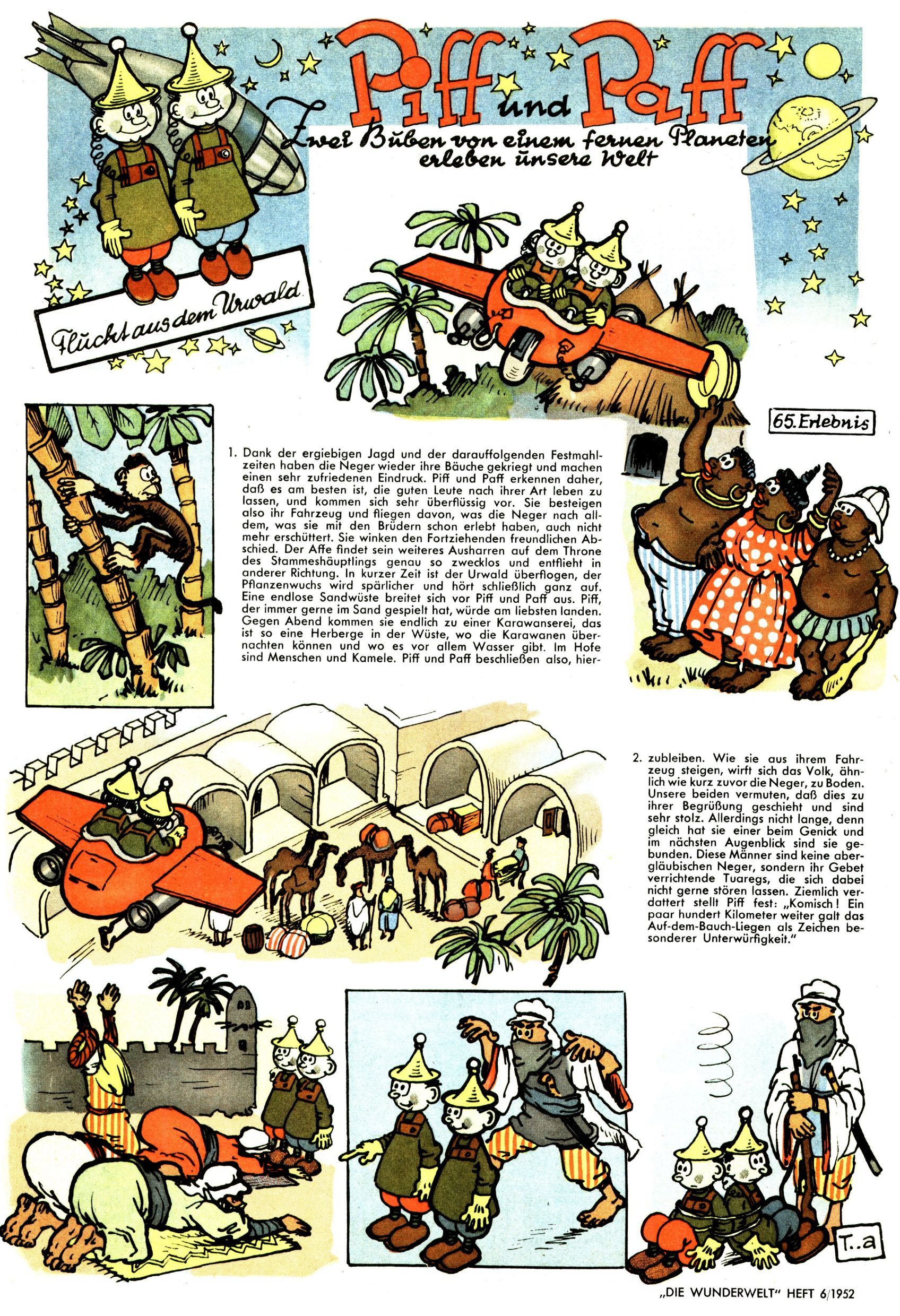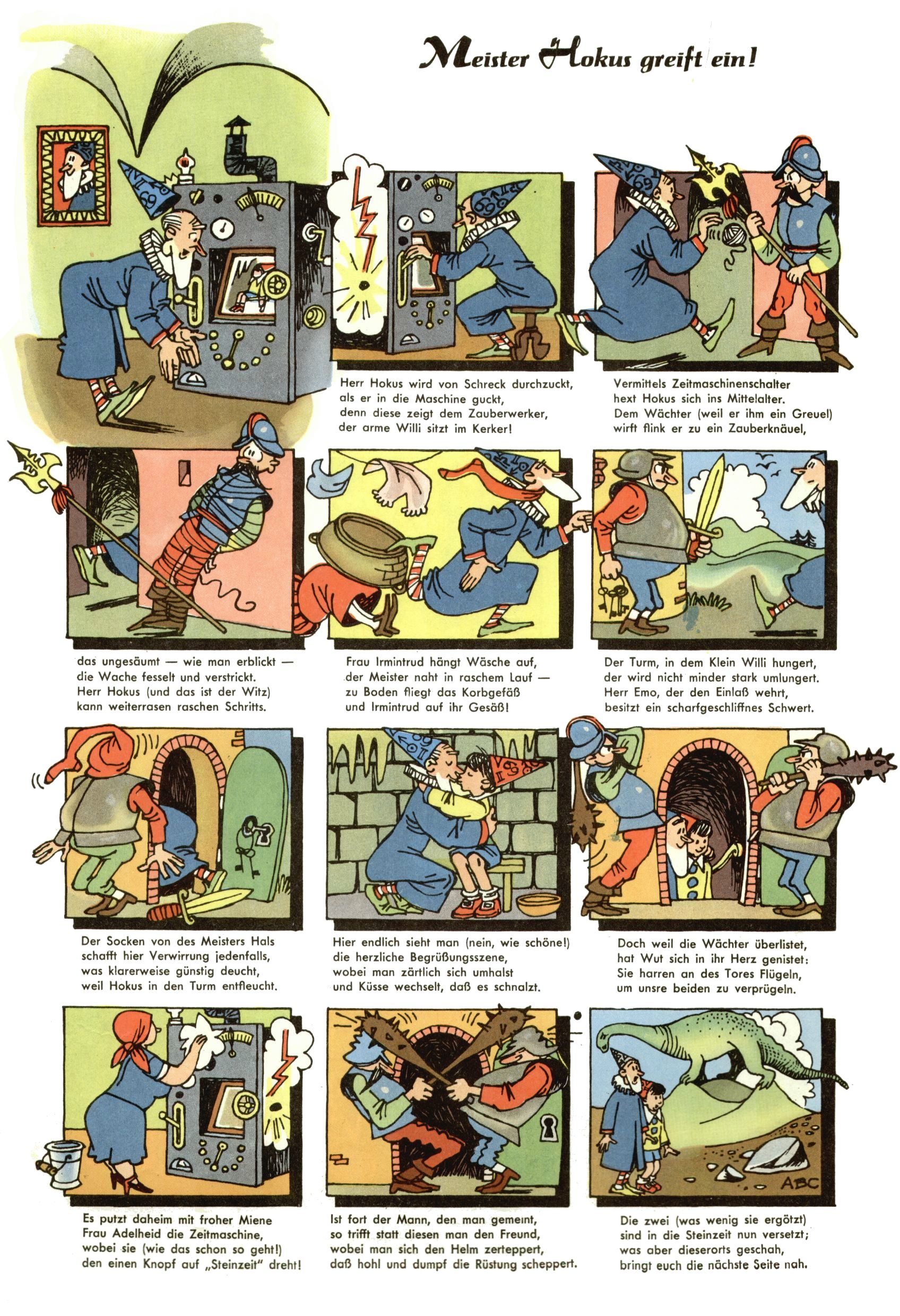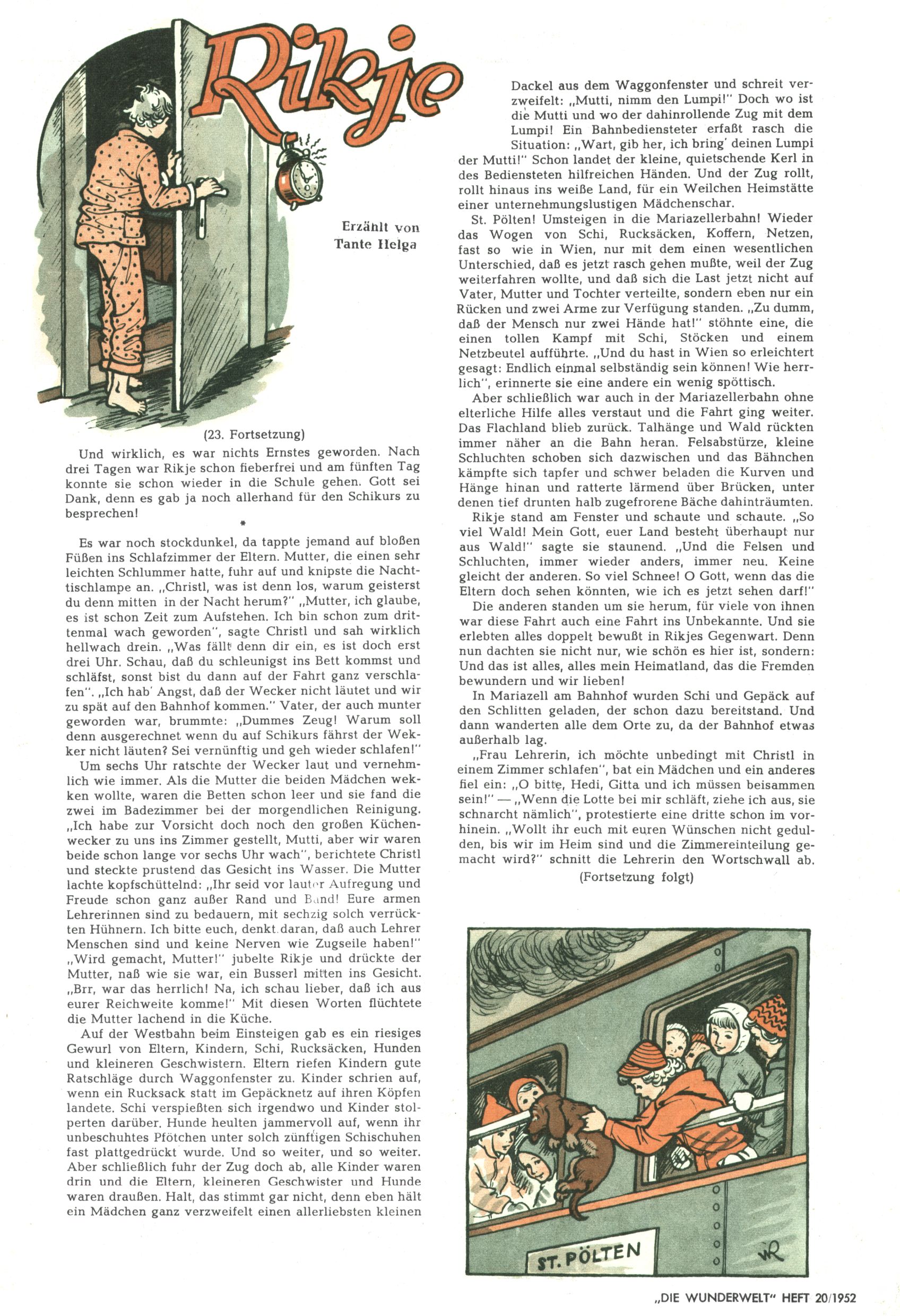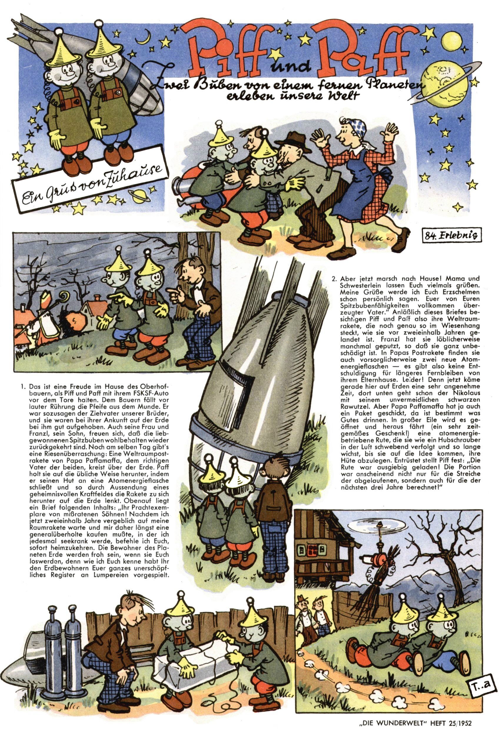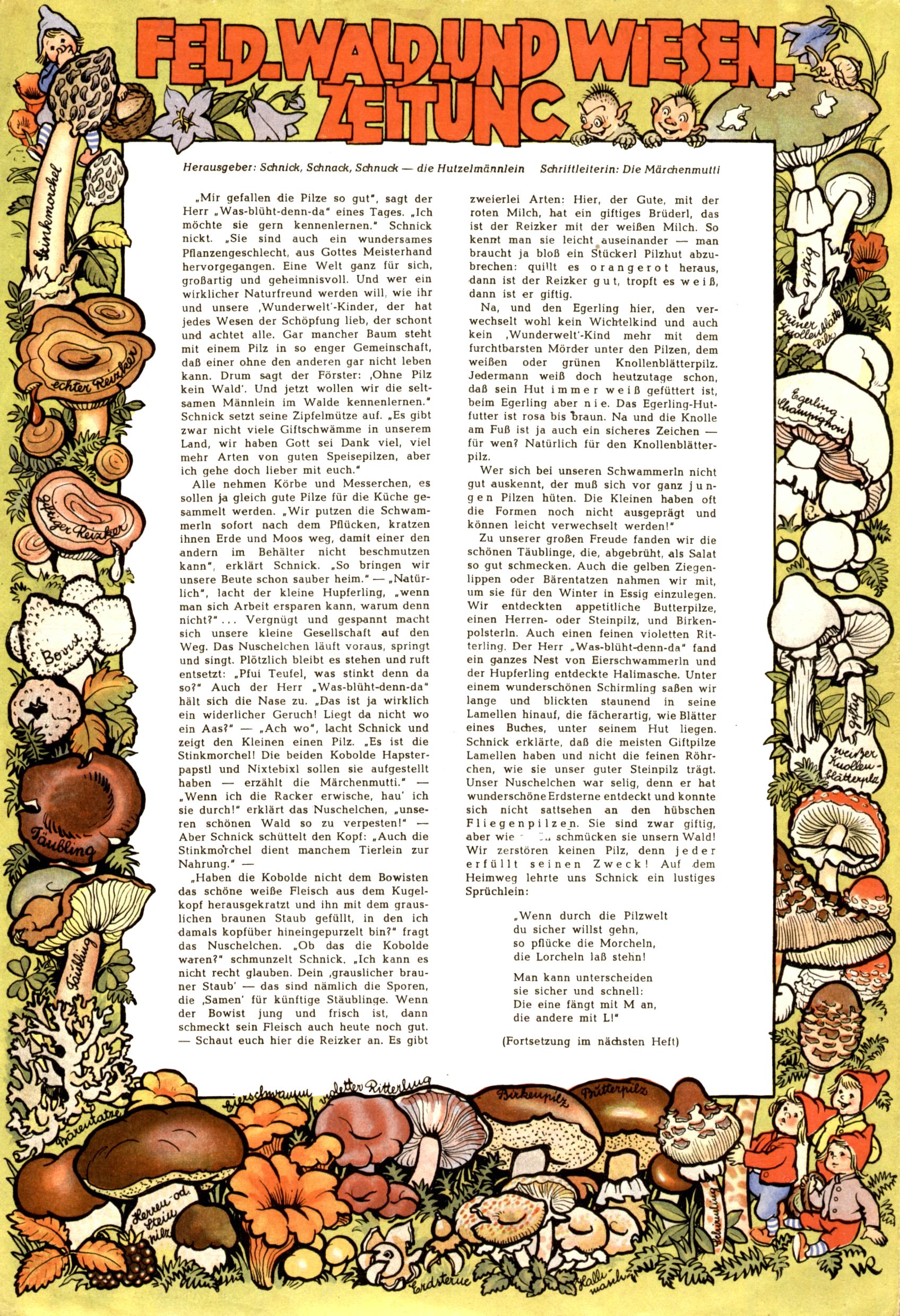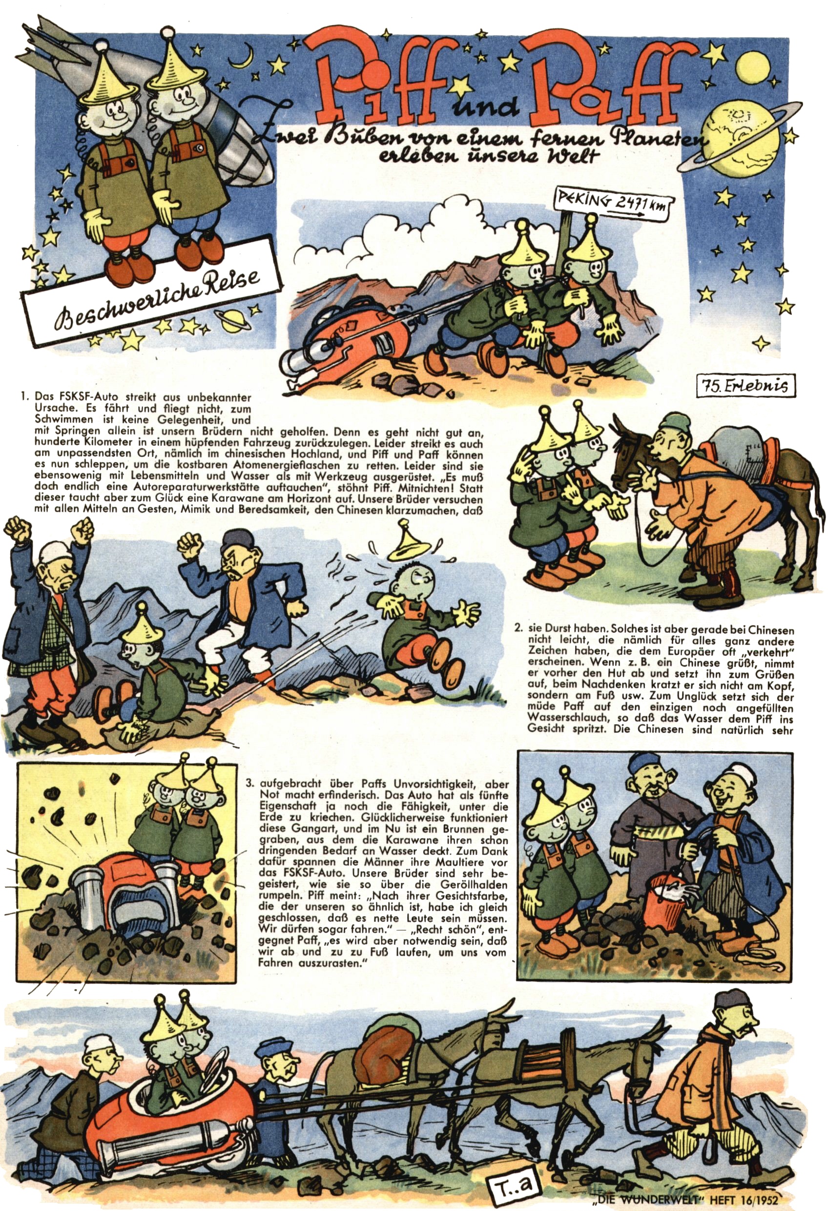 1952 – Der Erfolg hält an Wem Erfolg zuteil wird, der hat wenig Anlass, sein Konzept zu ändern. Und das war in gewisser Weise auch gut so bei allen inhaltlichen Schwächen der Beiträge in der Wunderwelt 1952. Der Erfolg der Zeitung wurde in erster Linie von der grafischen Umsetzung getragen; die lieblichen Bilder einer heilen Märchenwelt ließen über die oft flauen, pädagogisch teilweise sogar fragwürdigen Texte hinwegsehen. Elfriede Vavrovsky schrieb fast alle Texte und Rosl Warzilek zeichnete immer mehr Titelbilder und Mittelmärchen. ABC Peter Paul Prinz hatte Ende 1951 Meister Hokus als komischen Widerpart vom Zauberlehrling Willibald entdeckt und perfektionierte diesen Dualismus nun immer mehr. Meister Hokus avancierte zur regelmäßigen Lachnummer. Dafür überließ ABC vorübergehend Teja Aicher die Gestaltung der technischen Seite, dessen Zwerg Bumsti ebenfalls bereits untrennbar mit der Wunderwelt verbunden schien und längst zum Markenzeichen aufgestiegen war. Seine ko(s)mischen Superhelden Piff und Paff hatten jedoch allmählich genug von den Menschen und kehrten der Erde den Rücken zu. Für den Einsatz im Schulunterricht wurden weiterhin von Elfriede Vavrovsky erstellte politische und geografische Daten und Karten gedruckt, was gerne angenommen wurde, denn teure Atlanten gab es 1952 noch wenige, als viele politische Grenzen gar nicht endgültig geklärt schienen. |