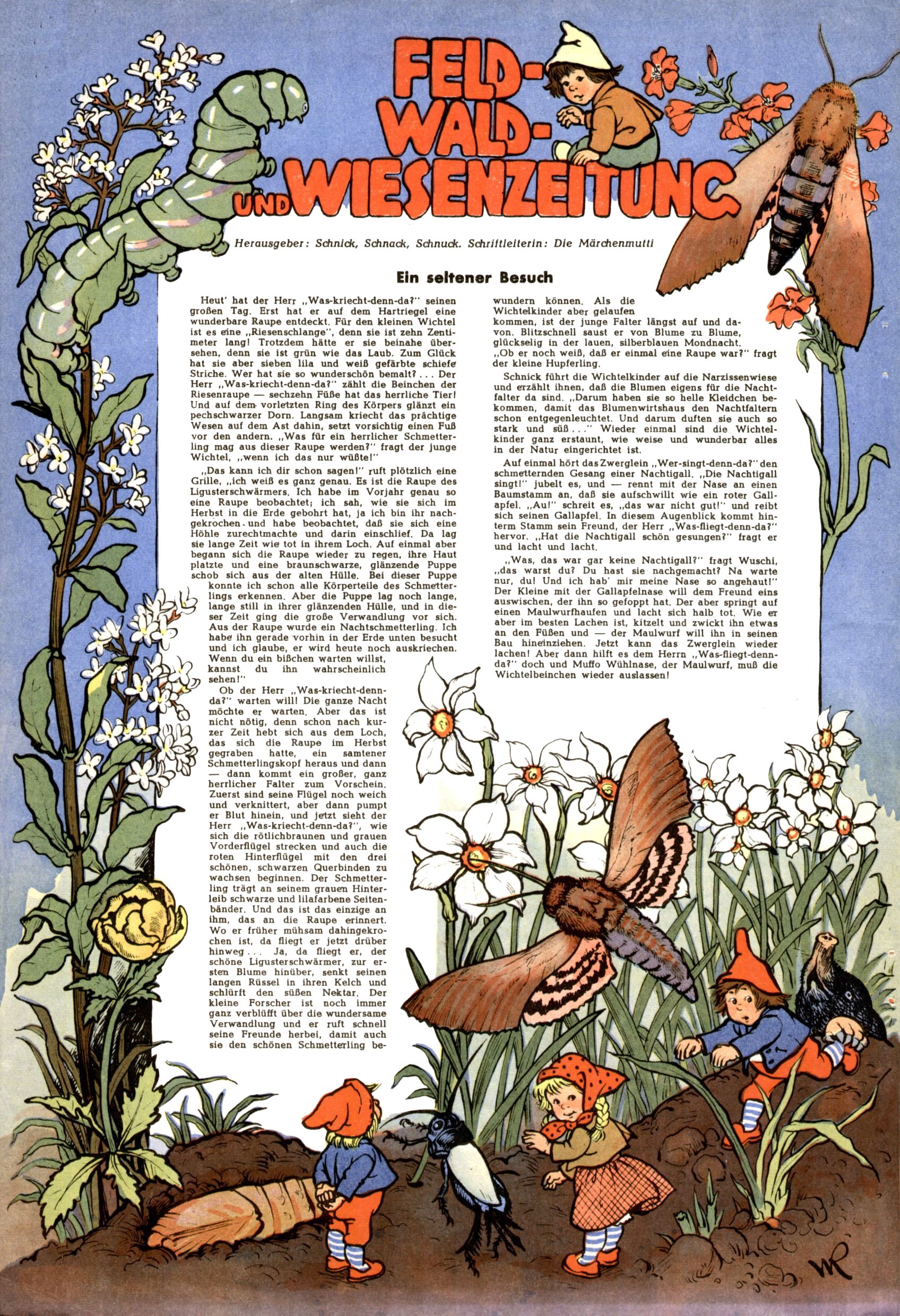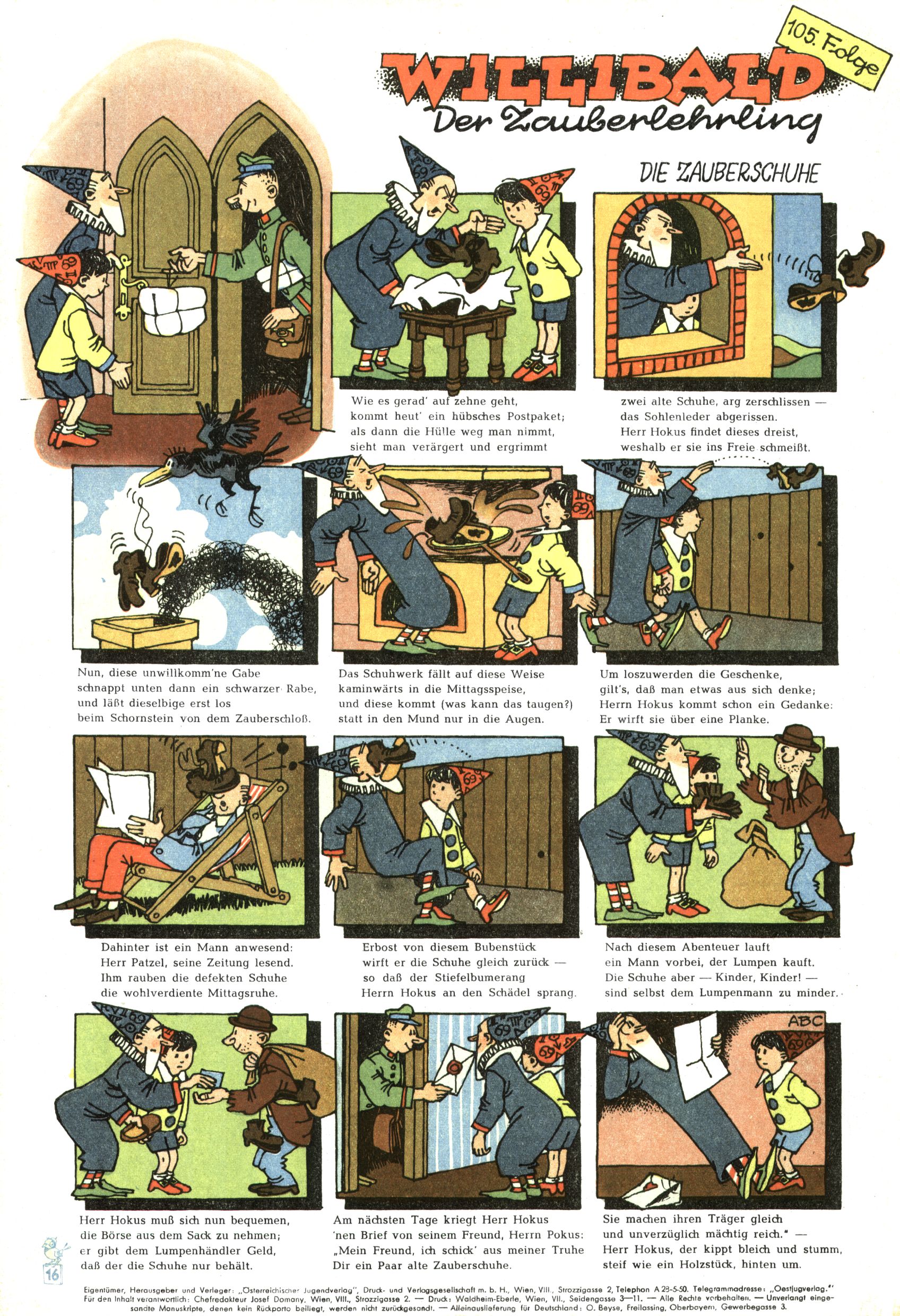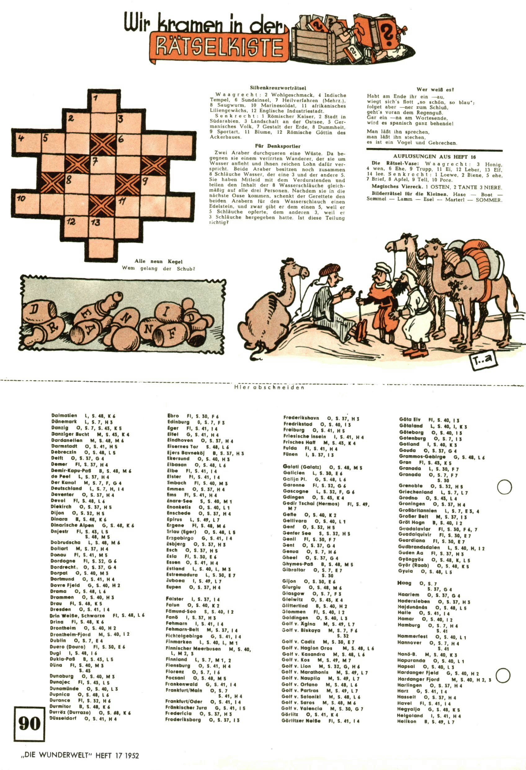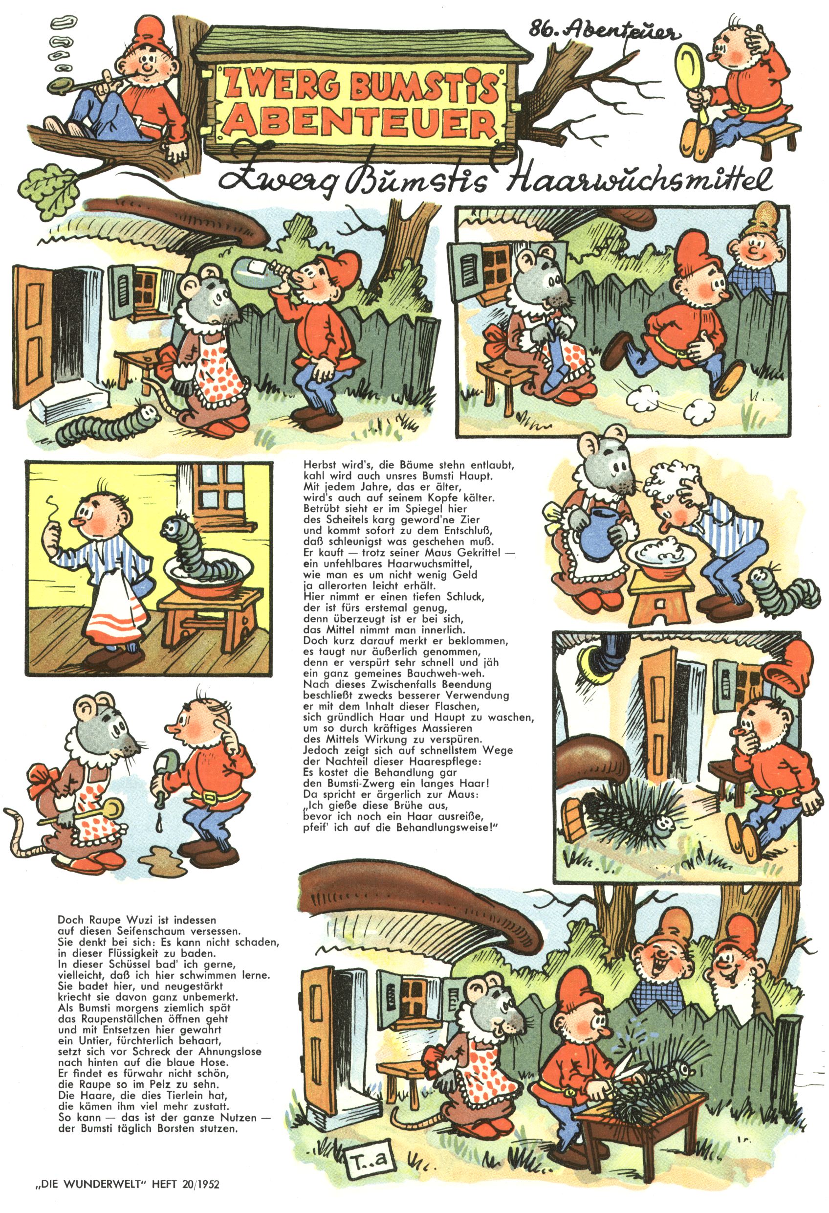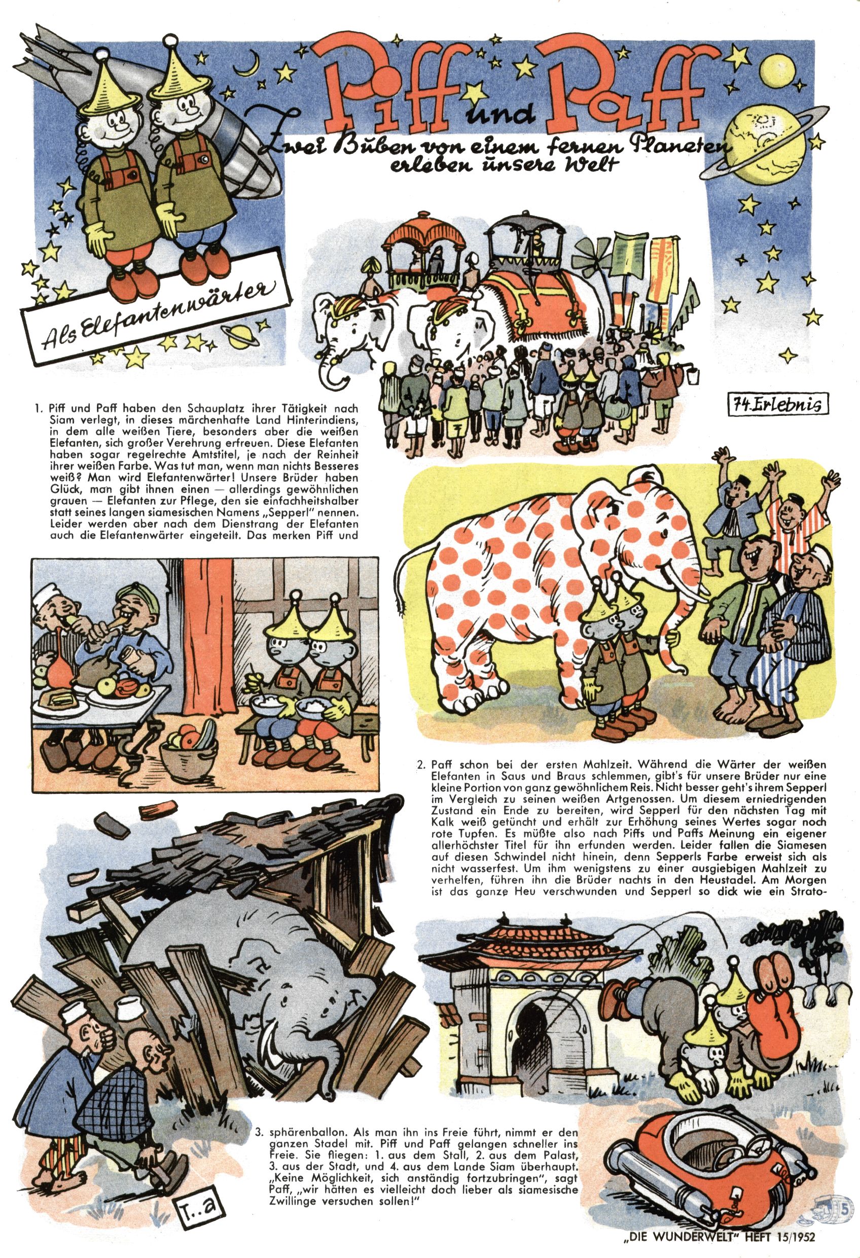 1952 – Der Erfolg hält an Wem Erfolg zuteil wird, der hat wenig Anlass, sein Konzept zu ändern. Und das war in gewisser Weise auch gut so bei allen inhaltlichen Schwächen der Beiträge in der Wunderwelt 1952. Der Erfolg der Zeitung wurde in erster Linie von der grafischen Umsetzung getragen; die lieblichen Bilder einer heilen Märchenwelt ließen über die oft flauen, pädagogisch teilweise sogar fragwürdigen Texte hinwegsehen. Elfriede Vavrovsky schrieb fast alle Texte und Rosl Warzilek zeichnete immer mehr Titelbilder und Mittelmärchen. ABC Peter Paul Prinz hatte Ende 1951 Meister Hokus als komischen Widerpart vom Zauberlehrling Willibald entdeckt und perfektionierte diesen Dualismus nun immer mehr. Meister Hokus avancierte zur regelmäßigen Lachnummer. Dafür überließ ABC vorübergehend Teja Aicher die Gestaltung der technischen Seite, dessen Zwerg Bumsti ebenfalls bereits untrennbar mit der Wunderwelt verbunden schien und längst zum Markenzeichen aufgestiegen war. Seine ko(s)mischen Superhelden Piff und Paff hatten jedoch allmählich genug von den Menschen und kehrten der Erde den Rücken zu. Für den Einsatz im Schulunterricht wurden weiterhin von Elfriede Vavrovsky erstellte politische und geografische Daten und Karten gedruckt, was gerne angenommen wurde, denn teure Atlanten gab es 1952 noch wenige, als viele politische Grenzen gar nicht endgültig geklärt schienen. |