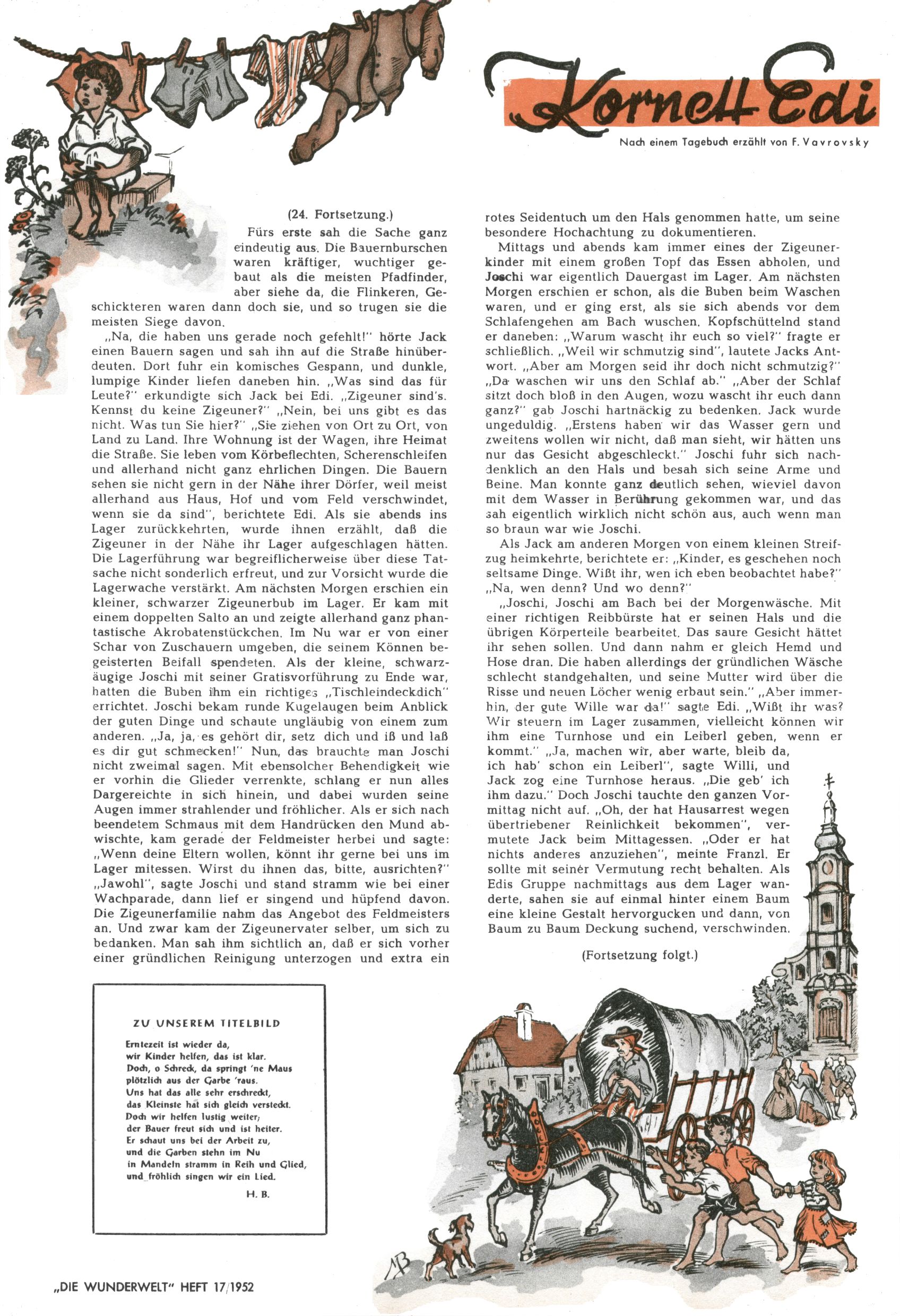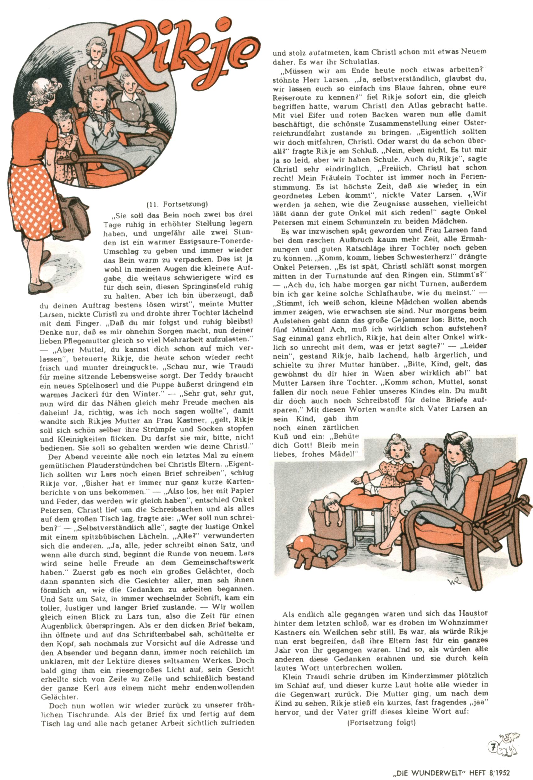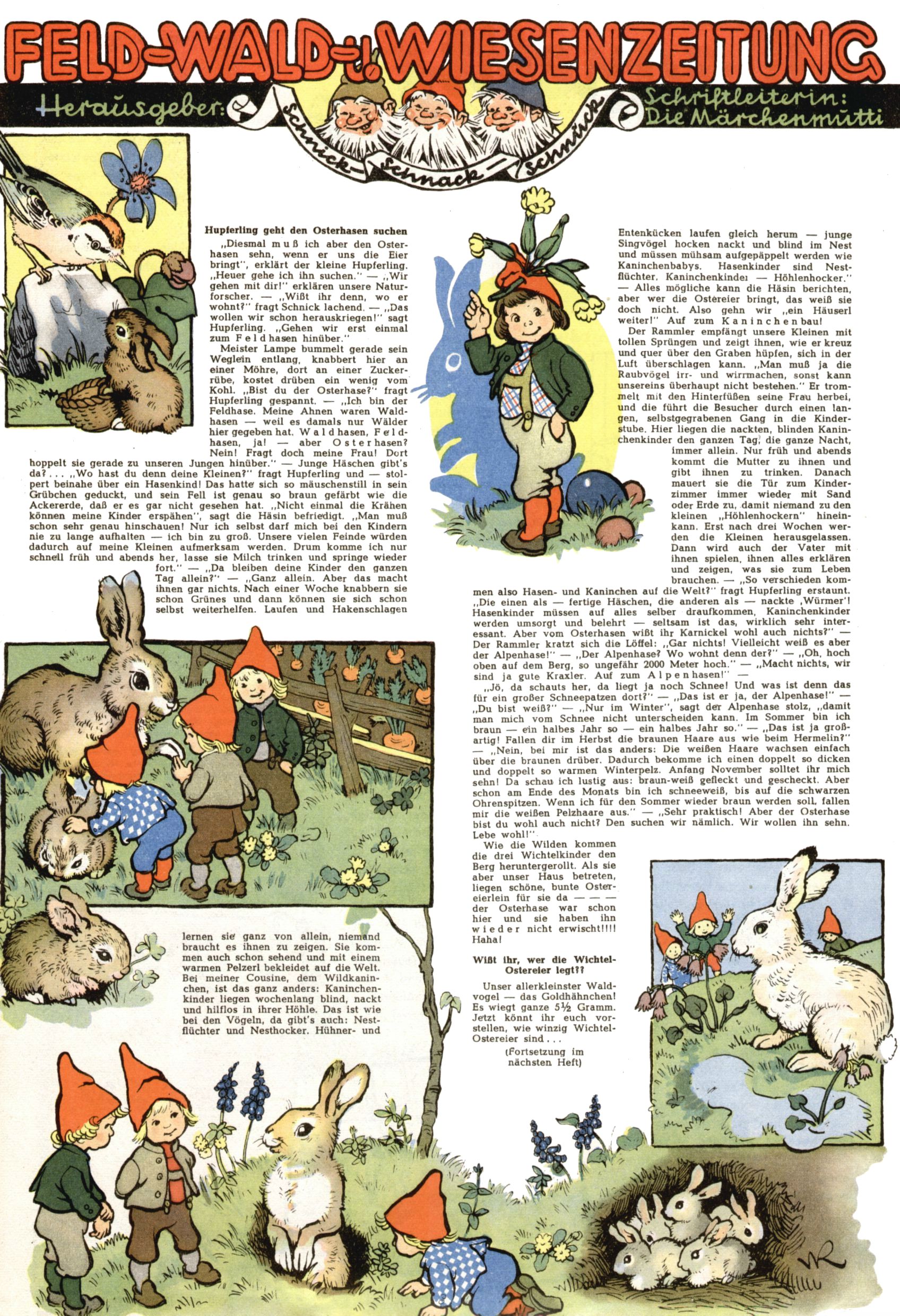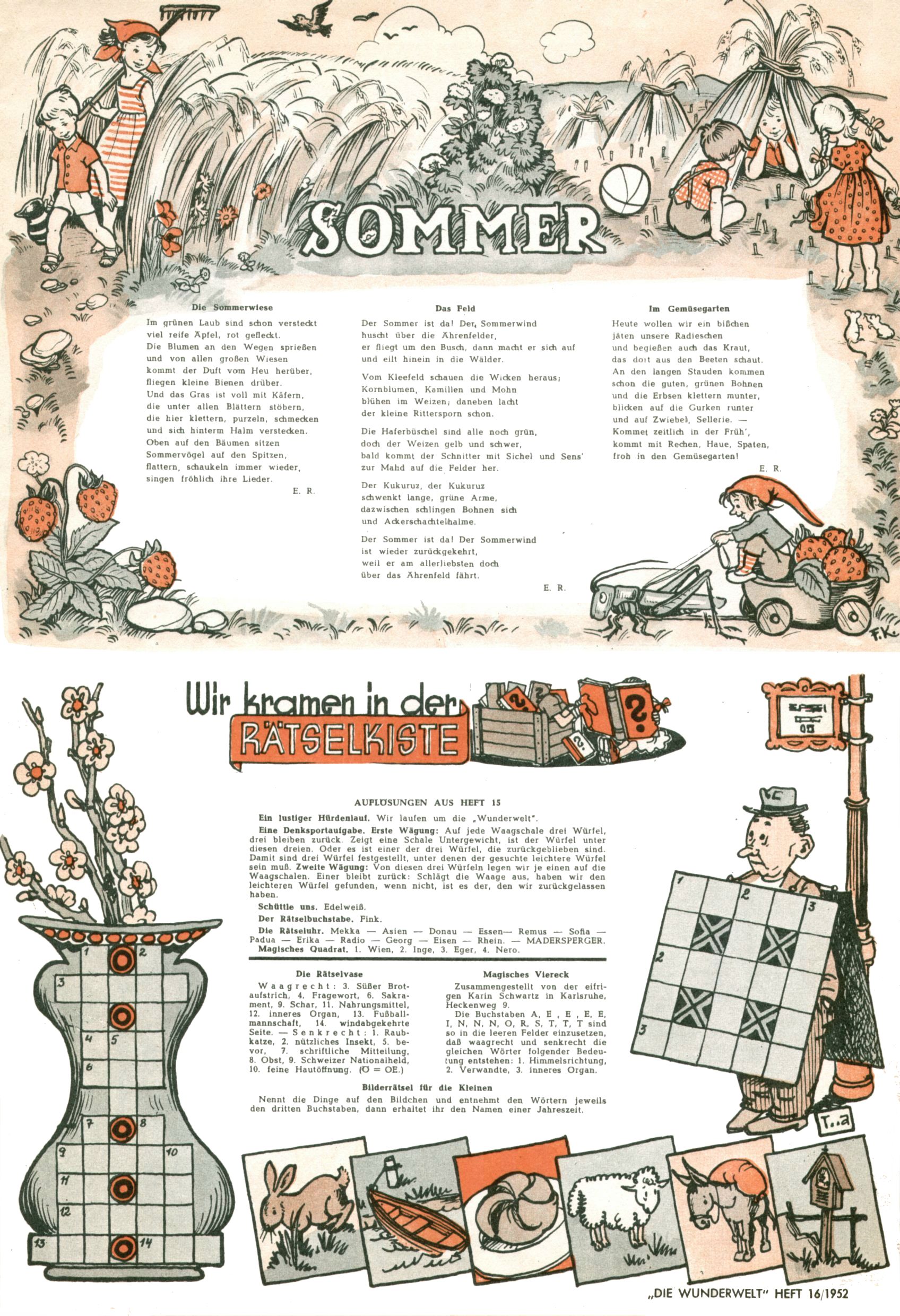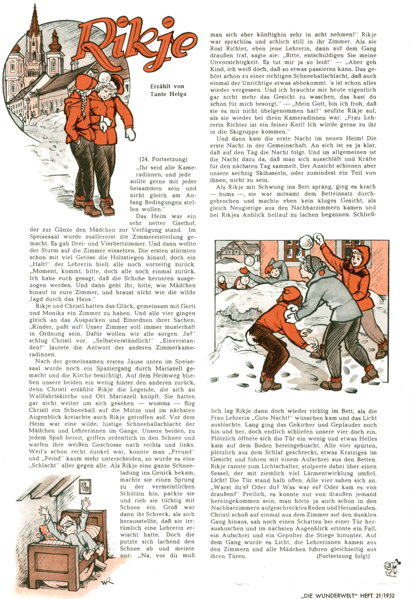 1952 – Der Erfolg hält an Wem Erfolg zuteil wird, der hat wenig Anlass, sein Konzept zu ändern. Und das war in gewisser Weise auch gut so bei allen inhaltlichen Schwächen der Beiträge in der Wunderwelt 1952. Der Erfolg der Zeitung wurde in erster Linie von der grafischen Umsetzung getragen; die lieblichen Bilder einer heilen Märchenwelt ließen über die oft flauen, pädagogisch teilweise sogar fragwürdigen Texte hinwegsehen. Elfriede Vavrovsky schrieb fast alle Texte und Rosl Warzilek zeichnete immer mehr Titelbilder und Mittelmärchen. ABC Peter Paul Prinz hatte Ende 1951 Meister Hokus als komischen Widerpart vom Zauberlehrling Willibald entdeckt und perfektionierte diesen Dualismus nun immer mehr. Meister Hokus avancierte zur regelmäßigen Lachnummer. Dafür überließ ABC vorübergehend Teja Aicher die Gestaltung der technischen Seite, dessen Zwerg Bumsti ebenfalls bereits untrennbar mit der Wunderwelt verbunden schien und längst zum Markenzeichen aufgestiegen war. Seine ko(s)mischen Superhelden Piff und Paff hatten jedoch allmählich genug von den Menschen und kehrten der Erde den Rücken zu. Für den Einsatz im Schulunterricht wurden weiterhin von Elfriede Vavrovsky erstellte politische und geografische Daten und Karten gedruckt, was gerne angenommen wurde, denn teure Atlanten gab es 1952 noch wenige, als viele politische Grenzen gar nicht endgültig geklärt schienen. |