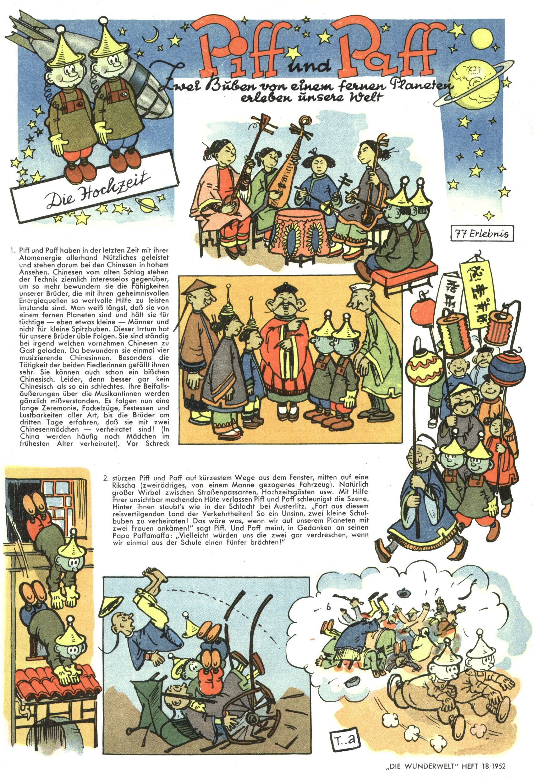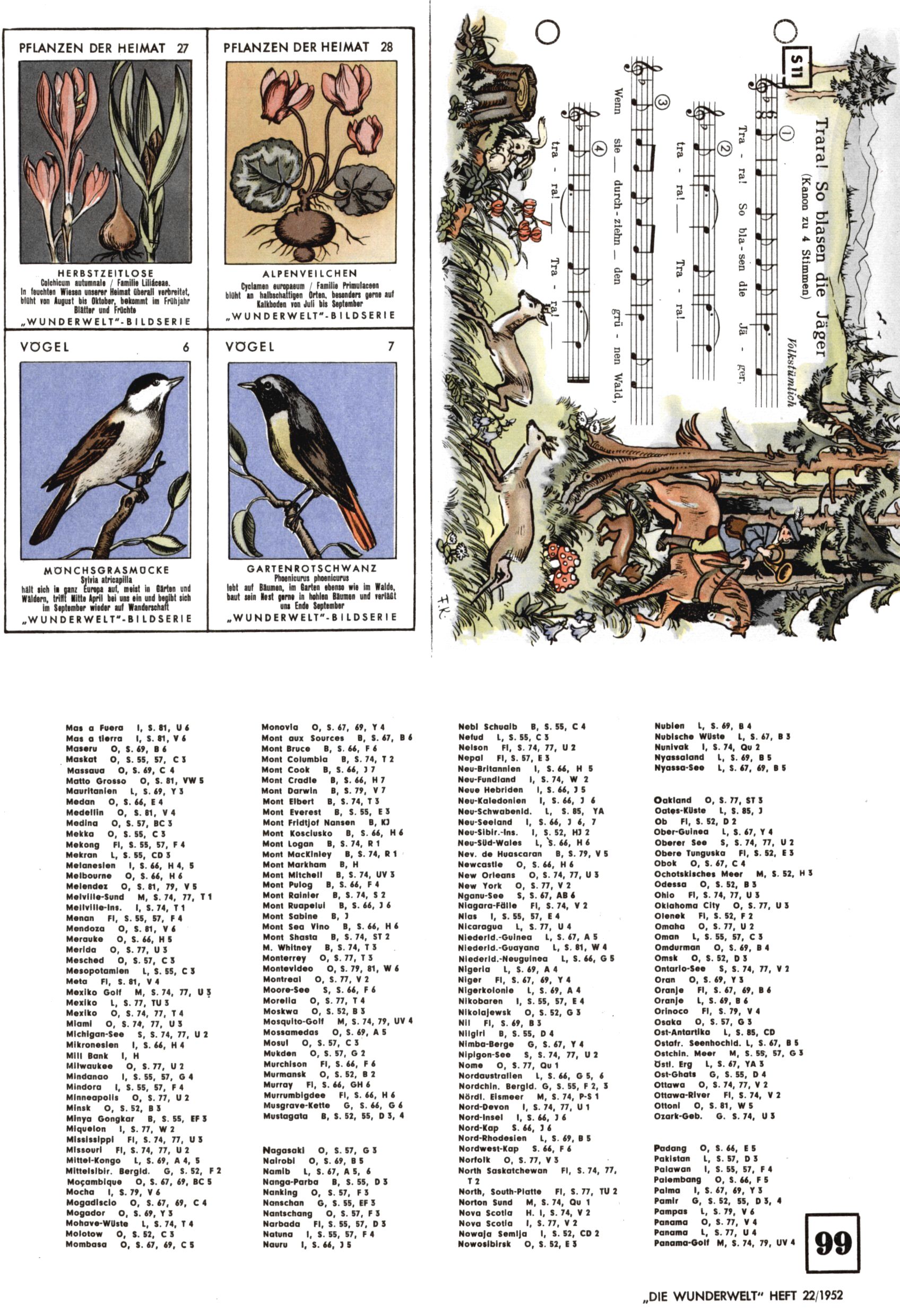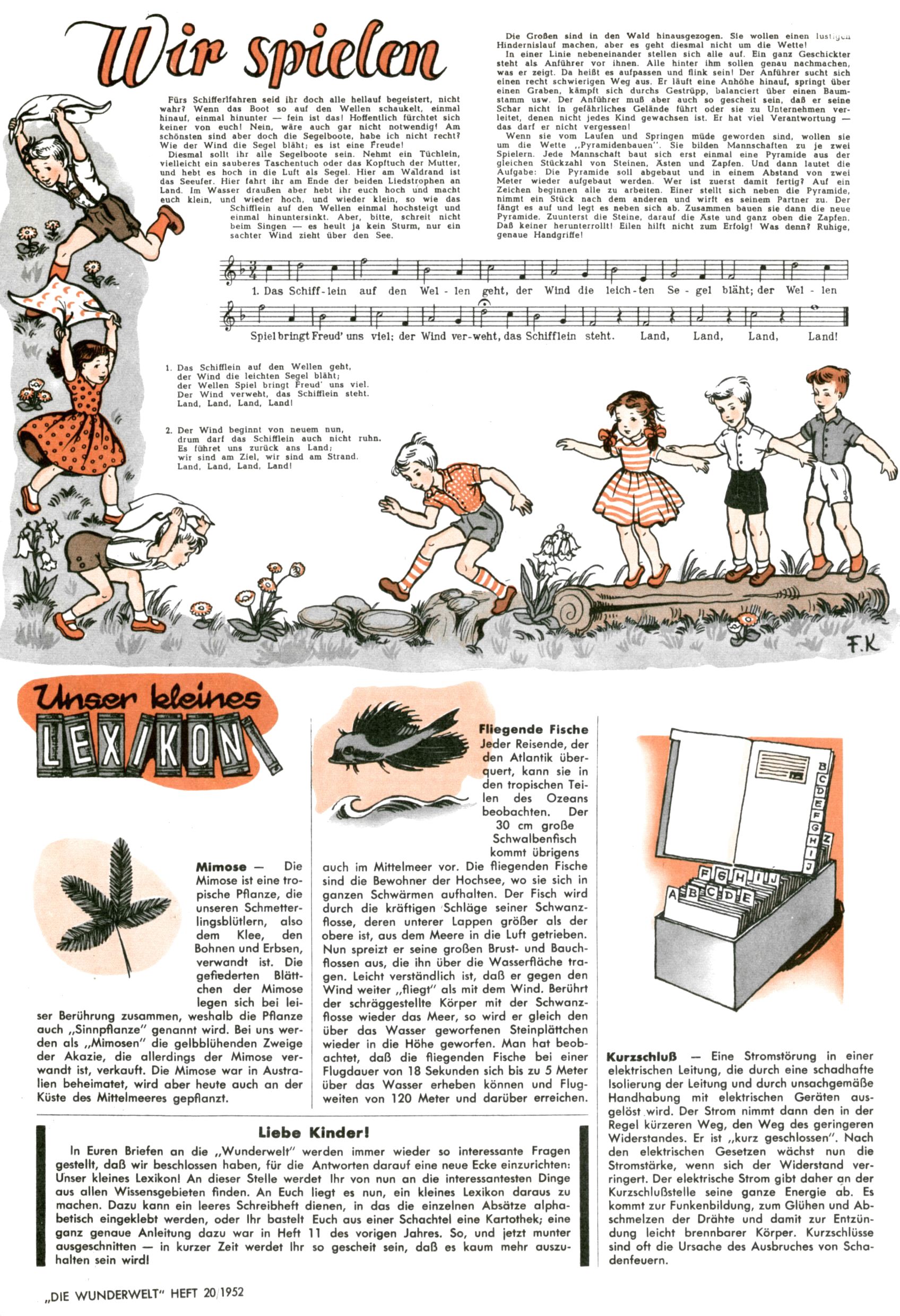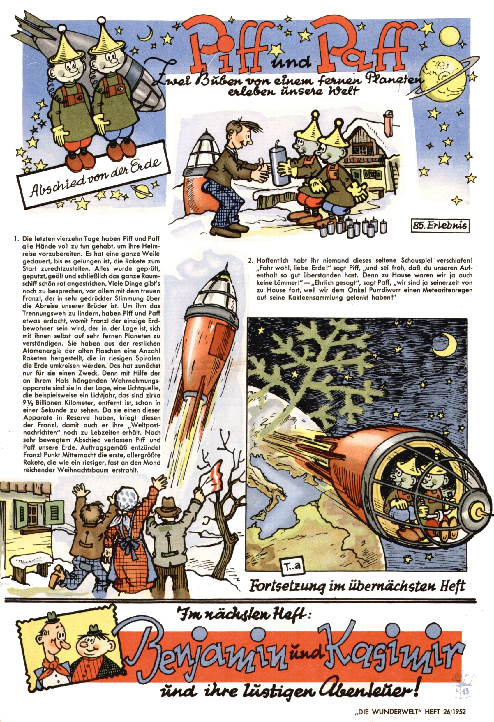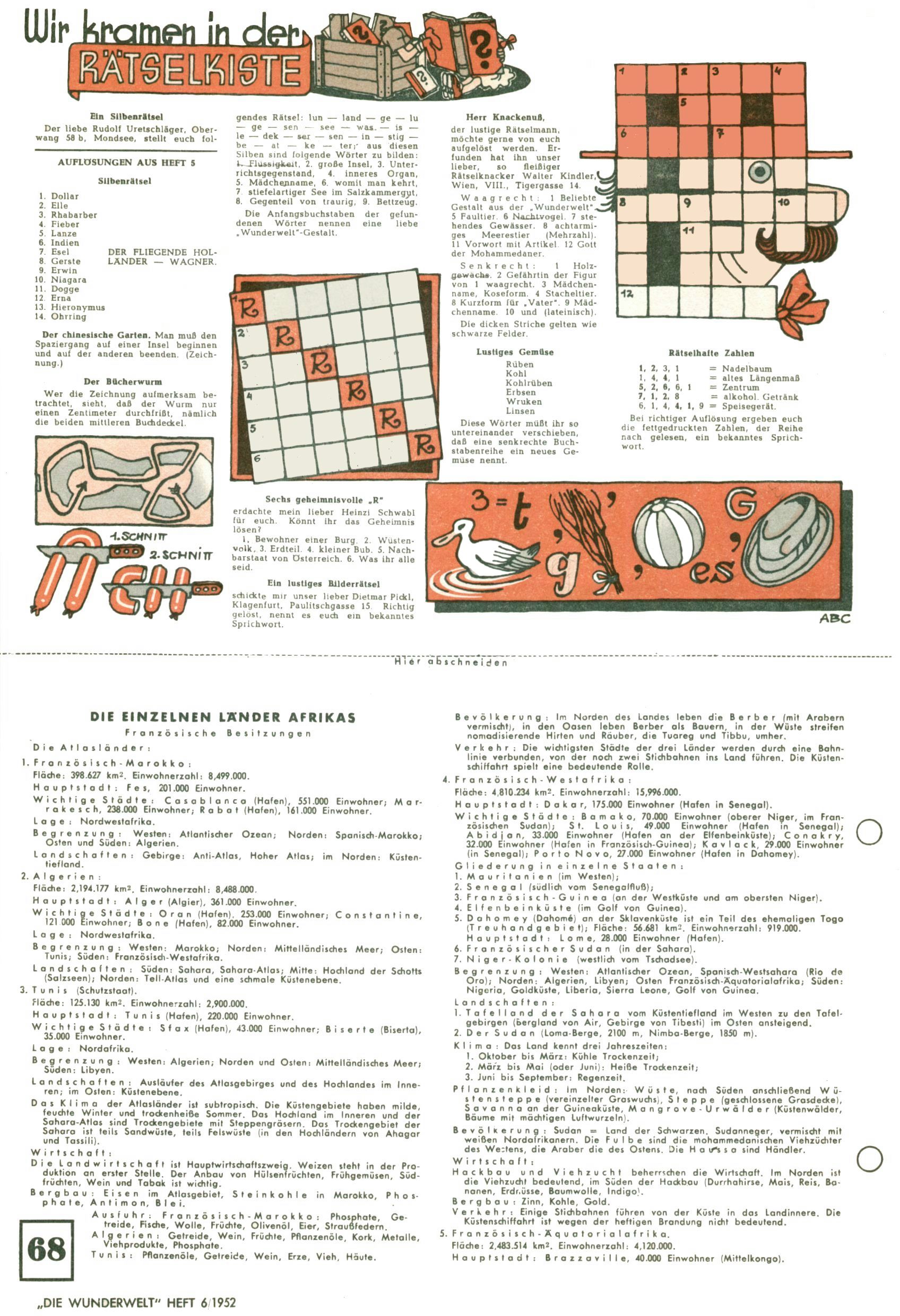 1952 – Der Erfolg hält an Wem Erfolg zuteil wird, der hat wenig Anlass, sein Konzept zu ändern. Und das war in gewisser Weise auch gut so bei allen inhaltlichen Schwächen der Beiträge in der Wunderwelt 1952. Der Erfolg der Zeitung wurde in erster Linie von der grafischen Umsetzung getragen; die lieblichen Bilder einer heilen Märchenwelt ließen über die oft flauen, pädagogisch teilweise sogar fragwürdigen Texte hinwegsehen. Elfriede Vavrovsky schrieb fast alle Texte und Rosl Warzilek zeichnete immer mehr Titelbilder und Mittelmärchen. ABC Peter Paul Prinz hatte Ende 1951 Meister Hokus als komischen Widerpart vom Zauberlehrling Willibald entdeckt und perfektionierte diesen Dualismus nun immer mehr. Meister Hokus avancierte zur regelmäßigen Lachnummer. Dafür überließ ABC vorübergehend Teja Aicher die Gestaltung der technischen Seite, dessen Zwerg Bumsti ebenfalls bereits untrennbar mit der Wunderwelt verbunden schien und längst zum Markenzeichen aufgestiegen war. Seine ko(s)mischen Superhelden Piff und Paff hatten jedoch allmählich genug von den Menschen und kehrten der Erde den Rücken zu. Für den Einsatz im Schulunterricht wurden weiterhin von Elfriede Vavrovsky erstellte politische und geografische Daten und Karten gedruckt, was gerne angenommen wurde, denn teure Atlanten gab es 1952 noch wenige, als viele politische Grenzen gar nicht endgültig geklärt schienen. |