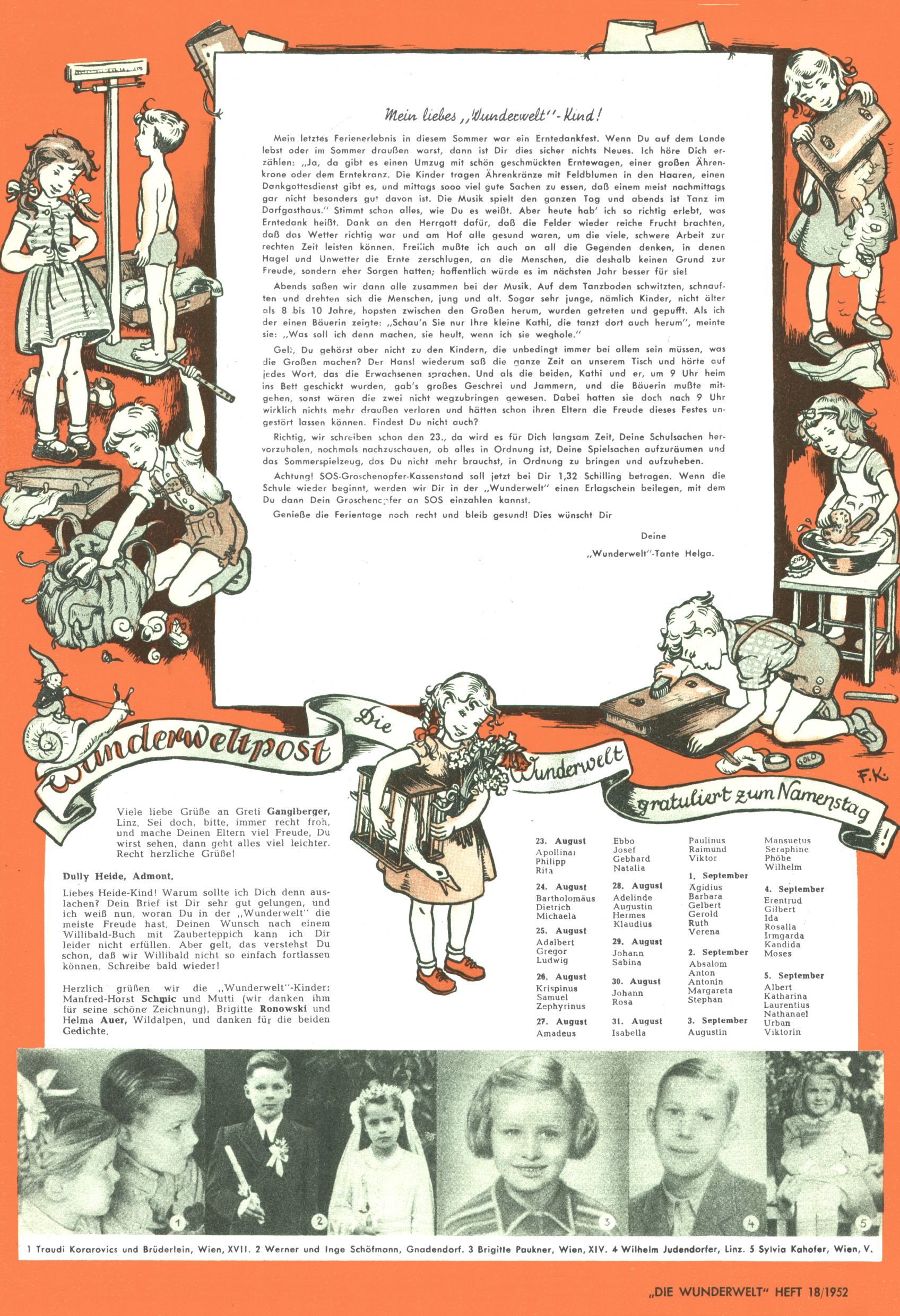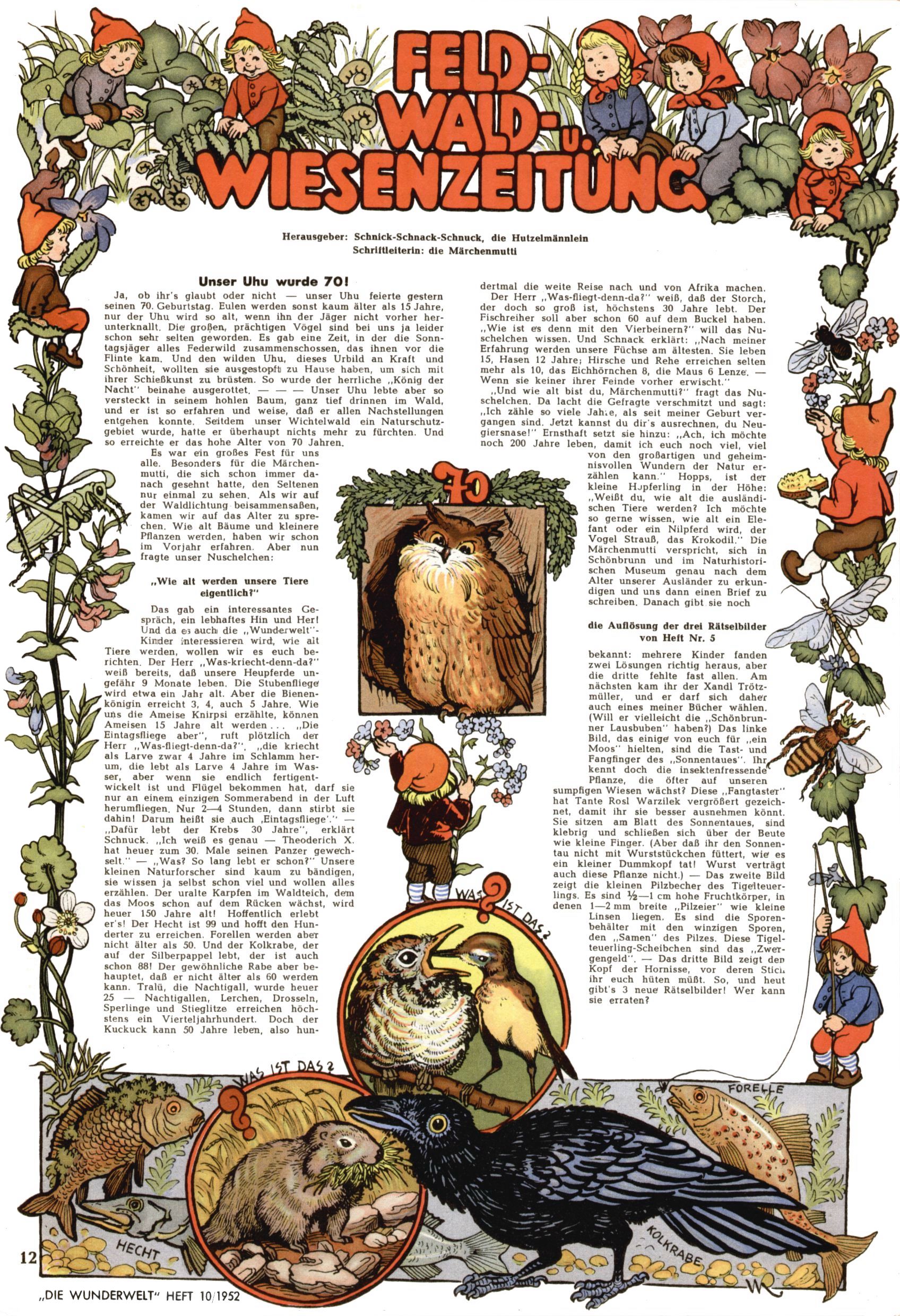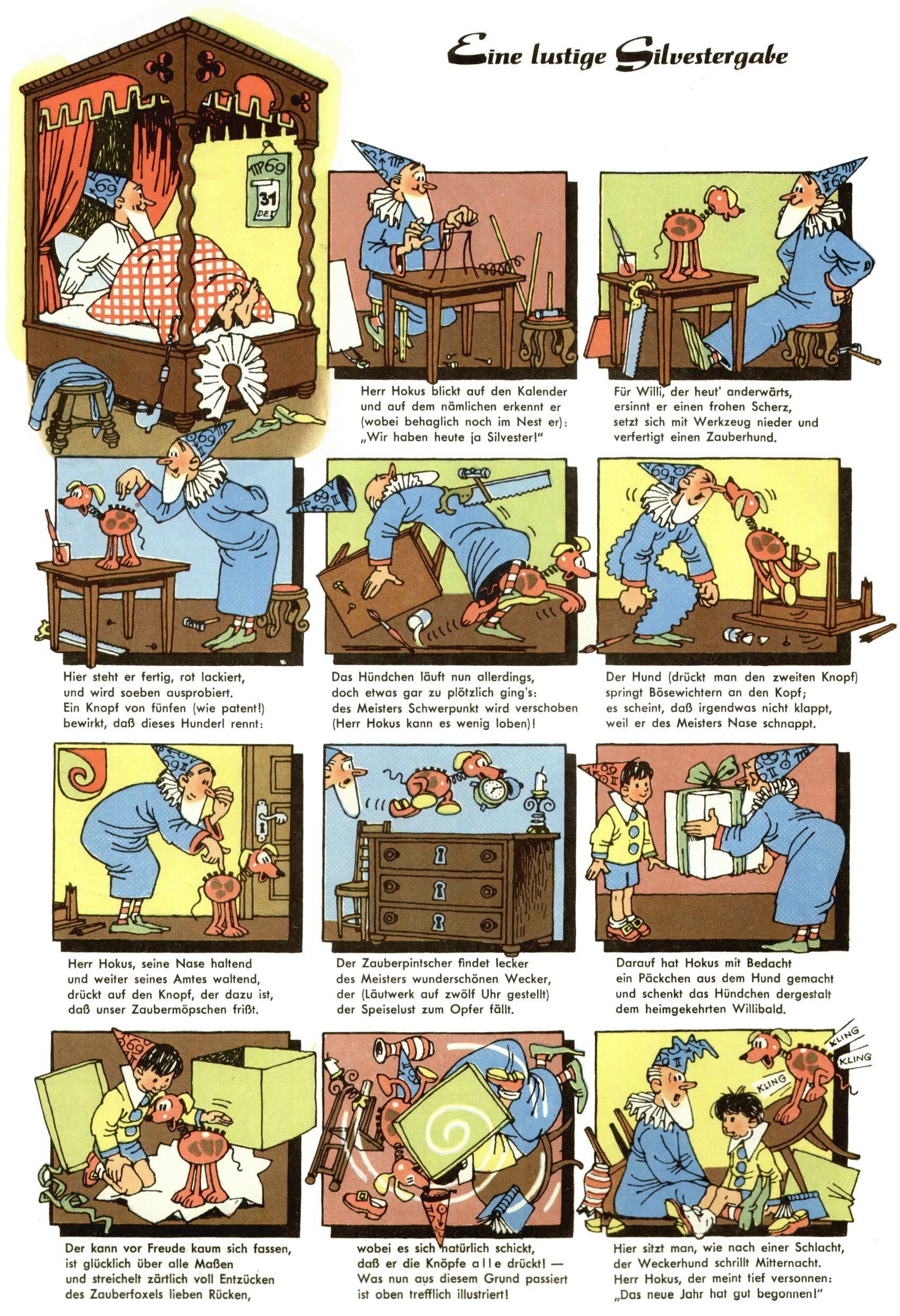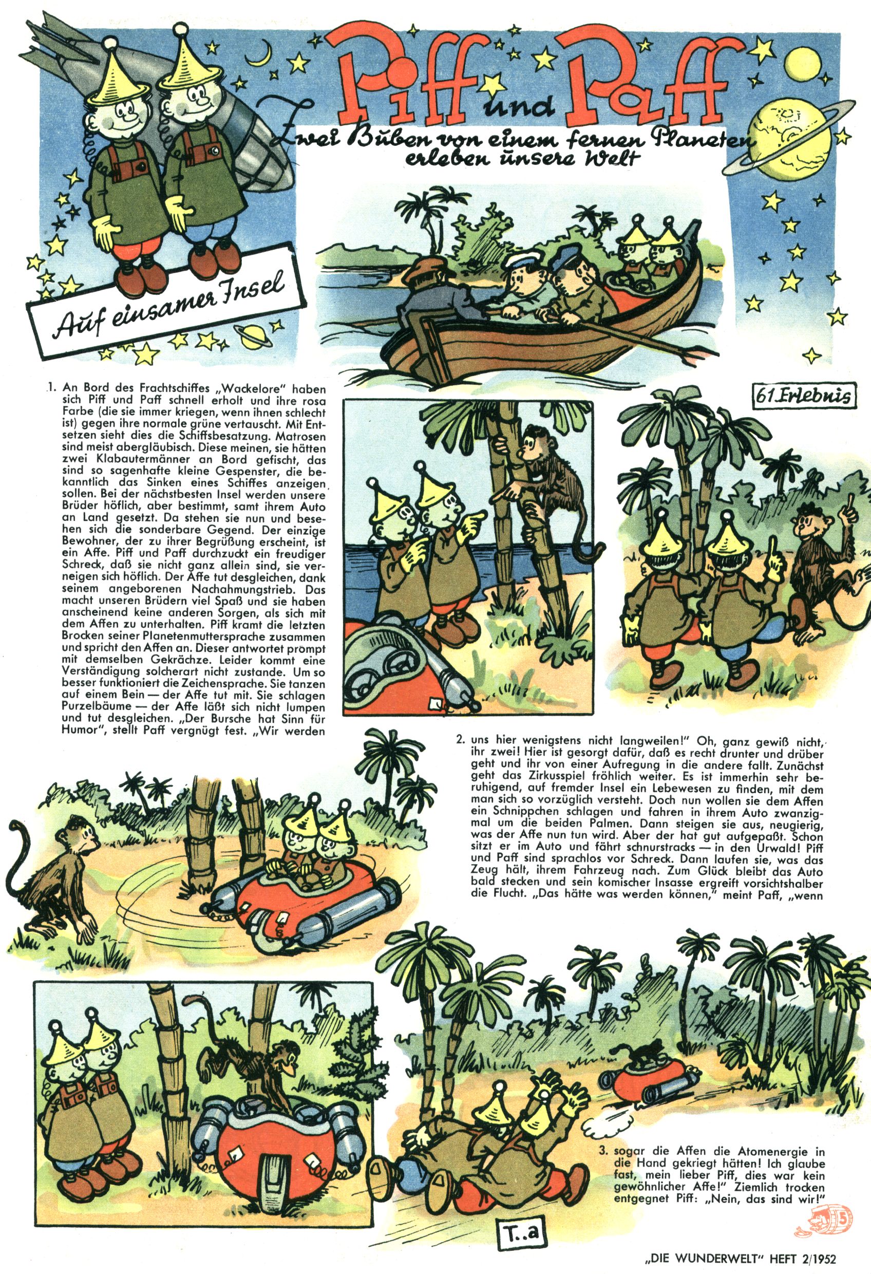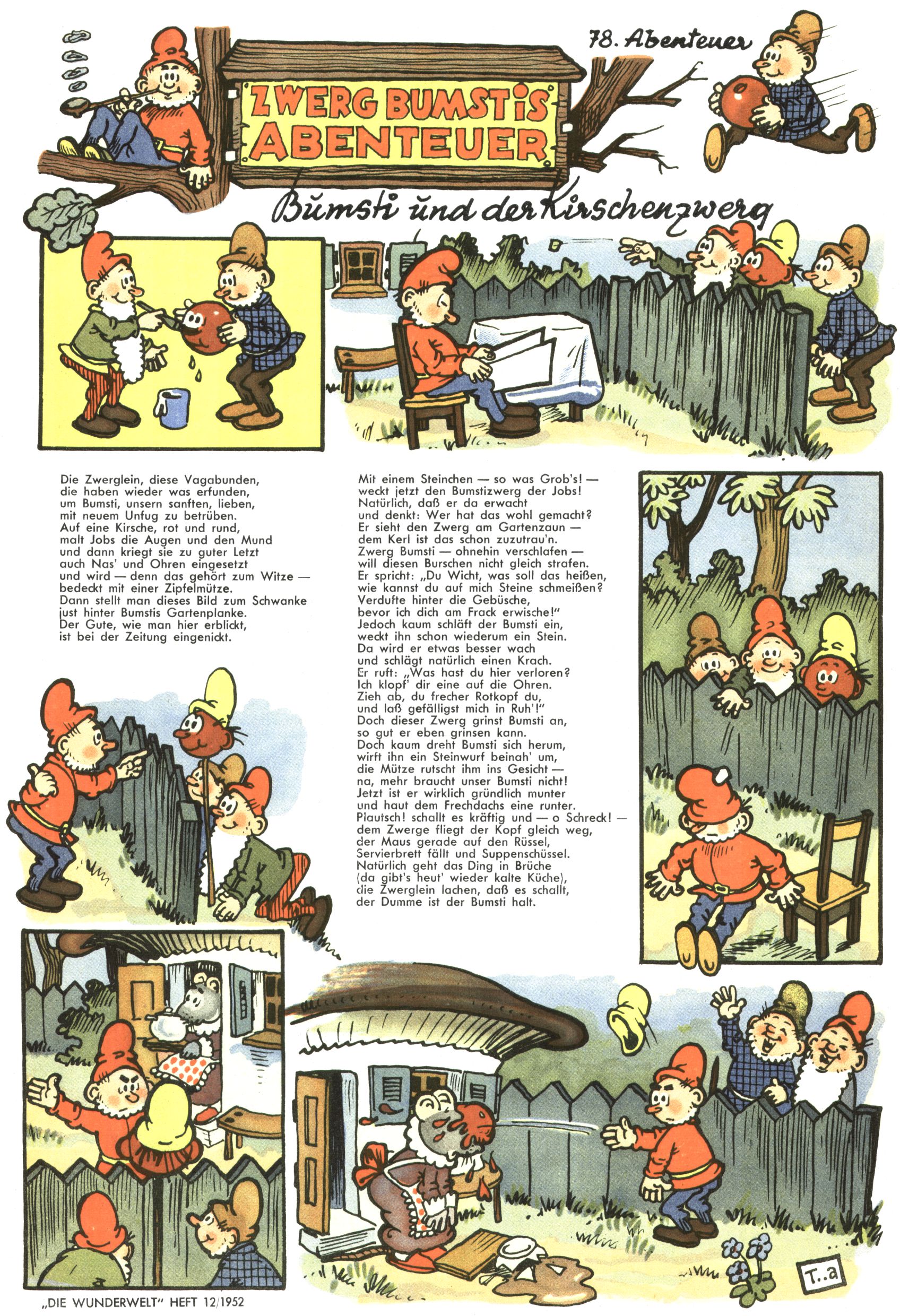 1952 – Der Erfolg hält an Wem Erfolg zuteil wird, der hat wenig Anlass, sein Konzept zu ändern. Und das war in gewisser Weise auch gut so bei allen inhaltlichen Schwächen der Beiträge in der Wunderwelt 1952. Der Erfolg der Zeitung wurde in erster Linie von der grafischen Umsetzung getragen; die lieblichen Bilder einer heilen Märchenwelt ließen über die oft flauen, pädagogisch teilweise sogar fragwürdigen Texte hinwegsehen. Elfriede Vavrovsky schrieb fast alle Texte und Rosl Warzilek zeichnete immer mehr Titelbilder und Mittelmärchen. ABC Peter Paul Prinz hatte Ende 1951 Meister Hokus als komischen Widerpart vom Zauberlehrling Willibald entdeckt und perfektionierte diesen Dualismus nun immer mehr. Meister Hokus avancierte zur regelmäßigen Lachnummer. Dafür überließ ABC vorübergehend Teja Aicher die Gestaltung der technischen Seite, dessen Zwerg Bumsti ebenfalls bereits untrennbar mit der Wunderwelt verbunden schien und längst zum Markenzeichen aufgestiegen war. Seine ko(s)mischen Superhelden Piff und Paff hatten jedoch allmählich genug von den Menschen und kehrten der Erde den Rücken zu. Für den Einsatz im Schulunterricht wurden weiterhin von Elfriede Vavrovsky erstellte politische und geografische Daten und Karten gedruckt, was gerne angenommen wurde, denn teure Atlanten gab es 1952 noch wenige, als viele politische Grenzen gar nicht endgültig geklärt schienen. |