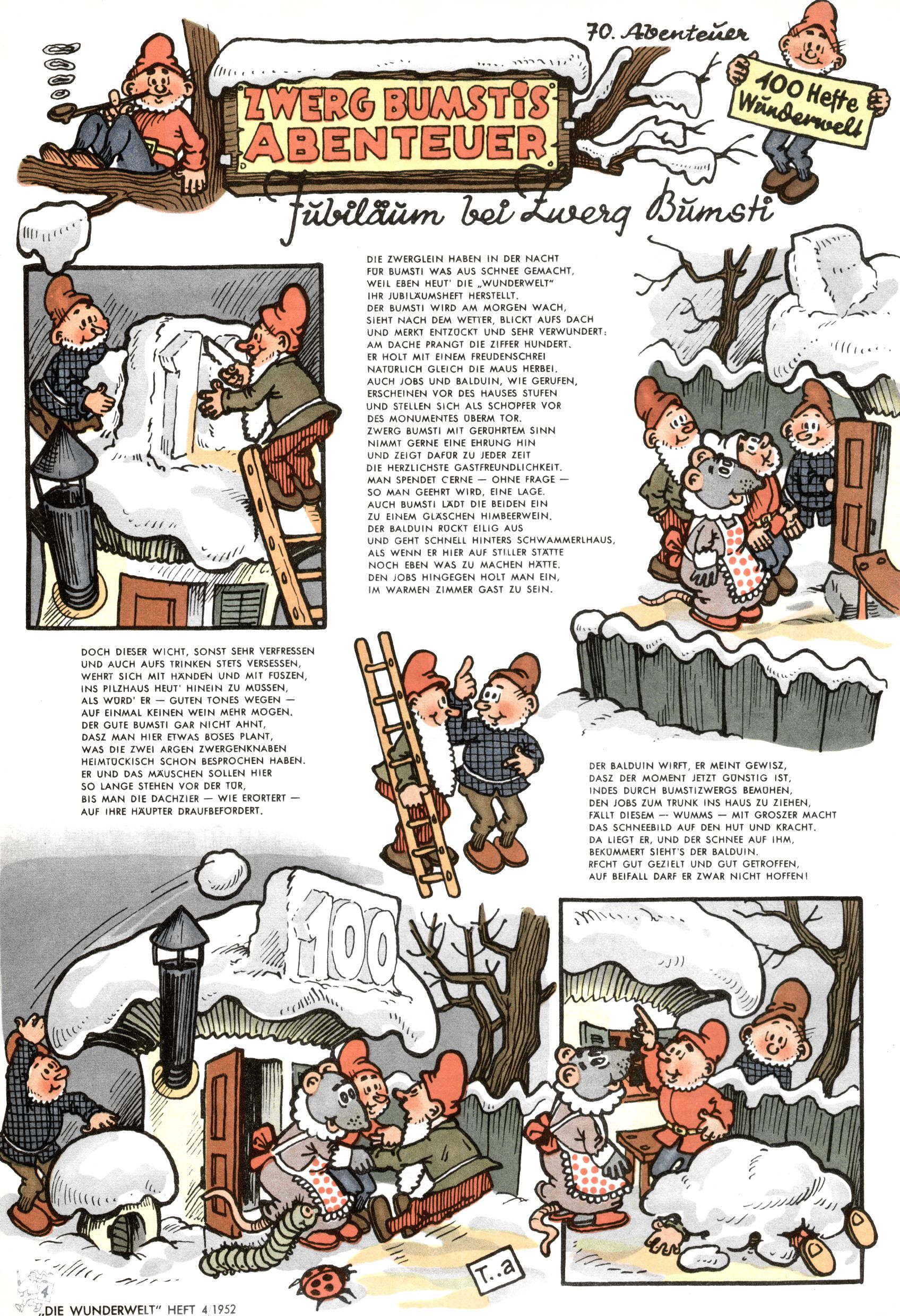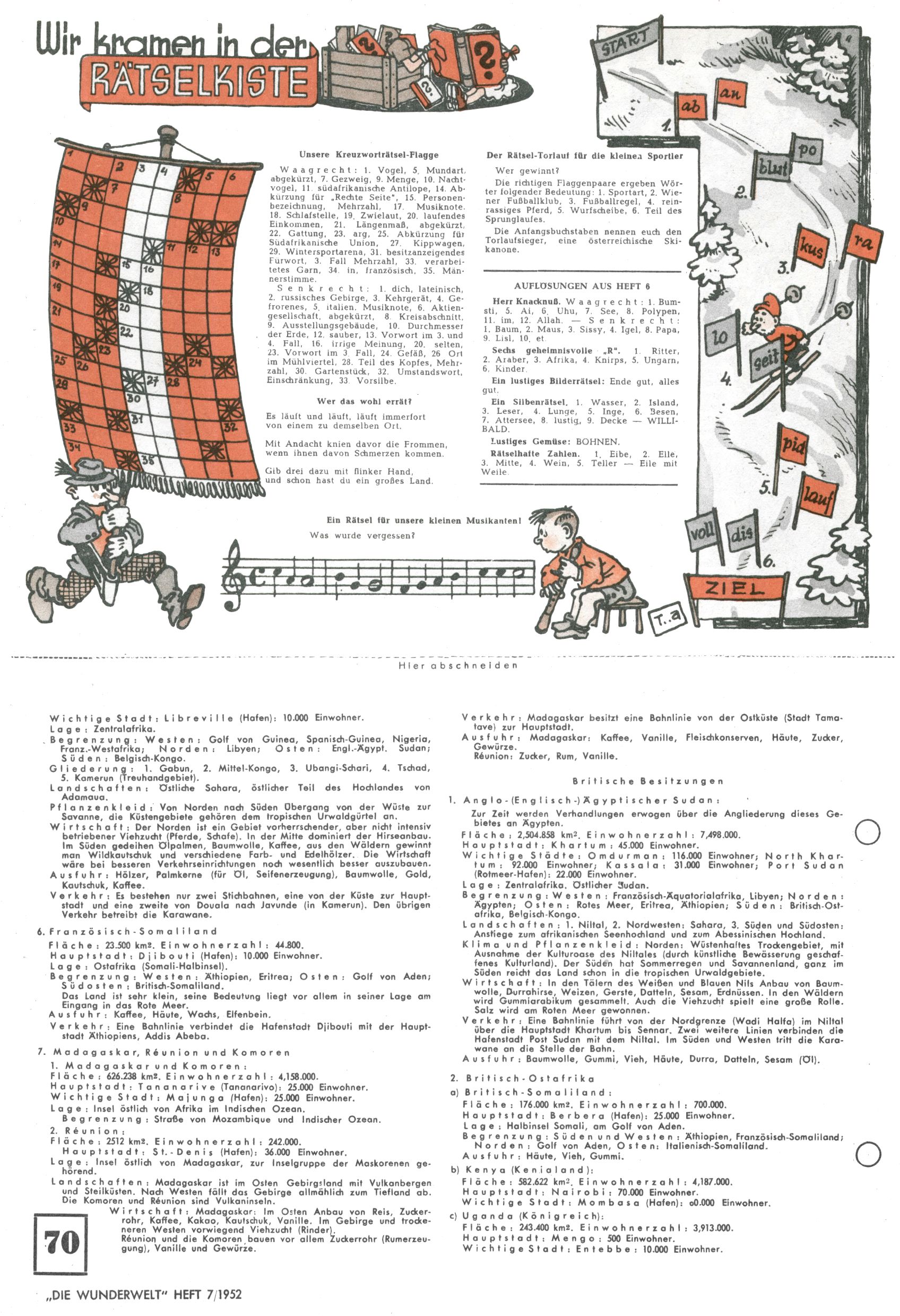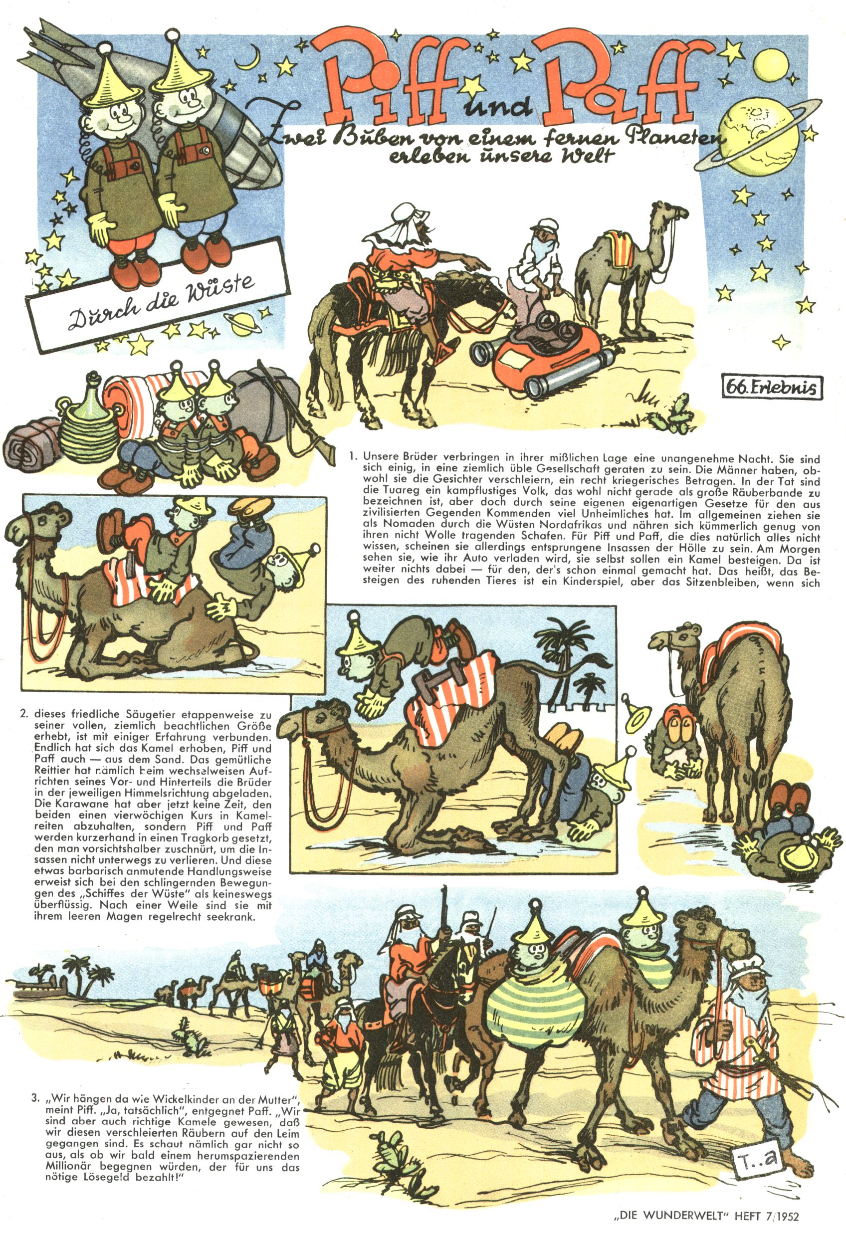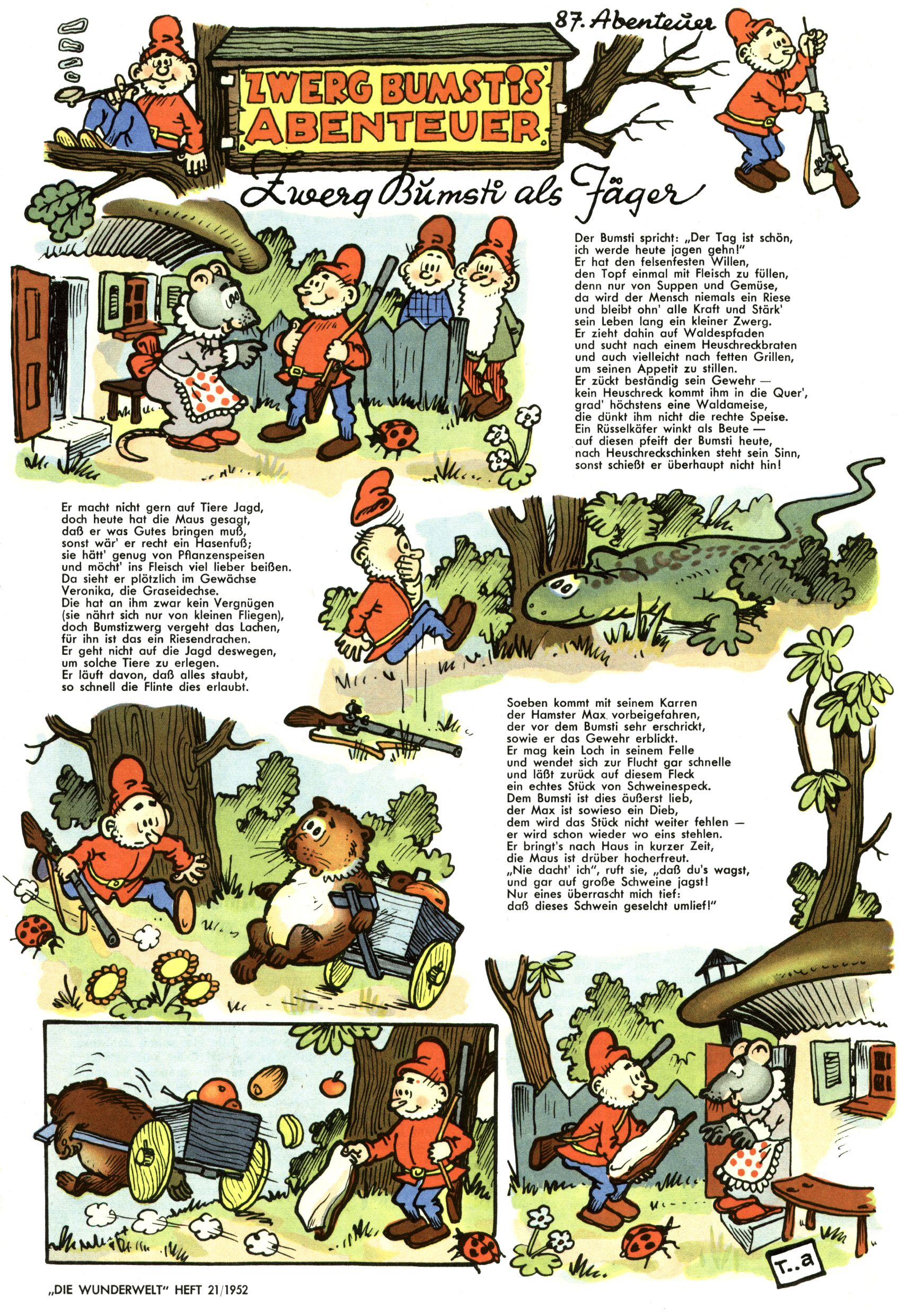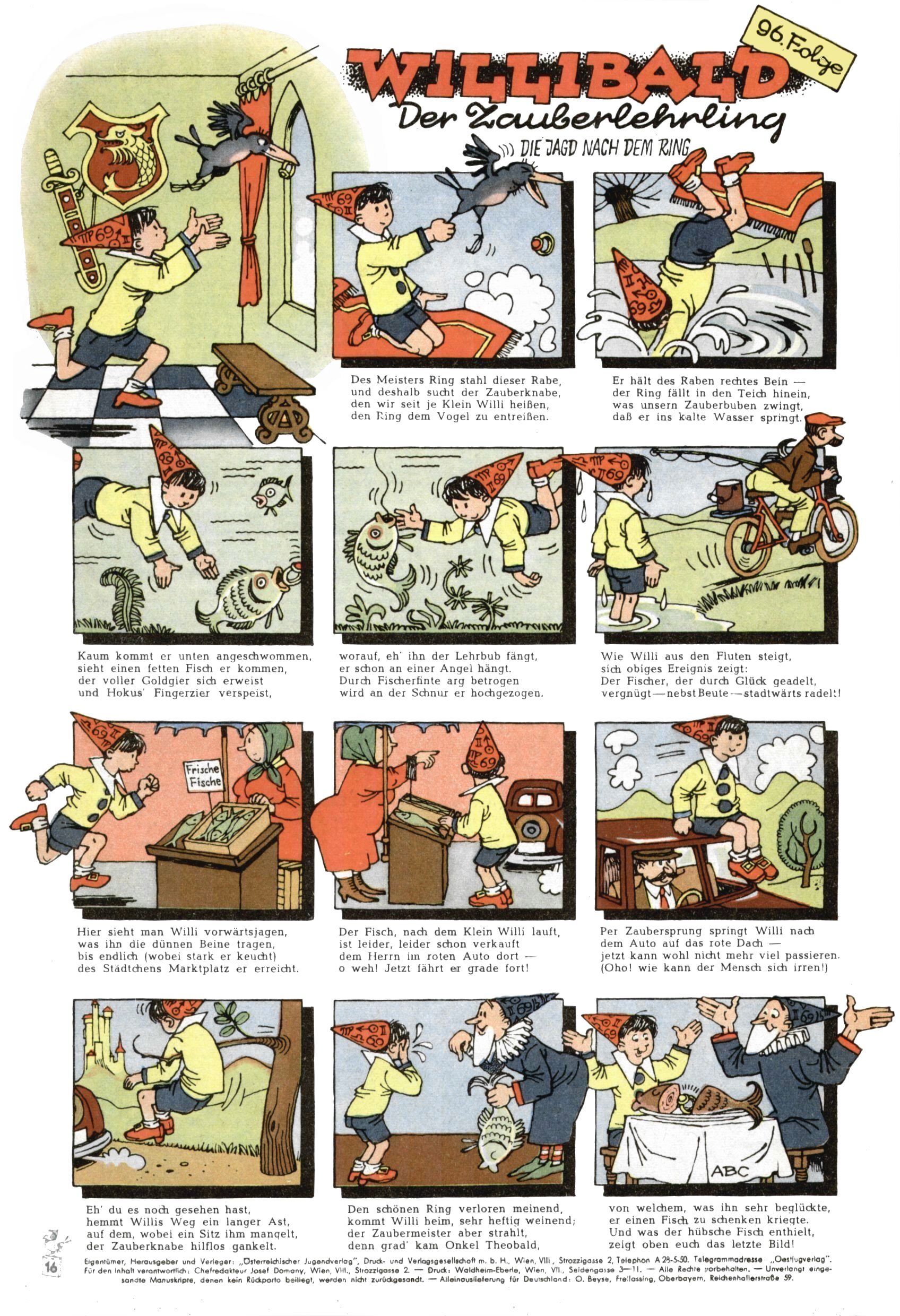 1952 – Der Erfolg hält an Wem Erfolg zuteil wird, der hat wenig Anlass, sein Konzept zu ändern. Und das war in gewisser Weise auch gut so bei allen inhaltlichen Schwächen der Beiträge in der Wunderwelt 1952. Der Erfolg der Zeitung wurde in erster Linie von der grafischen Umsetzung getragen; die lieblichen Bilder einer heilen Märchenwelt ließen über die oft flauen, pädagogisch teilweise sogar fragwürdigen Texte hinwegsehen. Elfriede Vavrovsky schrieb fast alle Texte und Rosl Warzilek zeichnete immer mehr Titelbilder und Mittelmärchen. ABC Peter Paul Prinz hatte Ende 1951 Meister Hokus als komischen Widerpart vom Zauberlehrling Willibald entdeckt und perfektionierte diesen Dualismus nun immer mehr. Meister Hokus avancierte zur regelmäßigen Lachnummer. Dafür überließ ABC vorübergehend Teja Aicher die Gestaltung der technischen Seite, dessen Zwerg Bumsti ebenfalls bereits untrennbar mit der Wunderwelt verbunden schien und längst zum Markenzeichen aufgestiegen war. Seine ko(s)mischen Superhelden Piff und Paff hatten jedoch allmählich genug von den Menschen und kehrten der Erde den Rücken zu. Für den Einsatz im Schulunterricht wurden weiterhin von Elfriede Vavrovsky erstellte politische und geografische Daten und Karten gedruckt, was gerne angenommen wurde, denn teure Atlanten gab es 1952 noch wenige, als viele politische Grenzen gar nicht endgültig geklärt schienen. |