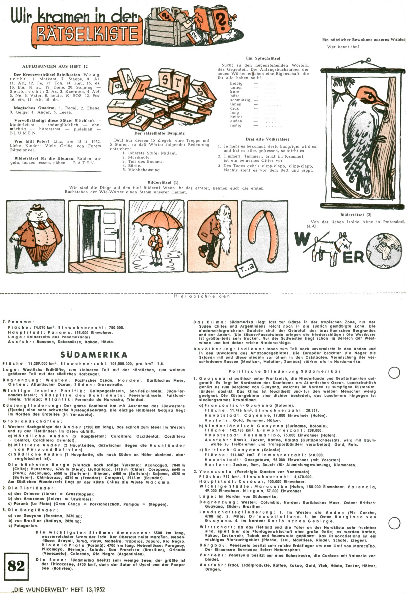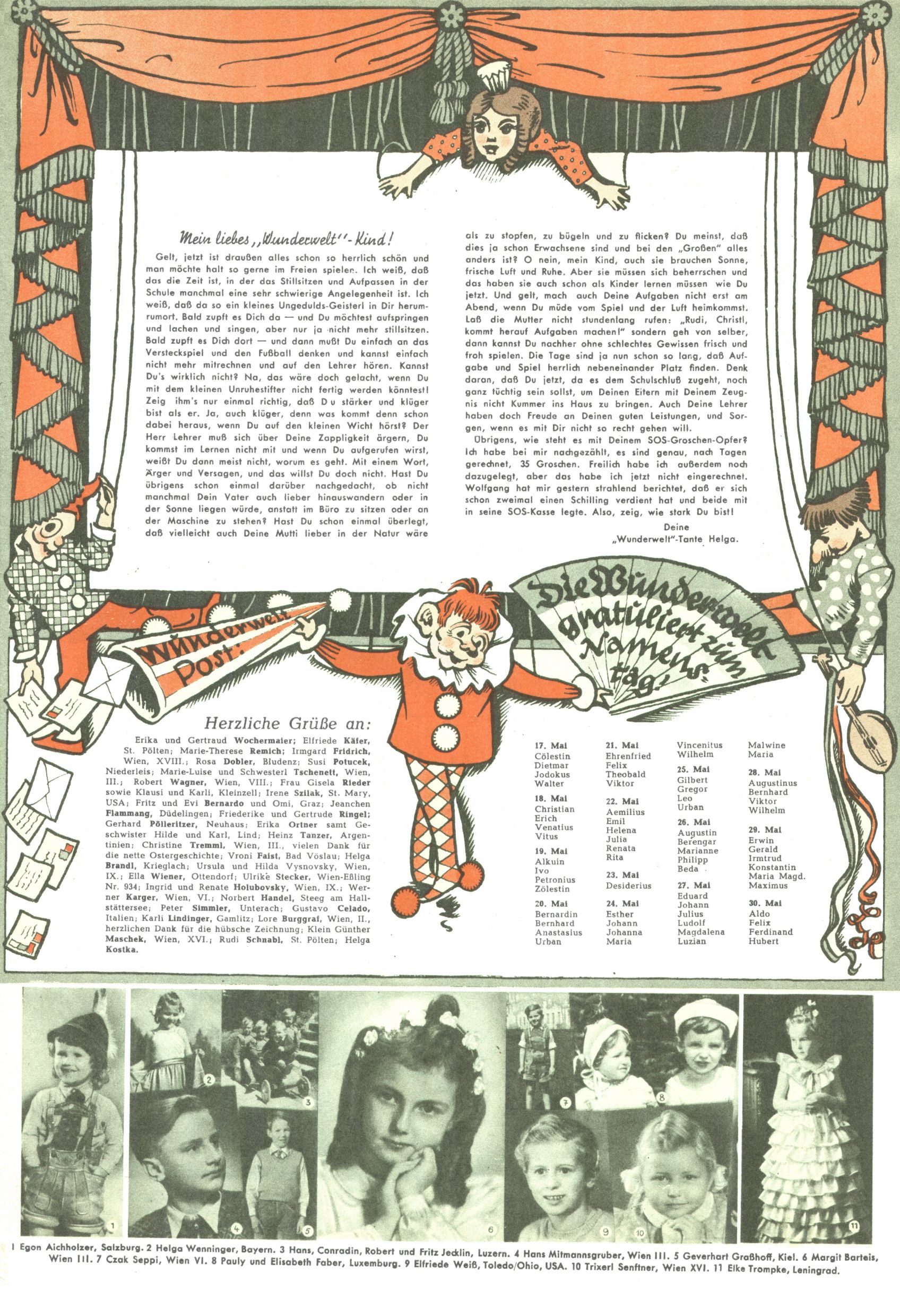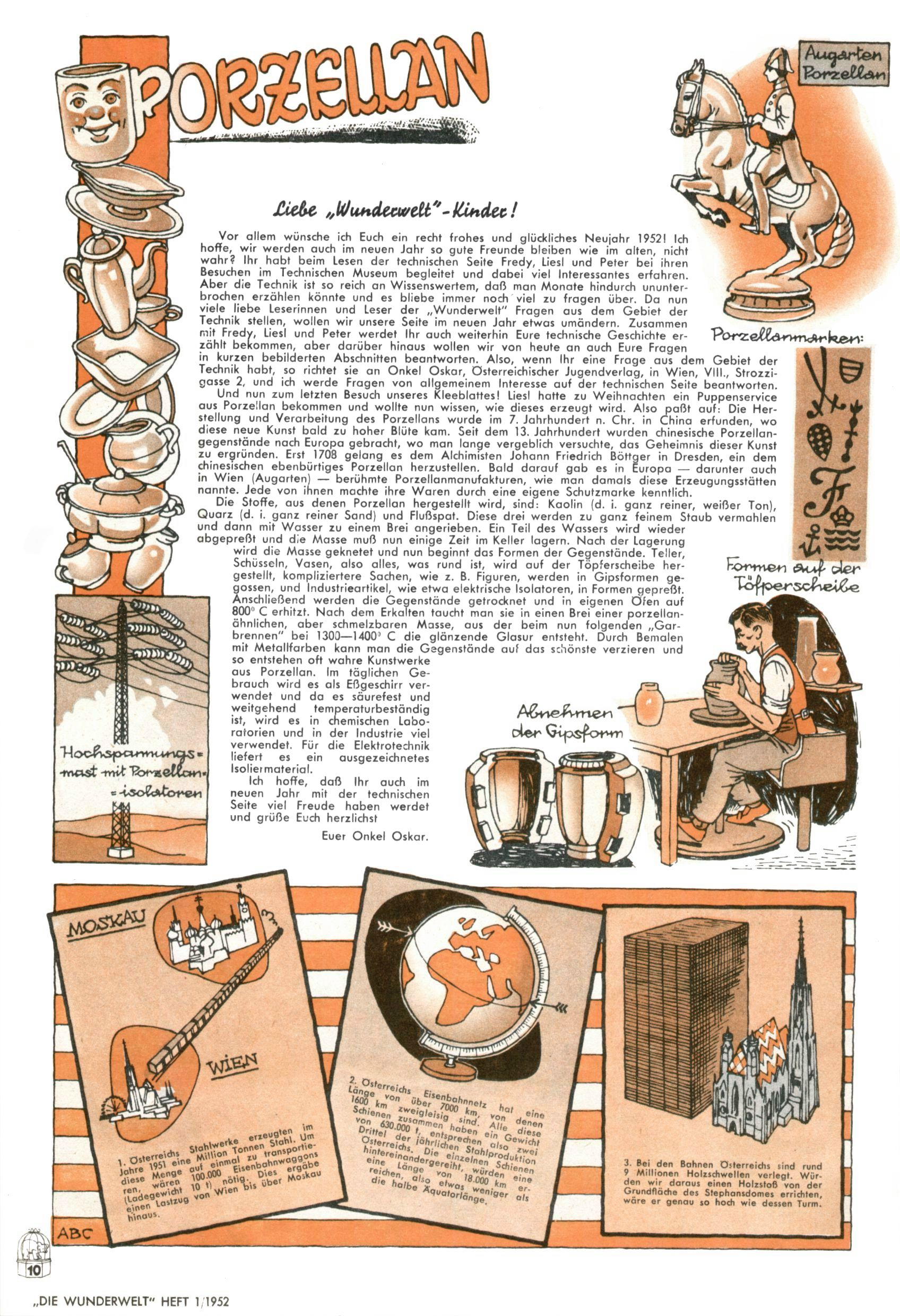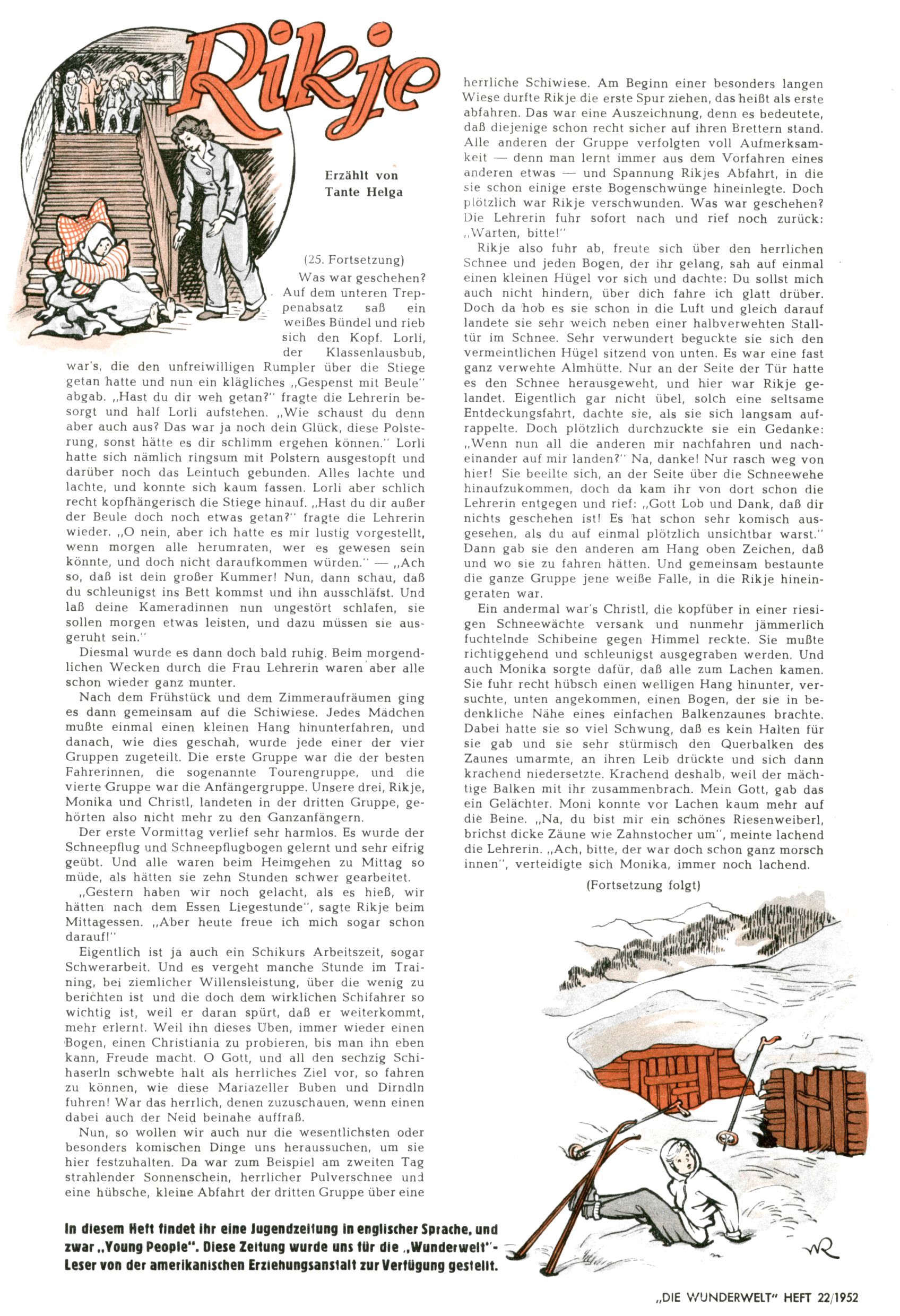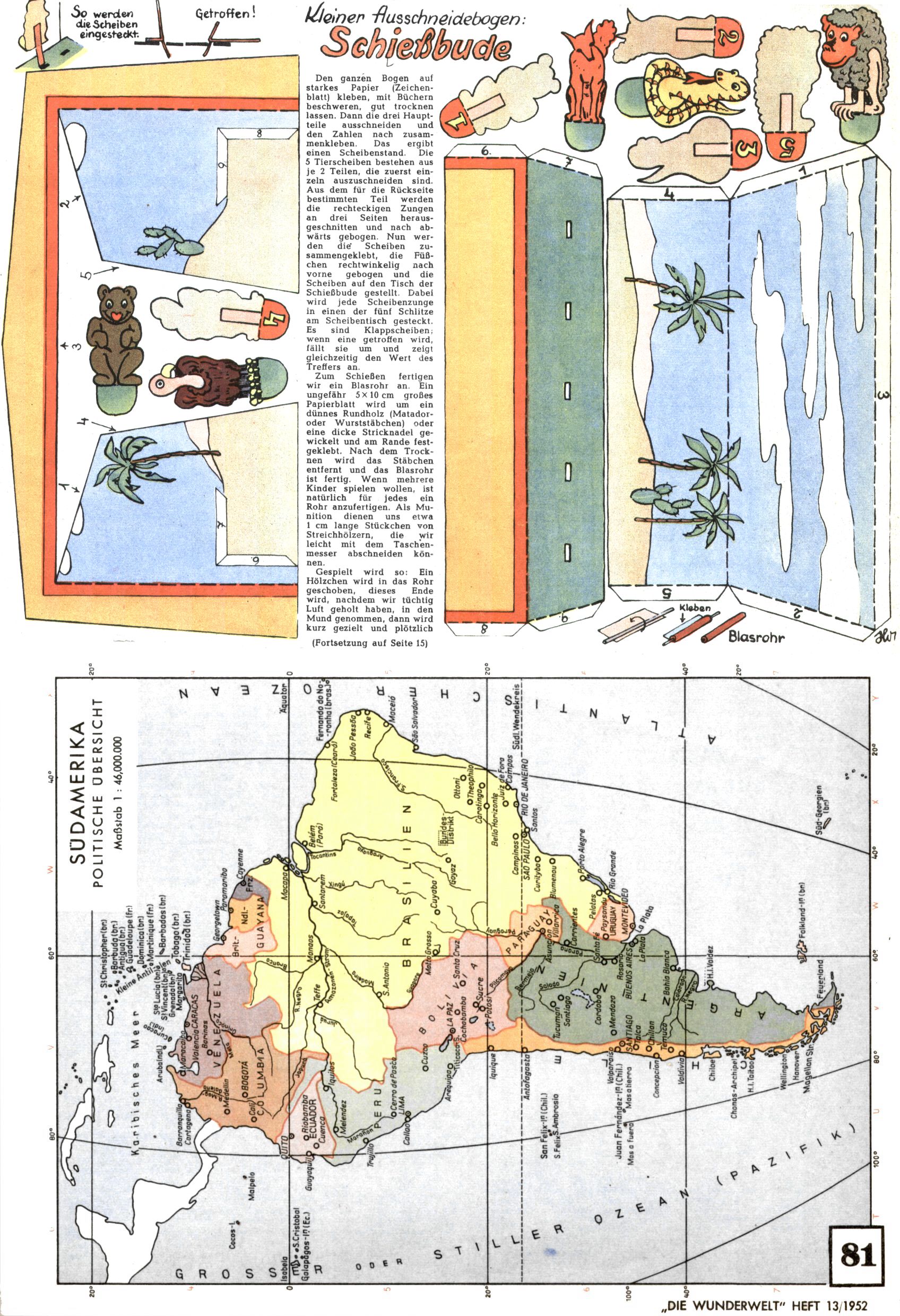 1952 – Der Erfolg hält an Wem Erfolg zuteil wird, der hat wenig Anlass, sein Konzept zu ändern. Und das war in gewisser Weise auch gut so bei allen inhaltlichen Schwächen der Beiträge in der Wunderwelt 1952. Der Erfolg der Zeitung wurde in erster Linie von der grafischen Umsetzung getragen; die lieblichen Bilder einer heilen Märchenwelt ließen über die oft flauen, pädagogisch teilweise sogar fragwürdigen Texte hinwegsehen. Elfriede Vavrovsky schrieb fast alle Texte und Rosl Warzilek zeichnete immer mehr Titelbilder und Mittelmärchen. ABC Peter Paul Prinz hatte Ende 1951 Meister Hokus als komischen Widerpart vom Zauberlehrling Willibald entdeckt und perfektionierte diesen Dualismus nun immer mehr. Meister Hokus avancierte zur regelmäßigen Lachnummer. Dafür überließ ABC vorübergehend Teja Aicher die Gestaltung der technischen Seite, dessen Zwerg Bumsti ebenfalls bereits untrennbar mit der Wunderwelt verbunden schien und längst zum Markenzeichen aufgestiegen war. Seine ko(s)mischen Superhelden Piff und Paff hatten jedoch allmählich genug von den Menschen und kehrten der Erde den Rücken zu. Für den Einsatz im Schulunterricht wurden weiterhin von Elfriede Vavrovsky erstellte politische und geografische Daten und Karten gedruckt, was gerne angenommen wurde, denn teure Atlanten gab es 1952 noch wenige, als viele politische Grenzen gar nicht endgültig geklärt schienen. |