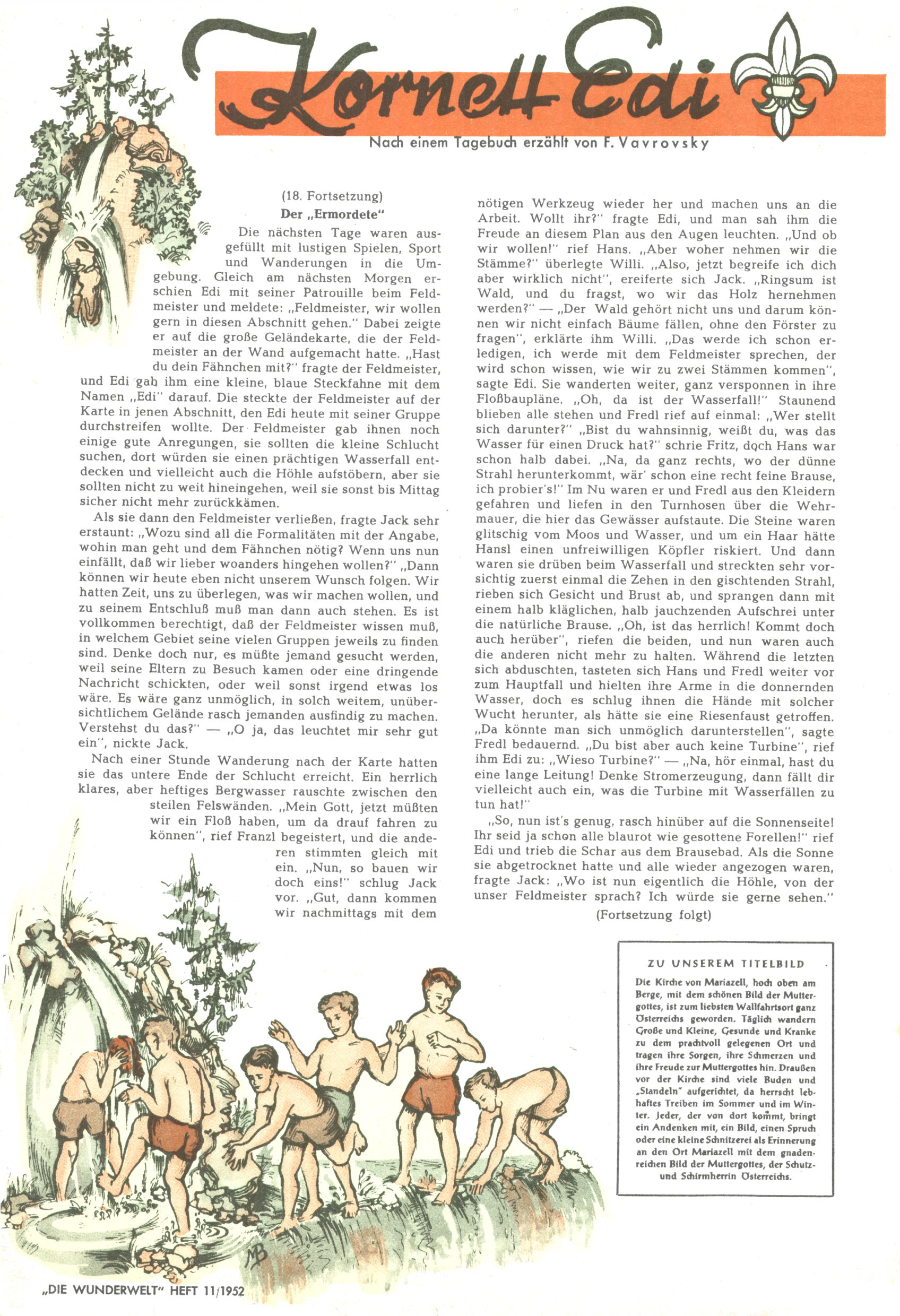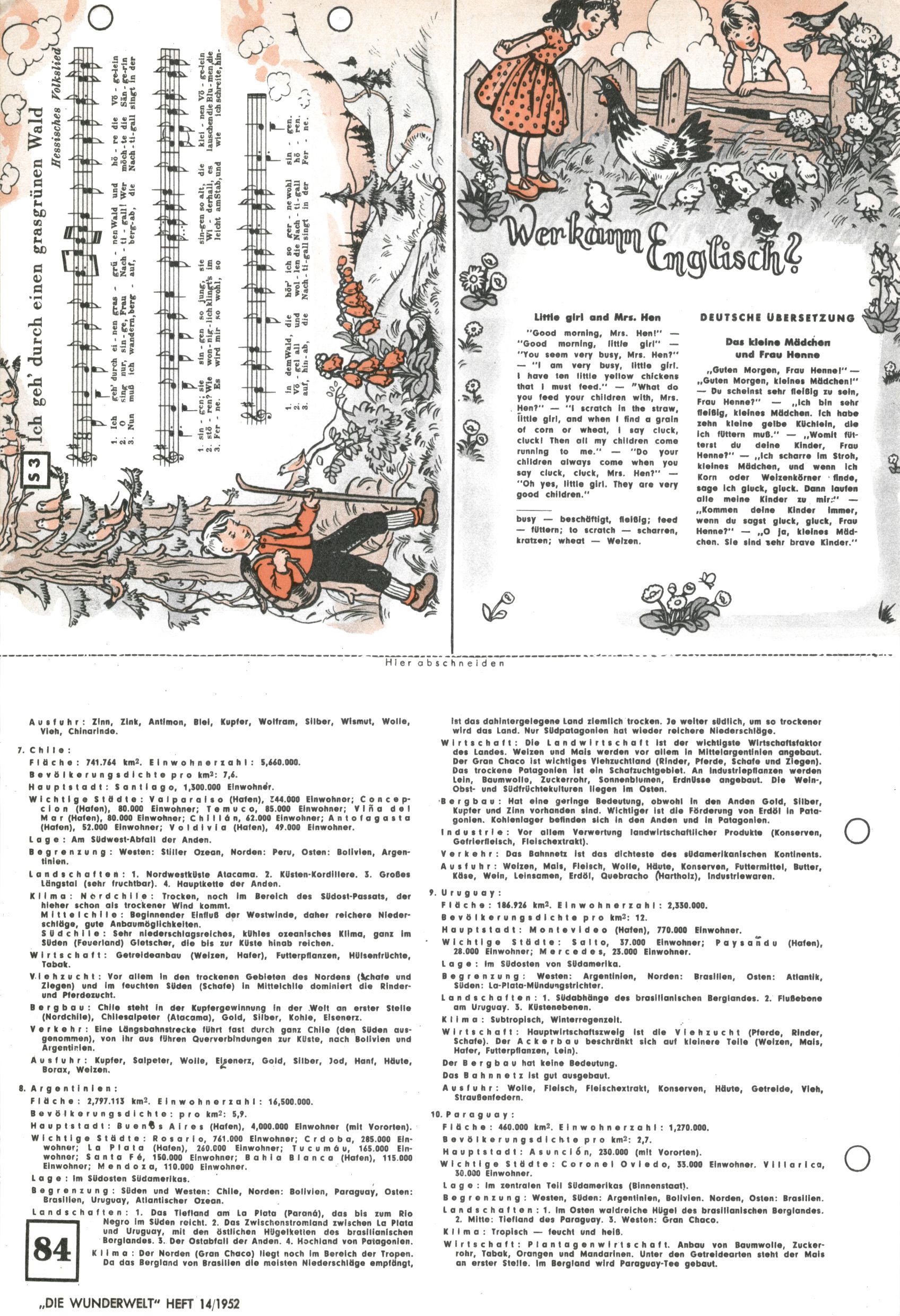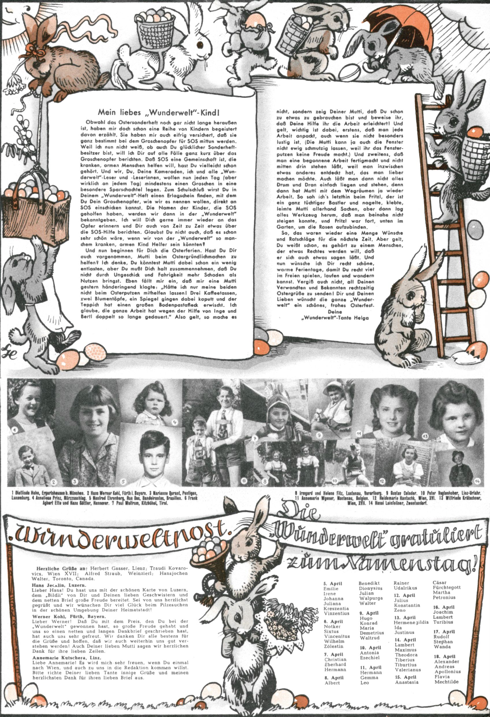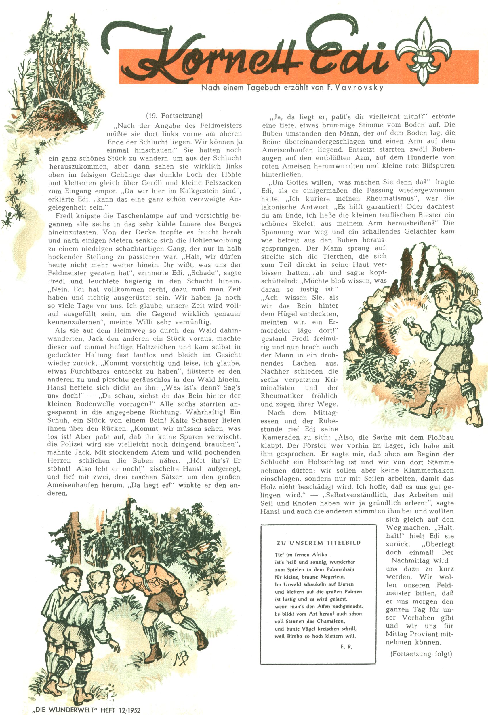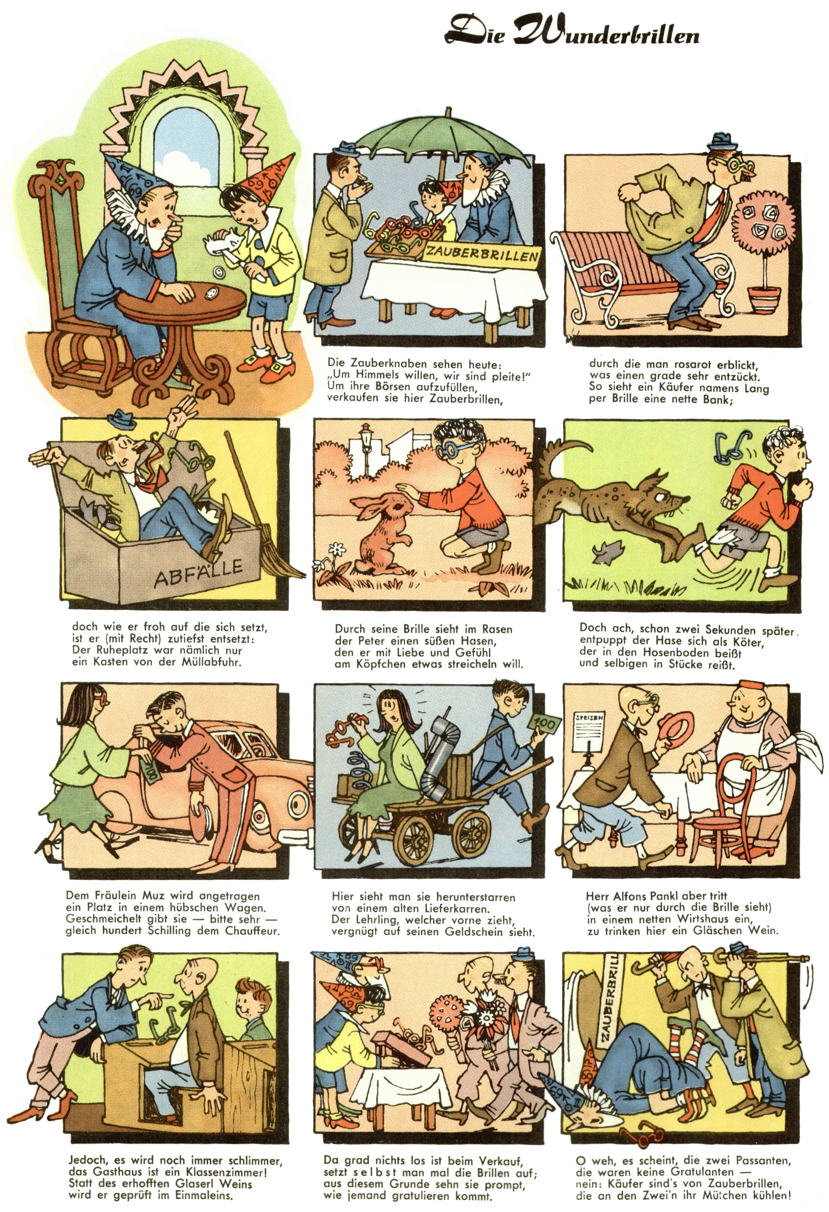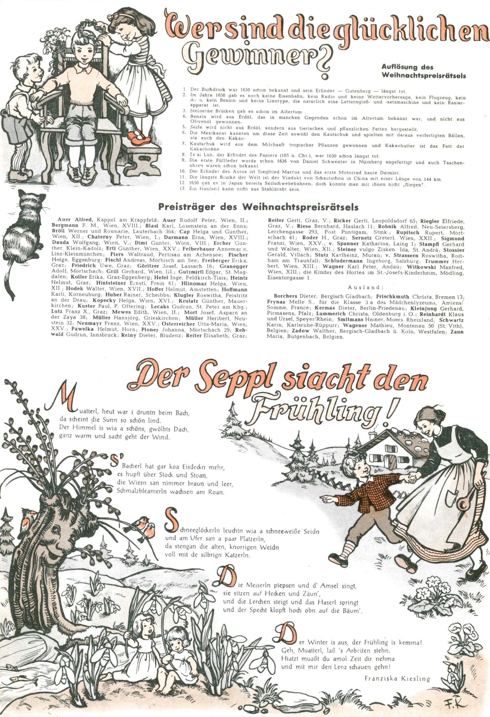 1952 – Der Erfolg hält an Wem Erfolg zuteil wird, der hat wenig Anlass, sein Konzept zu ändern. Und das war in gewisser Weise auch gut so bei allen inhaltlichen Schwächen der Beiträge in der Wunderwelt 1952. Der Erfolg der Zeitung wurde in erster Linie von der grafischen Umsetzung getragen; die lieblichen Bilder einer heilen Märchenwelt ließen über die oft flauen, pädagogisch teilweise sogar fragwürdigen Texte hinwegsehen. Elfriede Vavrovsky schrieb fast alle Texte und Rosl Warzilek zeichnete immer mehr Titelbilder und Mittelmärchen. ABC Peter Paul Prinz hatte Ende 1951 Meister Hokus als komischen Widerpart vom Zauberlehrling Willibald entdeckt und perfektionierte diesen Dualismus nun immer mehr. Meister Hokus avancierte zur regelmäßigen Lachnummer. Dafür überließ ABC vorübergehend Teja Aicher die Gestaltung der technischen Seite, dessen Zwerg Bumsti ebenfalls bereits untrennbar mit der Wunderwelt verbunden schien und längst zum Markenzeichen aufgestiegen war. Seine ko(s)mischen Superhelden Piff und Paff hatten jedoch allmählich genug von den Menschen und kehrten der Erde den Rücken zu. Für den Einsatz im Schulunterricht wurden weiterhin von Elfriede Vavrovsky erstellte politische und geografische Daten und Karten gedruckt, was gerne angenommen wurde, denn teure Atlanten gab es 1952 noch wenige, als viele politische Grenzen gar nicht endgültig geklärt schienen. |