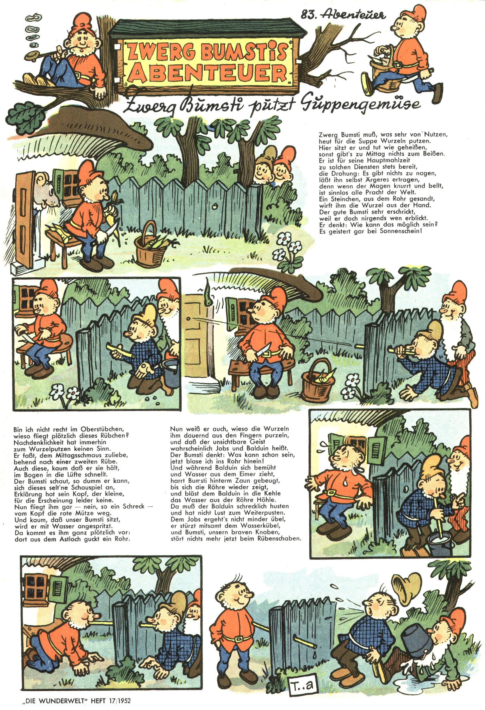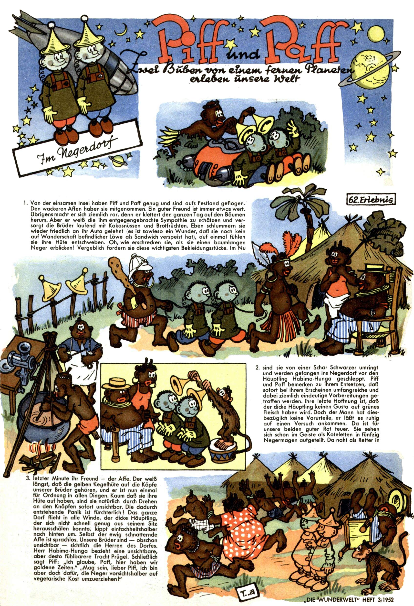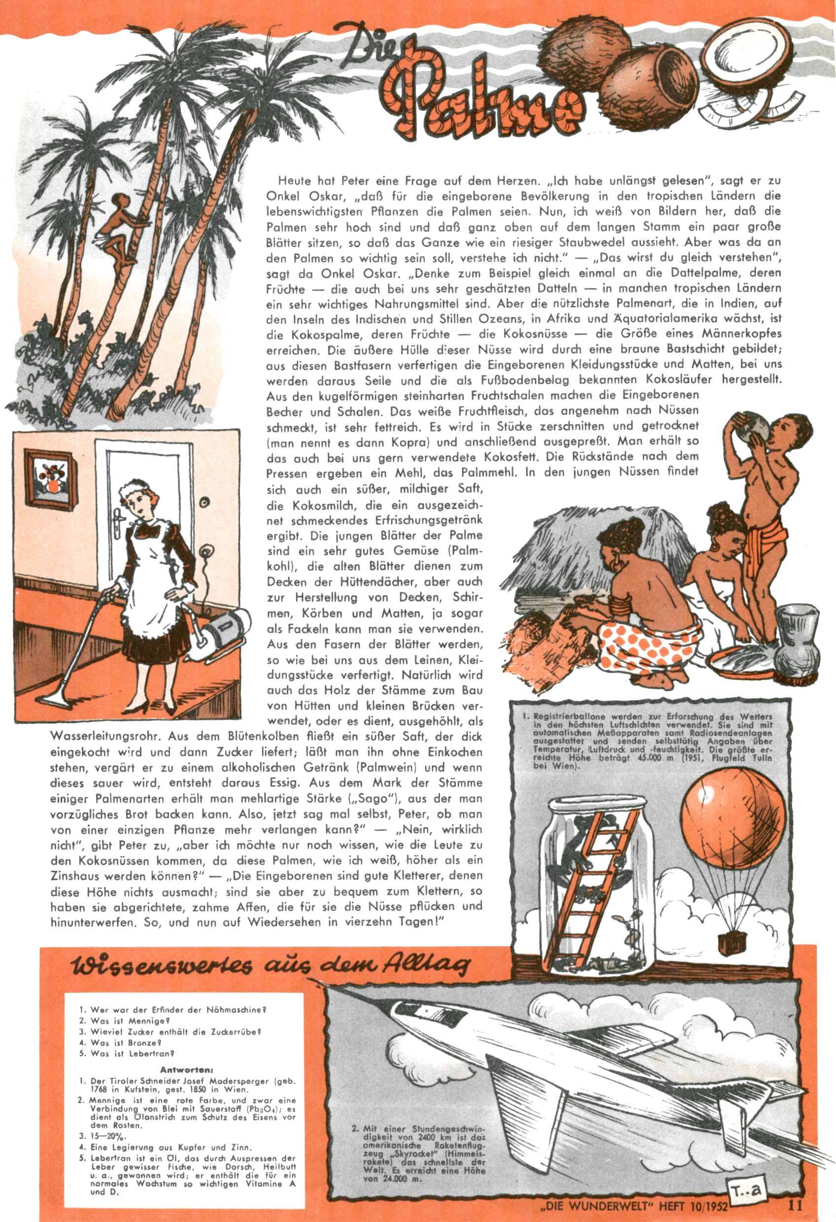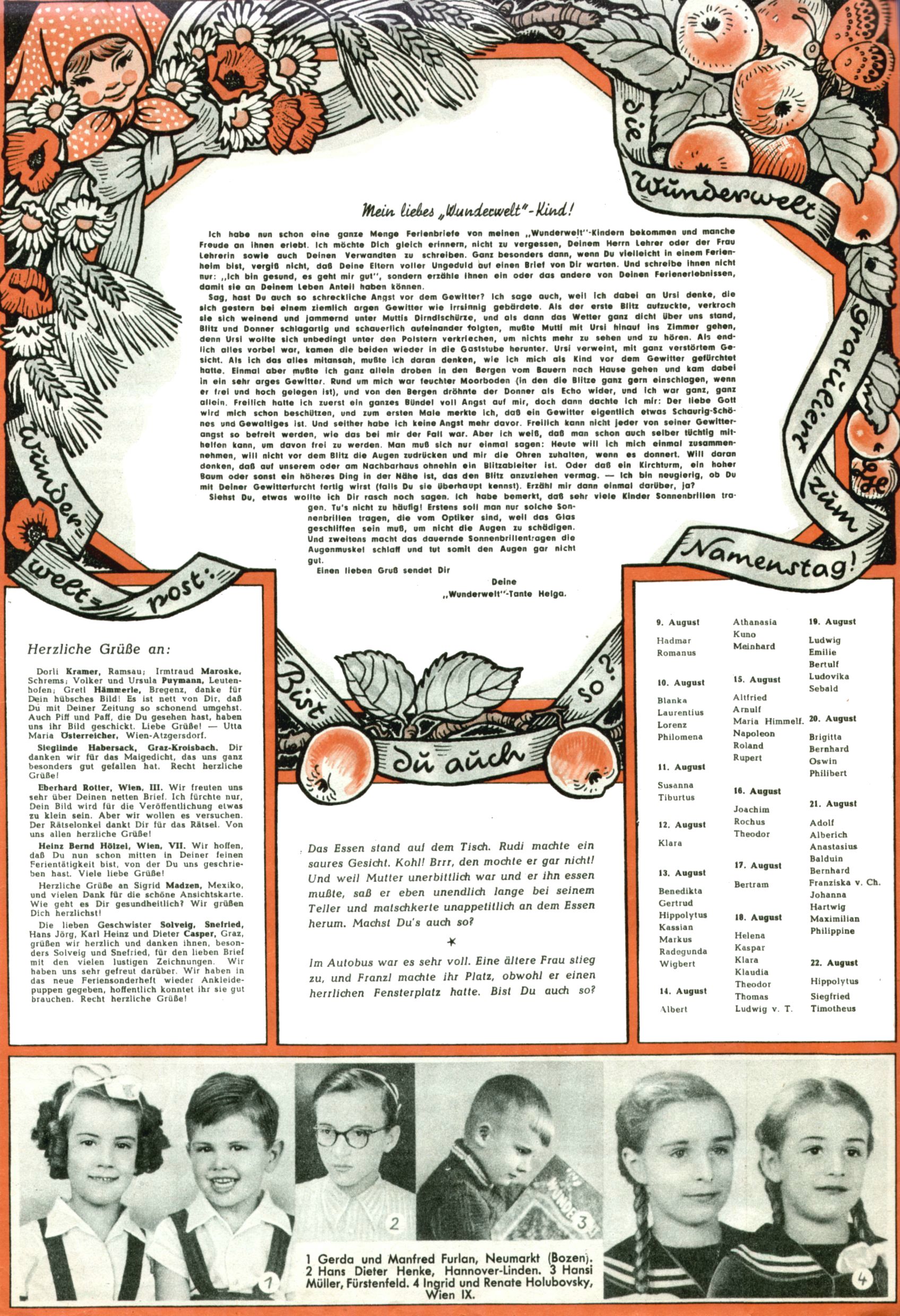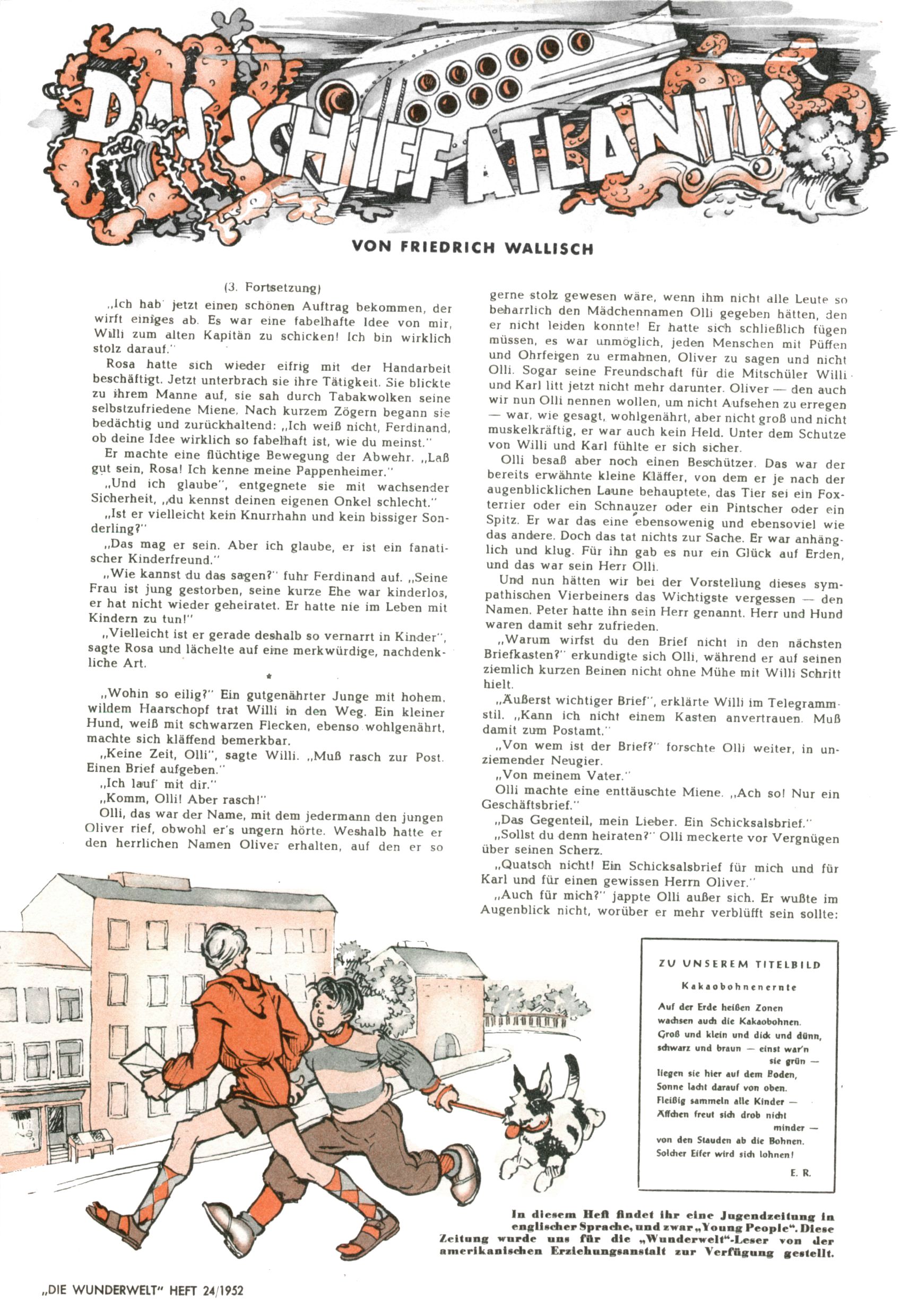 1952 – Der Erfolg hält an Wem Erfolg zuteil wird, der hat wenig Anlass, sein Konzept zu ändern. Und das war in gewisser Weise auch gut so bei allen inhaltlichen Schwächen der Beiträge in der Wunderwelt 1952. Der Erfolg der Zeitung wurde in erster Linie von der grafischen Umsetzung getragen; die lieblichen Bilder einer heilen Märchenwelt ließen über die oft flauen, pädagogisch teilweise sogar fragwürdigen Texte hinwegsehen. Elfriede Vavrovsky schrieb fast alle Texte und Rosl Warzilek zeichnete immer mehr Titelbilder und Mittelmärchen. ABC Peter Paul Prinz hatte Ende 1951 Meister Hokus als komischen Widerpart vom Zauberlehrling Willibald entdeckt und perfektionierte diesen Dualismus nun immer mehr. Meister Hokus avancierte zur regelmäßigen Lachnummer. Dafür überließ ABC vorübergehend Teja Aicher die Gestaltung der technischen Seite, dessen Zwerg Bumsti ebenfalls bereits untrennbar mit der Wunderwelt verbunden schien und längst zum Markenzeichen aufgestiegen war. Seine ko(s)mischen Superhelden Piff und Paff hatten jedoch allmählich genug von den Menschen und kehrten der Erde den Rücken zu. Für den Einsatz im Schulunterricht wurden weiterhin von Elfriede Vavrovsky erstellte politische und geografische Daten und Karten gedruckt, was gerne angenommen wurde, denn teure Atlanten gab es 1952 noch wenige, als viele politische Grenzen gar nicht endgültig geklärt schienen. |