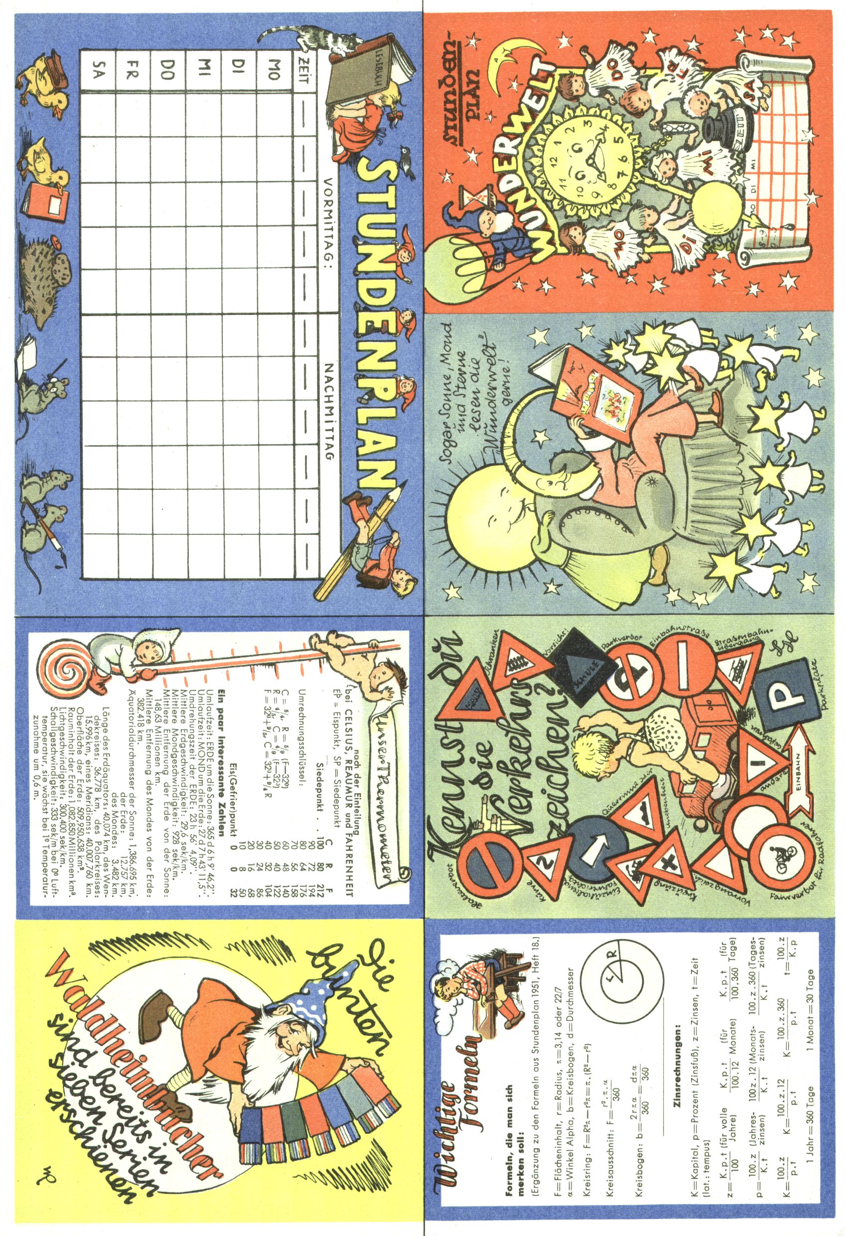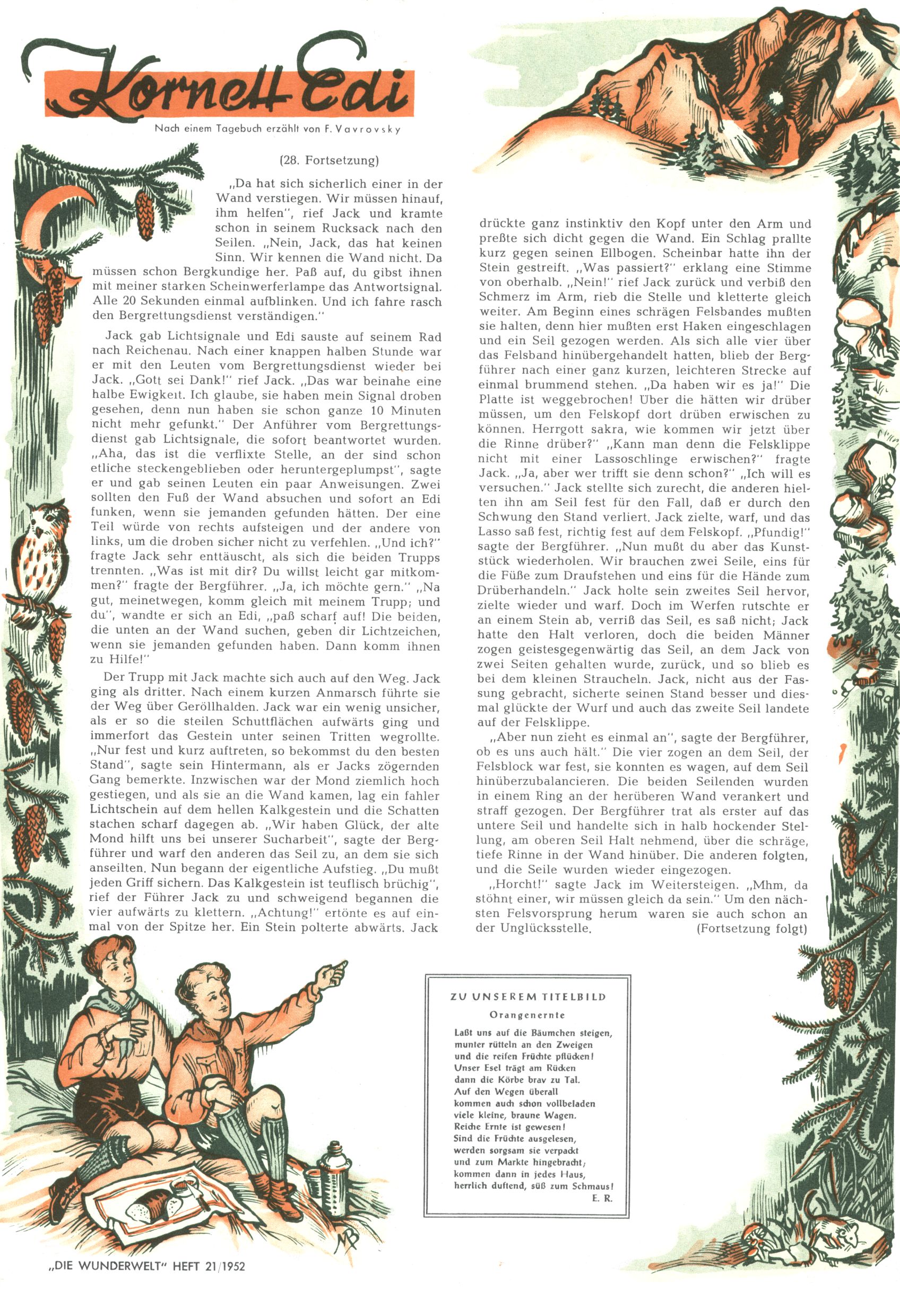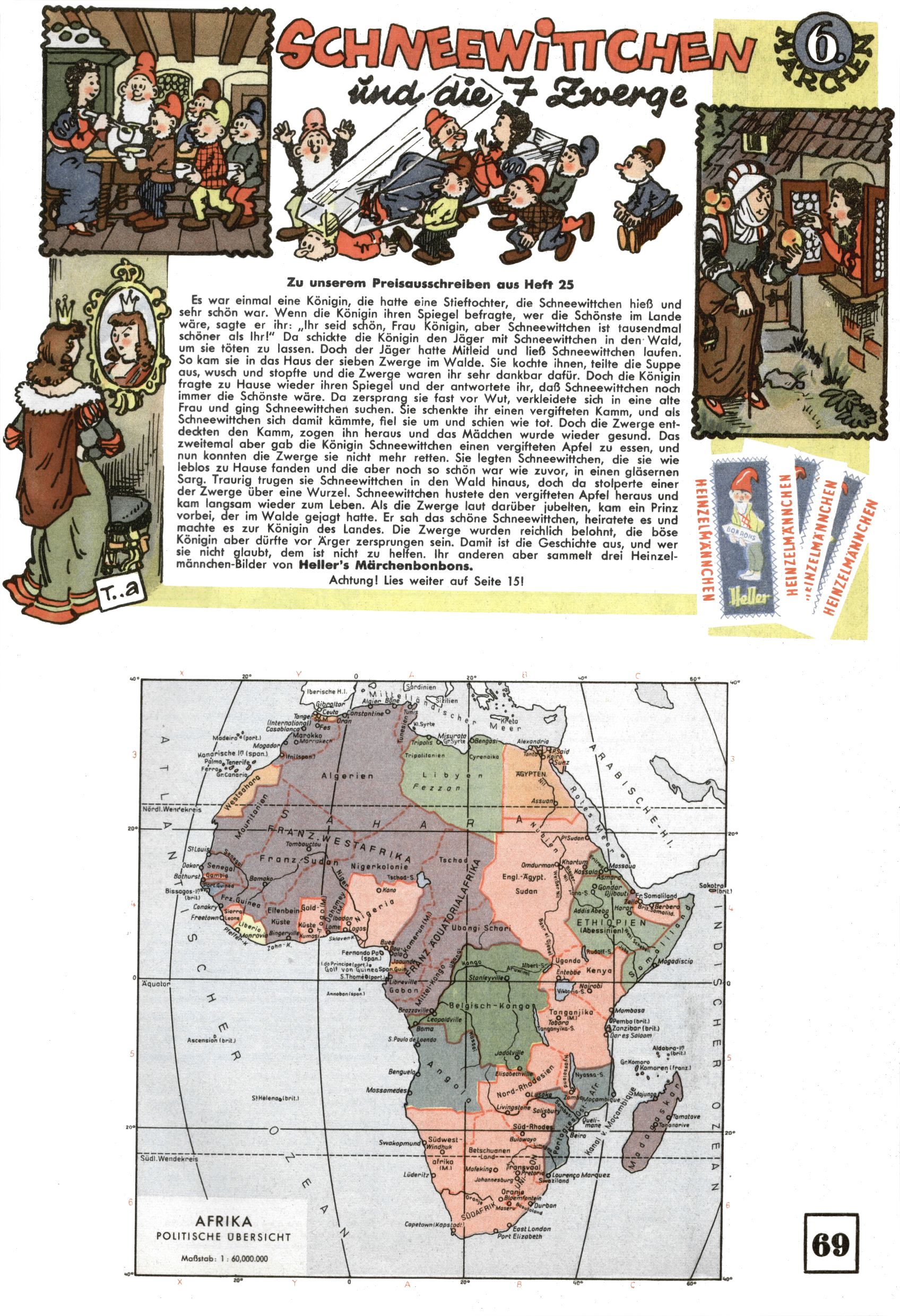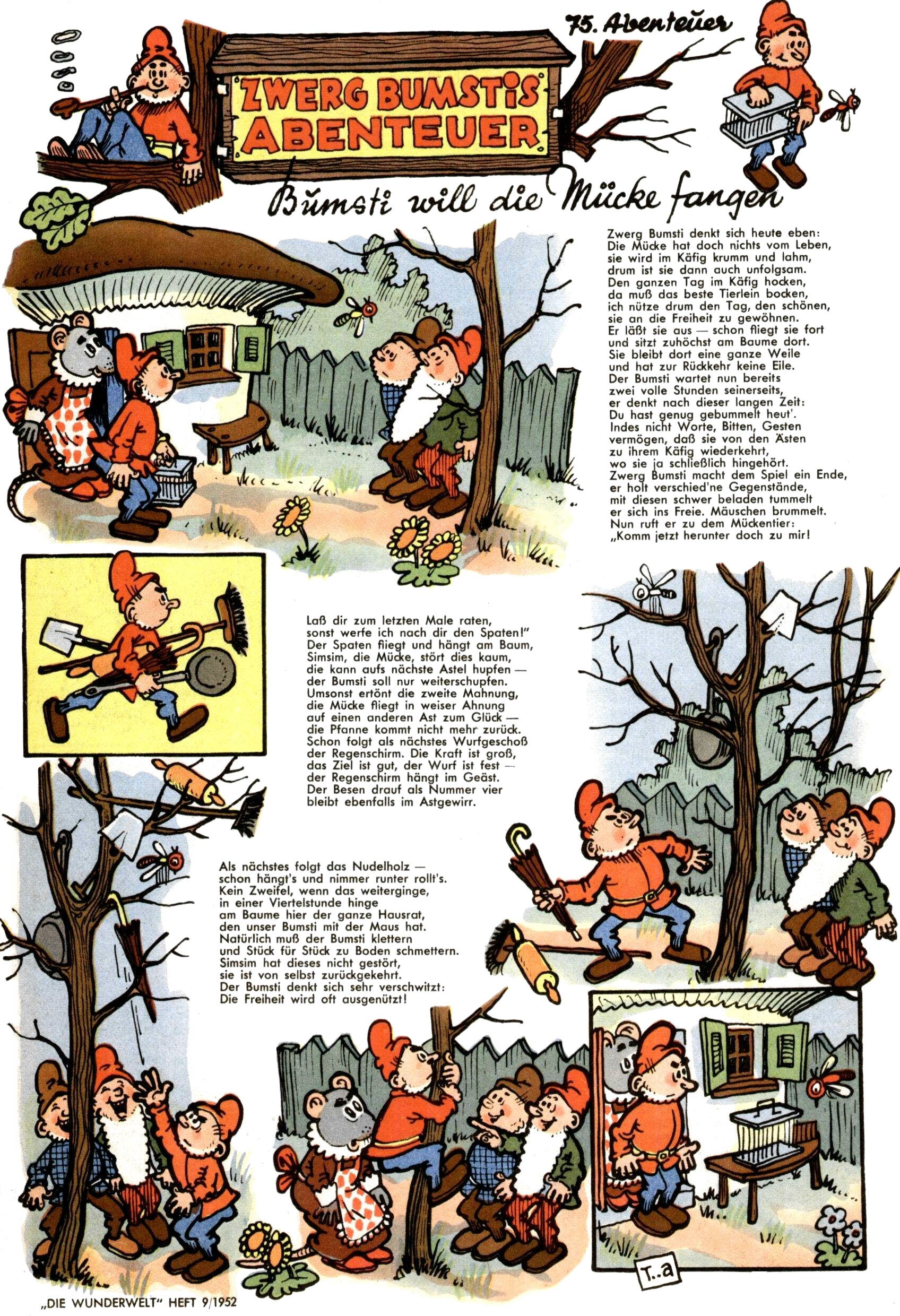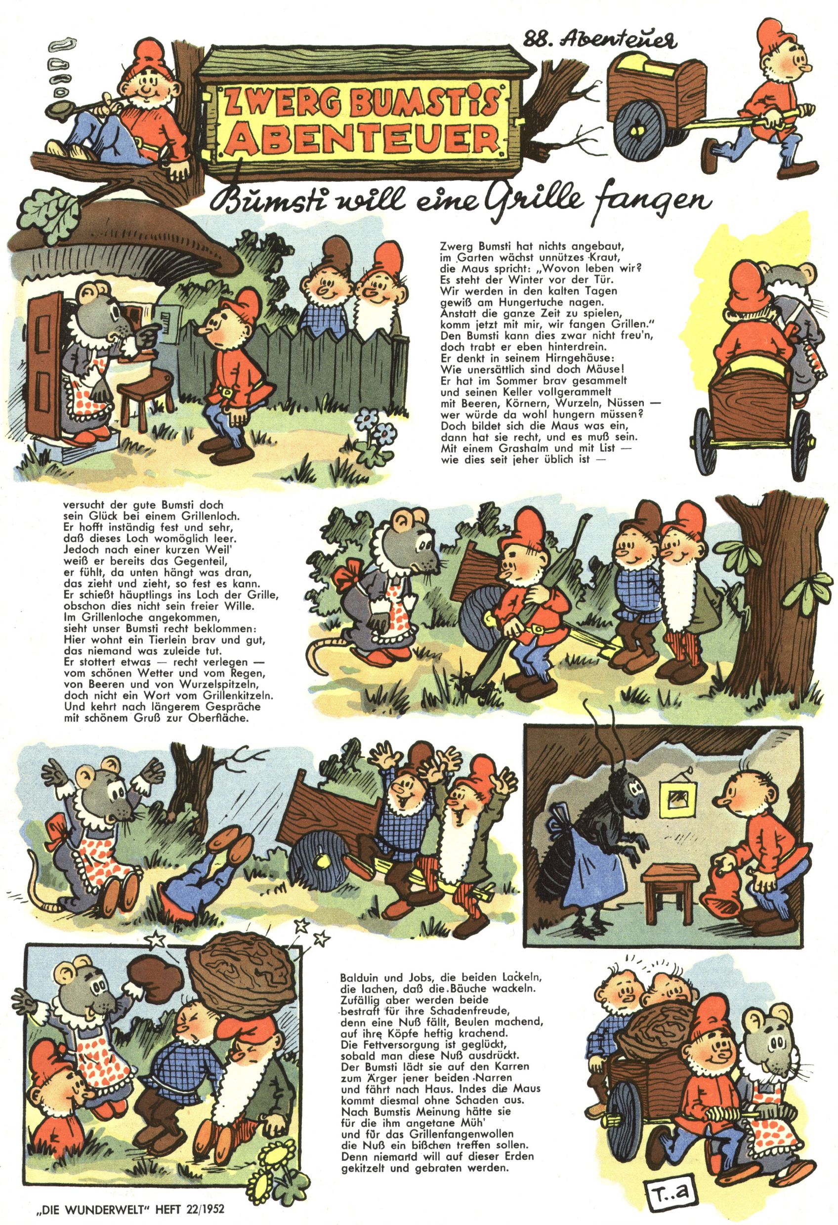 1952 – Der Erfolg hält an Wem Erfolg zuteil wird, der hat wenig Anlass, sein Konzept zu ändern. Und das war in gewisser Weise auch gut so bei allen inhaltlichen Schwächen der Beiträge in der Wunderwelt 1952. Der Erfolg der Zeitung wurde in erster Linie von der grafischen Umsetzung getragen; die lieblichen Bilder einer heilen Märchenwelt ließen über die oft flauen, pädagogisch teilweise sogar fragwürdigen Texte hinwegsehen. Elfriede Vavrovsky schrieb fast alle Texte und Rosl Warzilek zeichnete immer mehr Titelbilder und Mittelmärchen. ABC Peter Paul Prinz hatte Ende 1951 Meister Hokus als komischen Widerpart vom Zauberlehrling Willibald entdeckt und perfektionierte diesen Dualismus nun immer mehr. Meister Hokus avancierte zur regelmäßigen Lachnummer. Dafür überließ ABC vorübergehend Teja Aicher die Gestaltung der technischen Seite, dessen Zwerg Bumsti ebenfalls bereits untrennbar mit der Wunderwelt verbunden schien und längst zum Markenzeichen aufgestiegen war. Seine ko(s)mischen Superhelden Piff und Paff hatten jedoch allmählich genug von den Menschen und kehrten der Erde den Rücken zu. Für den Einsatz im Schulunterricht wurden weiterhin von Elfriede Vavrovsky erstellte politische und geografische Daten und Karten gedruckt, was gerne angenommen wurde, denn teure Atlanten gab es 1952 noch wenige, als viele politische Grenzen gar nicht endgültig geklärt schienen. |