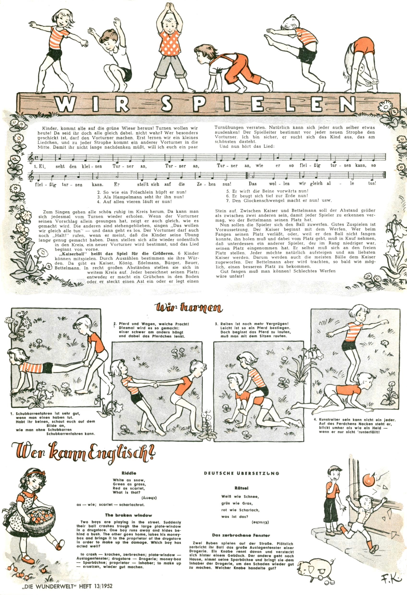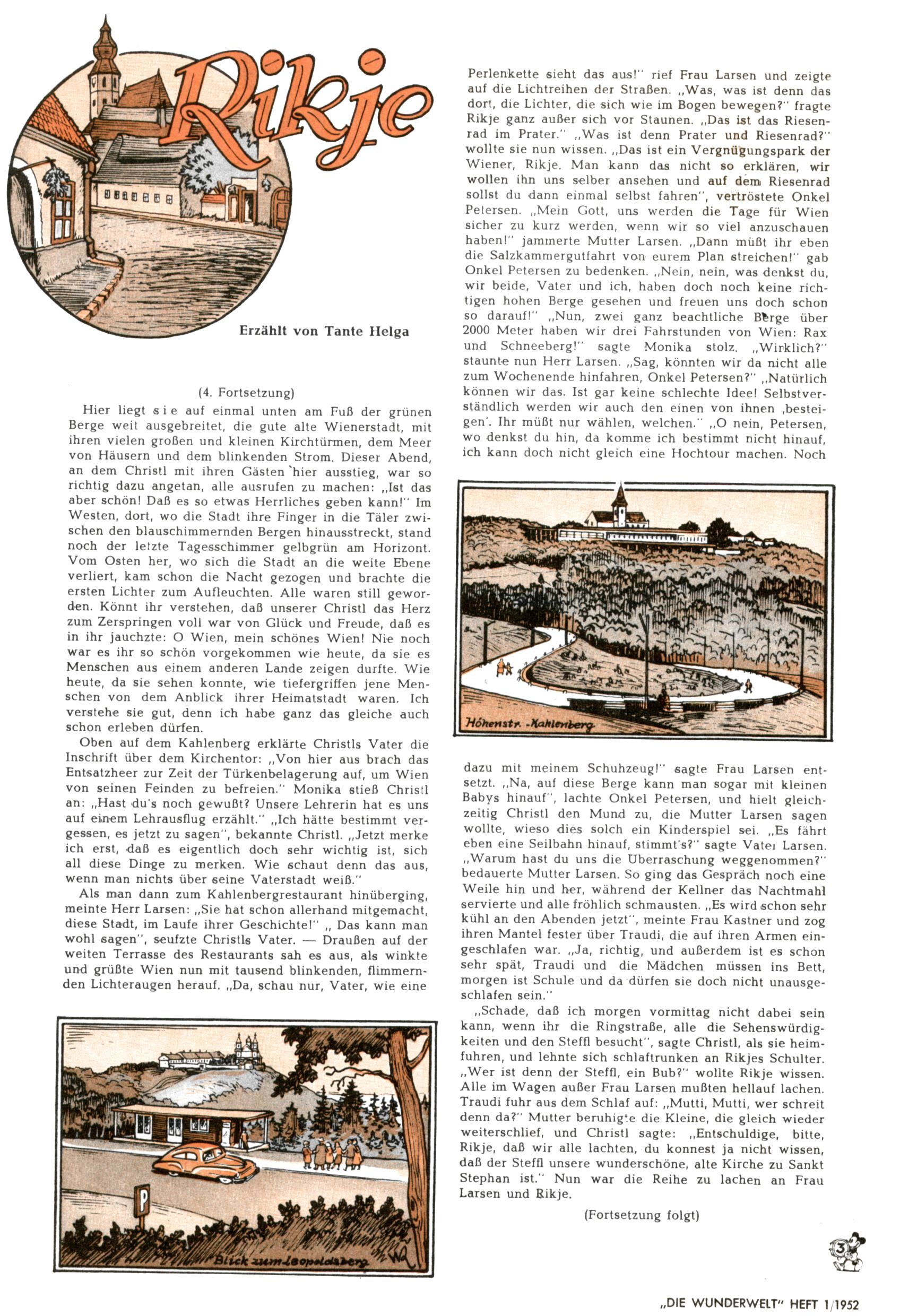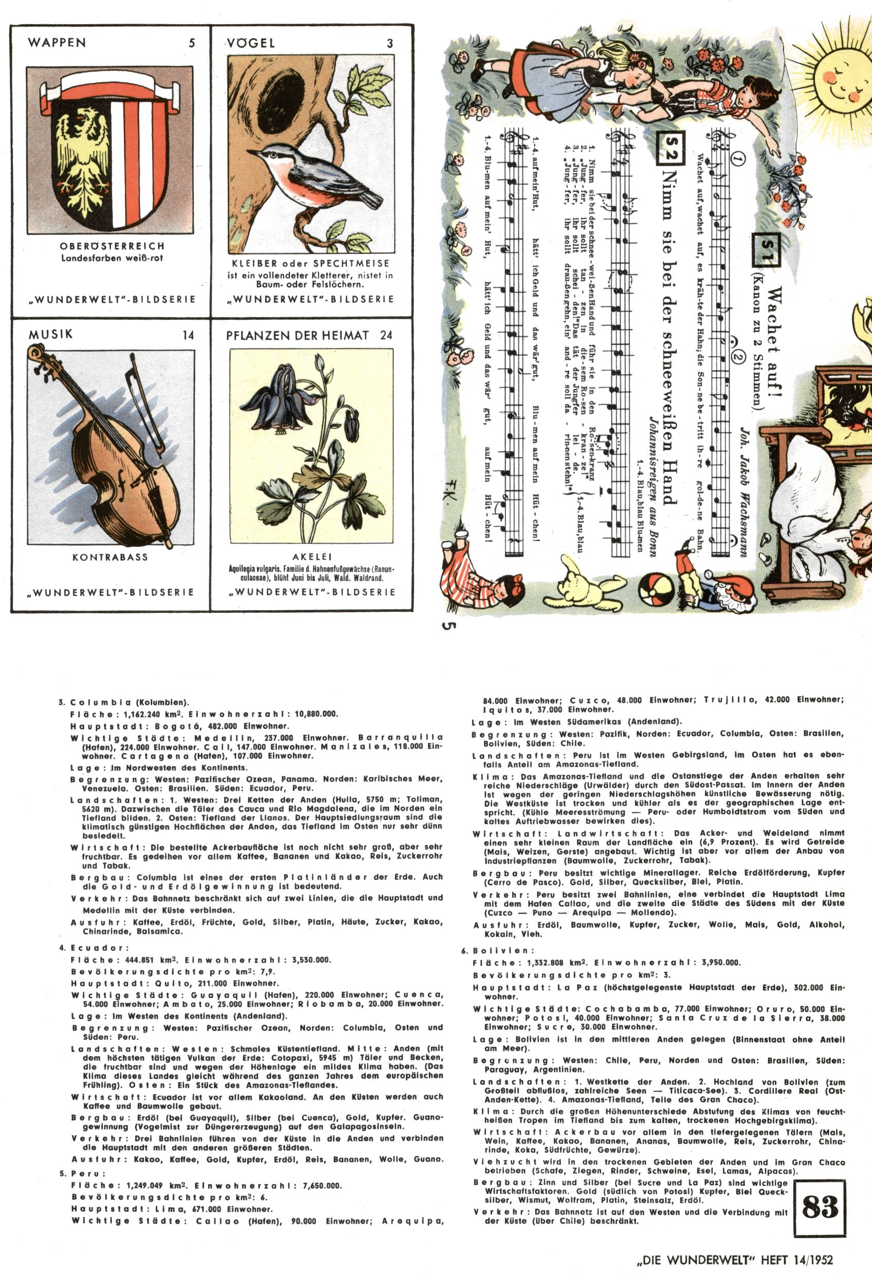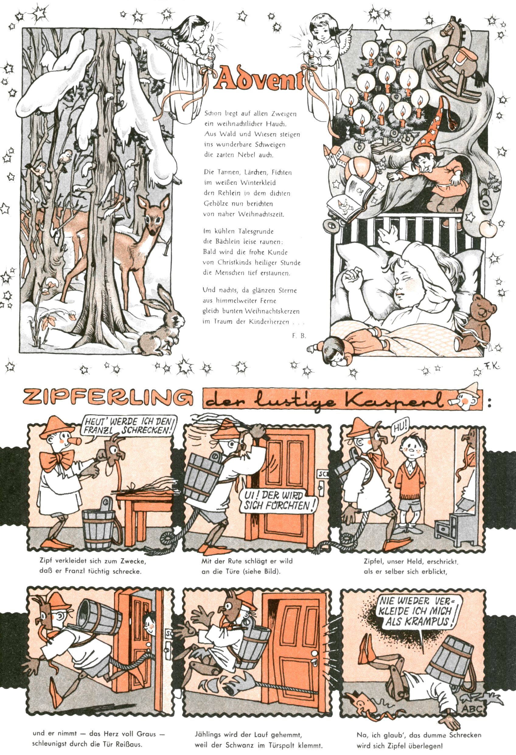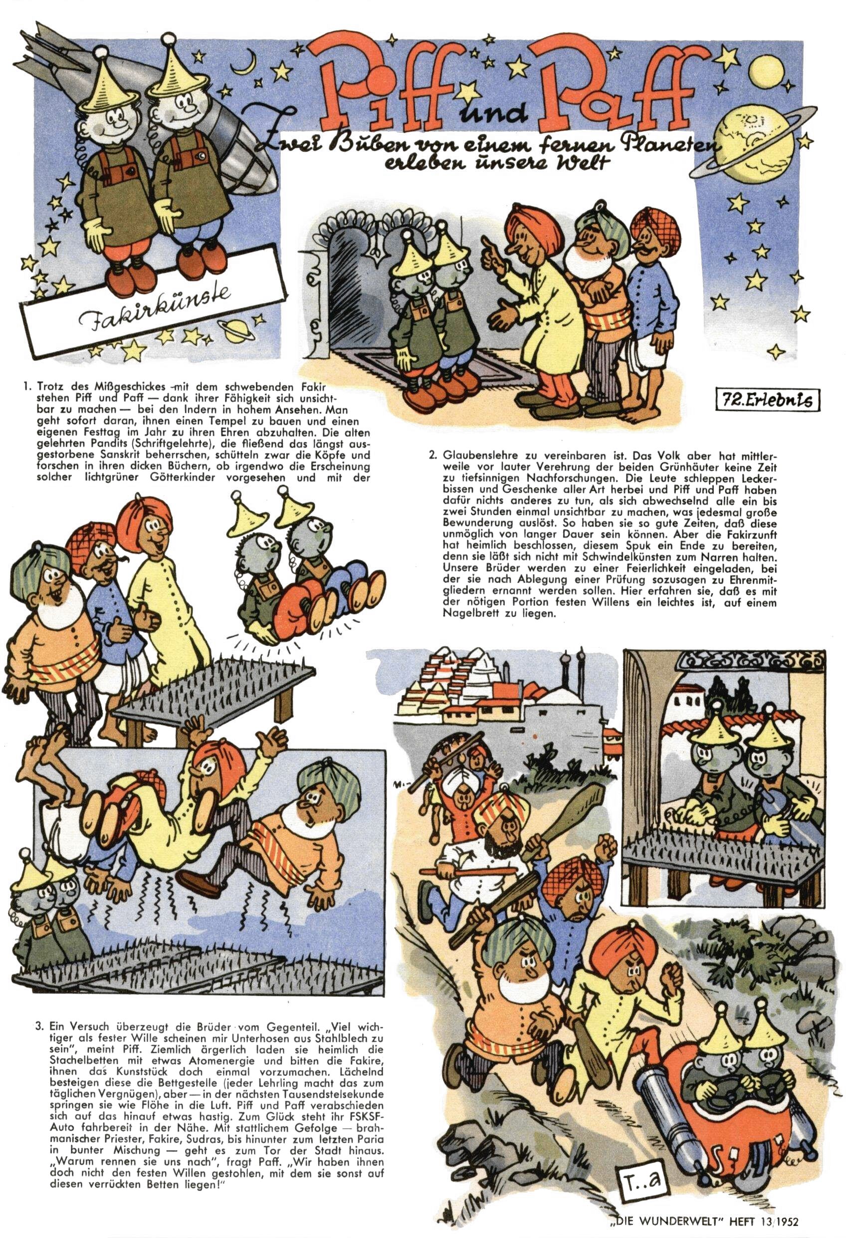 1952 – Der Erfolg hält an Wem Erfolg zuteil wird, der hat wenig Anlass, sein Konzept zu ändern. Und das war in gewisser Weise auch gut so bei allen inhaltlichen Schwächen der Beiträge in der Wunderwelt 1952. Der Erfolg der Zeitung wurde in erster Linie von der grafischen Umsetzung getragen; die lieblichen Bilder einer heilen Märchenwelt ließen über die oft flauen, pädagogisch teilweise sogar fragwürdigen Texte hinwegsehen. Elfriede Vavrovsky schrieb fast alle Texte und Rosl Warzilek zeichnete immer mehr Titelbilder und Mittelmärchen. ABC Peter Paul Prinz hatte Ende 1951 Meister Hokus als komischen Widerpart vom Zauberlehrling Willibald entdeckt und perfektionierte diesen Dualismus nun immer mehr. Meister Hokus avancierte zur regelmäßigen Lachnummer. Dafür überließ ABC vorübergehend Teja Aicher die Gestaltung der technischen Seite, dessen Zwerg Bumsti ebenfalls bereits untrennbar mit der Wunderwelt verbunden schien und längst zum Markenzeichen aufgestiegen war. Seine ko(s)mischen Superhelden Piff und Paff hatten jedoch allmählich genug von den Menschen und kehrten der Erde den Rücken zu. Für den Einsatz im Schulunterricht wurden weiterhin von Elfriede Vavrovsky erstellte politische und geografische Daten und Karten gedruckt, was gerne angenommen wurde, denn teure Atlanten gab es 1952 noch wenige, als viele politische Grenzen gar nicht endgültig geklärt schienen. |