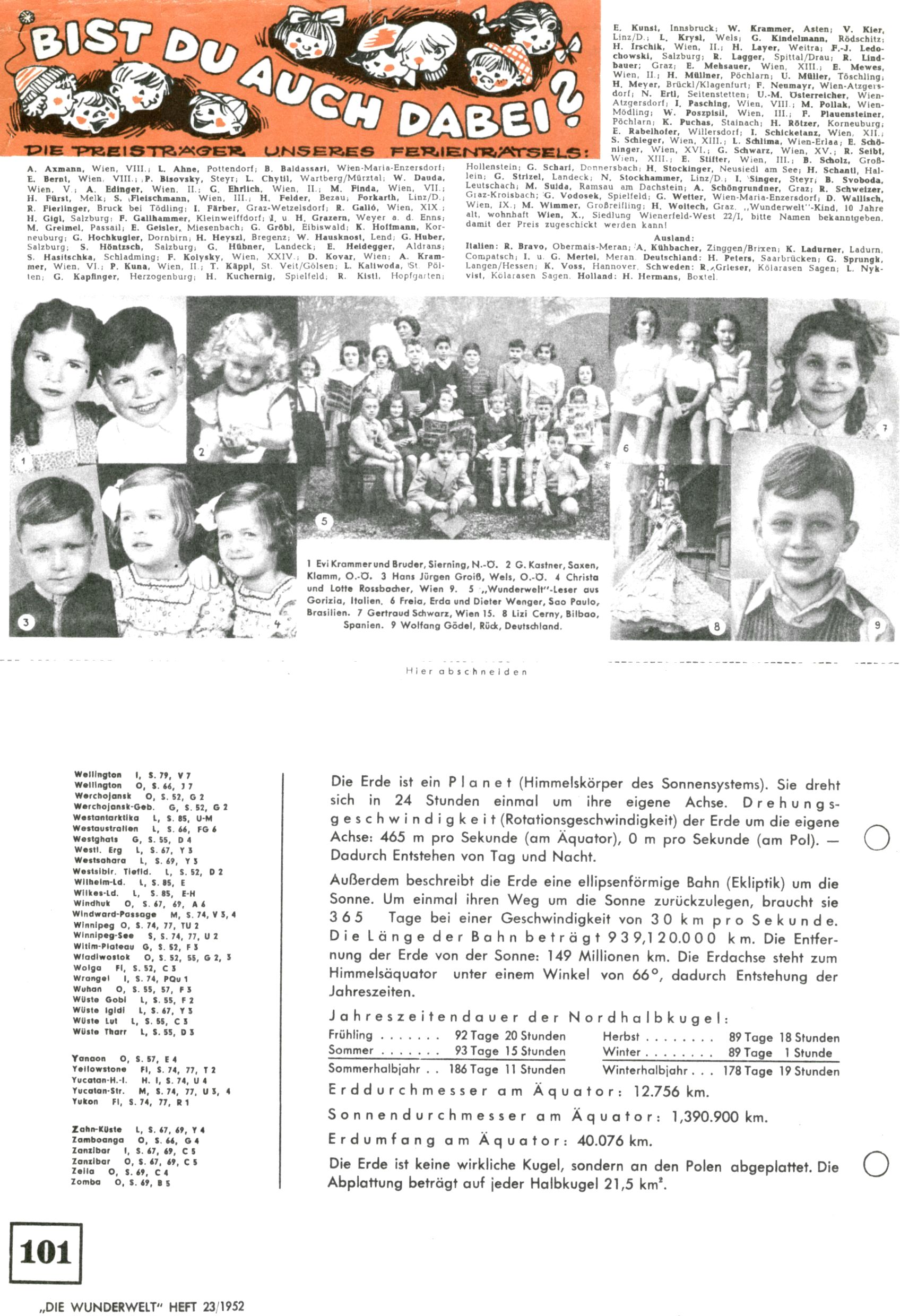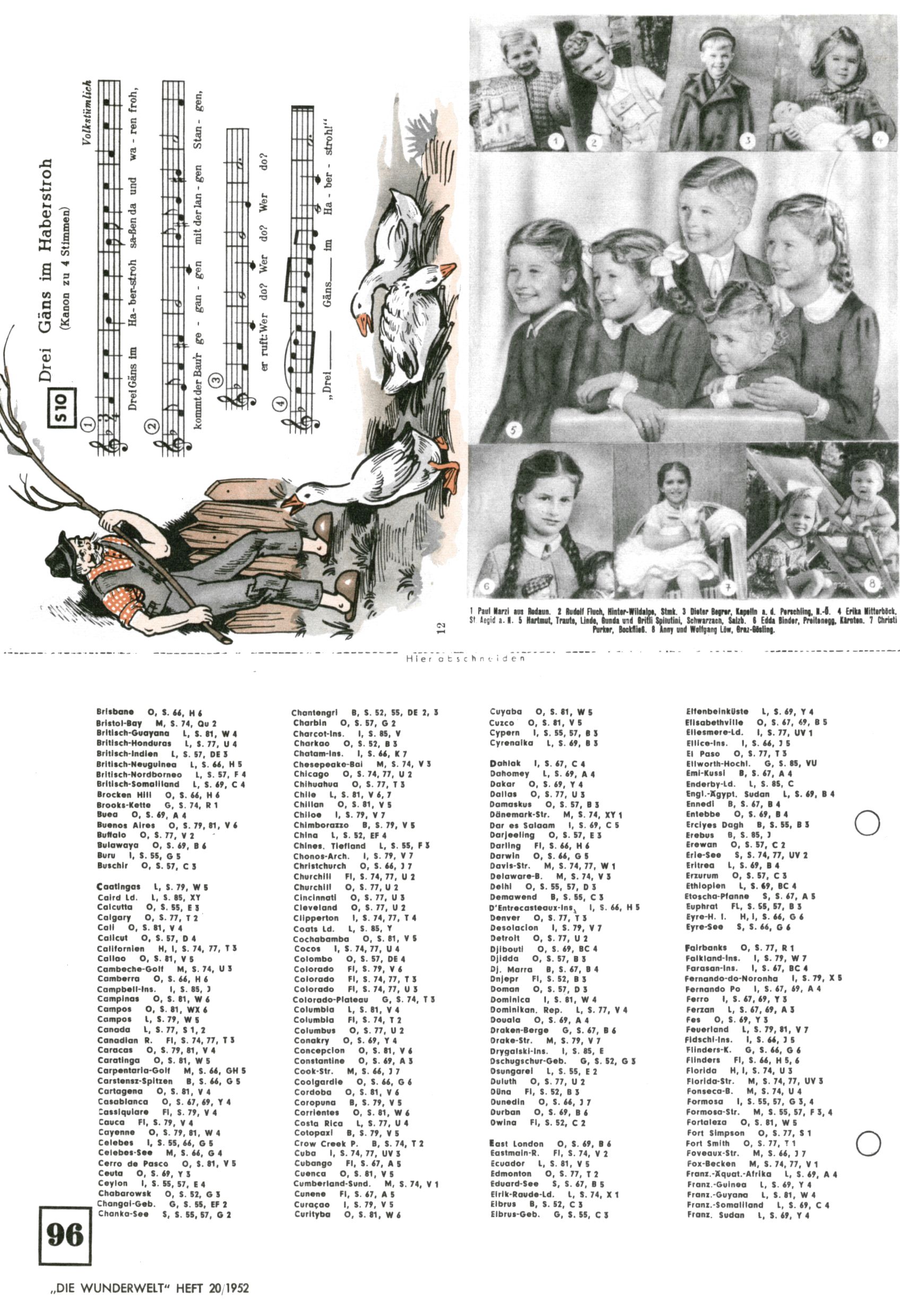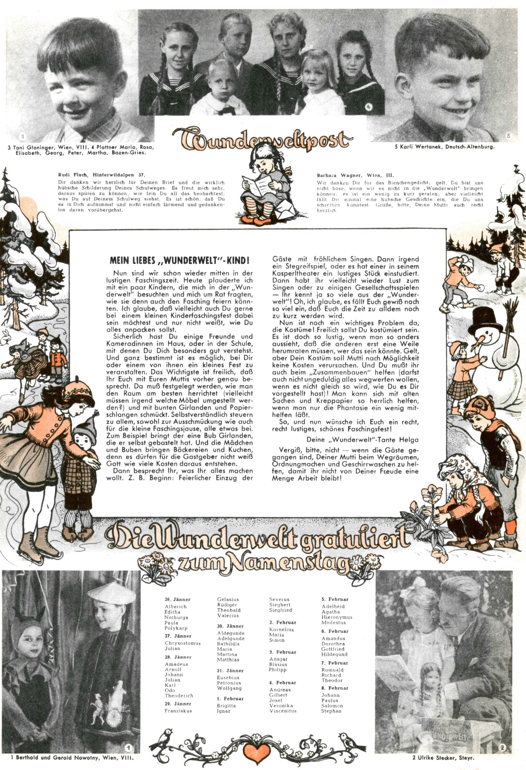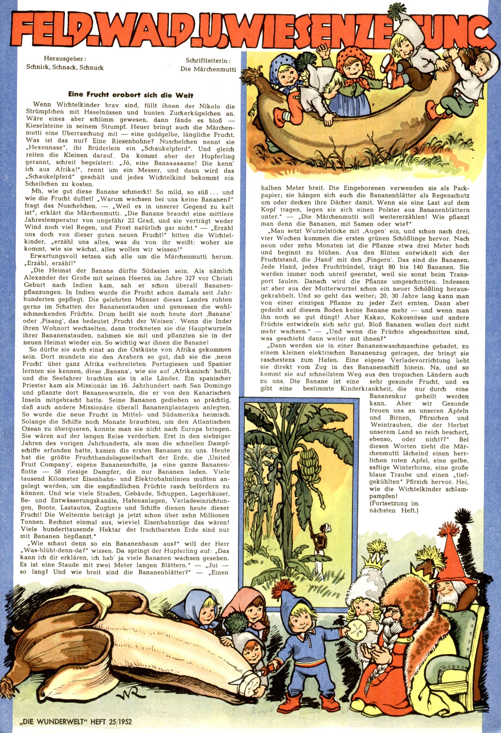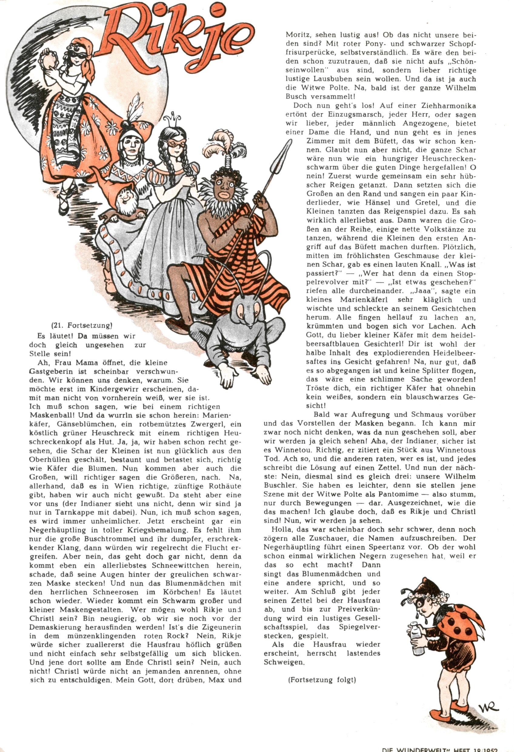 1952 – Der Erfolg hält an Wem Erfolg zuteil wird, der hat wenig Anlass, sein Konzept zu ändern. Und das war in gewisser Weise auch gut so bei allen inhaltlichen Schwächen der Beiträge in der Wunderwelt 1952. Der Erfolg der Zeitung wurde in erster Linie von der grafischen Umsetzung getragen; die lieblichen Bilder einer heilen Märchenwelt ließen über die oft flauen, pädagogisch teilweise sogar fragwürdigen Texte hinwegsehen. Elfriede Vavrovsky schrieb fast alle Texte und Rosl Warzilek zeichnete immer mehr Titelbilder und Mittelmärchen. ABC Peter Paul Prinz hatte Ende 1951 Meister Hokus als komischen Widerpart vom Zauberlehrling Willibald entdeckt und perfektionierte diesen Dualismus nun immer mehr. Meister Hokus avancierte zur regelmäßigen Lachnummer. Dafür überließ ABC vorübergehend Teja Aicher die Gestaltung der technischen Seite, dessen Zwerg Bumsti ebenfalls bereits untrennbar mit der Wunderwelt verbunden schien und längst zum Markenzeichen aufgestiegen war. Seine ko(s)mischen Superhelden Piff und Paff hatten jedoch allmählich genug von den Menschen und kehrten der Erde den Rücken zu. Für den Einsatz im Schulunterricht wurden weiterhin von Elfriede Vavrovsky erstellte politische und geografische Daten und Karten gedruckt, was gerne angenommen wurde, denn teure Atlanten gab es 1952 noch wenige, als viele politische Grenzen gar nicht endgültig geklärt schienen. |