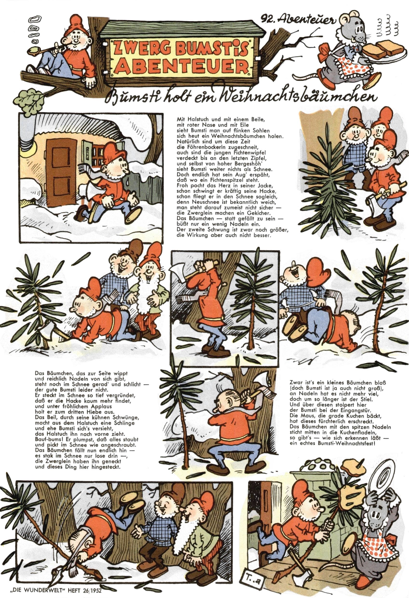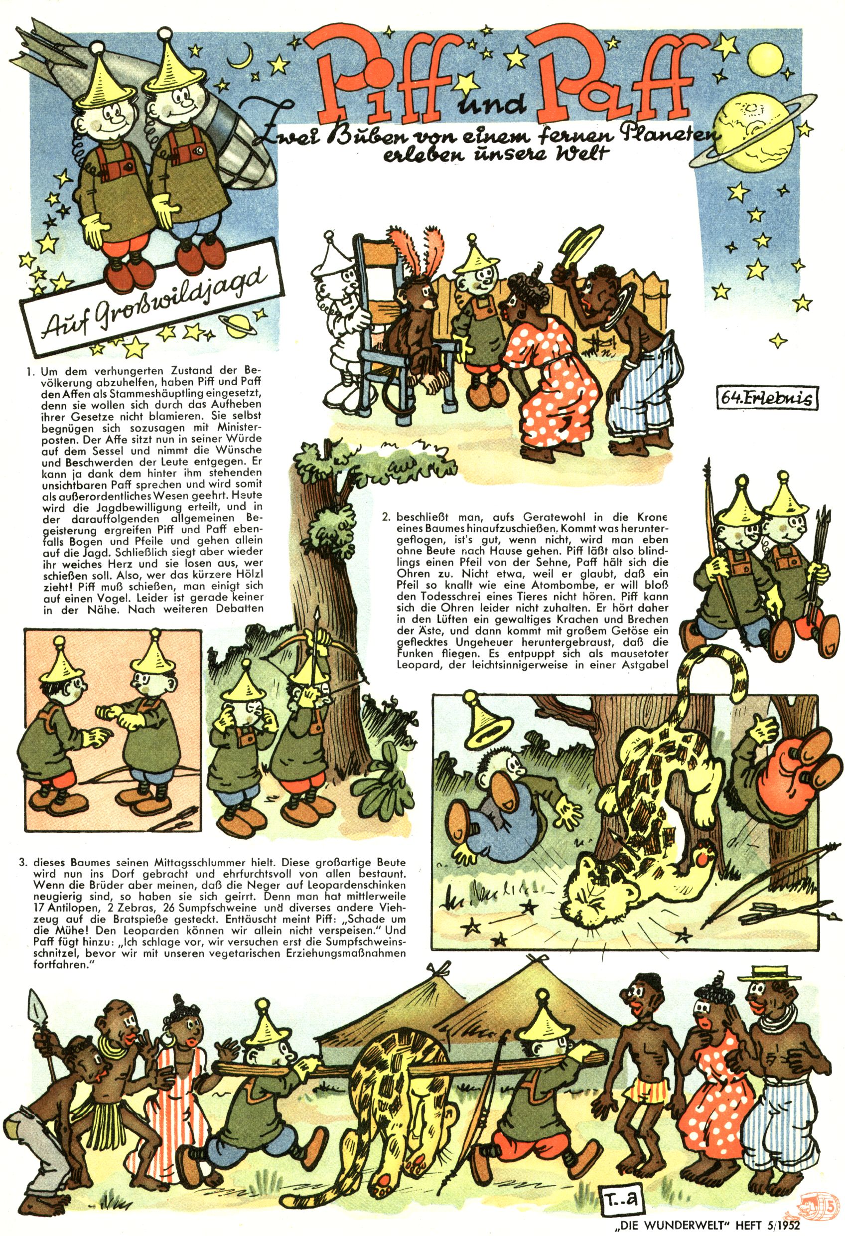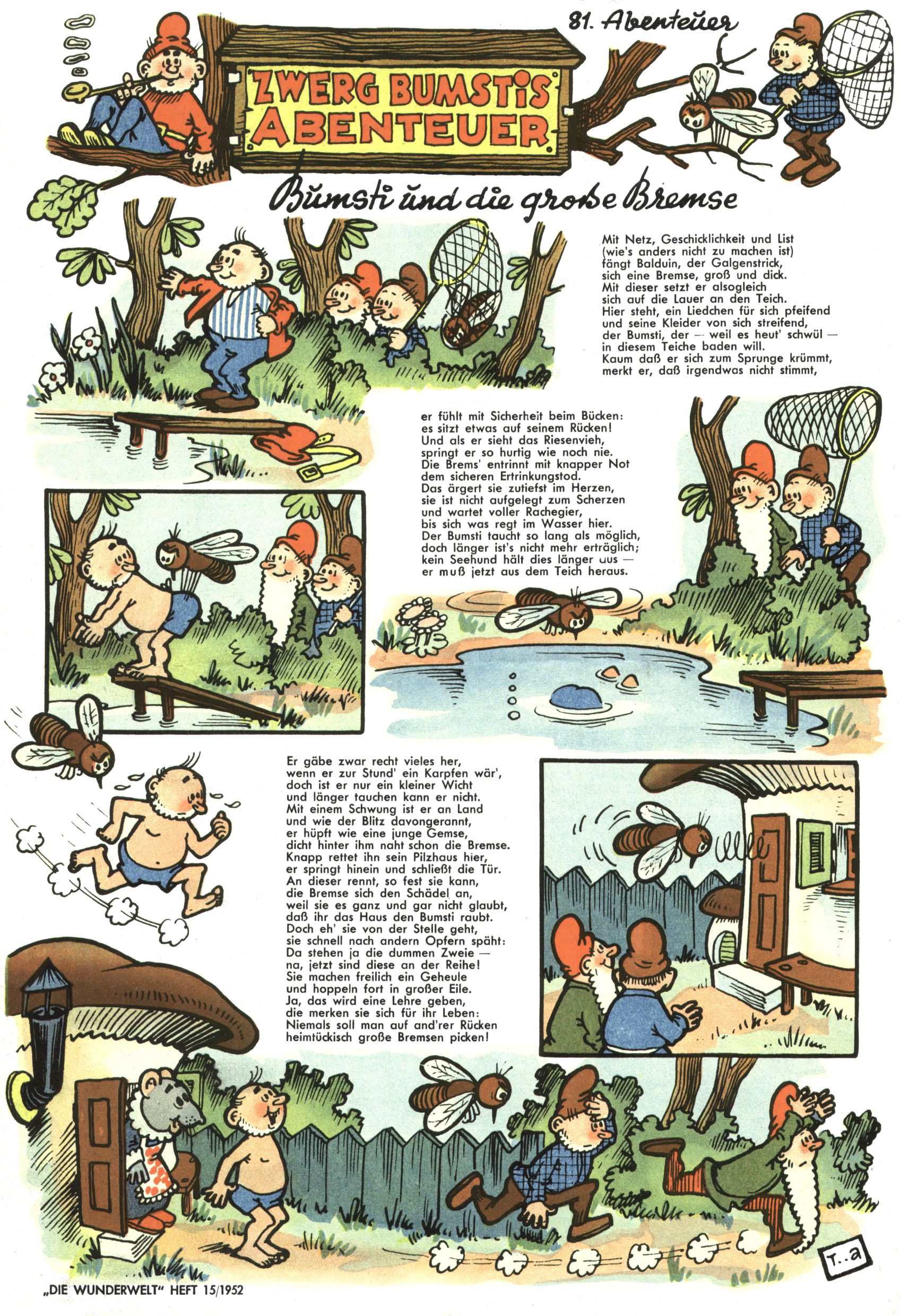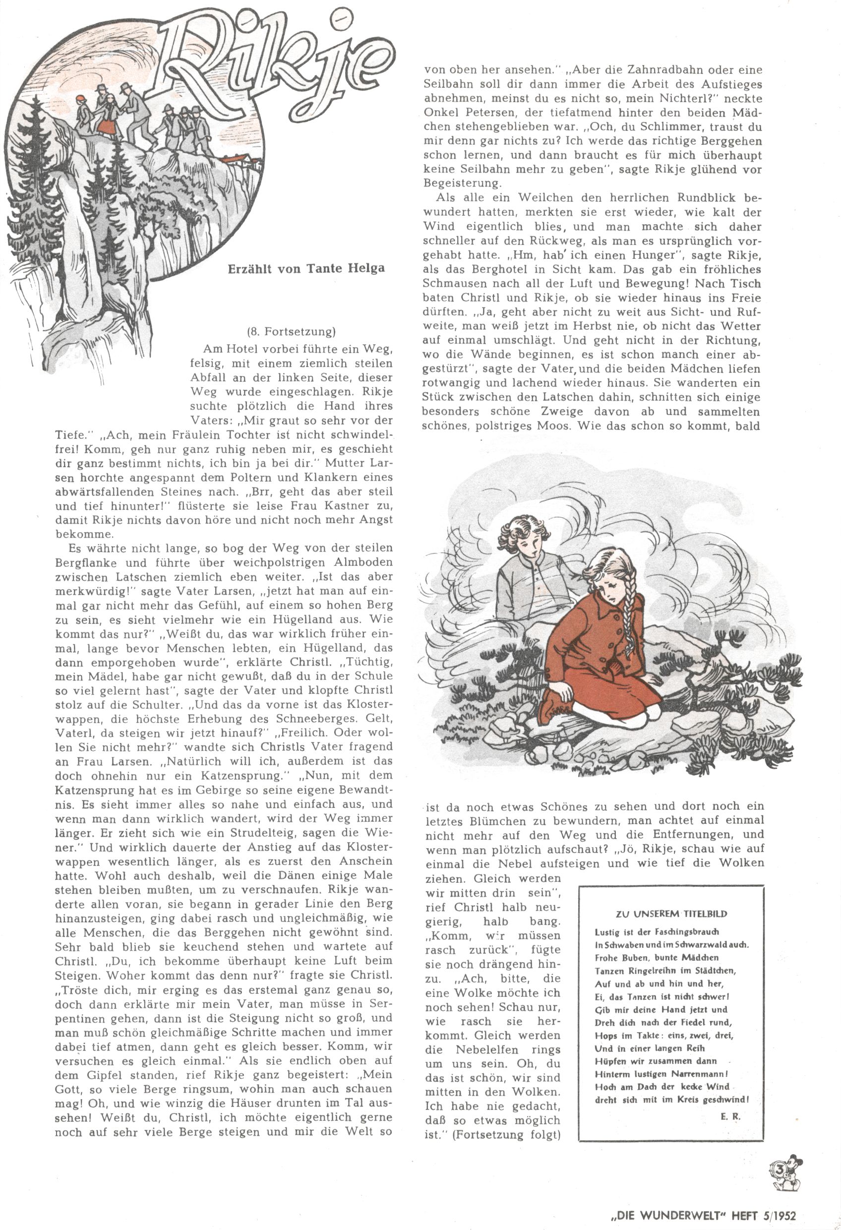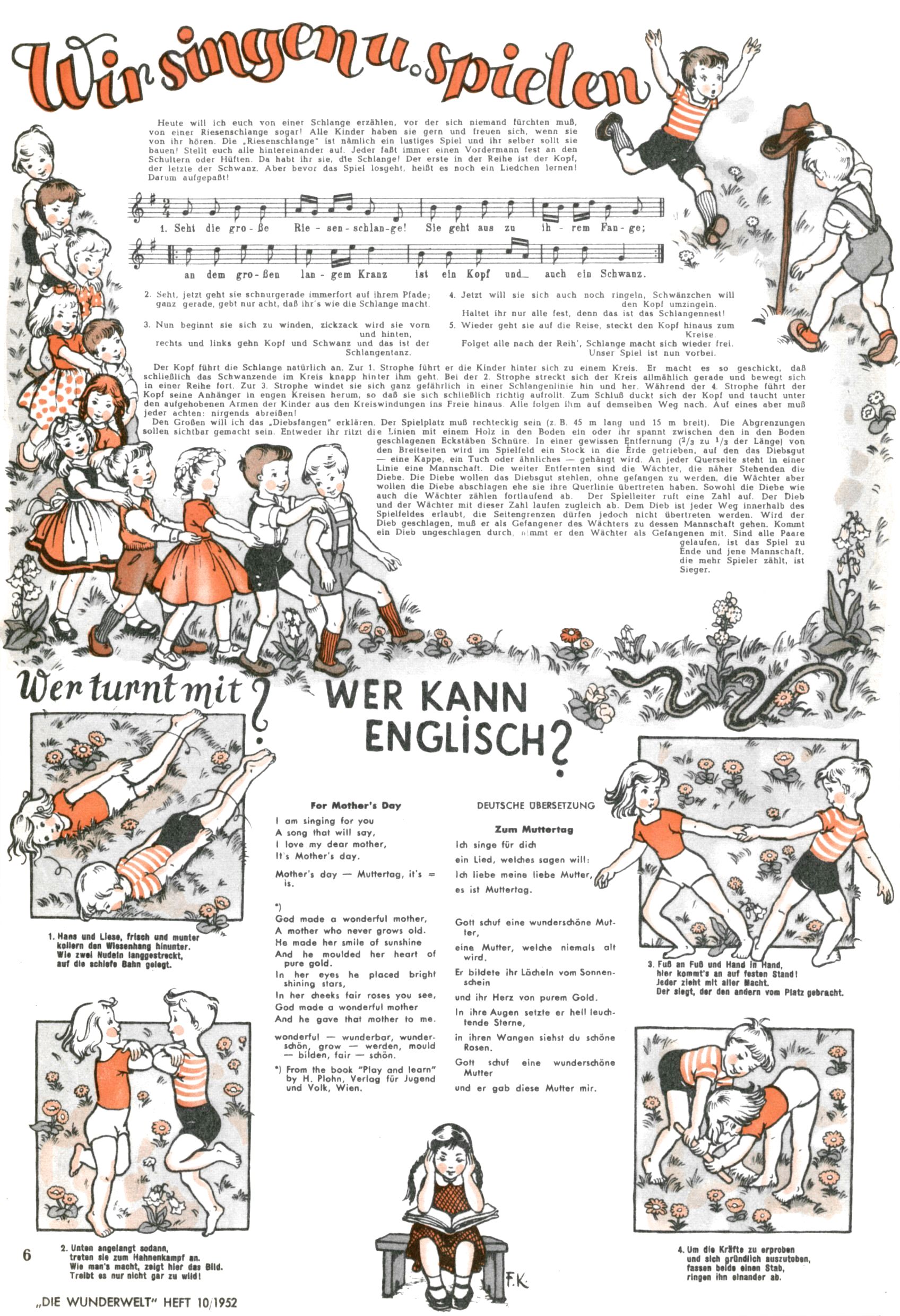 1952 – Der Erfolg hält an Wem Erfolg zuteil wird, der hat wenig Anlass, sein Konzept zu ändern. Und das war in gewisser Weise auch gut so bei allen inhaltlichen Schwächen der Beiträge in der Wunderwelt 1952. Der Erfolg der Zeitung wurde in erster Linie von der grafischen Umsetzung getragen; die lieblichen Bilder einer heilen Märchenwelt ließen über die oft flauen, pädagogisch teilweise sogar fragwürdigen Texte hinwegsehen. Elfriede Vavrovsky schrieb fast alle Texte und Rosl Warzilek zeichnete immer mehr Titelbilder und Mittelmärchen. ABC Peter Paul Prinz hatte Ende 1951 Meister Hokus als komischen Widerpart vom Zauberlehrling Willibald entdeckt und perfektionierte diesen Dualismus nun immer mehr. Meister Hokus avancierte zur regelmäßigen Lachnummer. Dafür überließ ABC vorübergehend Teja Aicher die Gestaltung der technischen Seite, dessen Zwerg Bumsti ebenfalls bereits untrennbar mit der Wunderwelt verbunden schien und längst zum Markenzeichen aufgestiegen war. Seine ko(s)mischen Superhelden Piff und Paff hatten jedoch allmählich genug von den Menschen und kehrten der Erde den Rücken zu. Für den Einsatz im Schulunterricht wurden weiterhin von Elfriede Vavrovsky erstellte politische und geografische Daten und Karten gedruckt, was gerne angenommen wurde, denn teure Atlanten gab es 1952 noch wenige, als viele politische Grenzen gar nicht endgültig geklärt schienen. |