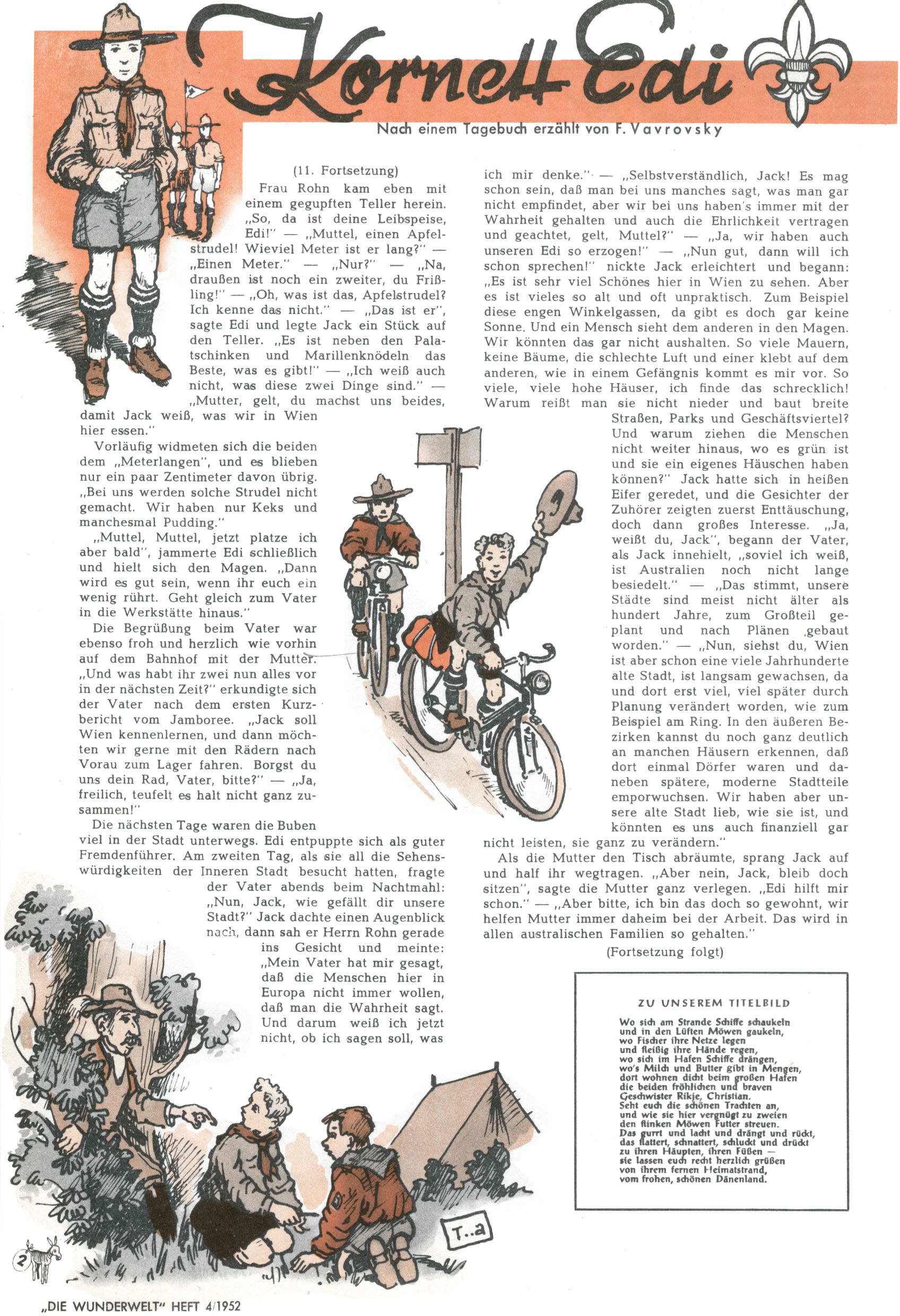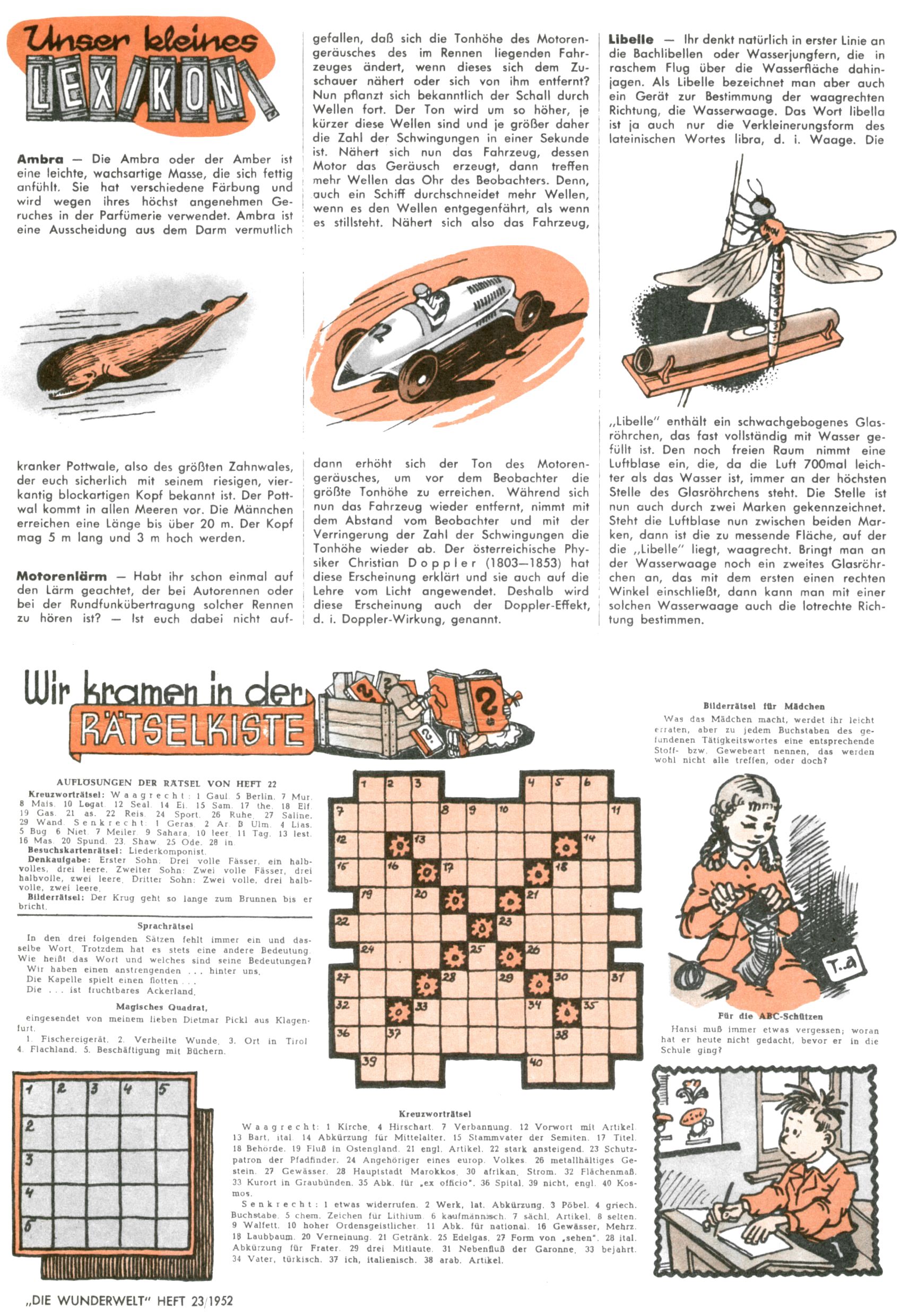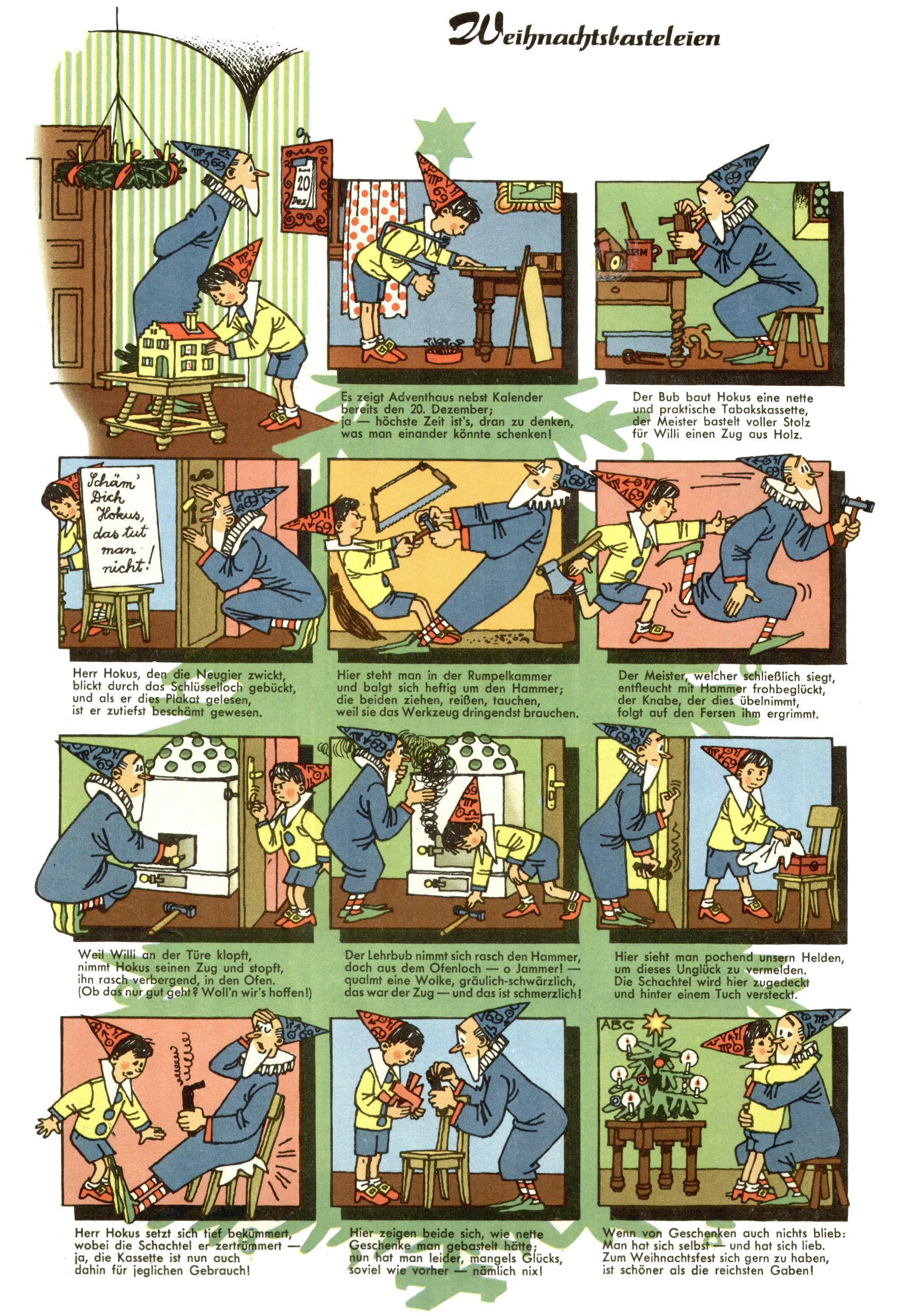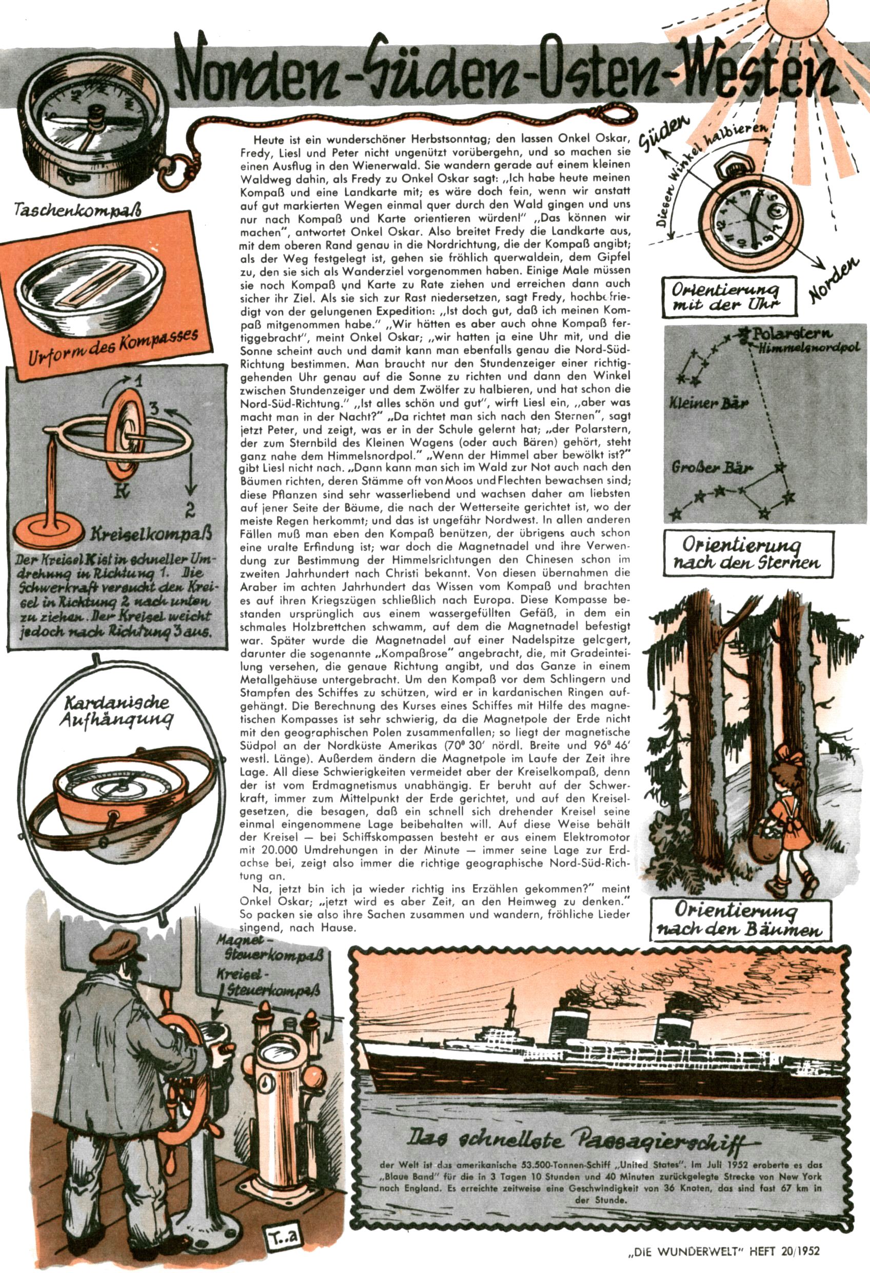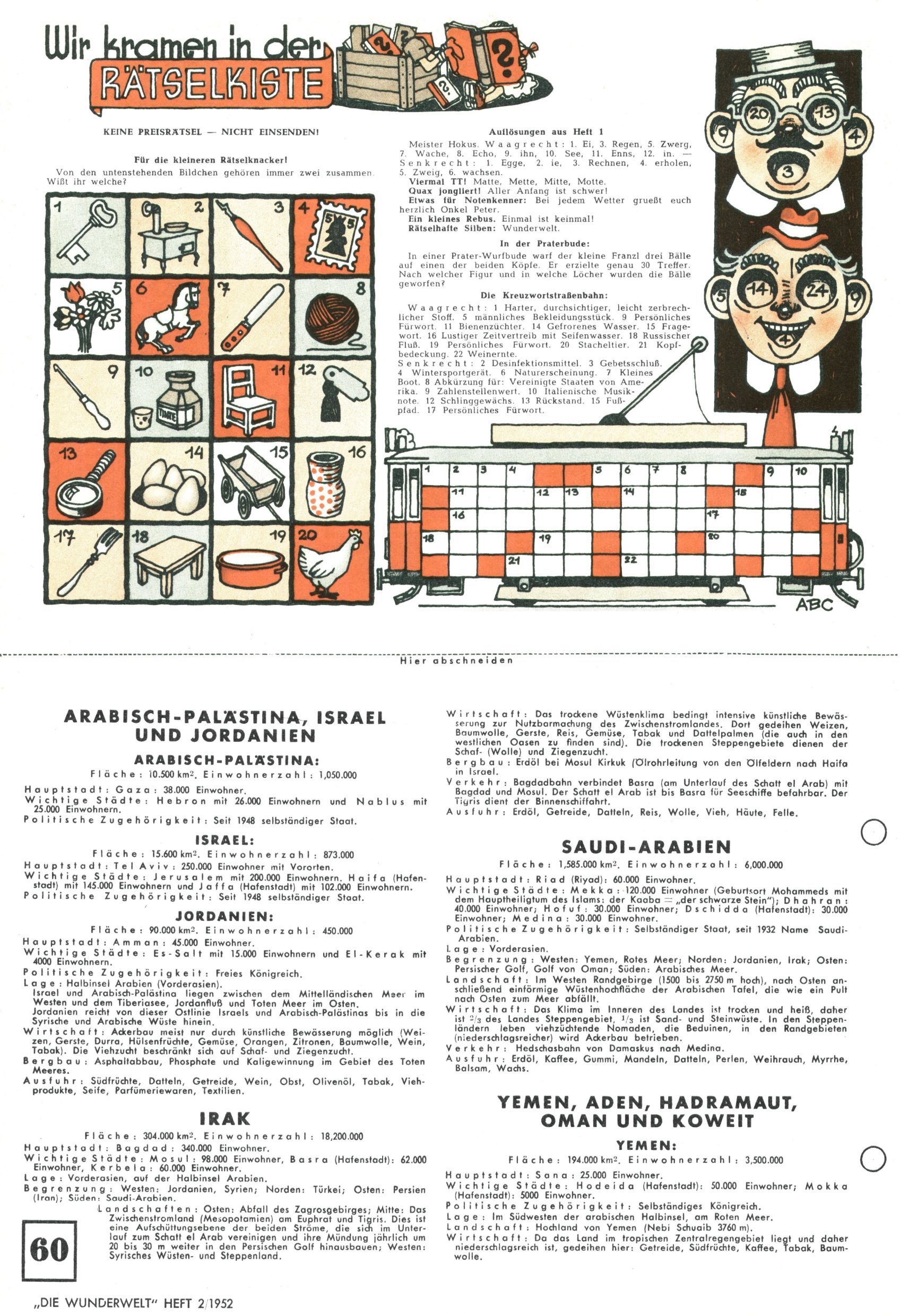1952 – Der Erfolg hält an Wem Erfolg zuteil wird, der hat wenig Anlass, sein Konzept zu ändern. Und das war in gewisser Weise auch gut so bei allen inhaltlichen Schwächen der Beiträge in der Wunderwelt 1952. Der Erfolg der Zeitung wurde in erster Linie von der grafischen Umsetzung getragen; die lieblichen Bilder einer heilen Märchenwelt ließen über die oft flauen, pädagogisch teilweise sogar fragwürdigen Texte hinwegsehen. Elfriede Vavrovsky schrieb fast alle Texte und Rosl Warzilek zeichnete immer mehr Titelbilder und Mittelmärchen. ABC Peter Paul Prinz hatte Ende 1951 Meister Hokus als komischen Widerpart vom Zauberlehrling Willibald entdeckt und perfektionierte diesen Dualismus nun immer mehr. Meister Hokus avancierte zur regelmäßigen Lachnummer. Dafür überließ ABC vorübergehend Teja Aicher die Gestaltung der technischen Seite, dessen Zwerg Bumsti ebenfalls bereits untrennbar mit der Wunderwelt verbunden schien und längst zum Markenzeichen aufgestiegen war. Seine ko(s)mischen Superhelden Piff und Paff hatten jedoch allmählich genug von den Menschen und kehrten der Erde den Rücken zu. Für den Einsatz im Schulunterricht wurden weiterhin von Elfriede Vavrovsky erstellte politische und geografische Daten und Karten gedruckt, was gerne angenommen wurde, denn teure Atlanten gab es 1952 noch wenige, als viele politische Grenzen gar nicht endgültig geklärt schienen. |