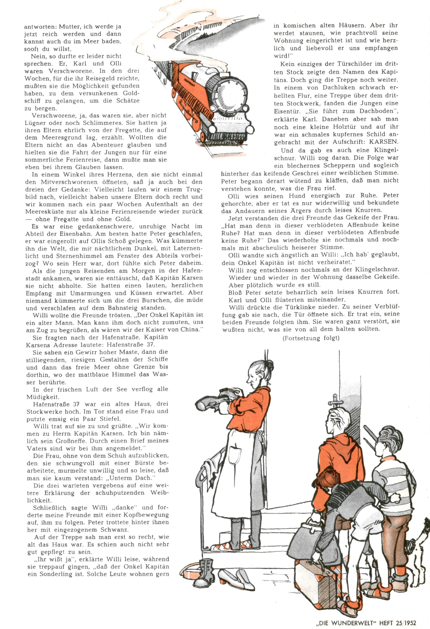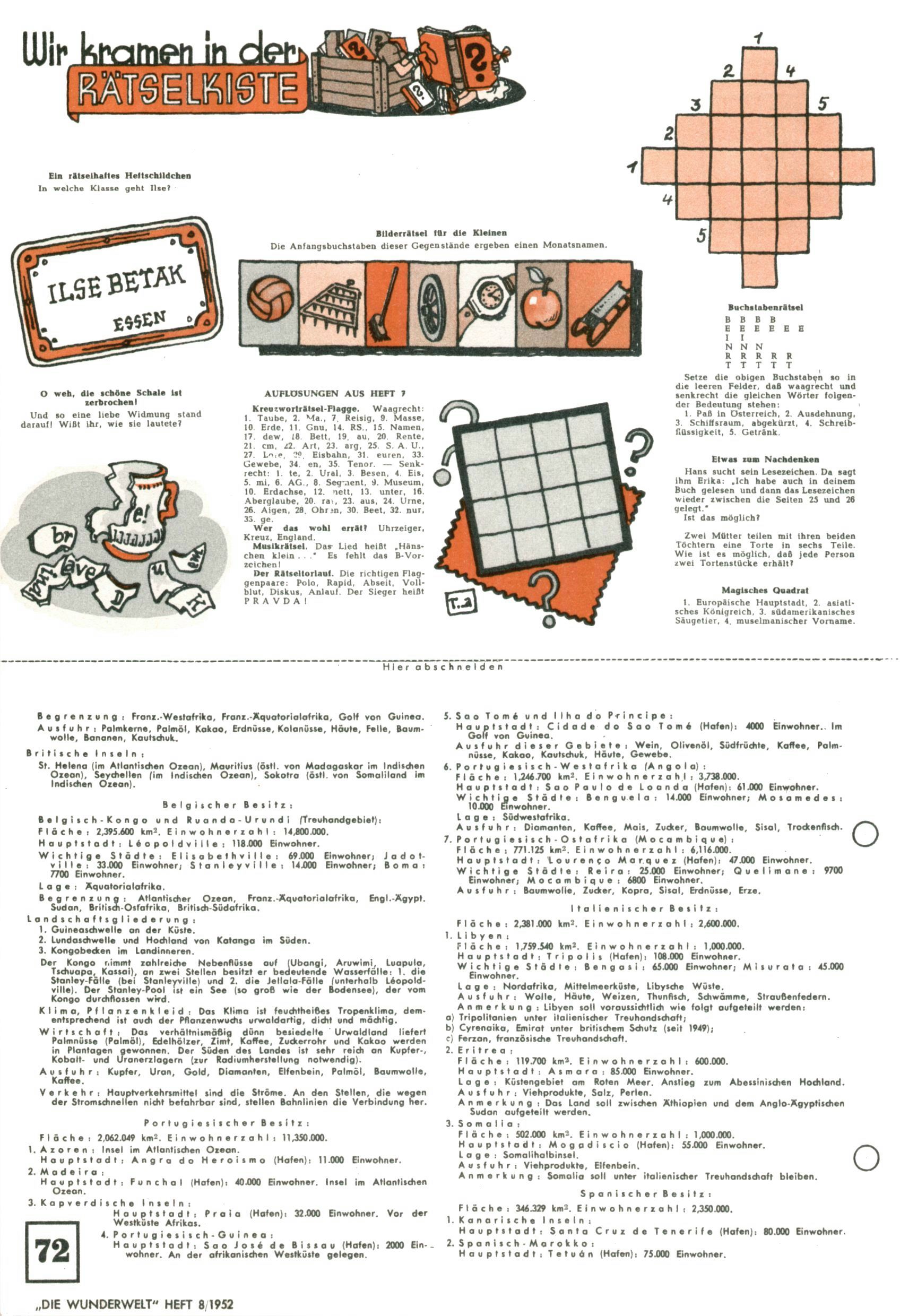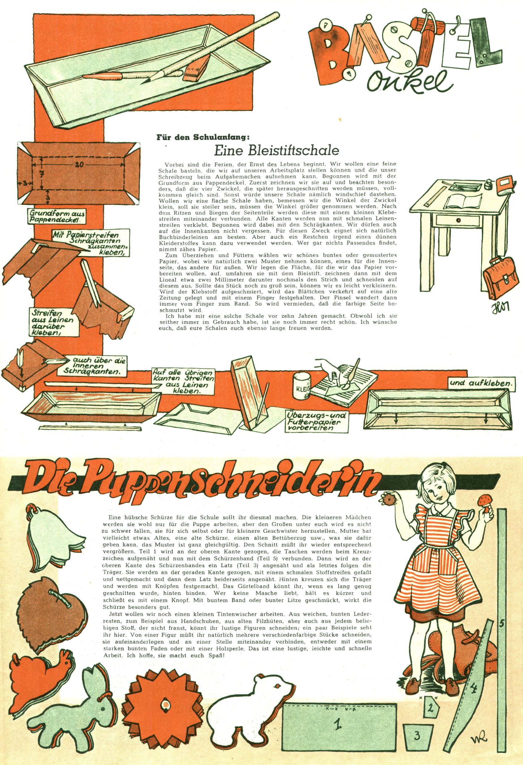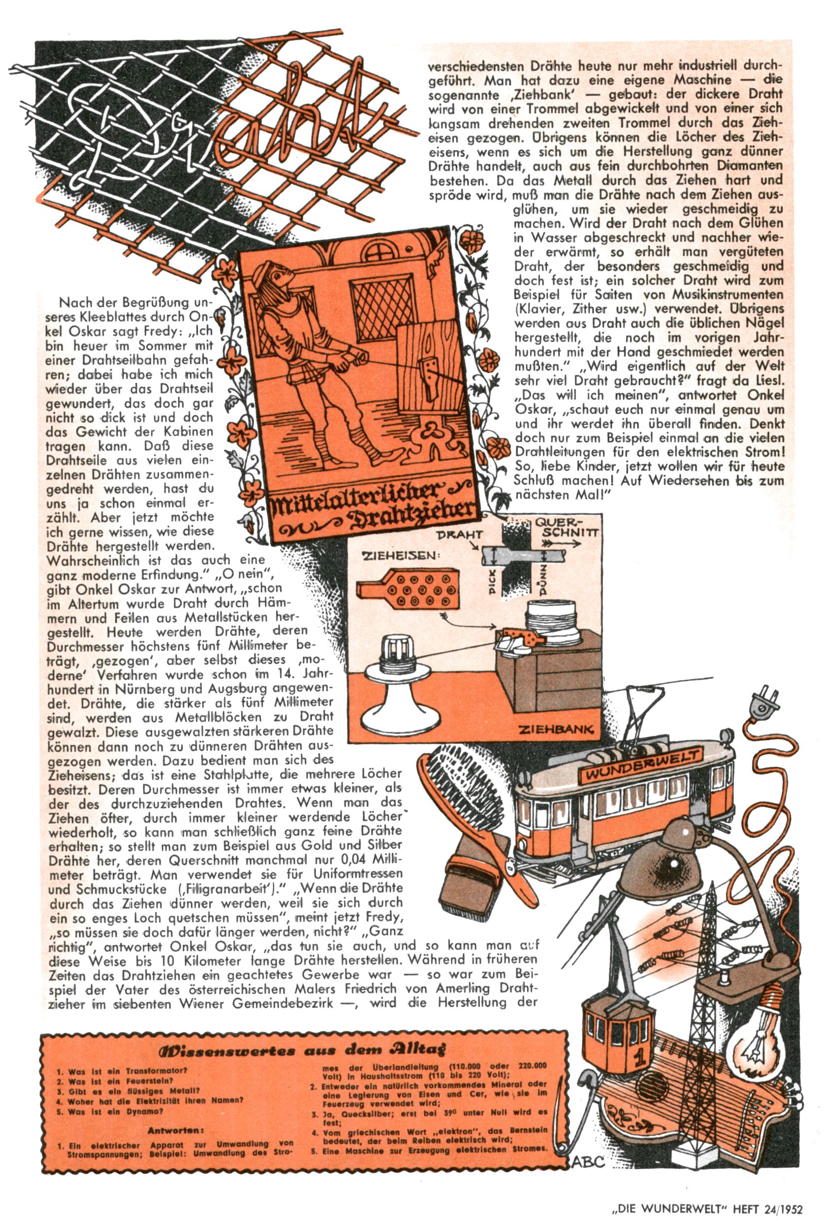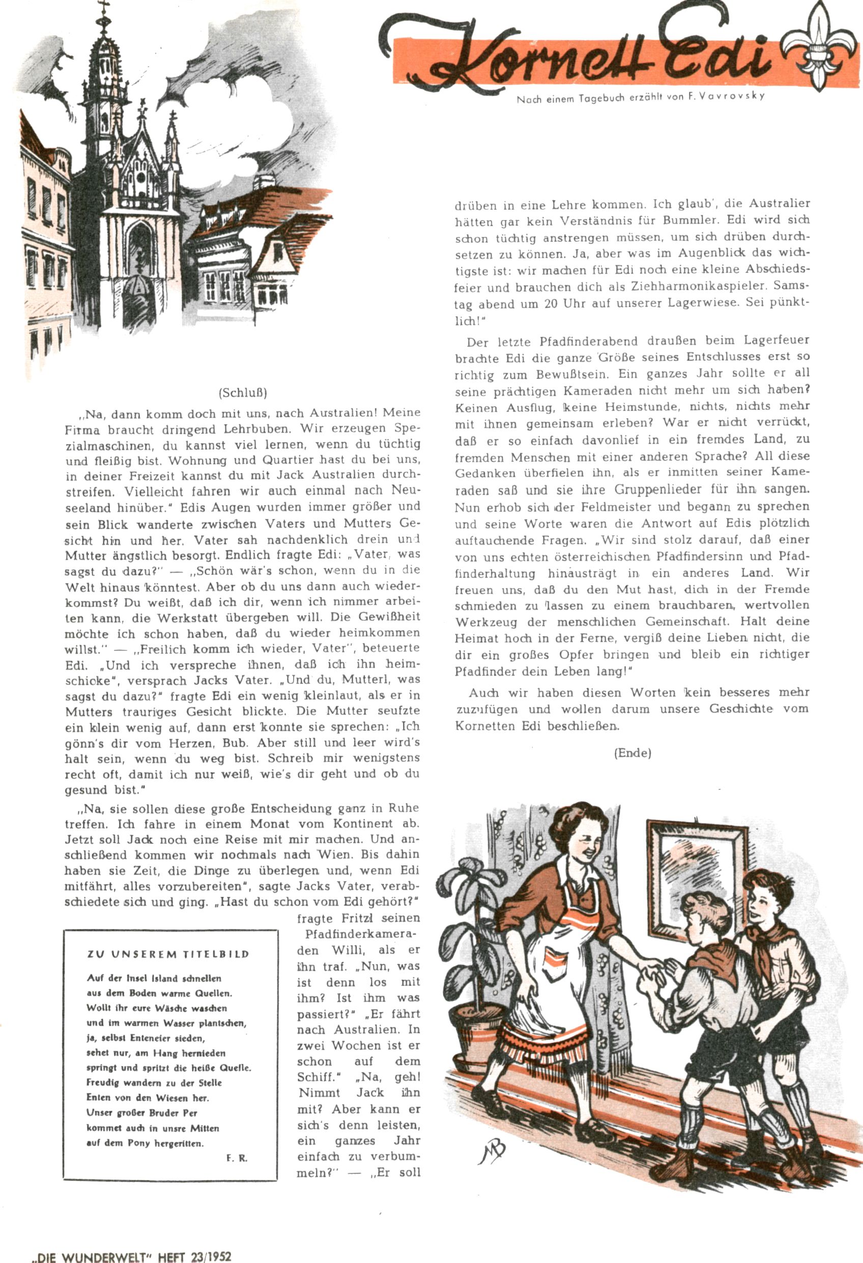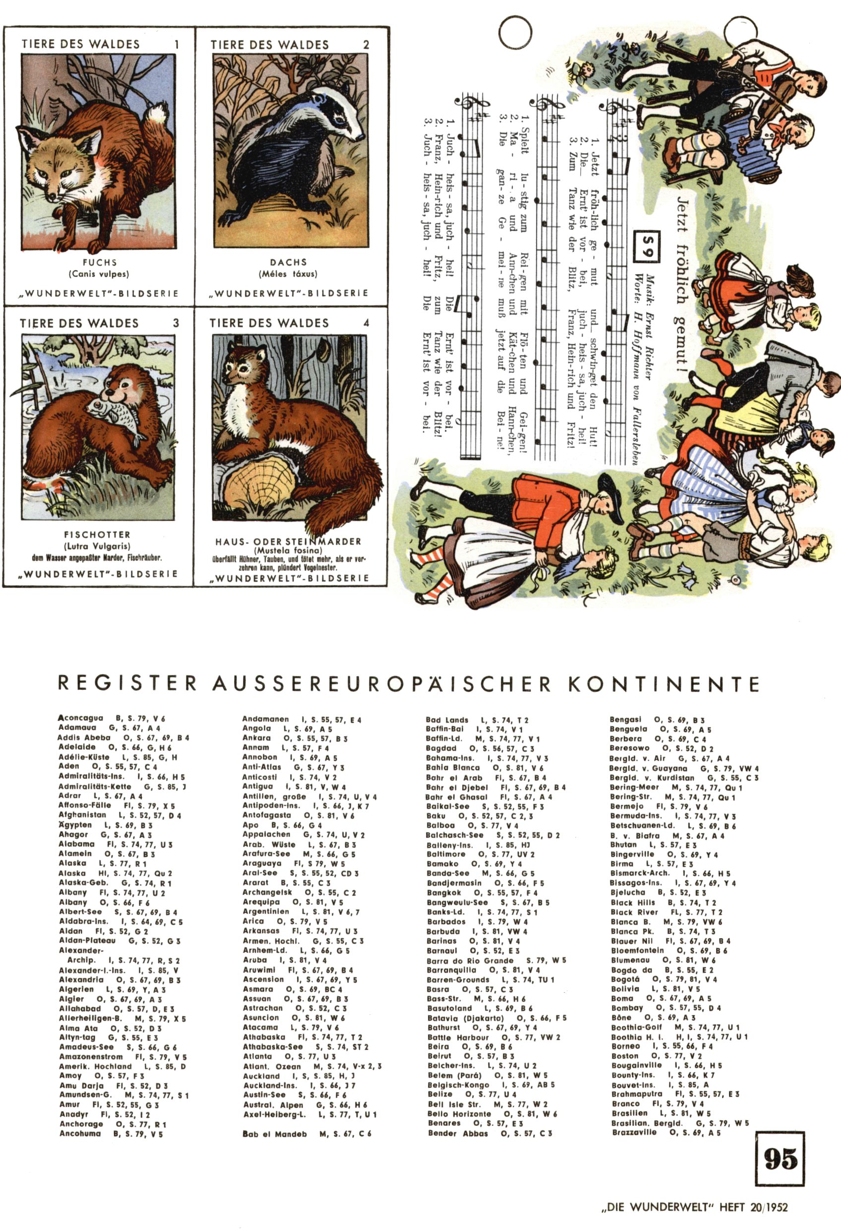 1952 – Der Erfolg hält an Wem Erfolg zuteil wird, der hat wenig Anlass, sein Konzept zu ändern. Und das war in gewisser Weise auch gut so bei allen inhaltlichen Schwächen der Beiträge in der Wunderwelt 1952. Der Erfolg der Zeitung wurde in erster Linie von der grafischen Umsetzung getragen; die lieblichen Bilder einer heilen Märchenwelt ließen über die oft flauen, pädagogisch teilweise sogar fragwürdigen Texte hinwegsehen. Elfriede Vavrovsky schrieb fast alle Texte und Rosl Warzilek zeichnete immer mehr Titelbilder und Mittelmärchen. ABC Peter Paul Prinz hatte Ende 1951 Meister Hokus als komischen Widerpart vom Zauberlehrling Willibald entdeckt und perfektionierte diesen Dualismus nun immer mehr. Meister Hokus avancierte zur regelmäßigen Lachnummer. Dafür überließ ABC vorübergehend Teja Aicher die Gestaltung der technischen Seite, dessen Zwerg Bumsti ebenfalls bereits untrennbar mit der Wunderwelt verbunden schien und längst zum Markenzeichen aufgestiegen war. Seine ko(s)mischen Superhelden Piff und Paff hatten jedoch allmählich genug von den Menschen und kehrten der Erde den Rücken zu. Für den Einsatz im Schulunterricht wurden weiterhin von Elfriede Vavrovsky erstellte politische und geografische Daten und Karten gedruckt, was gerne angenommen wurde, denn teure Atlanten gab es 1952 noch wenige, als viele politische Grenzen gar nicht endgültig geklärt schienen. |