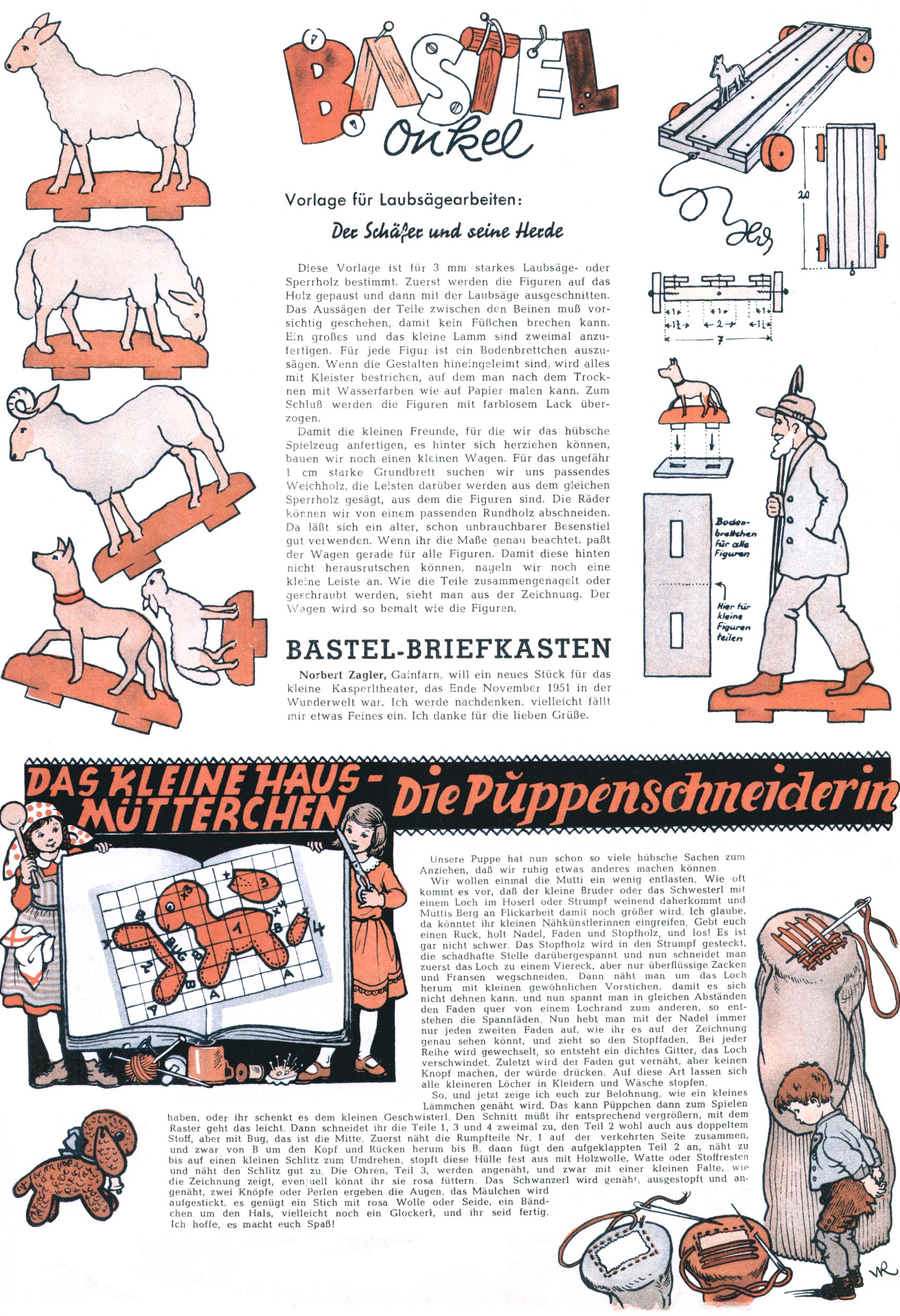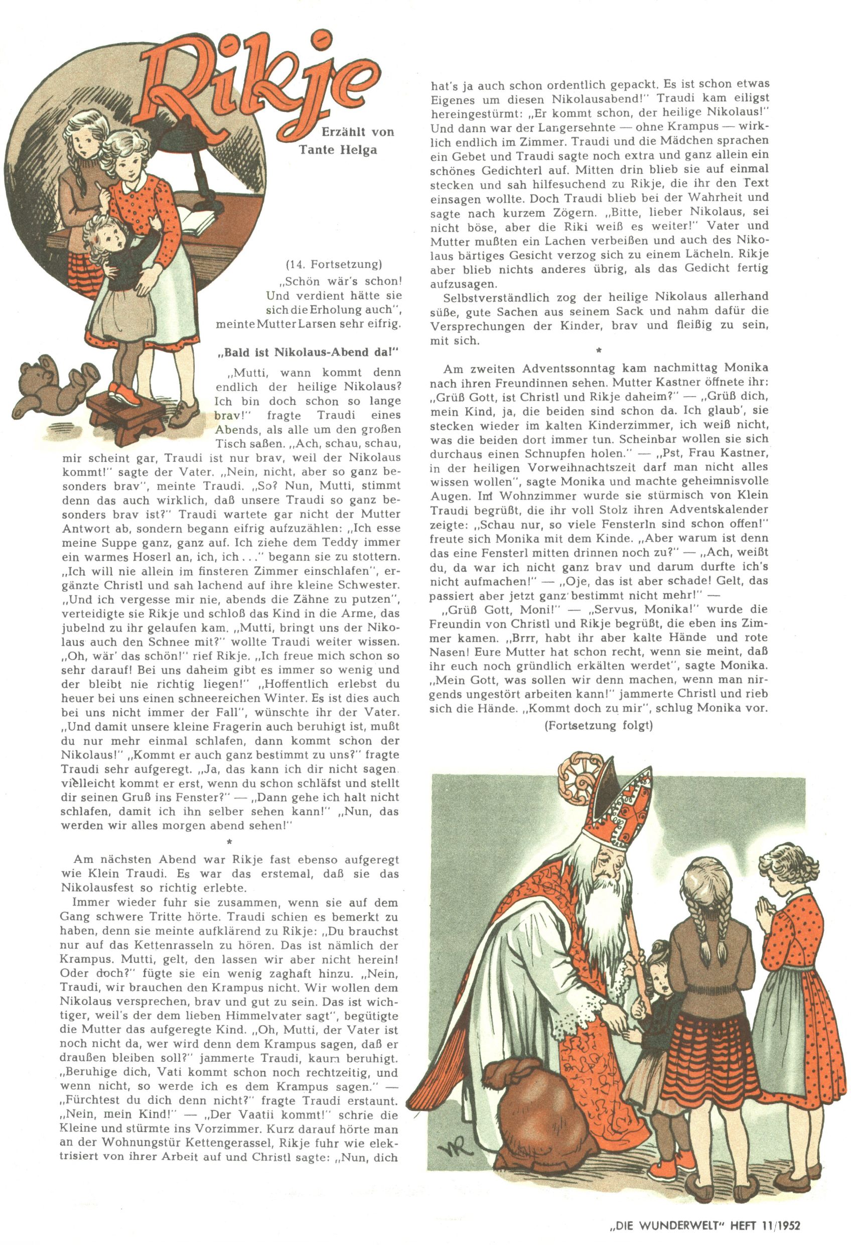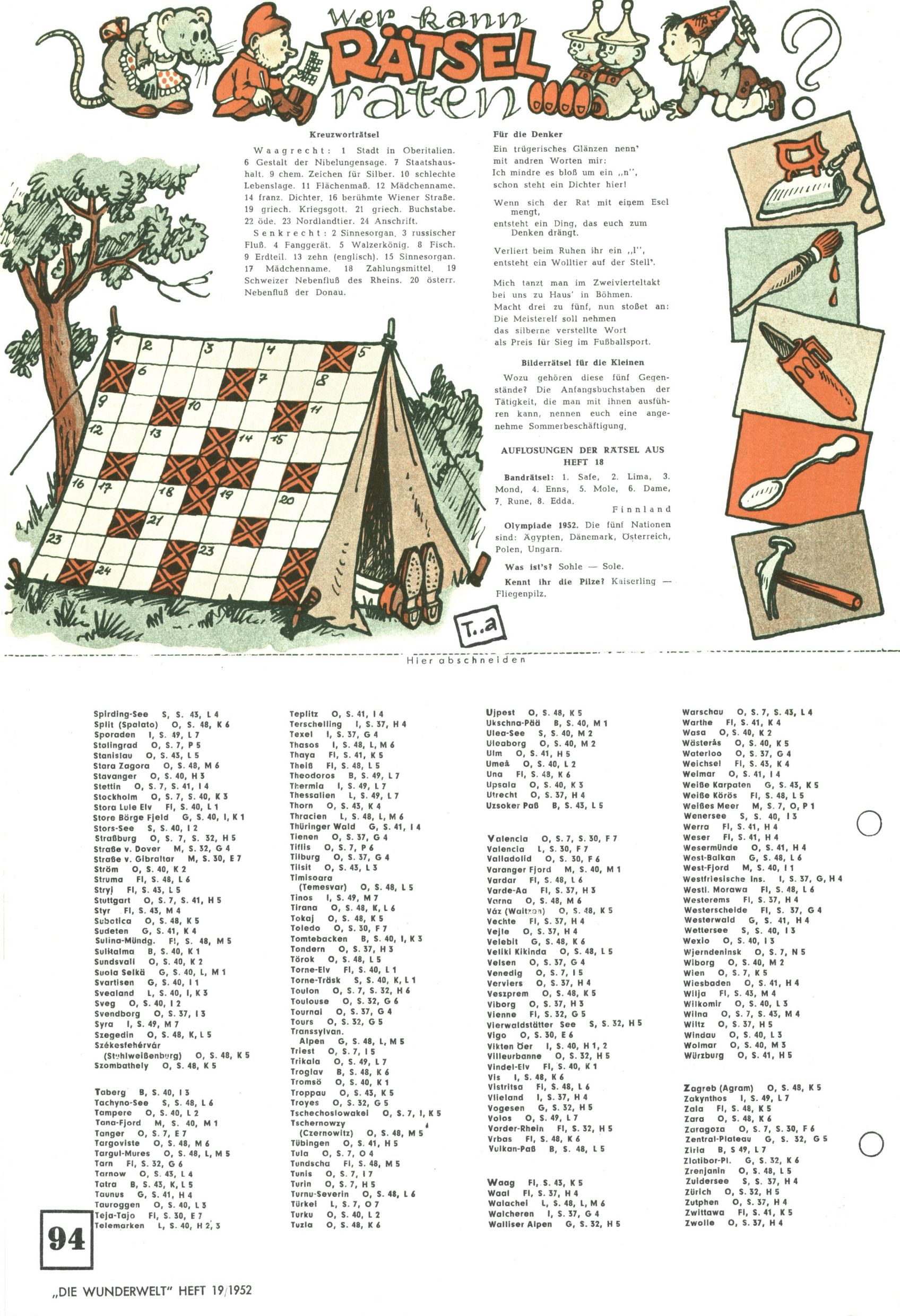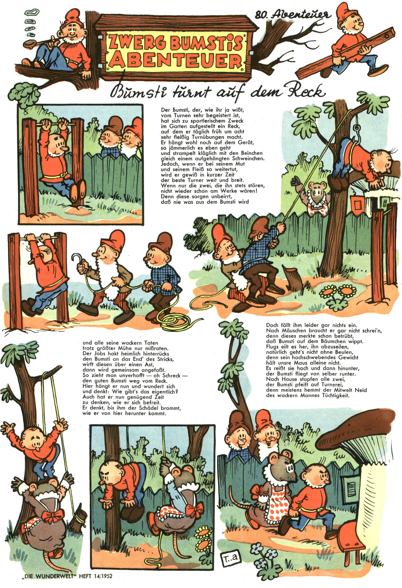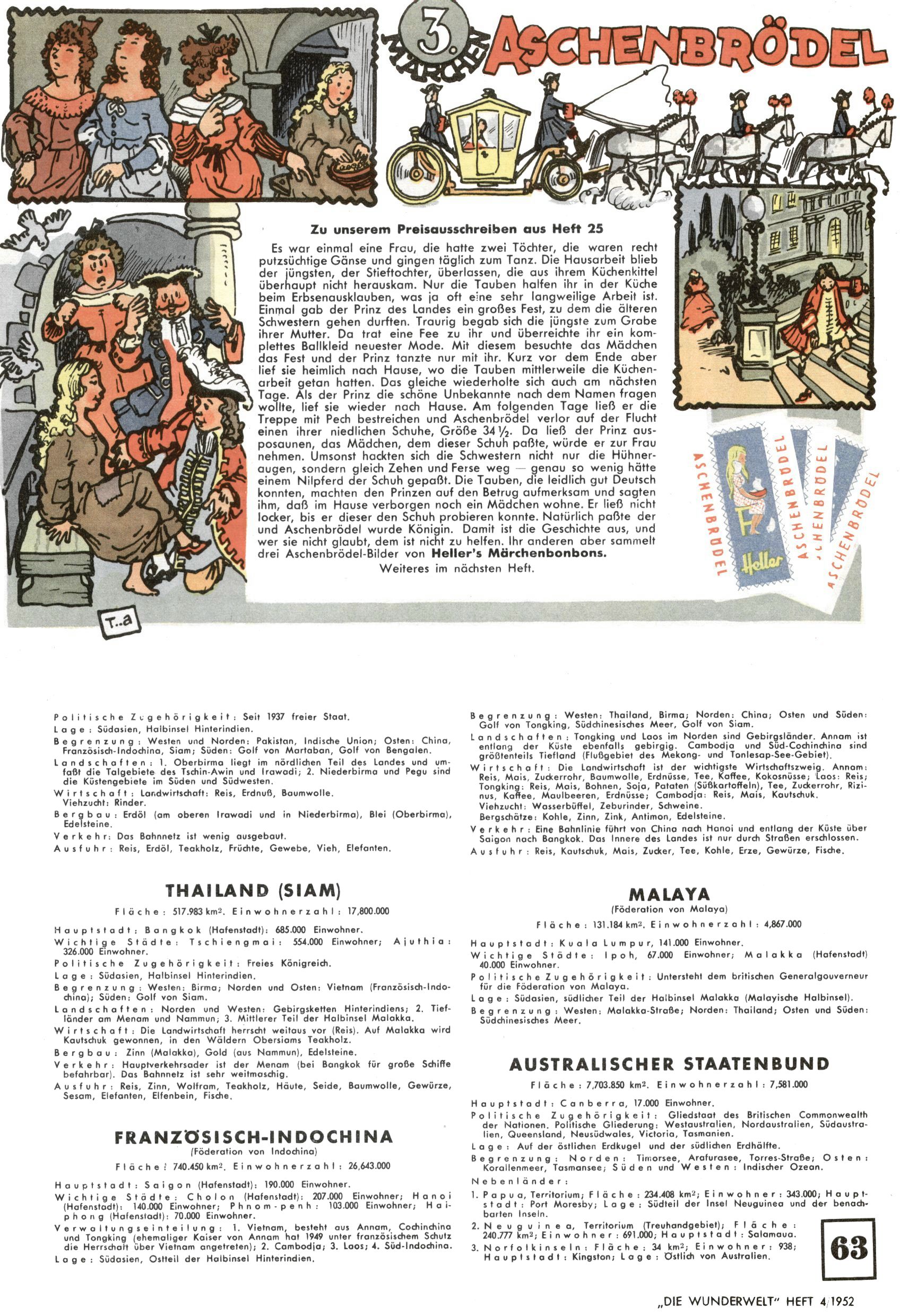 1952 – Der Erfolg hält an Wem Erfolg zuteil wird, der hat wenig Anlass, sein Konzept zu ändern. Und das war in gewisser Weise auch gut so bei allen inhaltlichen Schwächen der Beiträge in der Wunderwelt 1952. Der Erfolg der Zeitung wurde in erster Linie von der grafischen Umsetzung getragen; die lieblichen Bilder einer heilen Märchenwelt ließen über die oft flauen, pädagogisch teilweise sogar fragwürdigen Texte hinwegsehen. Elfriede Vavrovsky schrieb fast alle Texte und Rosl Warzilek zeichnete immer mehr Titelbilder und Mittelmärchen. ABC Peter Paul Prinz hatte Ende 1951 Meister Hokus als komischen Widerpart vom Zauberlehrling Willibald entdeckt und perfektionierte diesen Dualismus nun immer mehr. Meister Hokus avancierte zur regelmäßigen Lachnummer. Dafür überließ ABC vorübergehend Teja Aicher die Gestaltung der technischen Seite, dessen Zwerg Bumsti ebenfalls bereits untrennbar mit der Wunderwelt verbunden schien und längst zum Markenzeichen aufgestiegen war. Seine ko(s)mischen Superhelden Piff und Paff hatten jedoch allmählich genug von den Menschen und kehrten der Erde den Rücken zu. Für den Einsatz im Schulunterricht wurden weiterhin von Elfriede Vavrovsky erstellte politische und geografische Daten und Karten gedruckt, was gerne angenommen wurde, denn teure Atlanten gab es 1952 noch wenige, als viele politische Grenzen gar nicht endgültig geklärt schienen. |