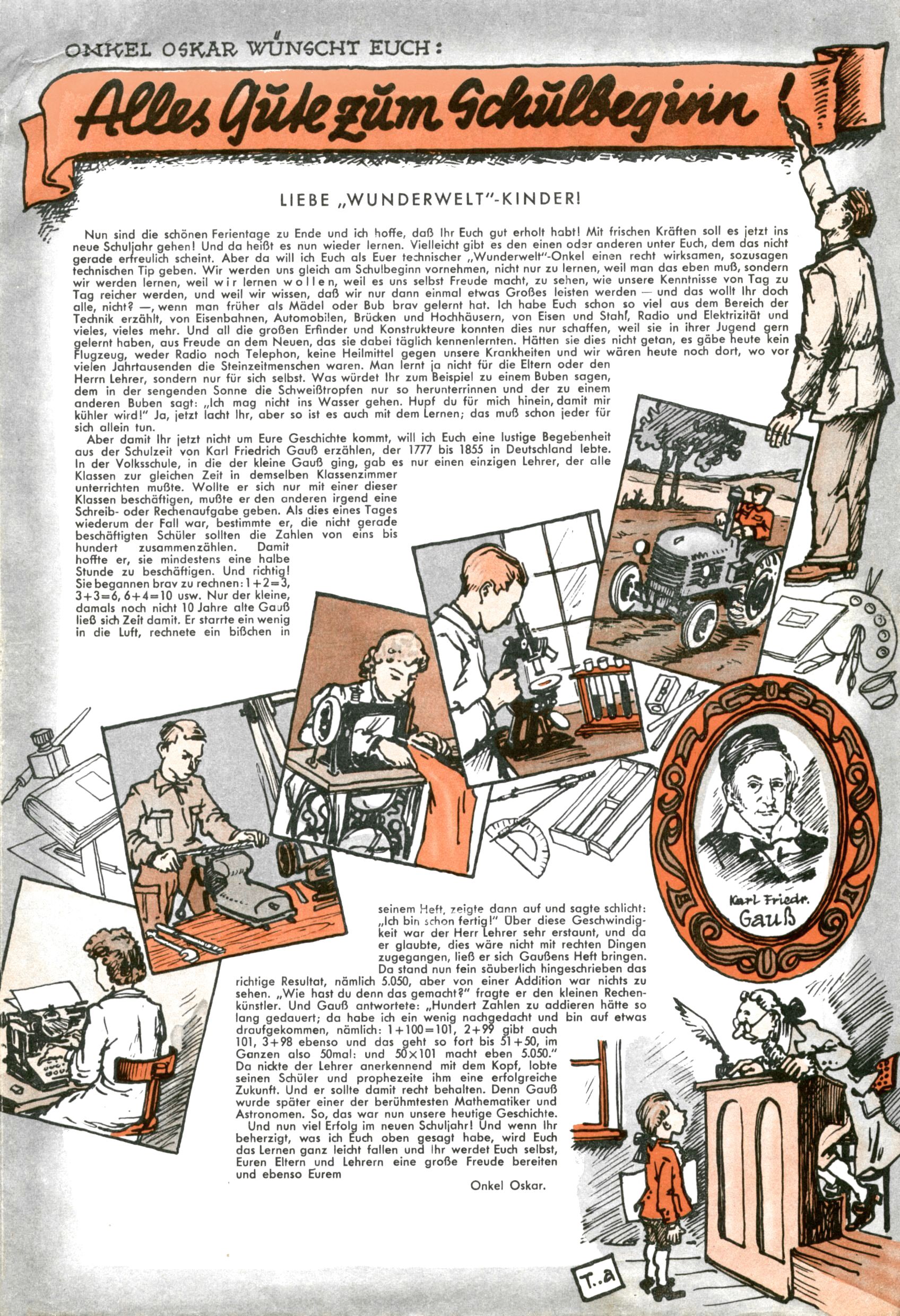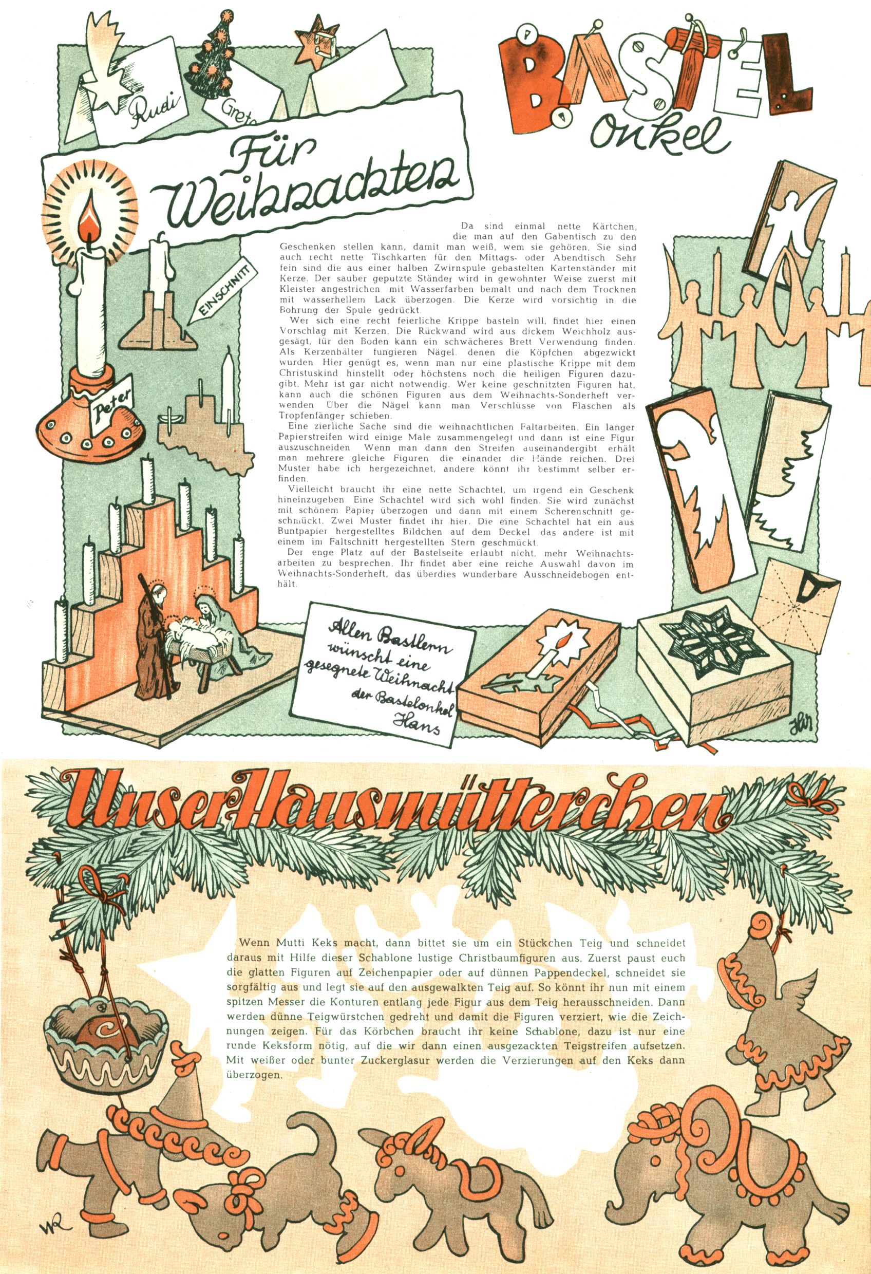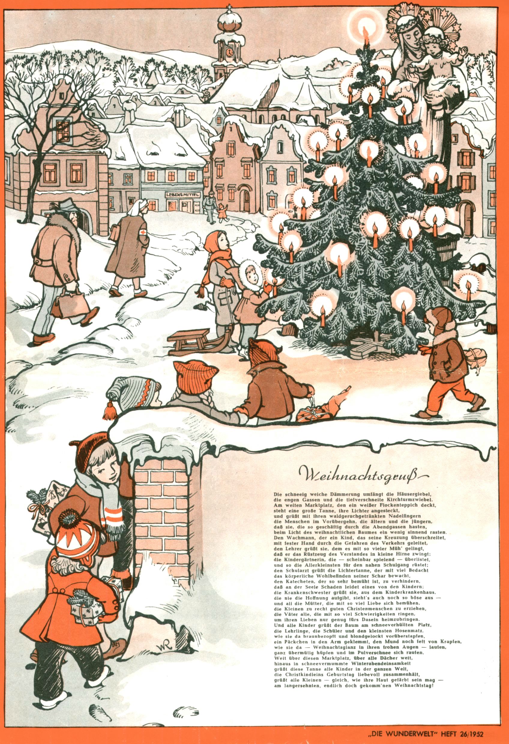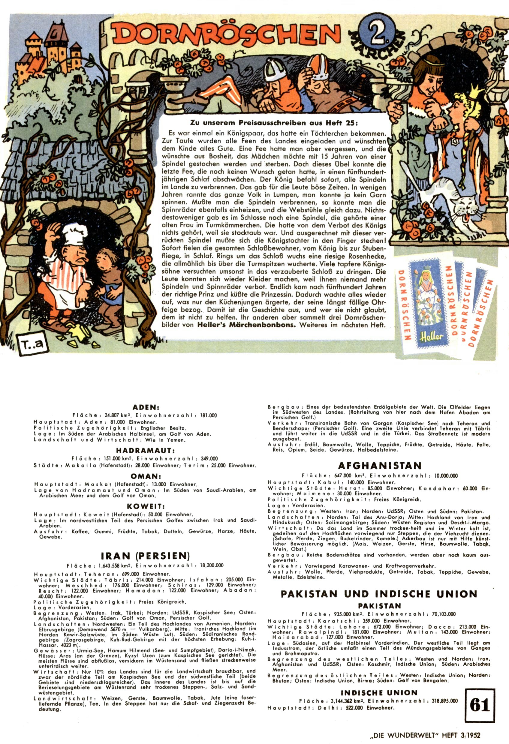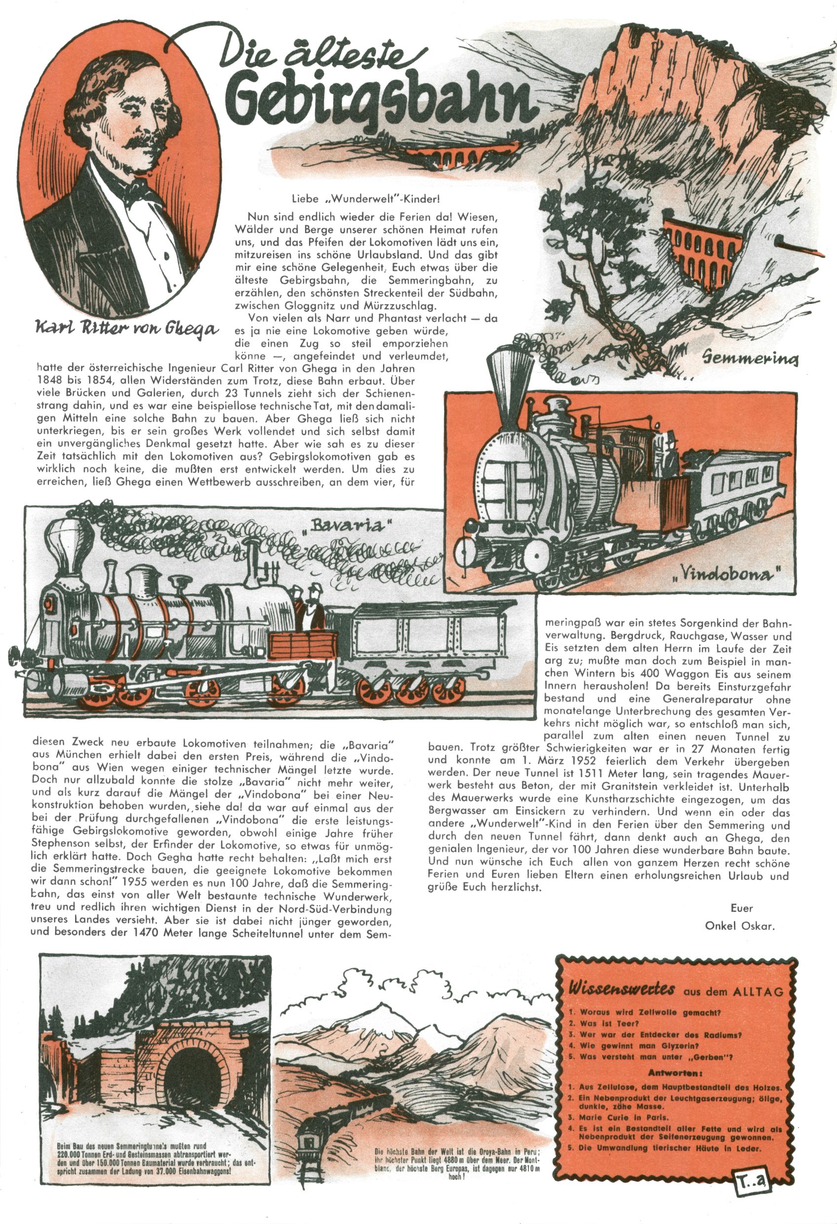 1952 – Der Erfolg hält an Wem Erfolg zuteil wird, der hat wenig Anlass, sein Konzept zu ändern. Und das war in gewisser Weise auch gut so bei allen inhaltlichen Schwächen der Beiträge in der Wunderwelt 1952. Der Erfolg der Zeitung wurde in erster Linie von der grafischen Umsetzung getragen; die lieblichen Bilder einer heilen Märchenwelt ließen über die oft flauen, pädagogisch teilweise sogar fragwürdigen Texte hinwegsehen. Elfriede Vavrovsky schrieb fast alle Texte und Rosl Warzilek zeichnete immer mehr Titelbilder und Mittelmärchen. ABC Peter Paul Prinz hatte Ende 1951 Meister Hokus als komischen Widerpart vom Zauberlehrling Willibald entdeckt und perfektionierte diesen Dualismus nun immer mehr. Meister Hokus avancierte zur regelmäßigen Lachnummer. Dafür überließ ABC vorübergehend Teja Aicher die Gestaltung der technischen Seite, dessen Zwerg Bumsti ebenfalls bereits untrennbar mit der Wunderwelt verbunden schien und längst zum Markenzeichen aufgestiegen war. Seine ko(s)mischen Superhelden Piff und Paff hatten jedoch allmählich genug von den Menschen und kehrten der Erde den Rücken zu. Für den Einsatz im Schulunterricht wurden weiterhin von Elfriede Vavrovsky erstellte politische und geografische Daten und Karten gedruckt, was gerne angenommen wurde, denn teure Atlanten gab es 1952 noch wenige, als viele politische Grenzen gar nicht endgültig geklärt schienen. |