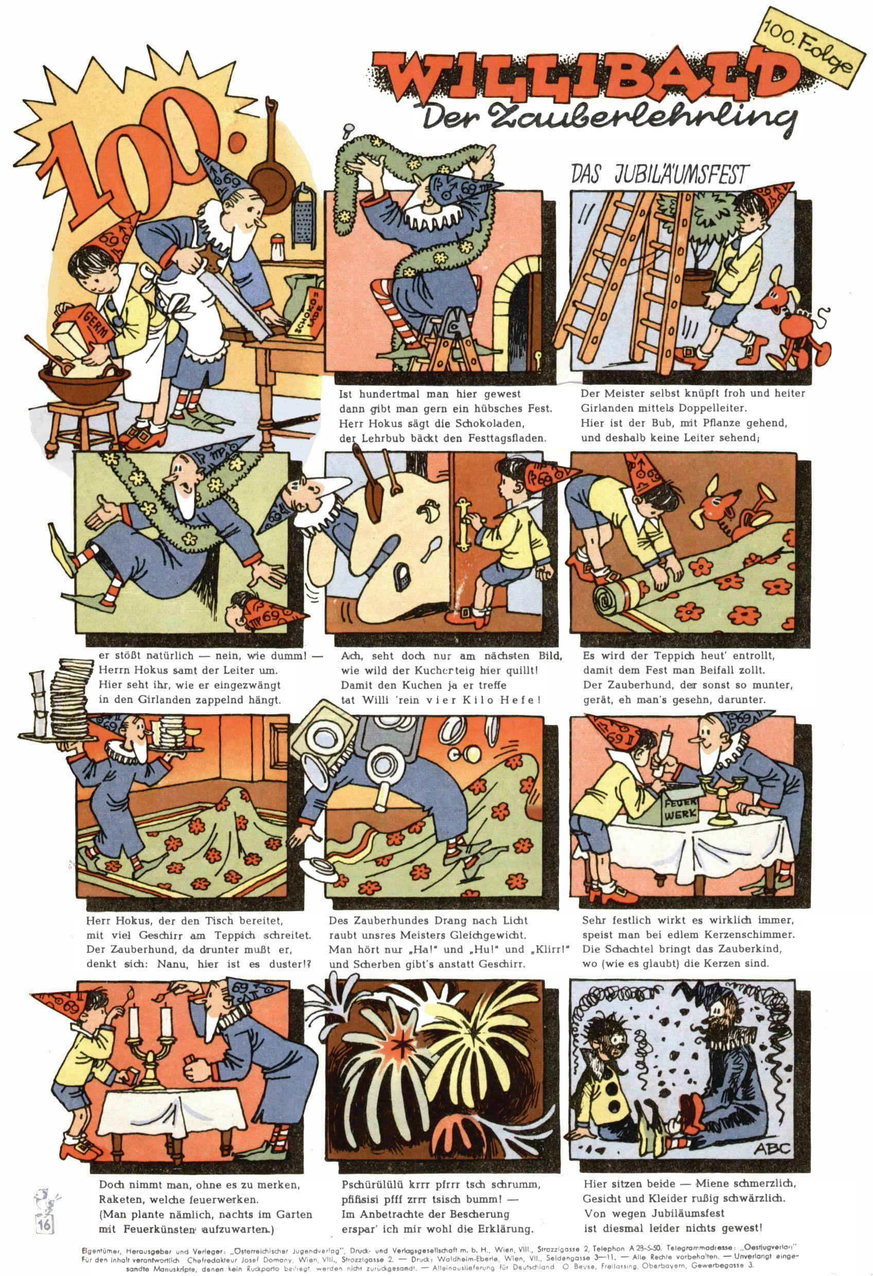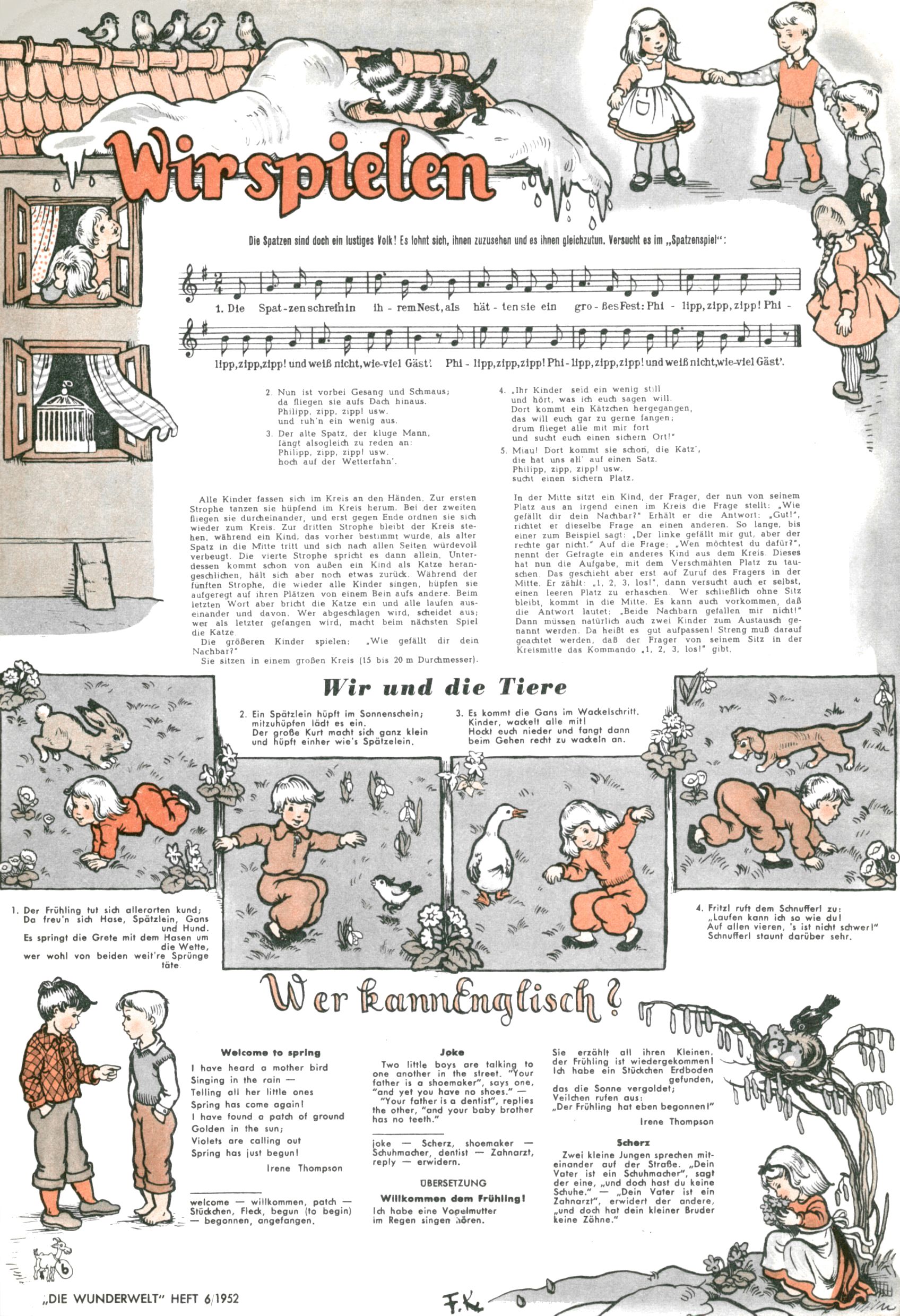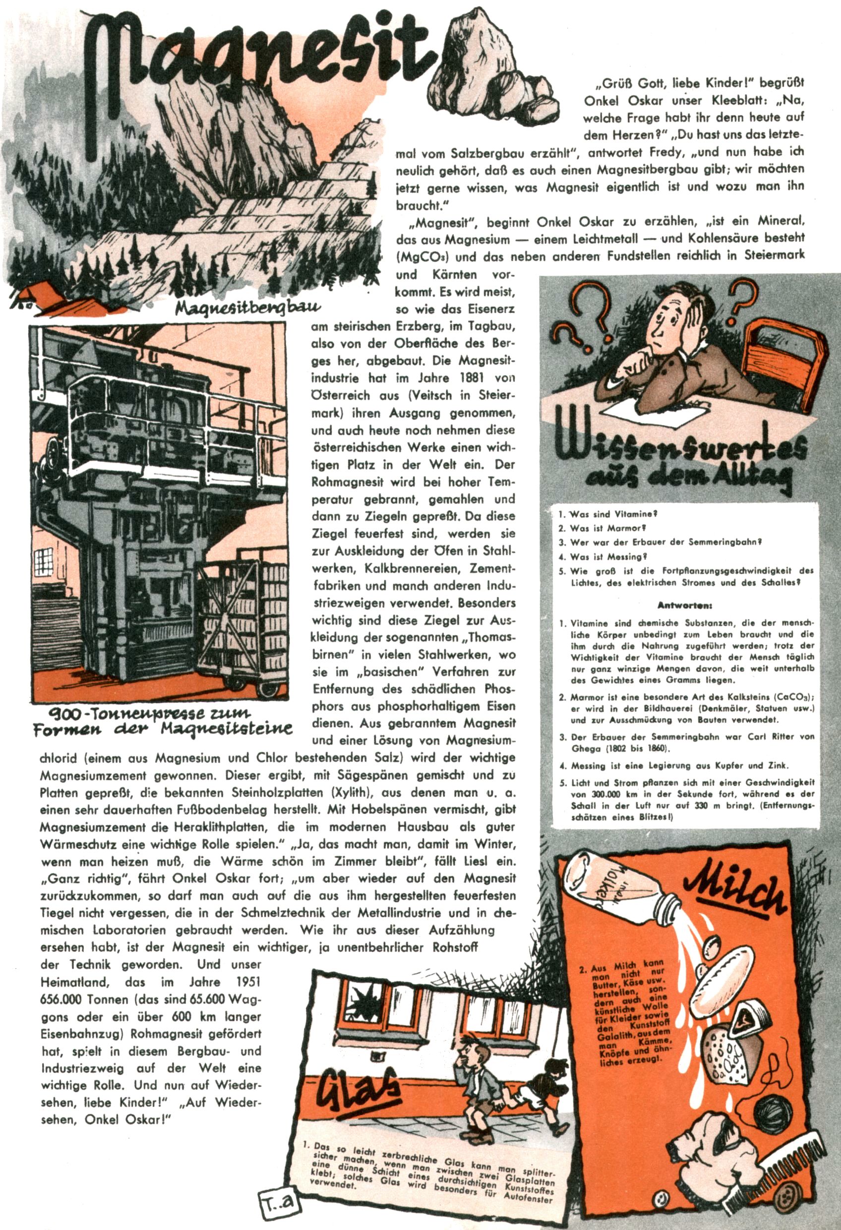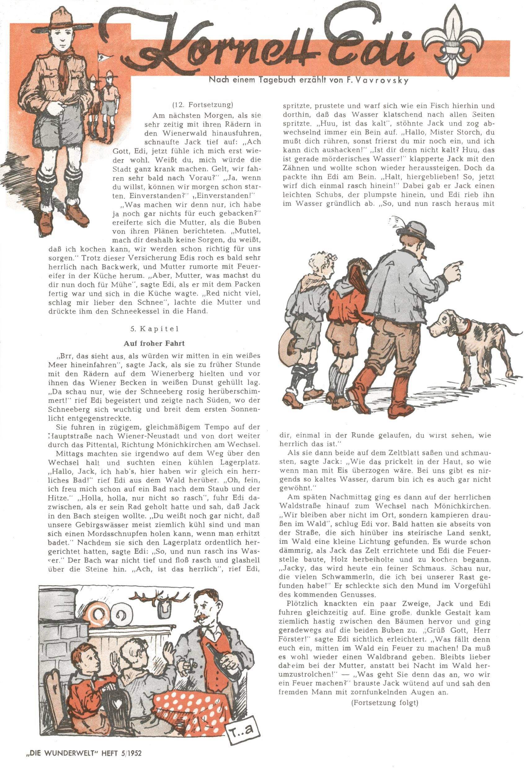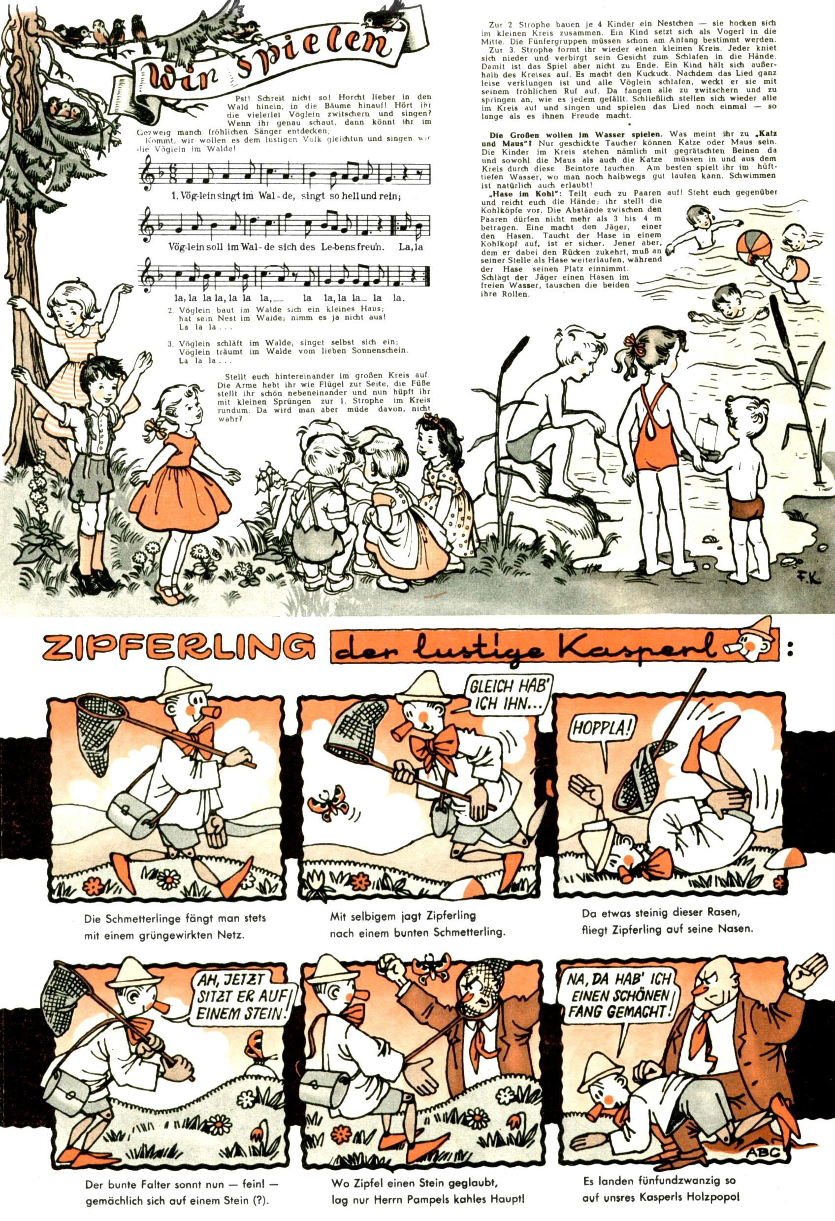 1952 – Der Erfolg hält an Wem Erfolg zuteil wird, der hat wenig Anlass, sein Konzept zu ändern. Und das war in gewisser Weise auch gut so bei allen inhaltlichen Schwächen der Beiträge in der Wunderwelt 1952. Der Erfolg der Zeitung wurde in erster Linie von der grafischen Umsetzung getragen; die lieblichen Bilder einer heilen Märchenwelt ließen über die oft flauen, pädagogisch teilweise sogar fragwürdigen Texte hinwegsehen. Elfriede Vavrovsky schrieb fast alle Texte und Rosl Warzilek zeichnete immer mehr Titelbilder und Mittelmärchen. ABC Peter Paul Prinz hatte Ende 1951 Meister Hokus als komischen Widerpart vom Zauberlehrling Willibald entdeckt und perfektionierte diesen Dualismus nun immer mehr. Meister Hokus avancierte zur regelmäßigen Lachnummer. Dafür überließ ABC vorübergehend Teja Aicher die Gestaltung der technischen Seite, dessen Zwerg Bumsti ebenfalls bereits untrennbar mit der Wunderwelt verbunden schien und längst zum Markenzeichen aufgestiegen war. Seine ko(s)mischen Superhelden Piff und Paff hatten jedoch allmählich genug von den Menschen und kehrten der Erde den Rücken zu. Für den Einsatz im Schulunterricht wurden weiterhin von Elfriede Vavrovsky erstellte politische und geografische Daten und Karten gedruckt, was gerne angenommen wurde, denn teure Atlanten gab es 1952 noch wenige, als viele politische Grenzen gar nicht endgültig geklärt schienen. |