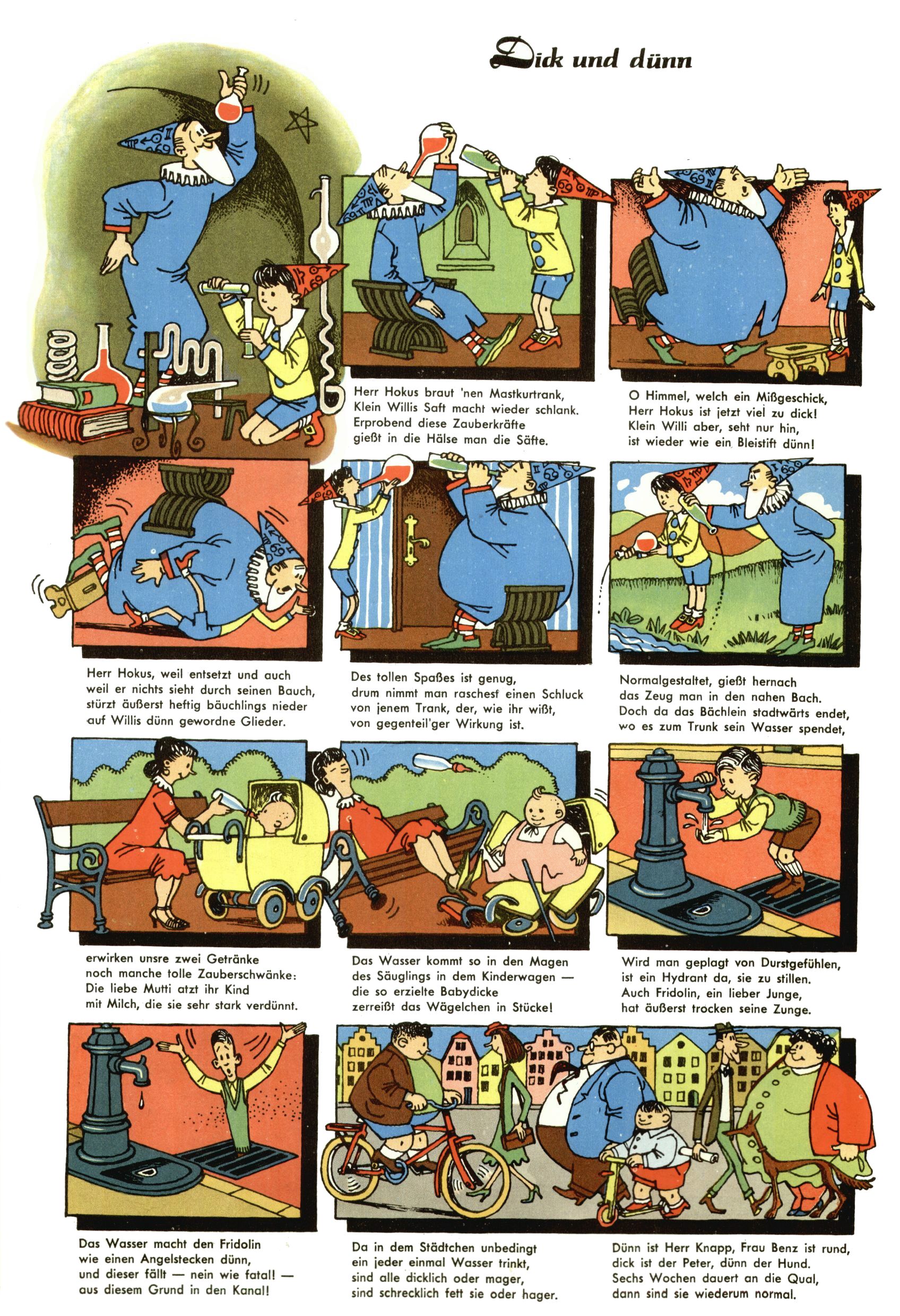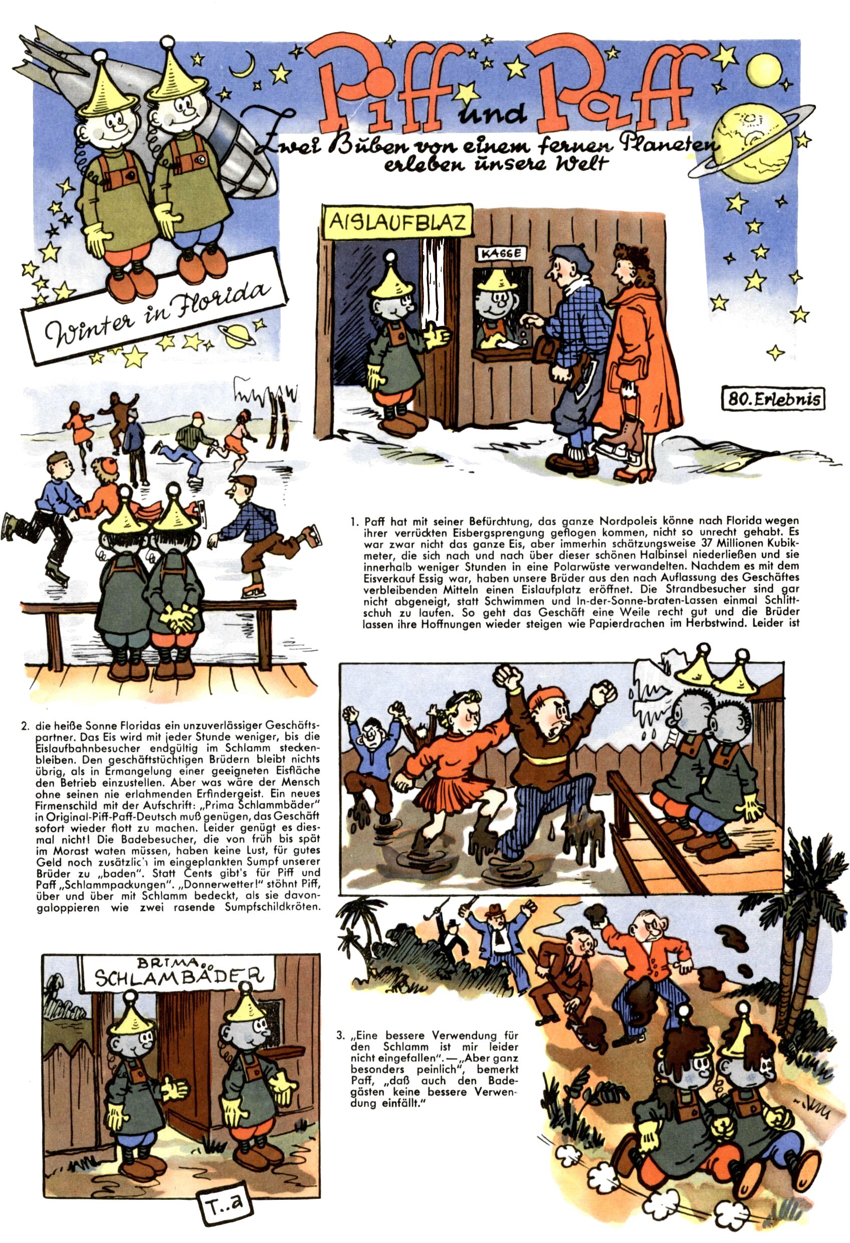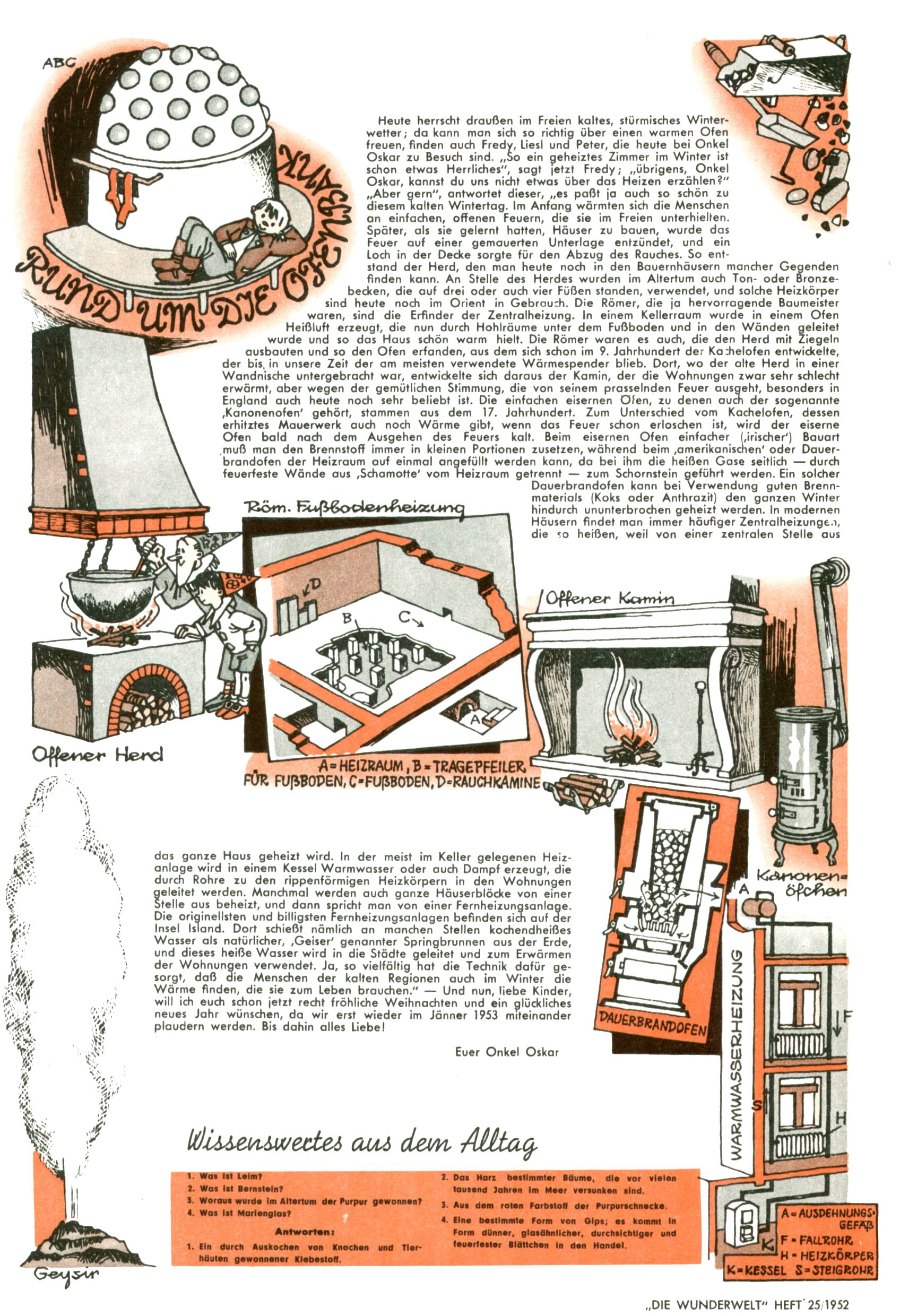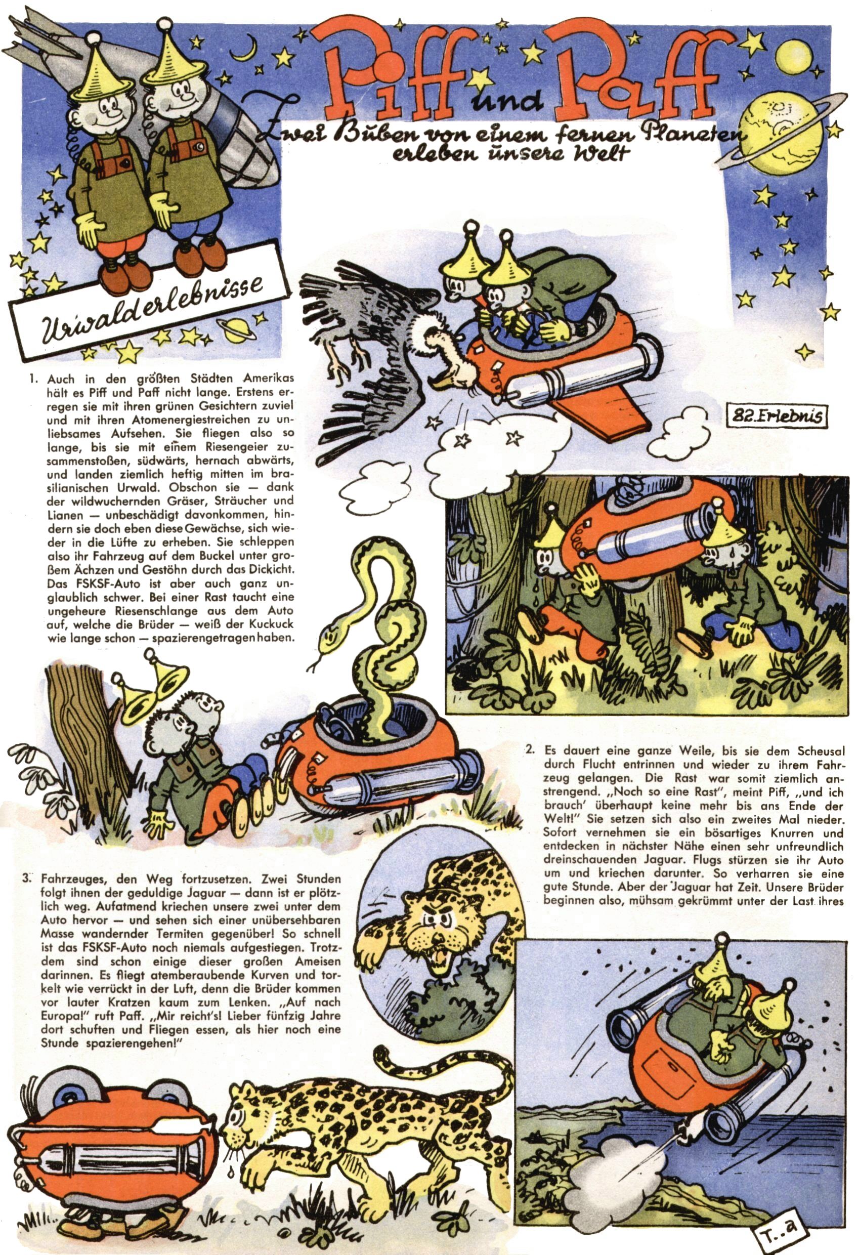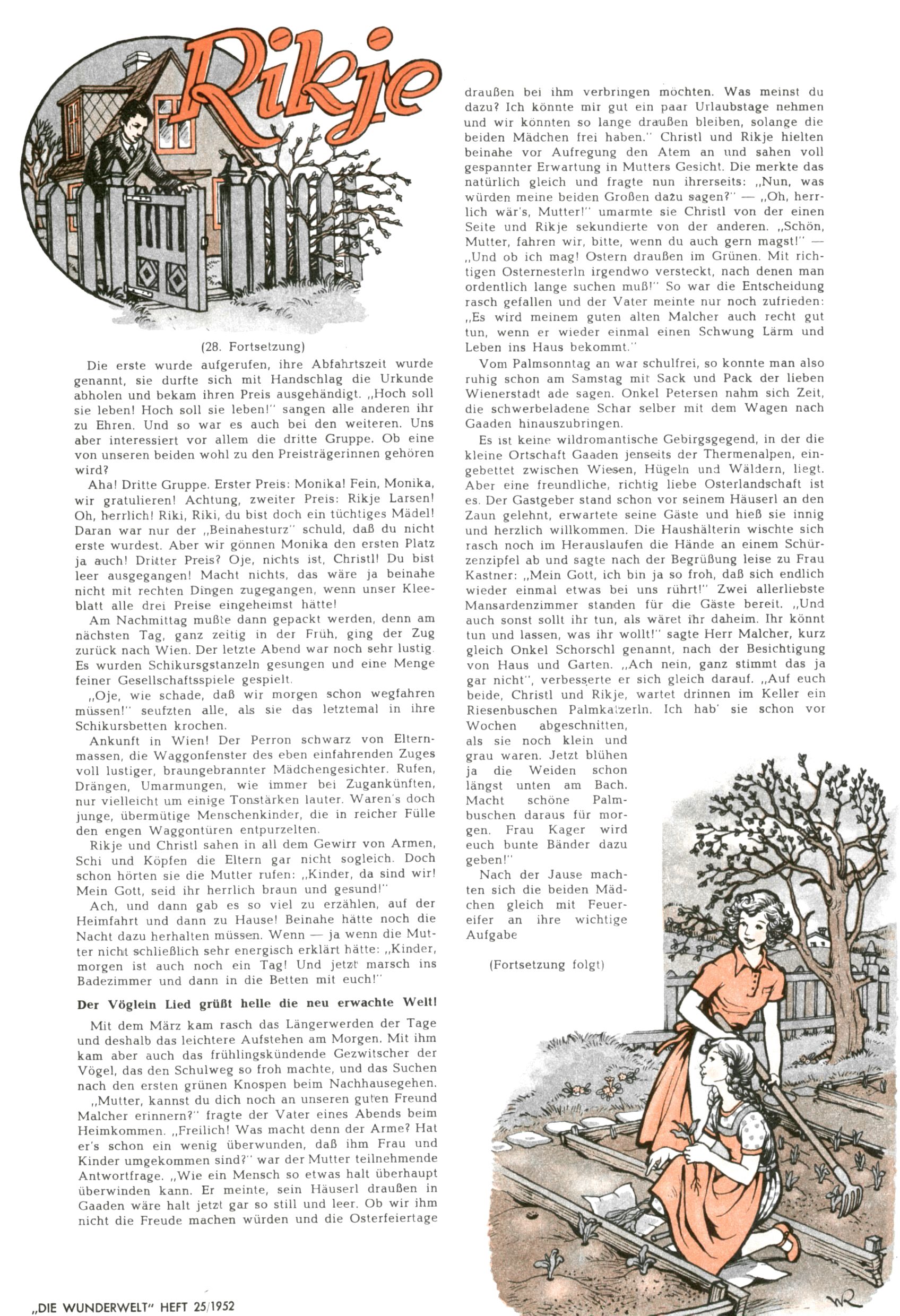 1952 – Der Erfolg hält an Wem Erfolg zuteil wird, der hat wenig Anlass, sein Konzept zu ändern. Und das war in gewisser Weise auch gut so bei allen inhaltlichen Schwächen der Beiträge in der Wunderwelt 1952. Der Erfolg der Zeitung wurde in erster Linie von der grafischen Umsetzung getragen; die lieblichen Bilder einer heilen Märchenwelt ließen über die oft flauen, pädagogisch teilweise sogar fragwürdigen Texte hinwegsehen. Elfriede Vavrovsky schrieb fast alle Texte und Rosl Warzilek zeichnete immer mehr Titelbilder und Mittelmärchen. ABC Peter Paul Prinz hatte Ende 1951 Meister Hokus als komischen Widerpart vom Zauberlehrling Willibald entdeckt und perfektionierte diesen Dualismus nun immer mehr. Meister Hokus avancierte zur regelmäßigen Lachnummer. Dafür überließ ABC vorübergehend Teja Aicher die Gestaltung der technischen Seite, dessen Zwerg Bumsti ebenfalls bereits untrennbar mit der Wunderwelt verbunden schien und längst zum Markenzeichen aufgestiegen war. Seine ko(s)mischen Superhelden Piff und Paff hatten jedoch allmählich genug von den Menschen und kehrten der Erde den Rücken zu. Für den Einsatz im Schulunterricht wurden weiterhin von Elfriede Vavrovsky erstellte politische und geografische Daten und Karten gedruckt, was gerne angenommen wurde, denn teure Atlanten gab es 1952 noch wenige, als viele politische Grenzen gar nicht endgültig geklärt schienen. |