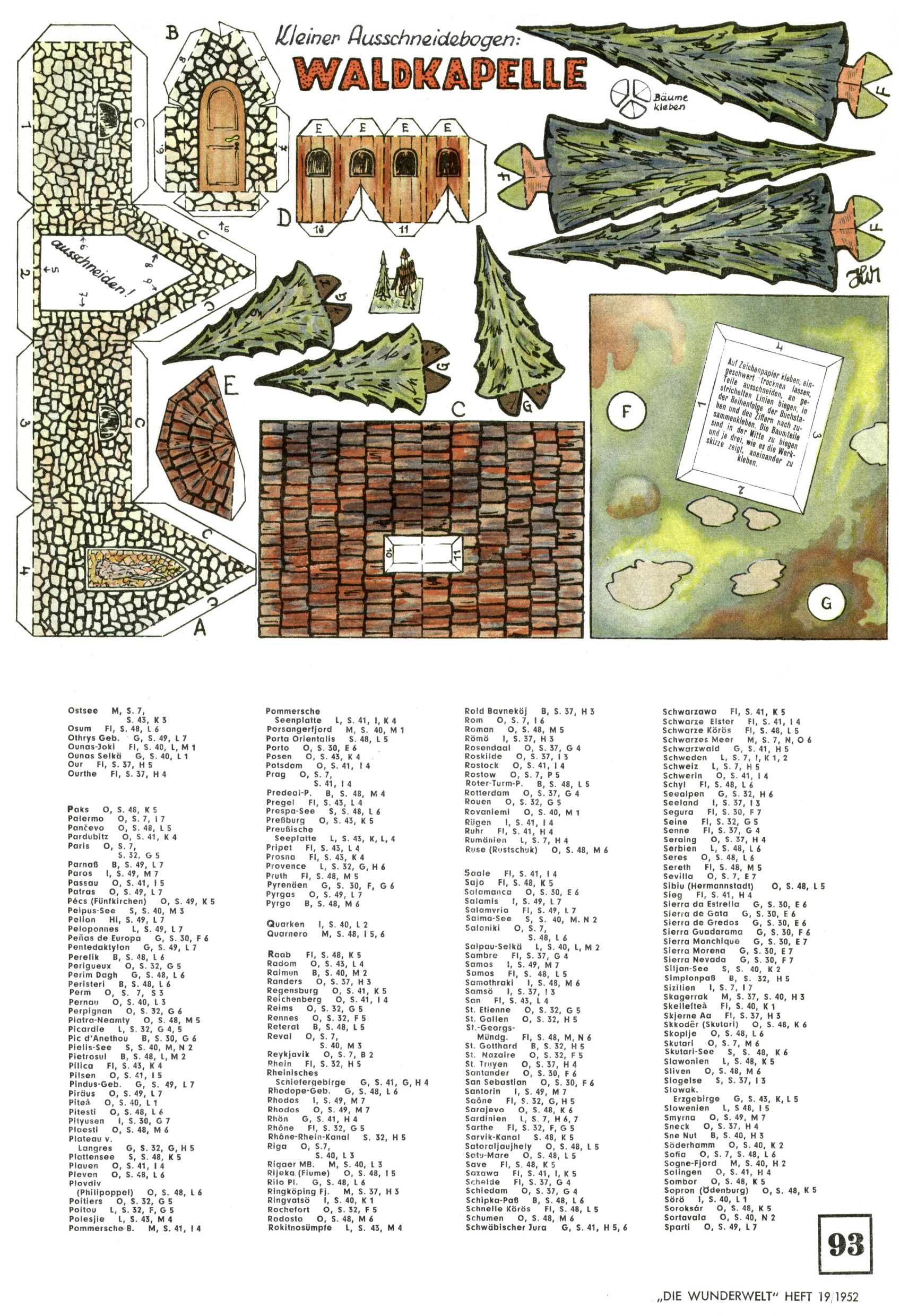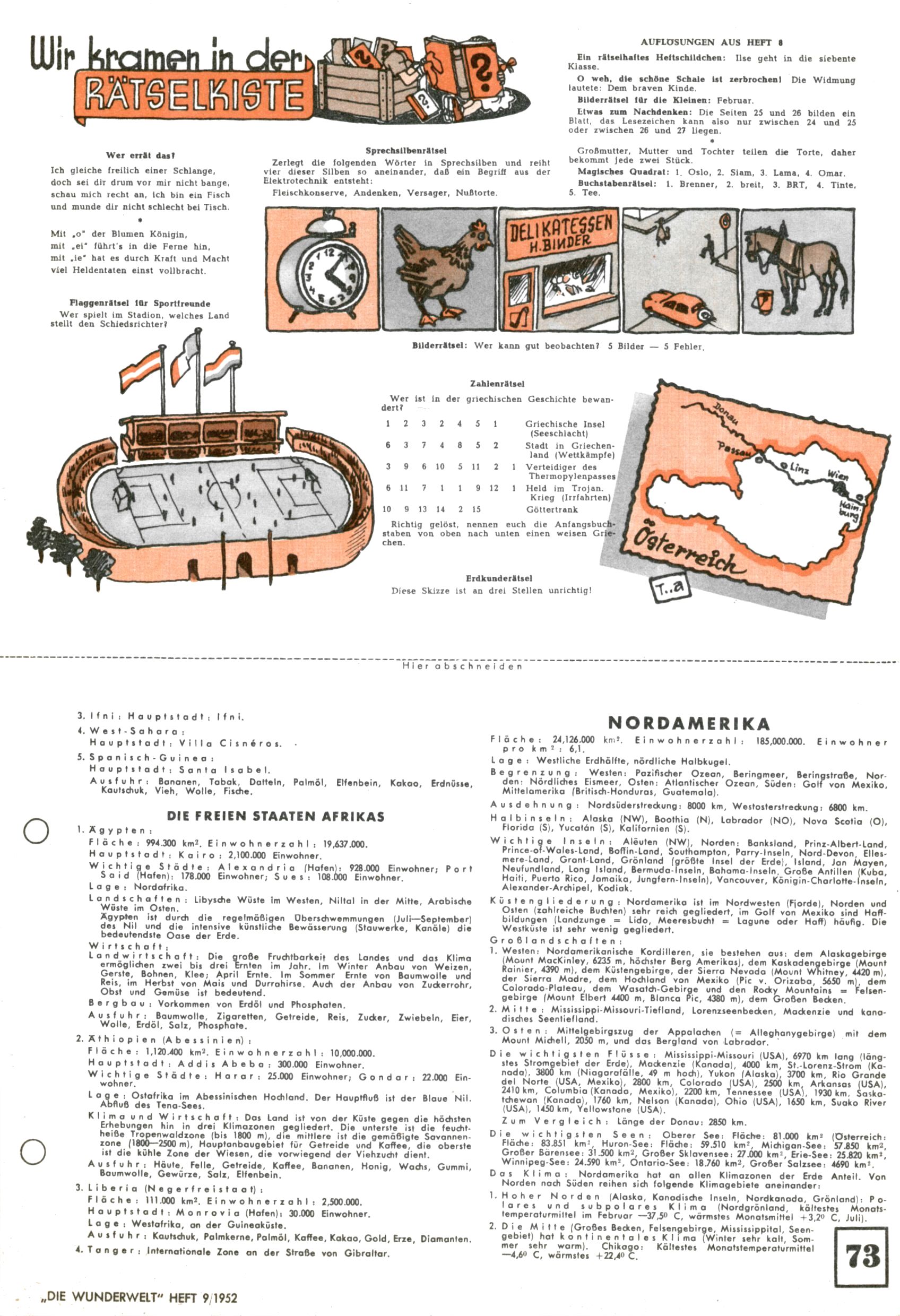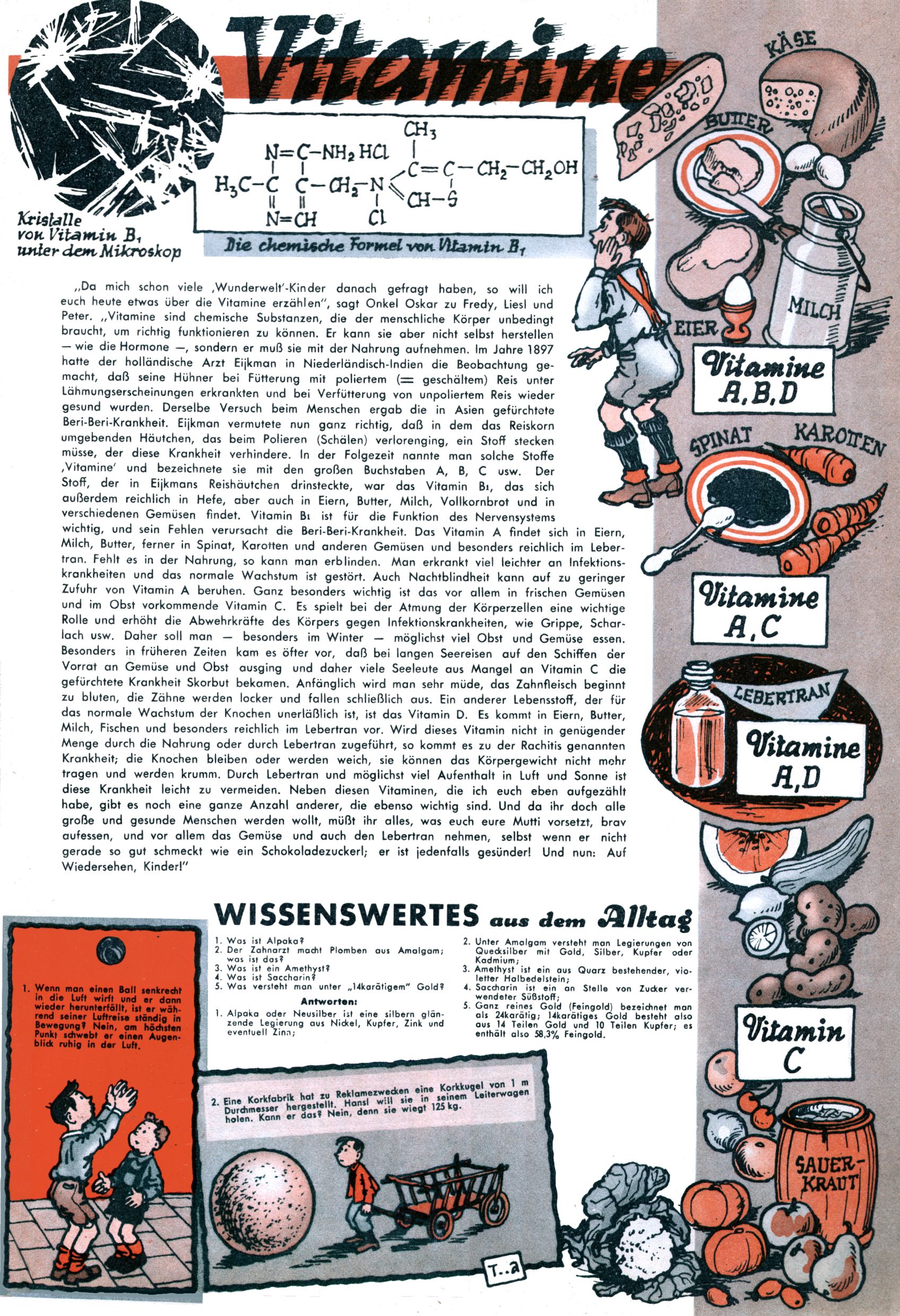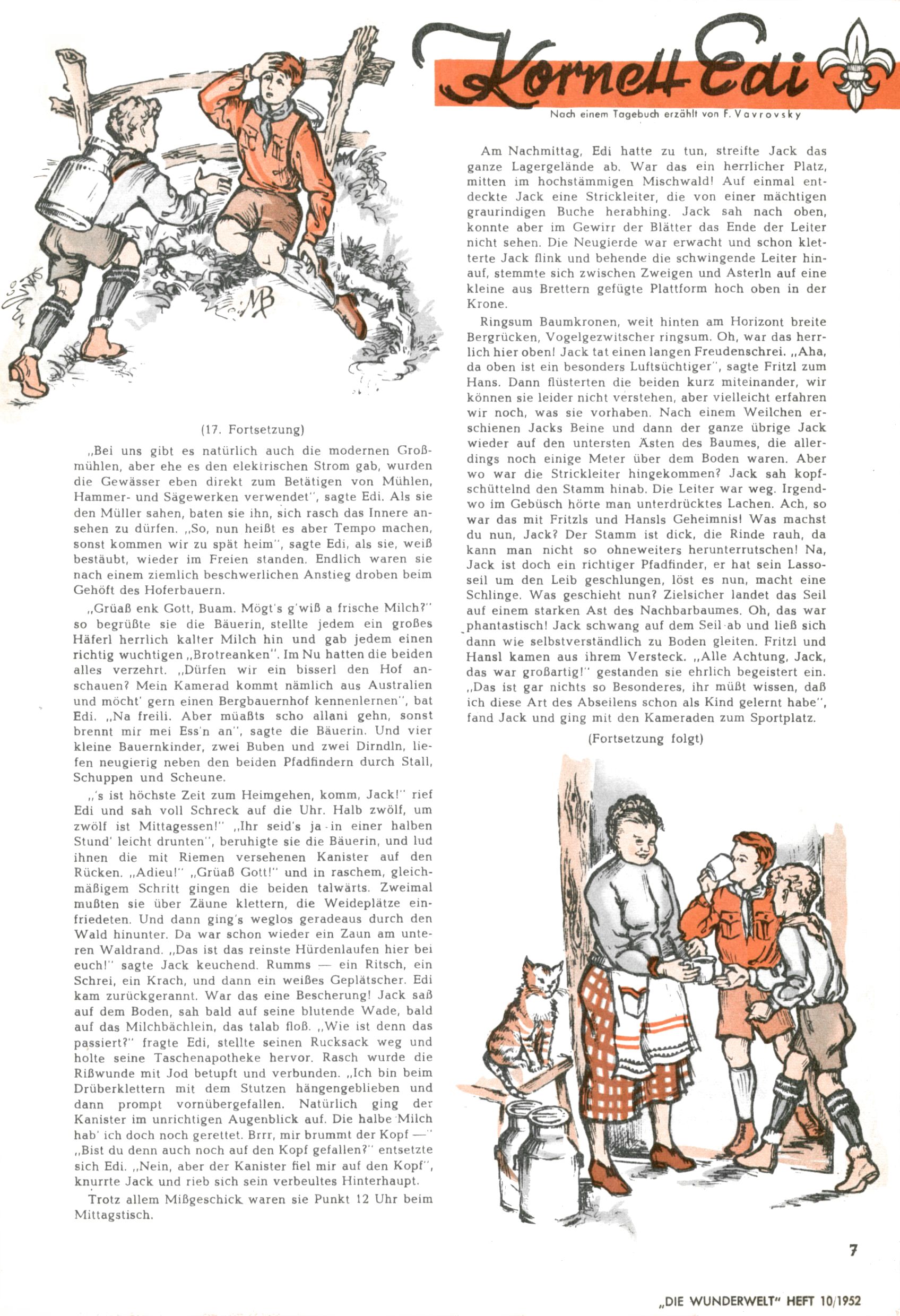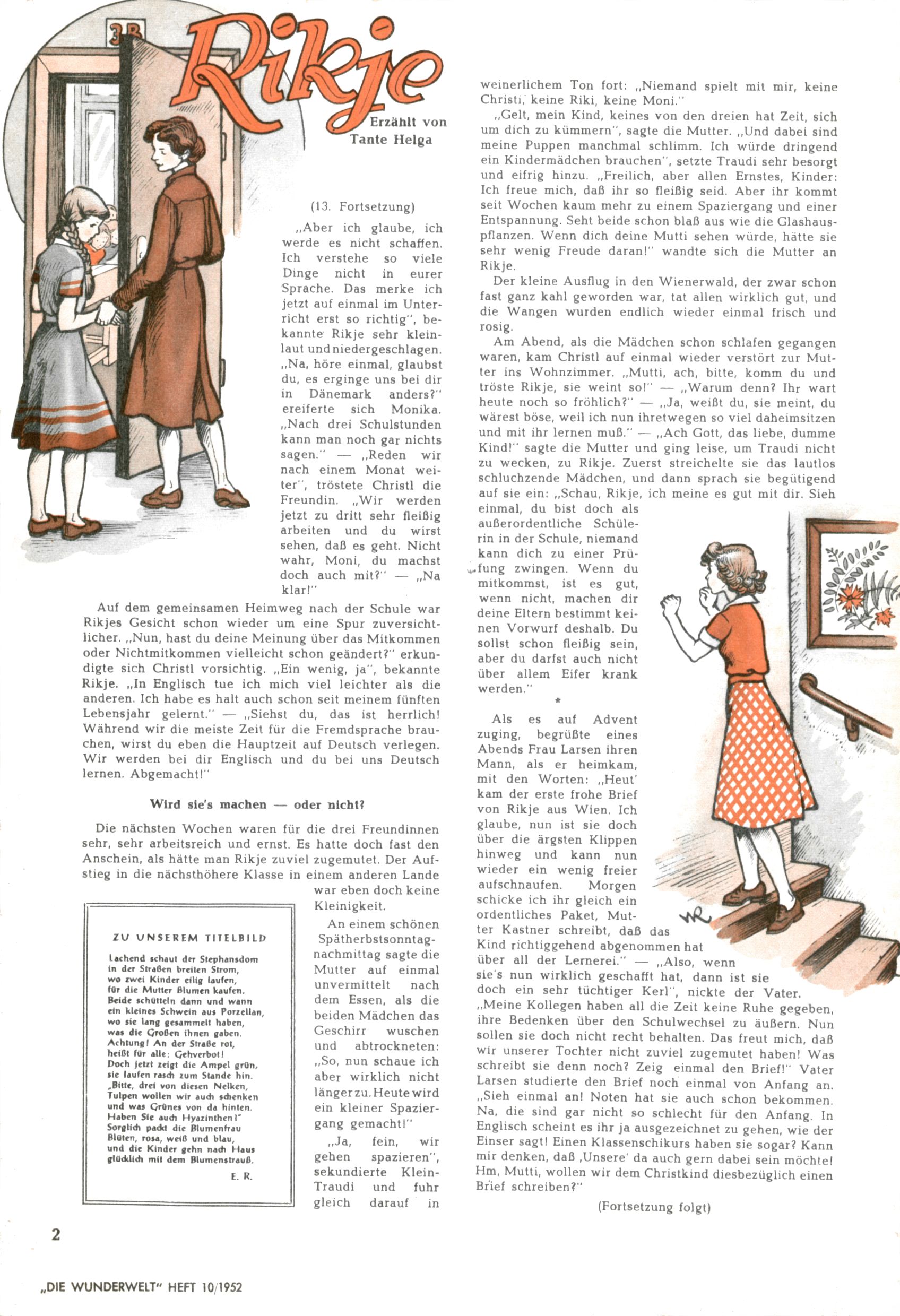 1952 – Der Erfolg hält an Wem Erfolg zuteil wird, der hat wenig Anlass, sein Konzept zu ändern. Und das war in gewisser Weise auch gut so bei allen inhaltlichen Schwächen der Beiträge in der Wunderwelt 1952. Der Erfolg der Zeitung wurde in erster Linie von der grafischen Umsetzung getragen; die lieblichen Bilder einer heilen Märchenwelt ließen über die oft flauen, pädagogisch teilweise sogar fragwürdigen Texte hinwegsehen. Elfriede Vavrovsky schrieb fast alle Texte und Rosl Warzilek zeichnete immer mehr Titelbilder und Mittelmärchen. ABC Peter Paul Prinz hatte Ende 1951 Meister Hokus als komischen Widerpart vom Zauberlehrling Willibald entdeckt und perfektionierte diesen Dualismus nun immer mehr. Meister Hokus avancierte zur regelmäßigen Lachnummer. Dafür überließ ABC vorübergehend Teja Aicher die Gestaltung der technischen Seite, dessen Zwerg Bumsti ebenfalls bereits untrennbar mit der Wunderwelt verbunden schien und längst zum Markenzeichen aufgestiegen war. Seine ko(s)mischen Superhelden Piff und Paff hatten jedoch allmählich genug von den Menschen und kehrten der Erde den Rücken zu. Für den Einsatz im Schulunterricht wurden weiterhin von Elfriede Vavrovsky erstellte politische und geografische Daten und Karten gedruckt, was gerne angenommen wurde, denn teure Atlanten gab es 1952 noch wenige, als viele politische Grenzen gar nicht endgültig geklärt schienen. |