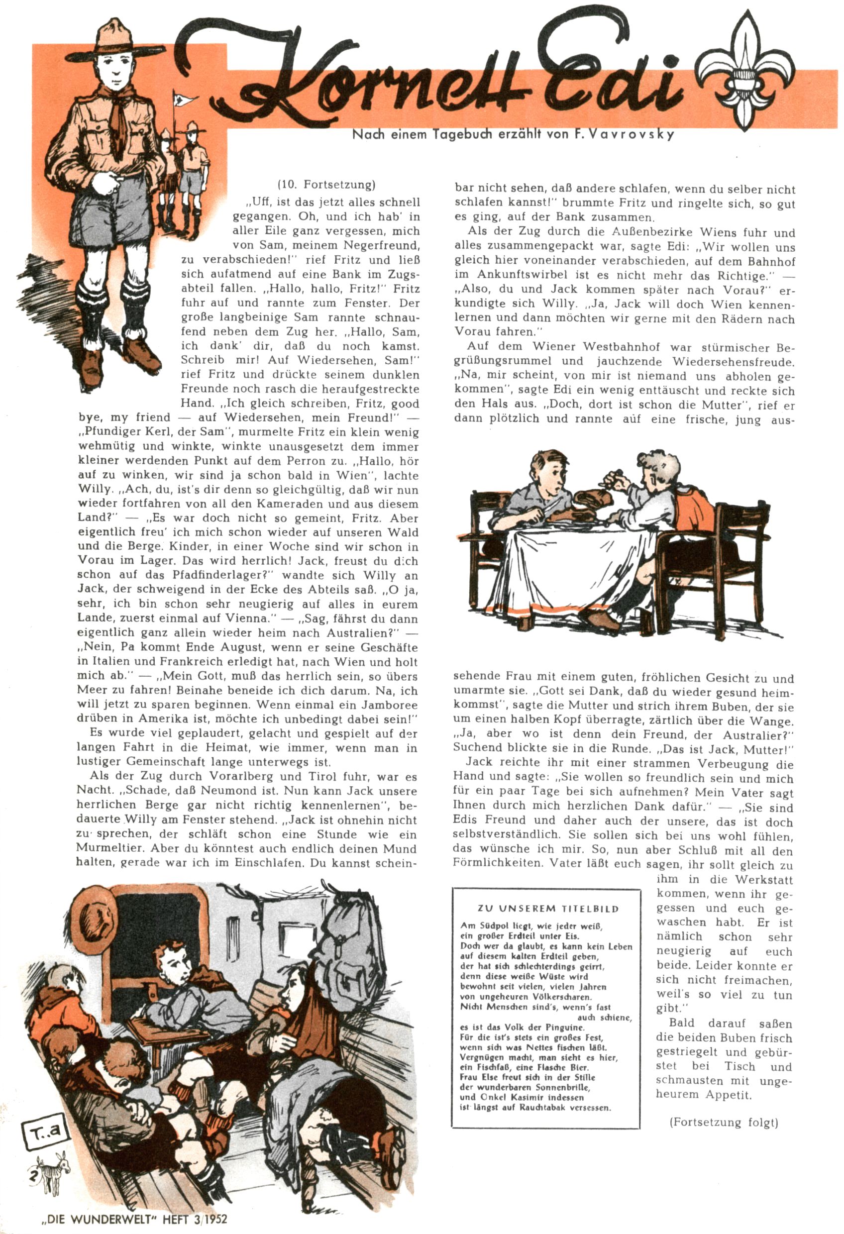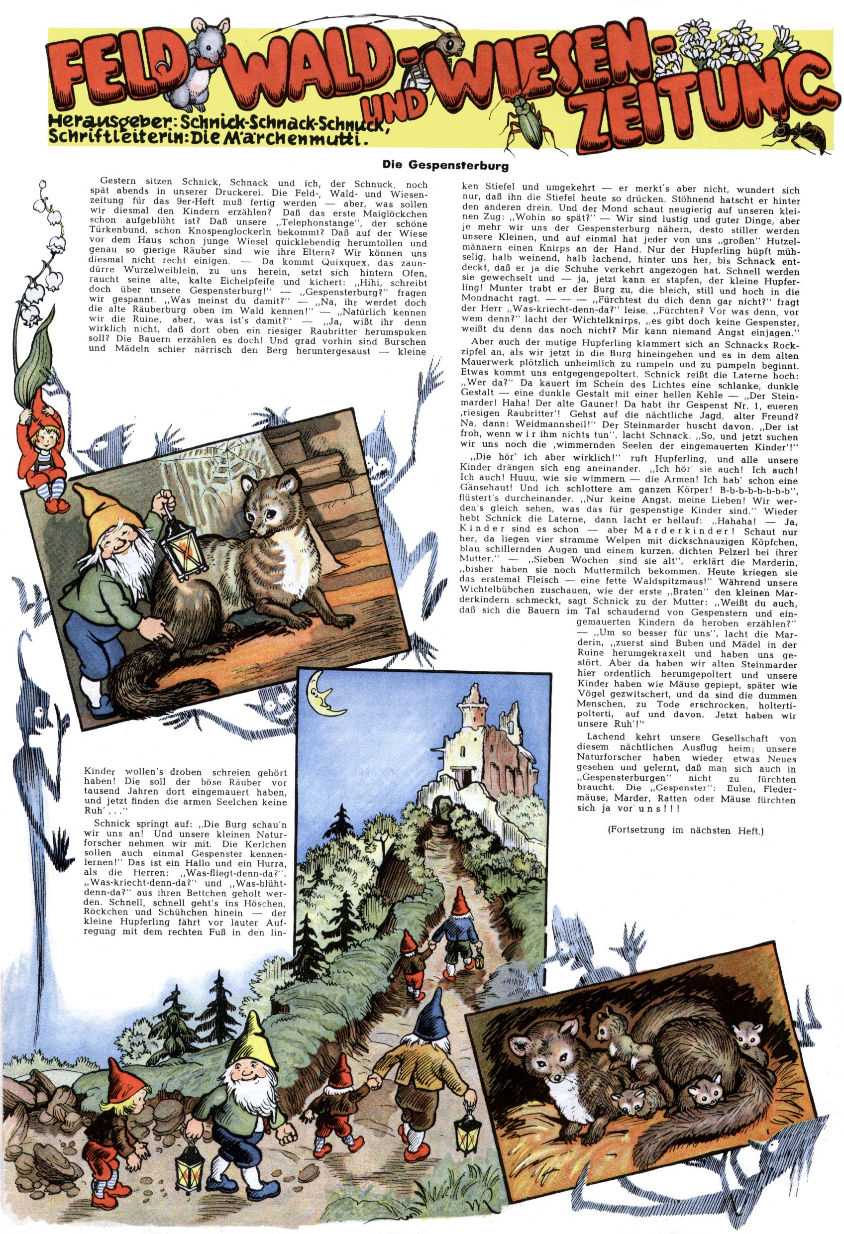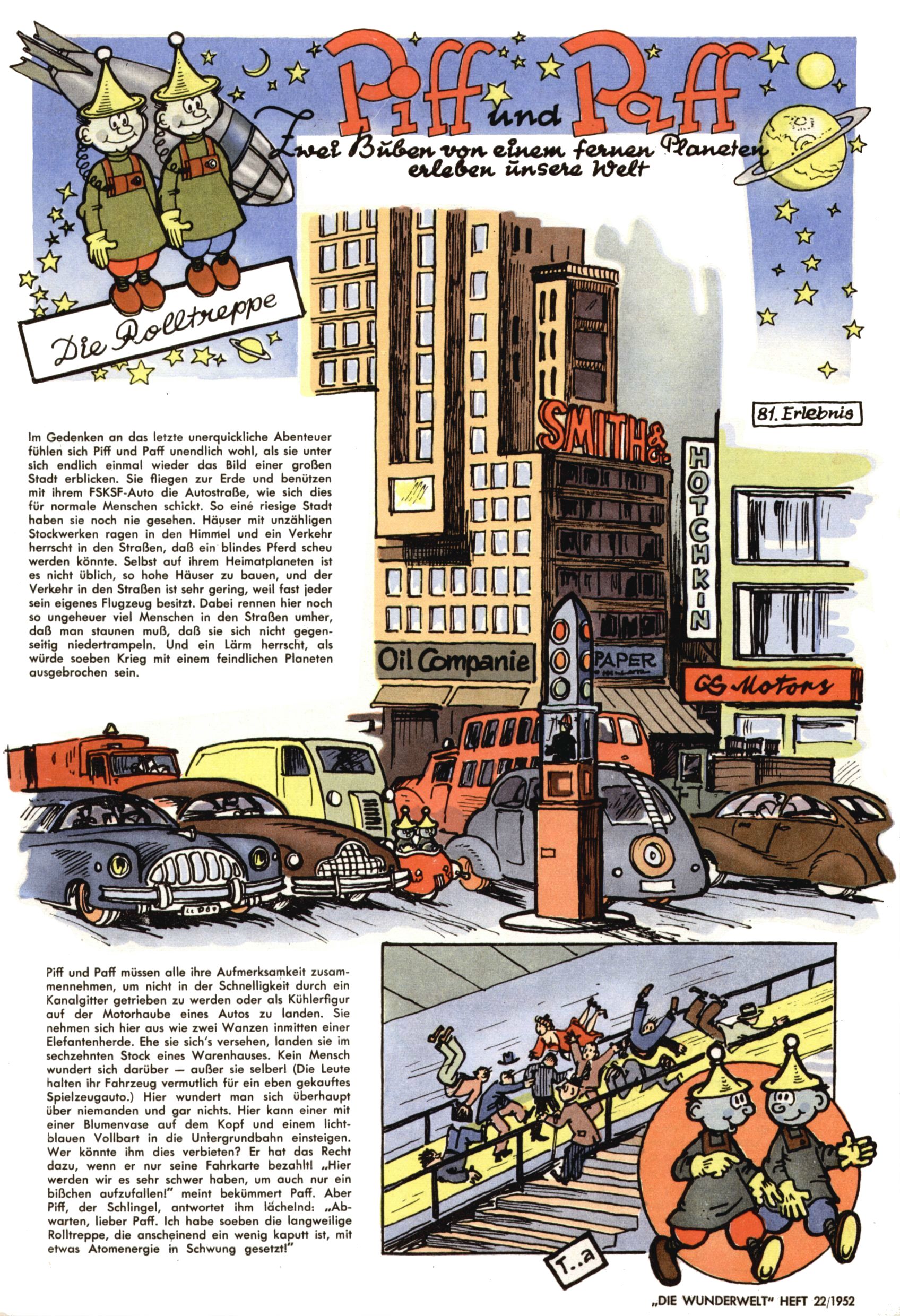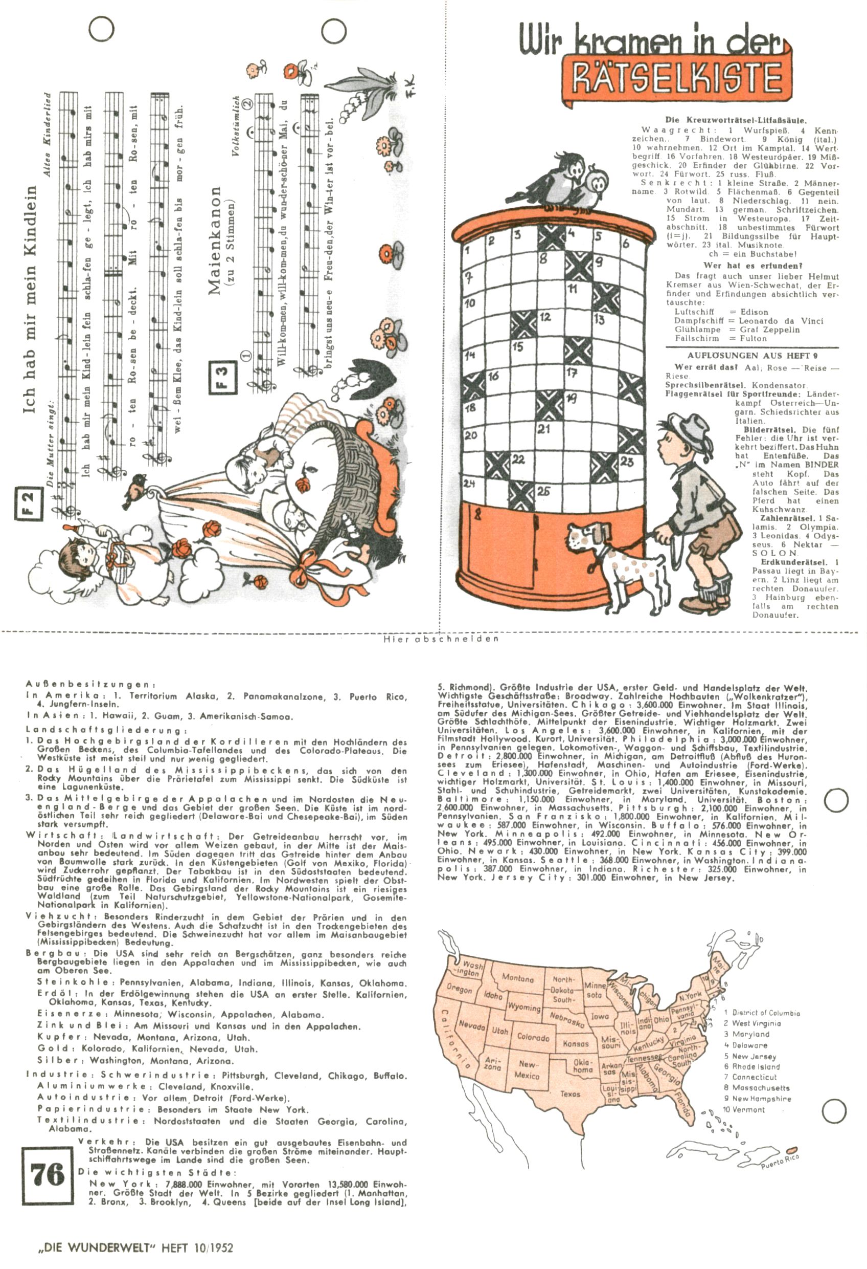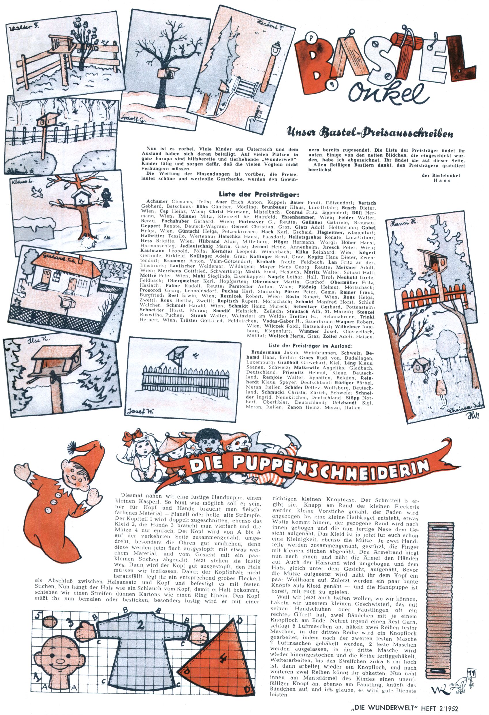 1952 – Der Erfolg hält an Wem Erfolg zuteil wird, der hat wenig Anlass, sein Konzept zu ändern. Und das war in gewisser Weise auch gut so bei allen inhaltlichen Schwächen der Beiträge in der Wunderwelt 1952. Der Erfolg der Zeitung wurde in erster Linie von der grafischen Umsetzung getragen; die lieblichen Bilder einer heilen Märchenwelt ließen über die oft flauen, pädagogisch teilweise sogar fragwürdigen Texte hinwegsehen. Elfriede Vavrovsky schrieb fast alle Texte und Rosl Warzilek zeichnete immer mehr Titelbilder und Mittelmärchen. ABC Peter Paul Prinz hatte Ende 1951 Meister Hokus als komischen Widerpart vom Zauberlehrling Willibald entdeckt und perfektionierte diesen Dualismus nun immer mehr. Meister Hokus avancierte zur regelmäßigen Lachnummer. Dafür überließ ABC vorübergehend Teja Aicher die Gestaltung der technischen Seite, dessen Zwerg Bumsti ebenfalls bereits untrennbar mit der Wunderwelt verbunden schien und längst zum Markenzeichen aufgestiegen war. Seine ko(s)mischen Superhelden Piff und Paff hatten jedoch allmählich genug von den Menschen und kehrten der Erde den Rücken zu. Für den Einsatz im Schulunterricht wurden weiterhin von Elfriede Vavrovsky erstellte politische und geografische Daten und Karten gedruckt, was gerne angenommen wurde, denn teure Atlanten gab es 1952 noch wenige, als viele politische Grenzen gar nicht endgültig geklärt schienen. |