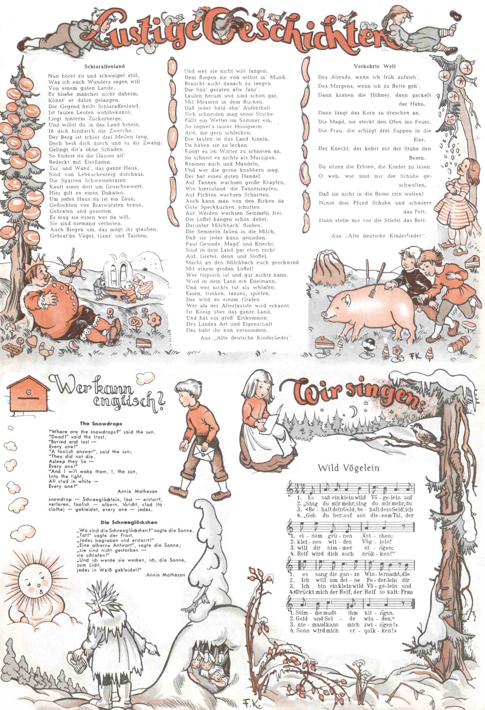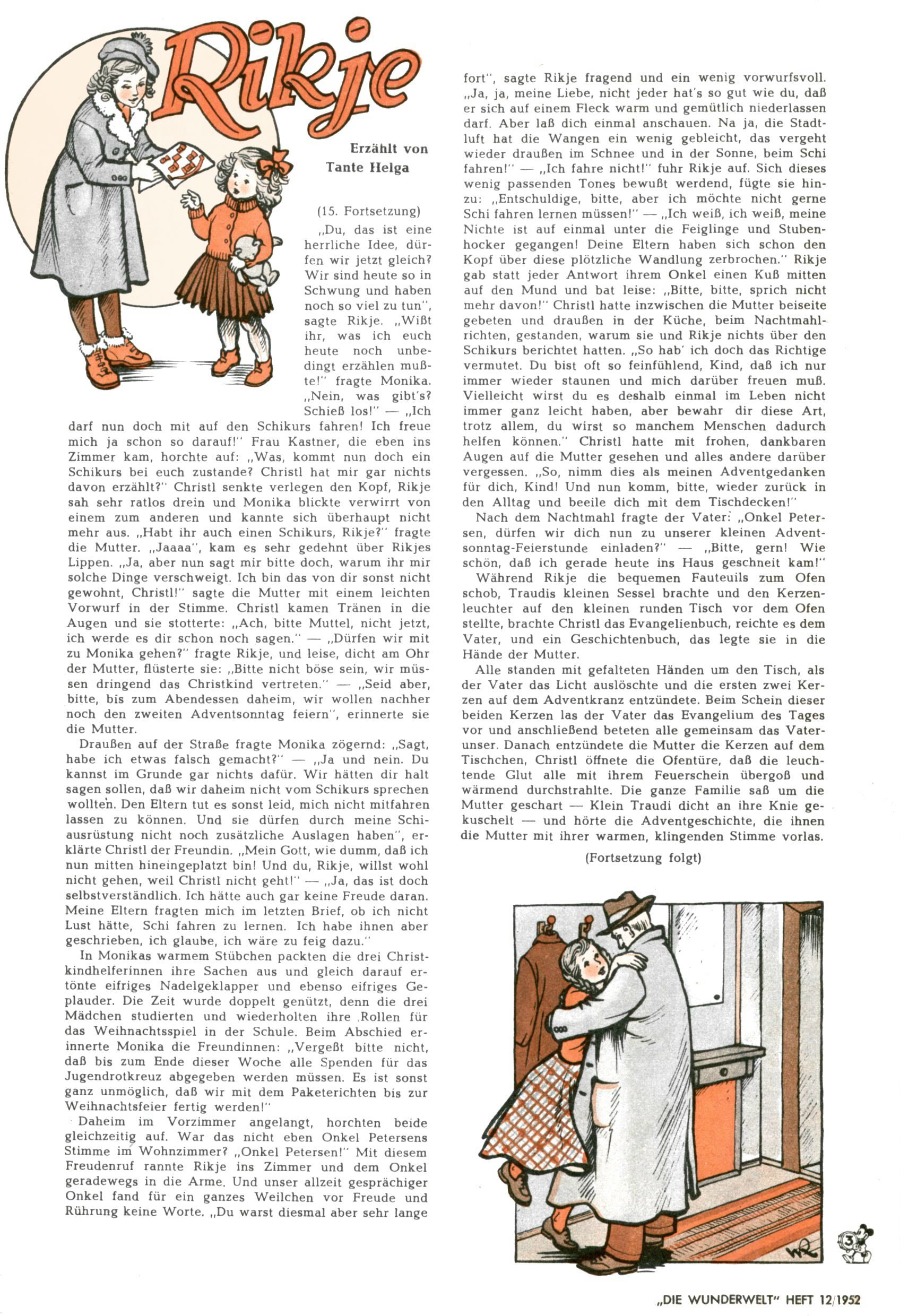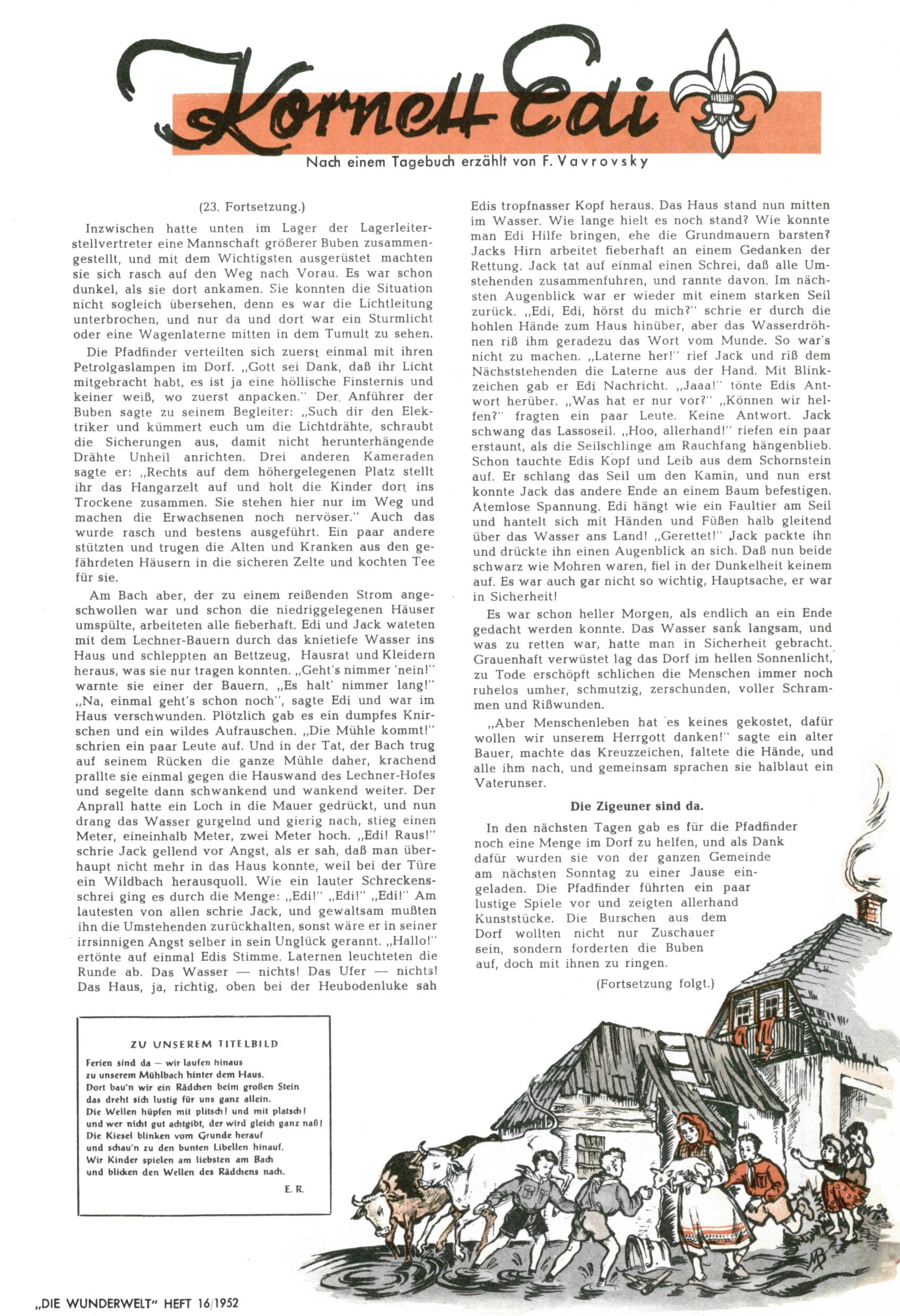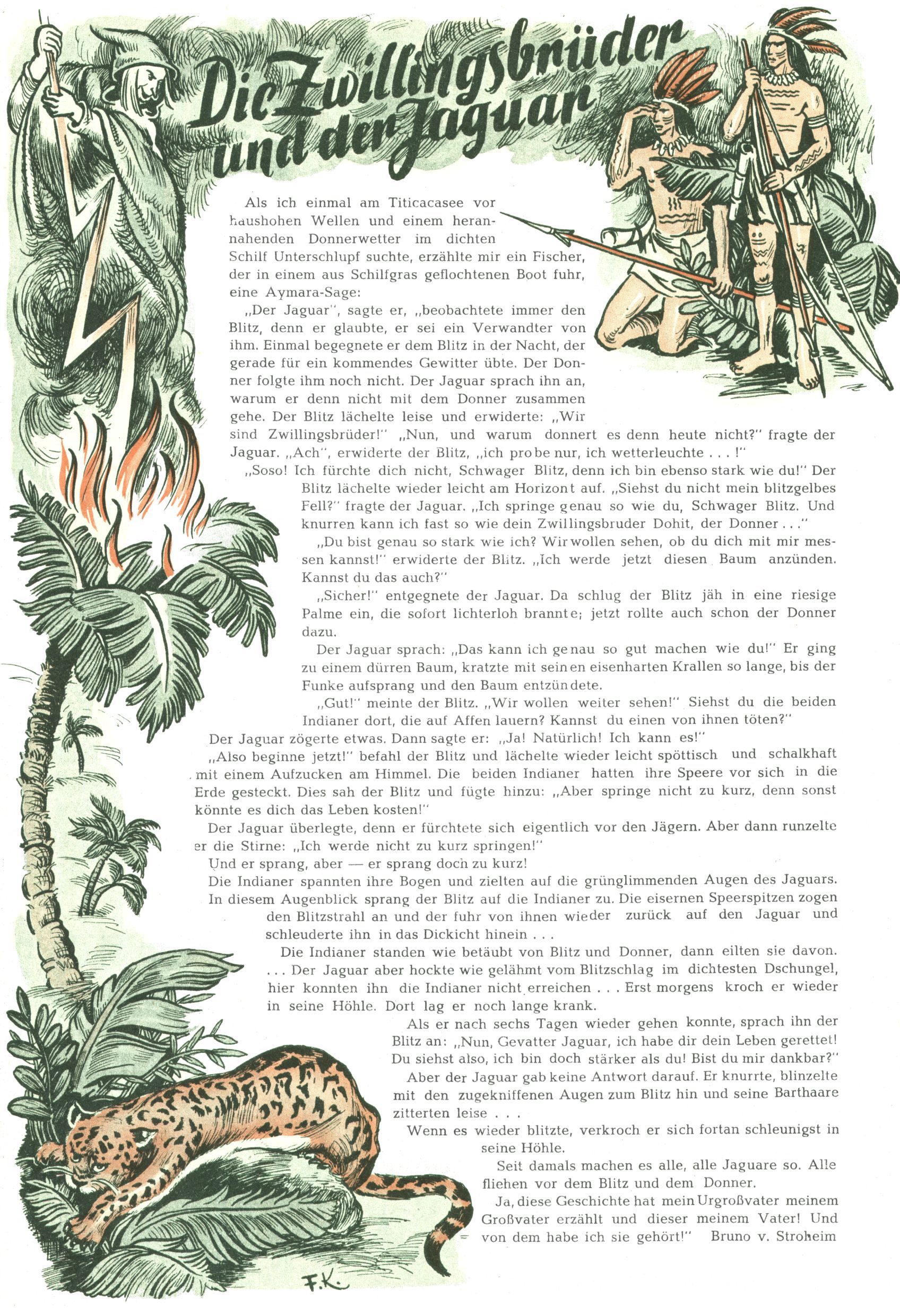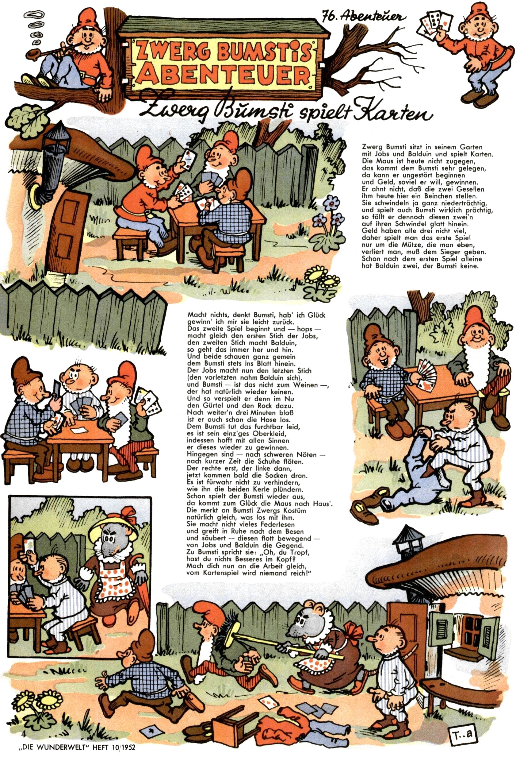 1952 – Der Erfolg hält an Wem Erfolg zuteil wird, der hat wenig Anlass, sein Konzept zu ändern. Und das war in gewisser Weise auch gut so bei allen inhaltlichen Schwächen der Beiträge in der Wunderwelt 1952. Der Erfolg der Zeitung wurde in erster Linie von der grafischen Umsetzung getragen; die lieblichen Bilder einer heilen Märchenwelt ließen über die oft flauen, pädagogisch teilweise sogar fragwürdigen Texte hinwegsehen. Elfriede Vavrovsky schrieb fast alle Texte und Rosl Warzilek zeichnete immer mehr Titelbilder und Mittelmärchen. ABC Peter Paul Prinz hatte Ende 1951 Meister Hokus als komischen Widerpart vom Zauberlehrling Willibald entdeckt und perfektionierte diesen Dualismus nun immer mehr. Meister Hokus avancierte zur regelmäßigen Lachnummer. Dafür überließ ABC vorübergehend Teja Aicher die Gestaltung der technischen Seite, dessen Zwerg Bumsti ebenfalls bereits untrennbar mit der Wunderwelt verbunden schien und längst zum Markenzeichen aufgestiegen war. Seine ko(s)mischen Superhelden Piff und Paff hatten jedoch allmählich genug von den Menschen und kehrten der Erde den Rücken zu. Für den Einsatz im Schulunterricht wurden weiterhin von Elfriede Vavrovsky erstellte politische und geografische Daten und Karten gedruckt, was gerne angenommen wurde, denn teure Atlanten gab es 1952 noch wenige, als viele politische Grenzen gar nicht endgültig geklärt schienen. |