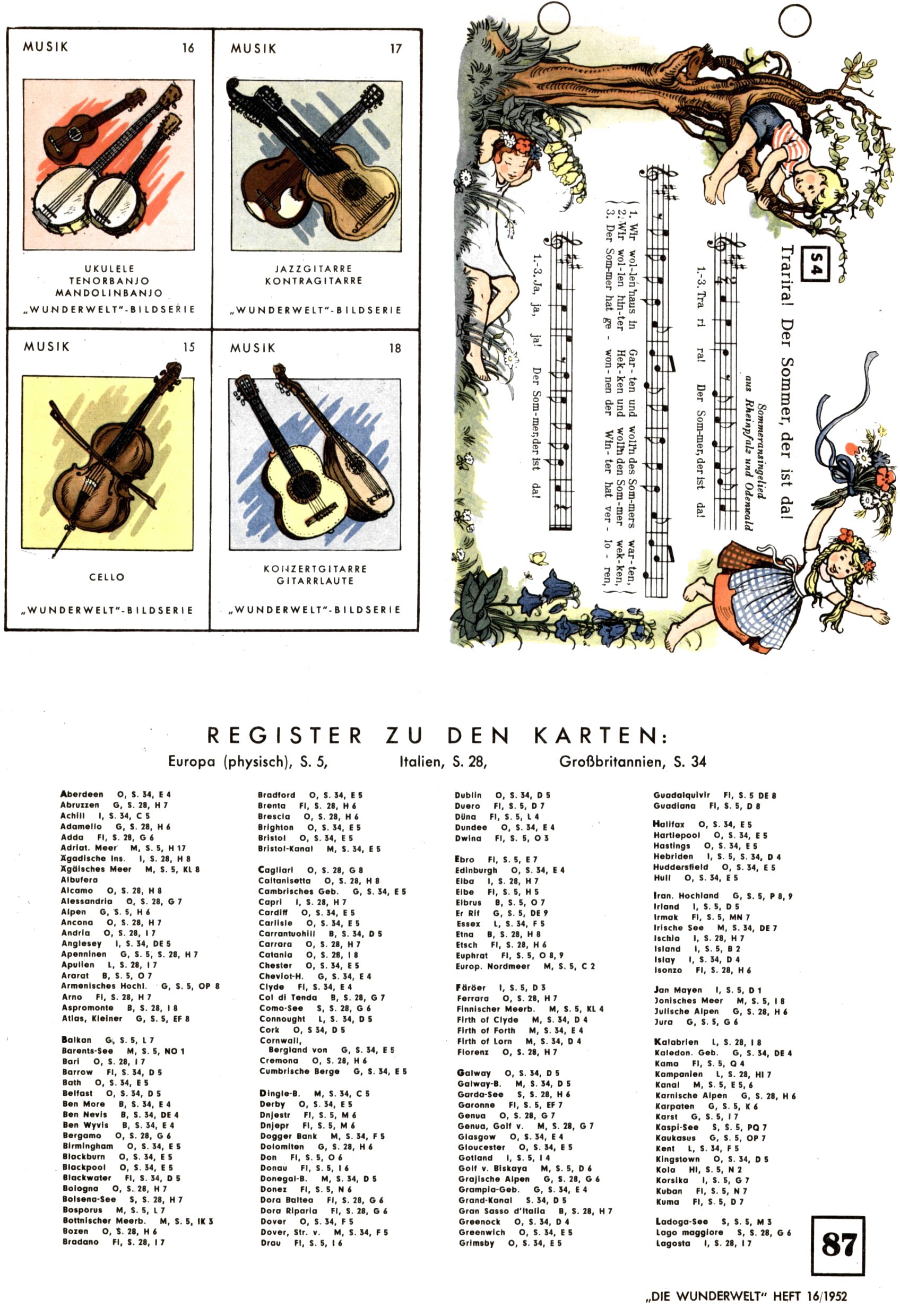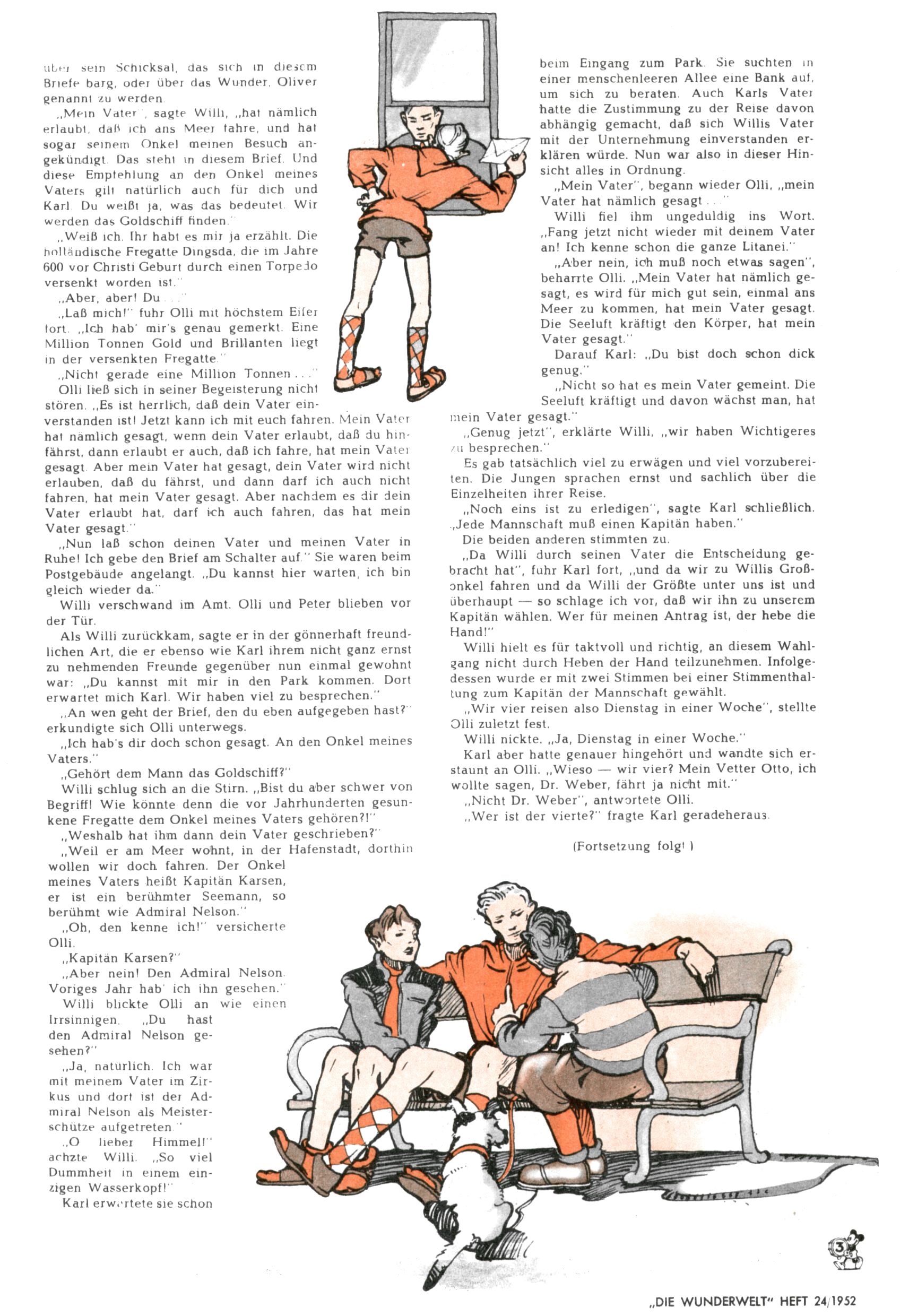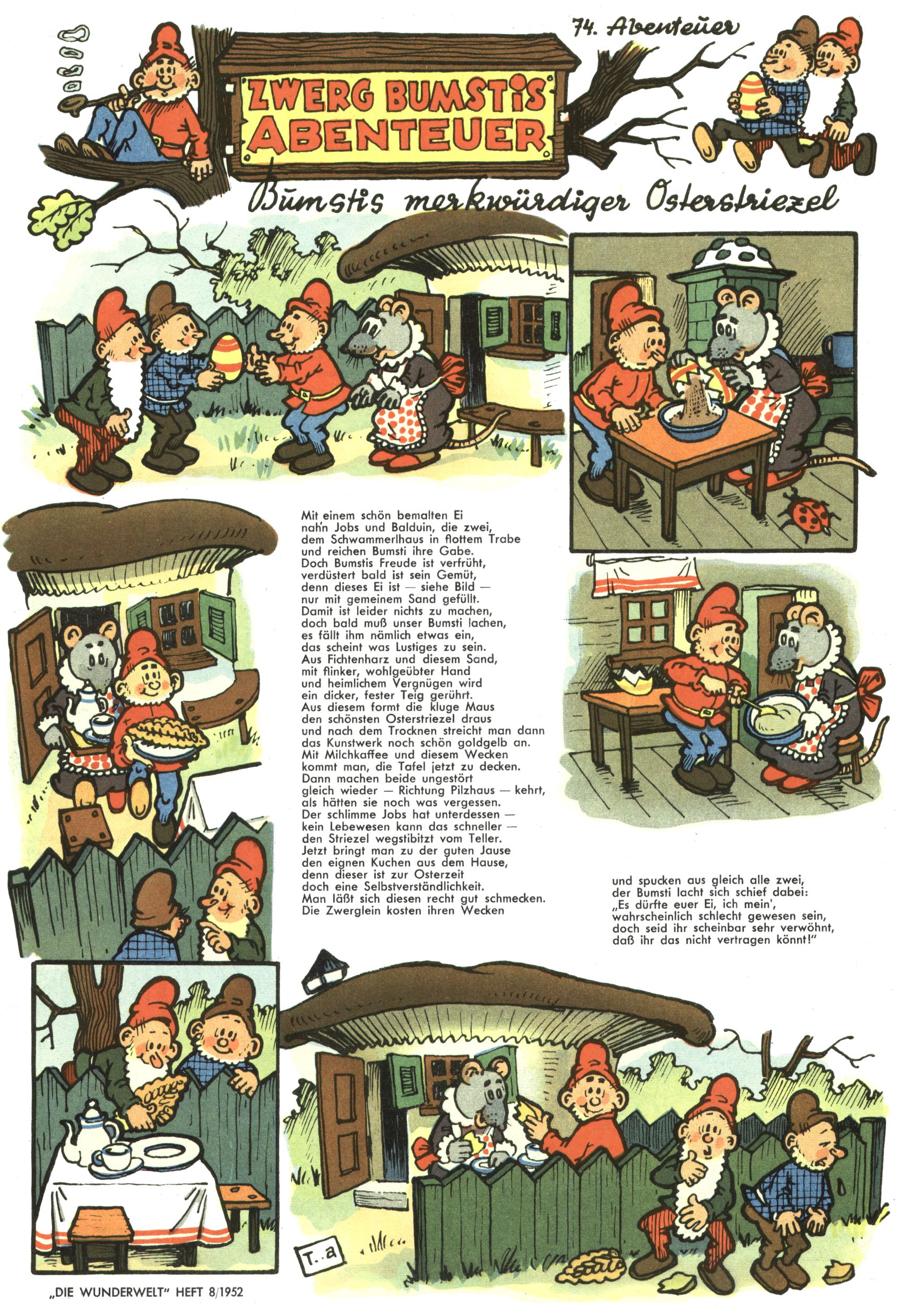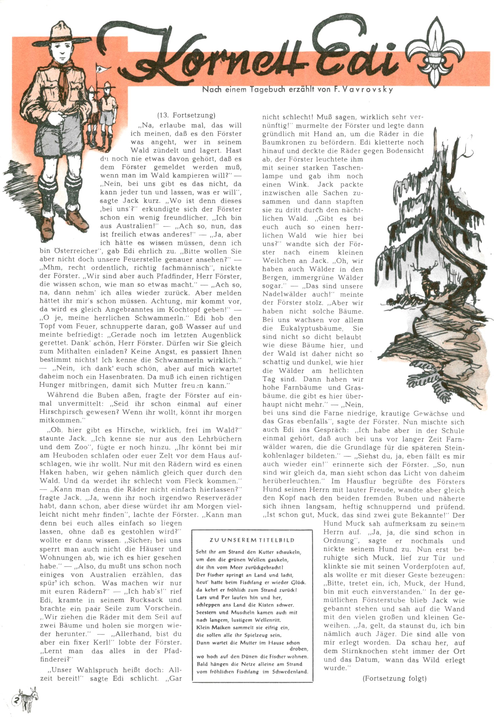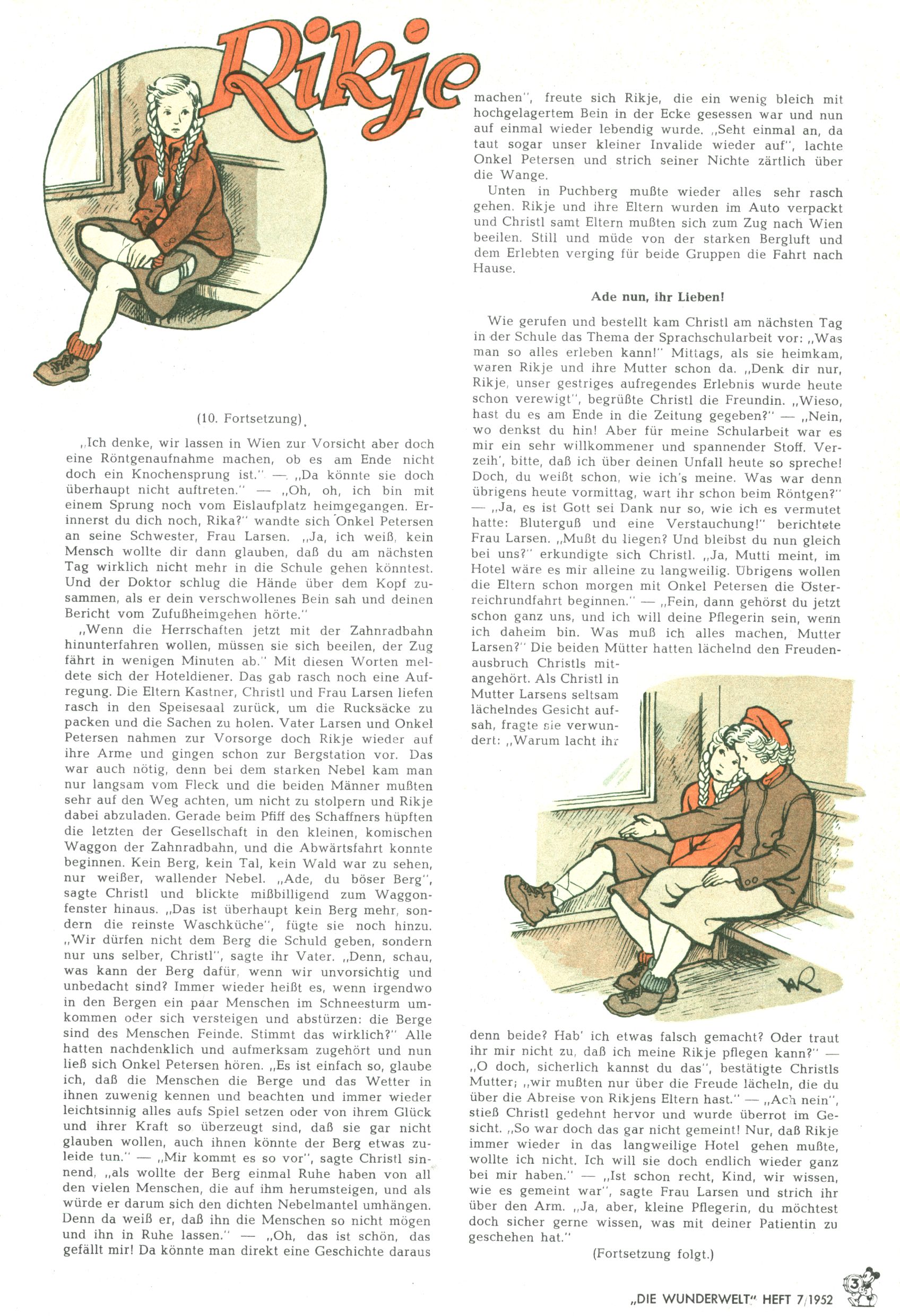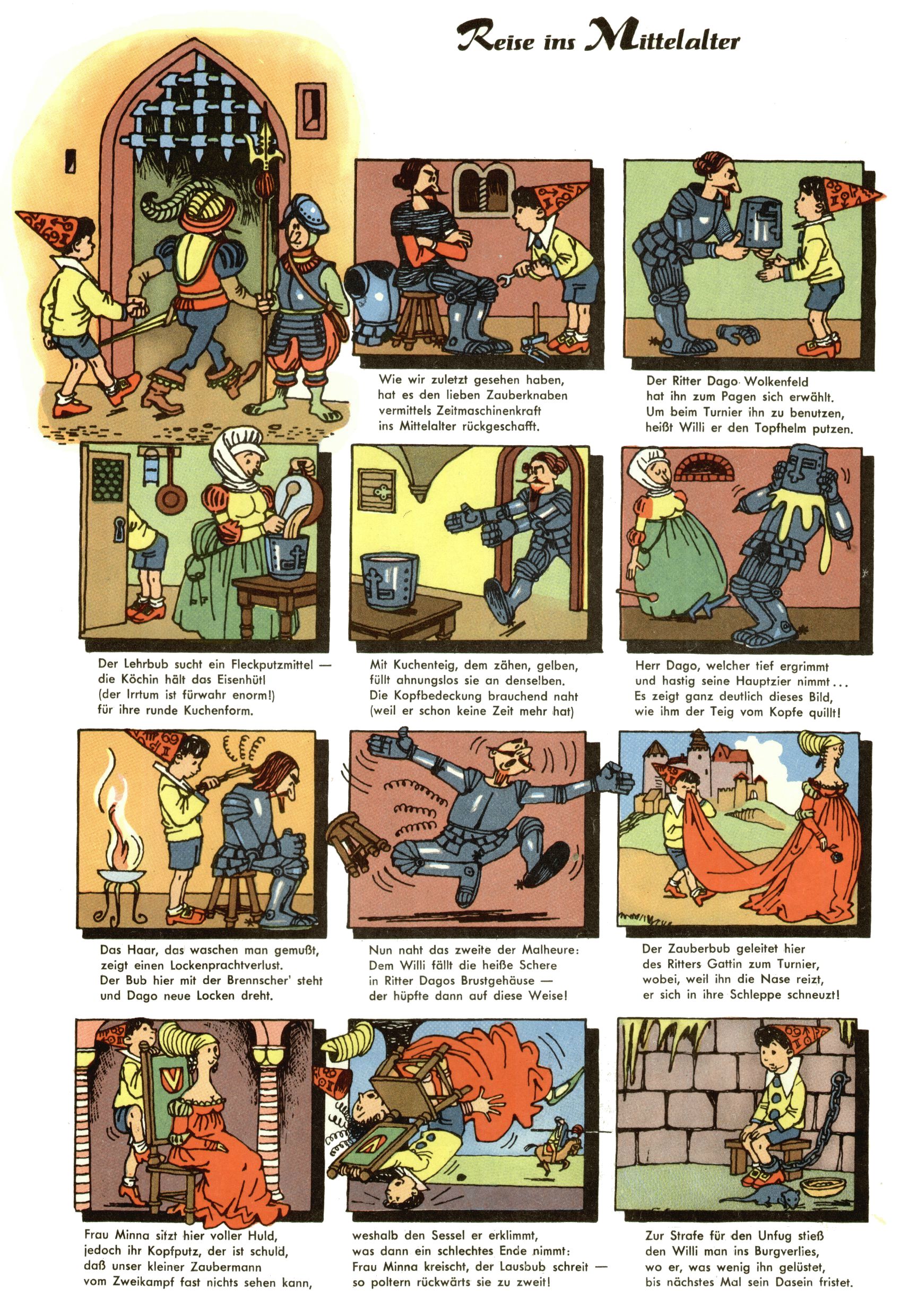 1952 – Der Erfolg hält an Wem Erfolg zuteil wird, der hat wenig Anlass, sein Konzept zu ändern. Und das war in gewisser Weise auch gut so bei allen inhaltlichen Schwächen der Beiträge in der Wunderwelt 1952. Der Erfolg der Zeitung wurde in erster Linie von der grafischen Umsetzung getragen; die lieblichen Bilder einer heilen Märchenwelt ließen über die oft flauen, pädagogisch teilweise sogar fragwürdigen Texte hinwegsehen. Elfriede Vavrovsky schrieb fast alle Texte und Rosl Warzilek zeichnete immer mehr Titelbilder und Mittelmärchen. ABC Peter Paul Prinz hatte Ende 1951 Meister Hokus als komischen Widerpart vom Zauberlehrling Willibald entdeckt und perfektionierte diesen Dualismus nun immer mehr. Meister Hokus avancierte zur regelmäßigen Lachnummer. Dafür überließ ABC vorübergehend Teja Aicher die Gestaltung der technischen Seite, dessen Zwerg Bumsti ebenfalls bereits untrennbar mit der Wunderwelt verbunden schien und längst zum Markenzeichen aufgestiegen war. Seine ko(s)mischen Superhelden Piff und Paff hatten jedoch allmählich genug von den Menschen und kehrten der Erde den Rücken zu. Für den Einsatz im Schulunterricht wurden weiterhin von Elfriede Vavrovsky erstellte politische und geografische Daten und Karten gedruckt, was gerne angenommen wurde, denn teure Atlanten gab es 1952 noch wenige, als viele politische Grenzen gar nicht endgültig geklärt schienen. |