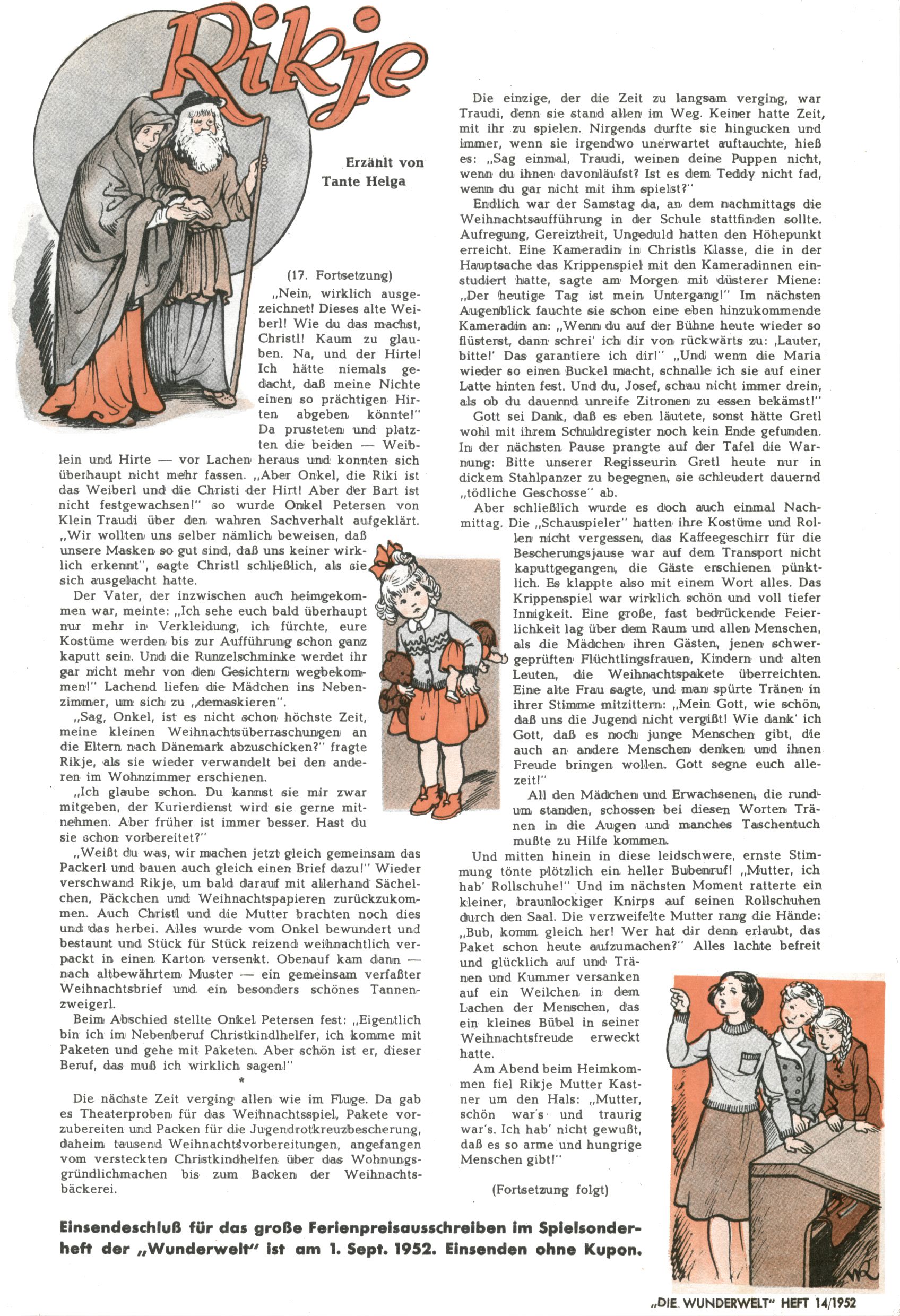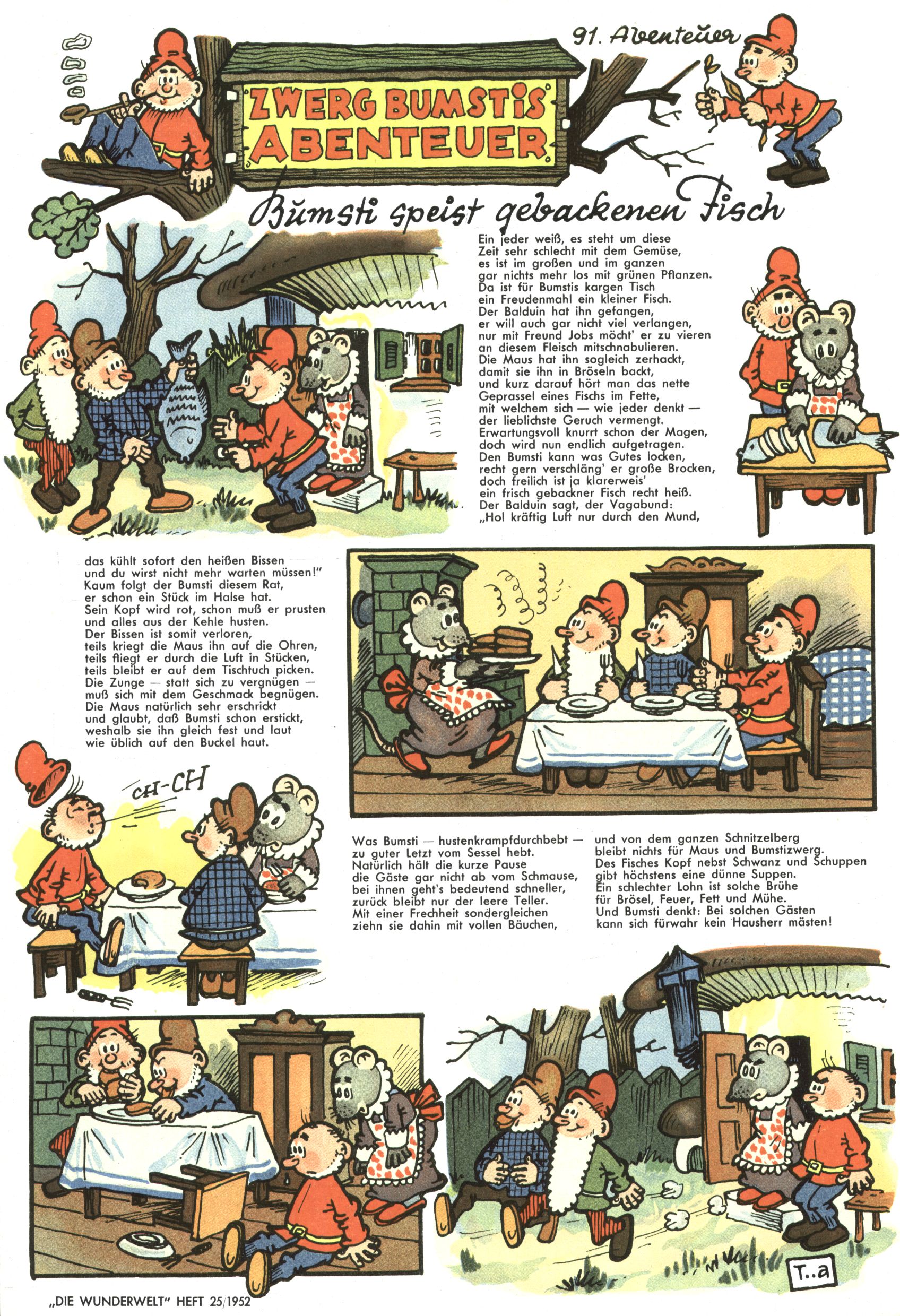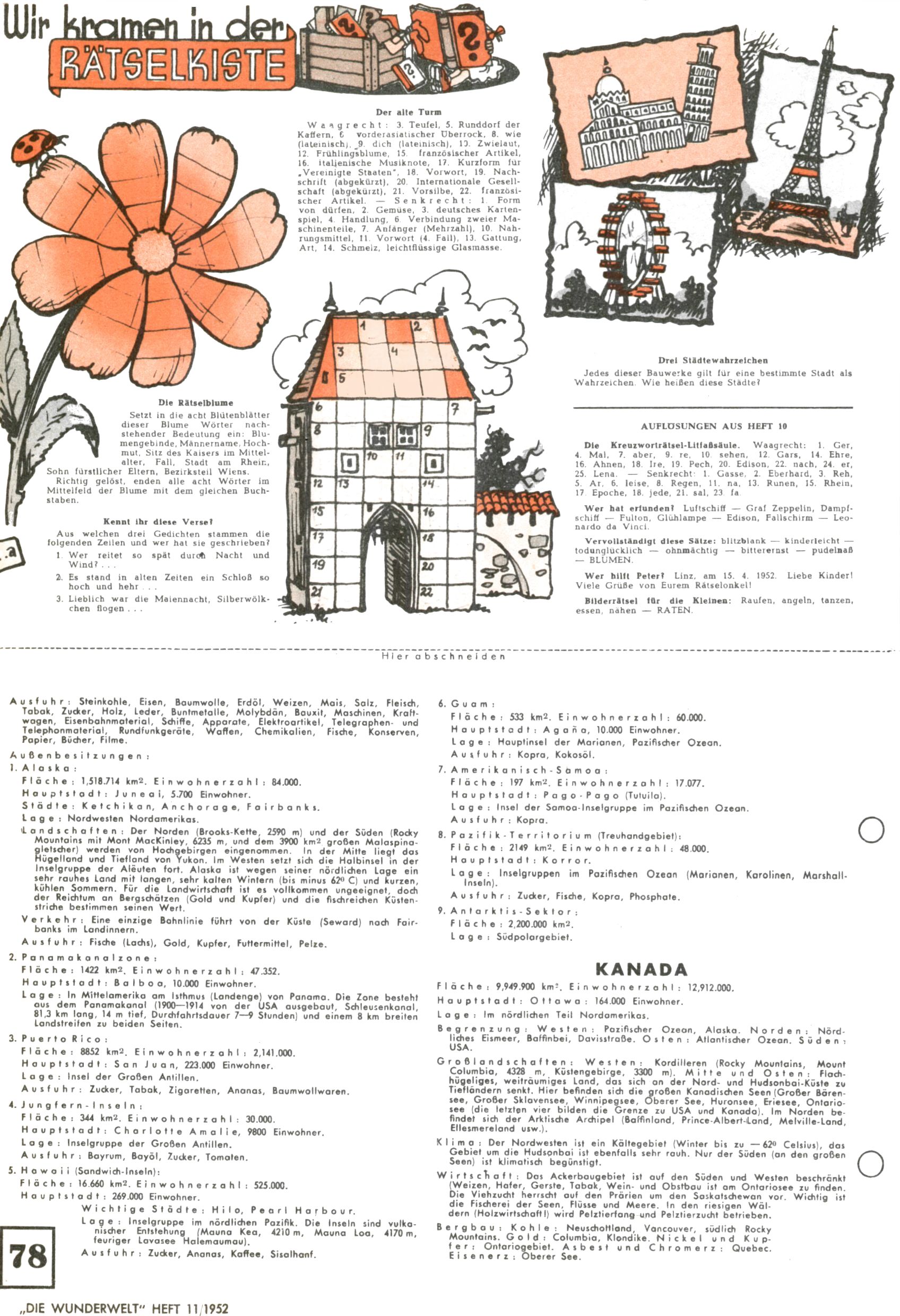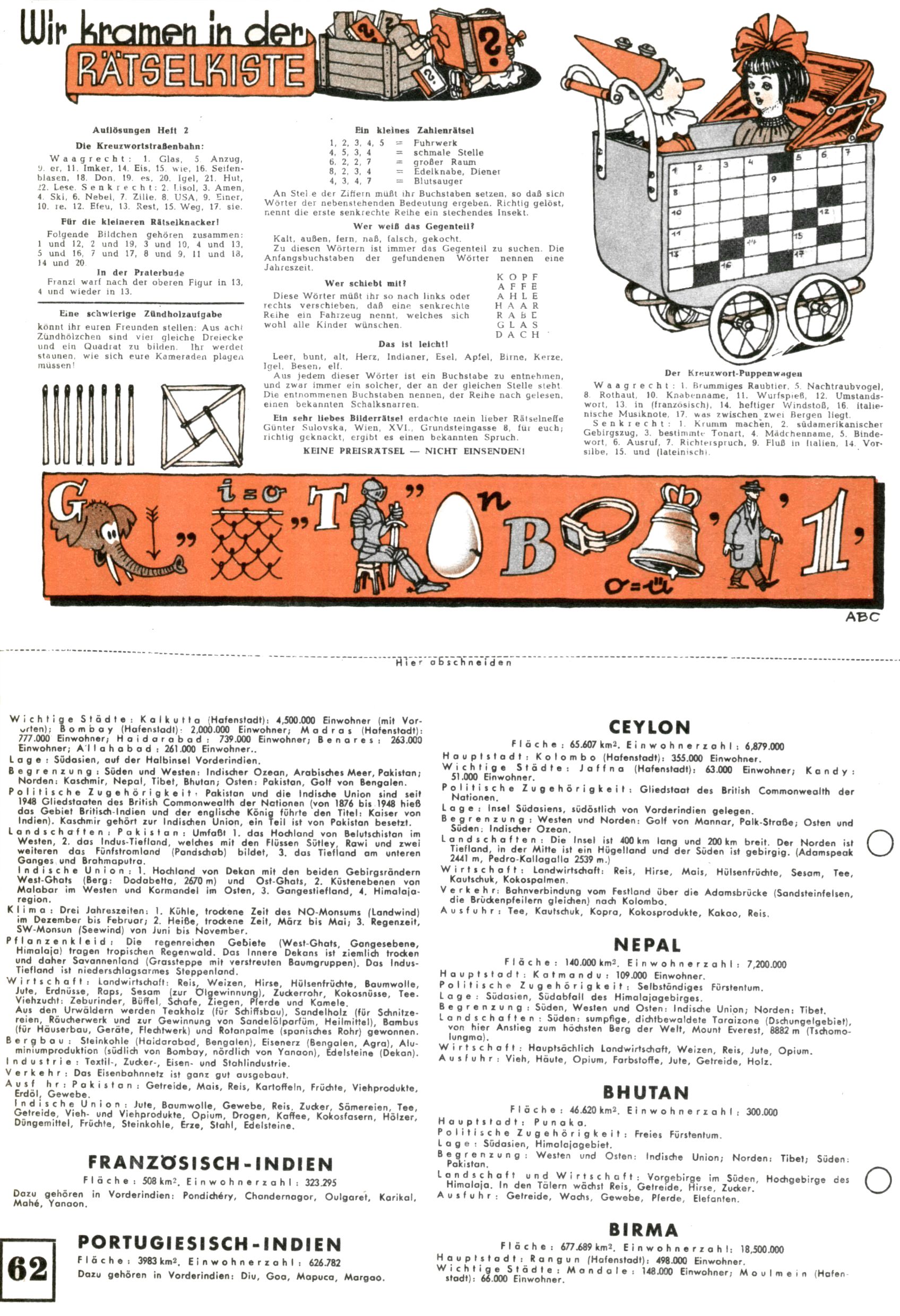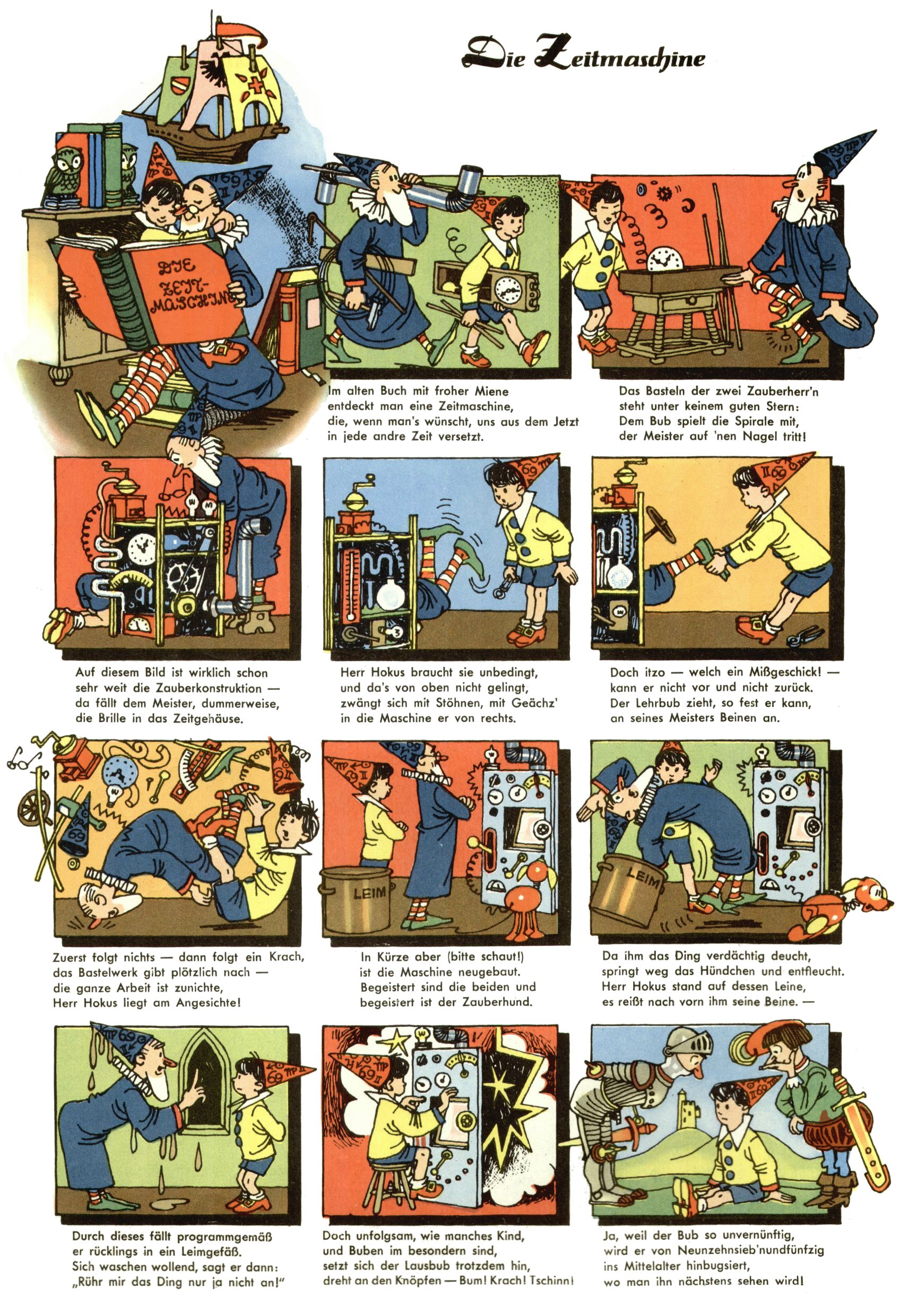 1952 – Der Erfolg hält an Wem Erfolg zuteil wird, der hat wenig Anlass, sein Konzept zu ändern. Und das war in gewisser Weise auch gut so bei allen inhaltlichen Schwächen der Beiträge in der Wunderwelt 1952. Der Erfolg der Zeitung wurde in erster Linie von der grafischen Umsetzung getragen; die lieblichen Bilder einer heilen Märchenwelt ließen über die oft flauen, pädagogisch teilweise sogar fragwürdigen Texte hinwegsehen. Elfriede Vavrovsky schrieb fast alle Texte und Rosl Warzilek zeichnete immer mehr Titelbilder und Mittelmärchen. ABC Peter Paul Prinz hatte Ende 1951 Meister Hokus als komischen Widerpart vom Zauberlehrling Willibald entdeckt und perfektionierte diesen Dualismus nun immer mehr. Meister Hokus avancierte zur regelmäßigen Lachnummer. Dafür überließ ABC vorübergehend Teja Aicher die Gestaltung der technischen Seite, dessen Zwerg Bumsti ebenfalls bereits untrennbar mit der Wunderwelt verbunden schien und längst zum Markenzeichen aufgestiegen war. Seine ko(s)mischen Superhelden Piff und Paff hatten jedoch allmählich genug von den Menschen und kehrten der Erde den Rücken zu. Für den Einsatz im Schulunterricht wurden weiterhin von Elfriede Vavrovsky erstellte politische und geografische Daten und Karten gedruckt, was gerne angenommen wurde, denn teure Atlanten gab es 1952 noch wenige, als viele politische Grenzen gar nicht endgültig geklärt schienen. |